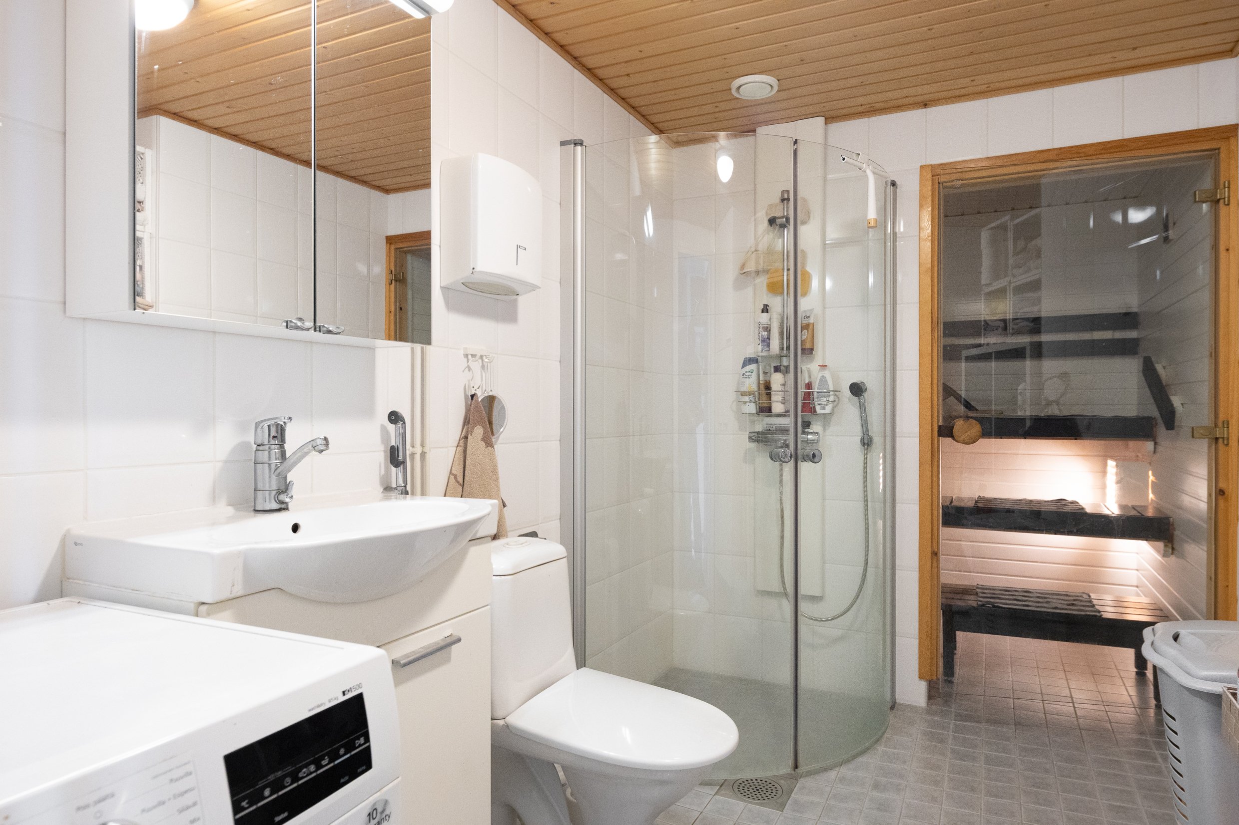 WC-istuin, suihkukaappi, pesukoneliitäntä, bidee-suihku, peili, pesuallas ja allaskaappi