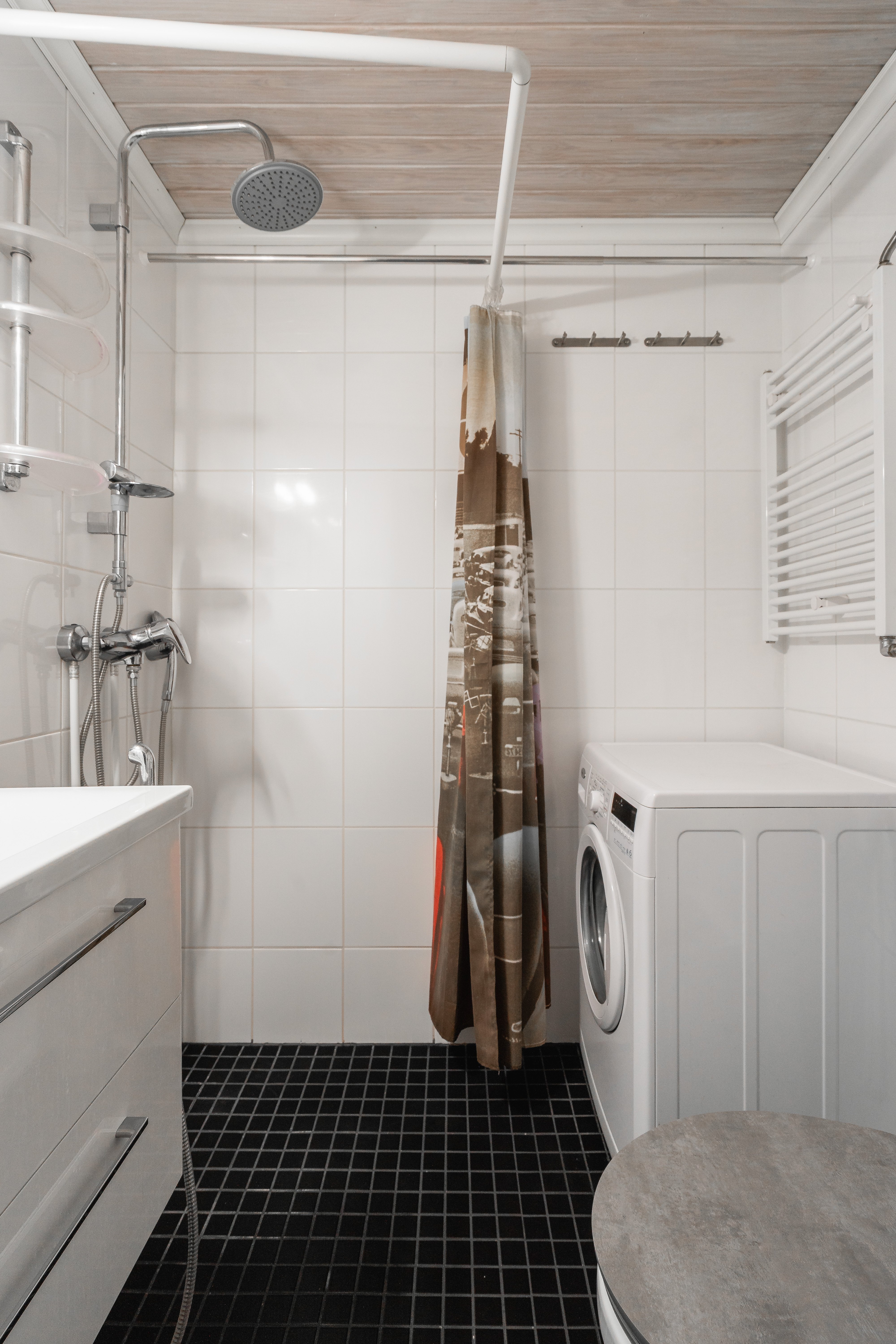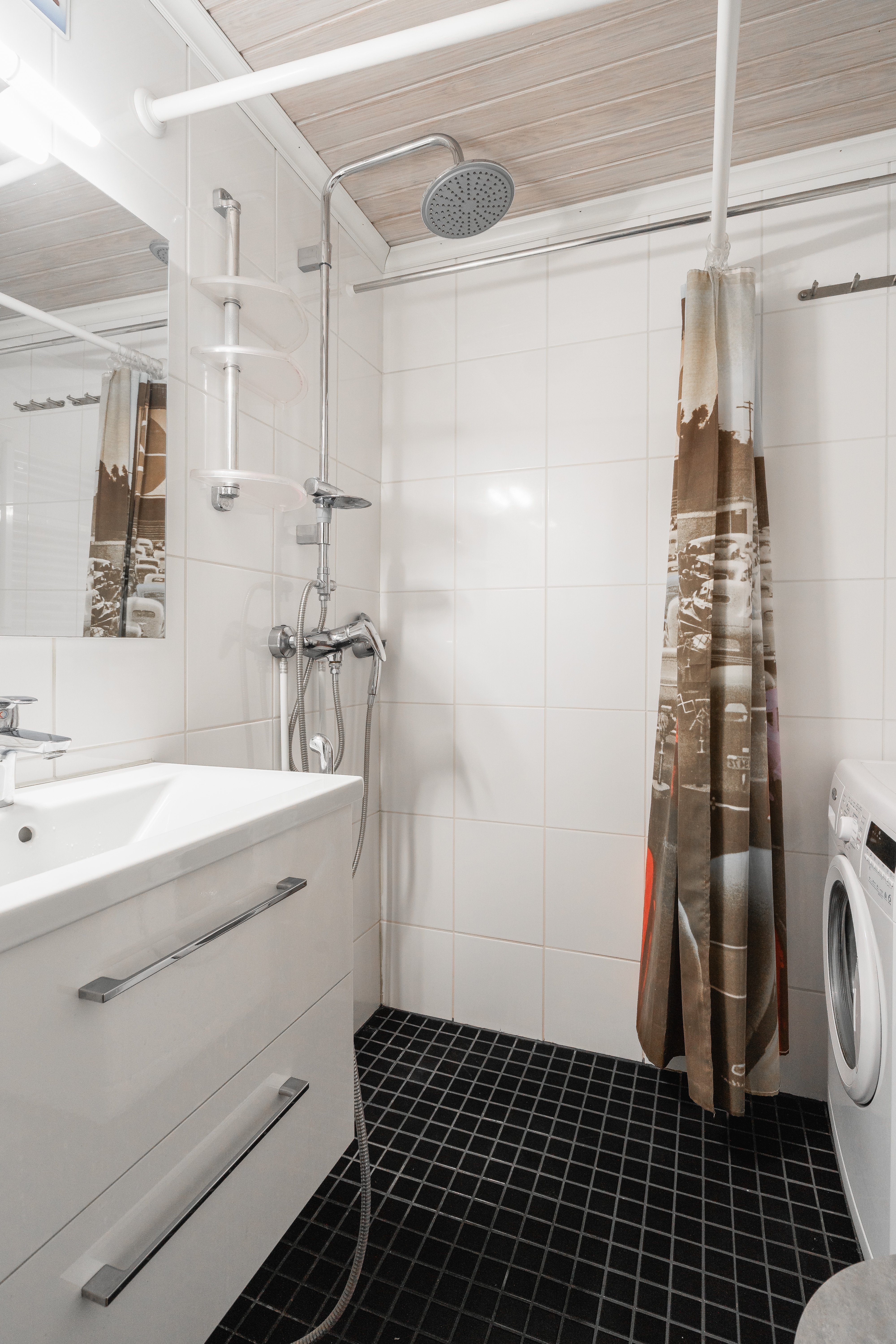 Wc-istuin, suihku, pesukoneliitäntä, lattialämmitys, peili, pesuallas, allaskaappi ja bidee-suihku. Lattia laattaa ja seinät kaakeloitu.