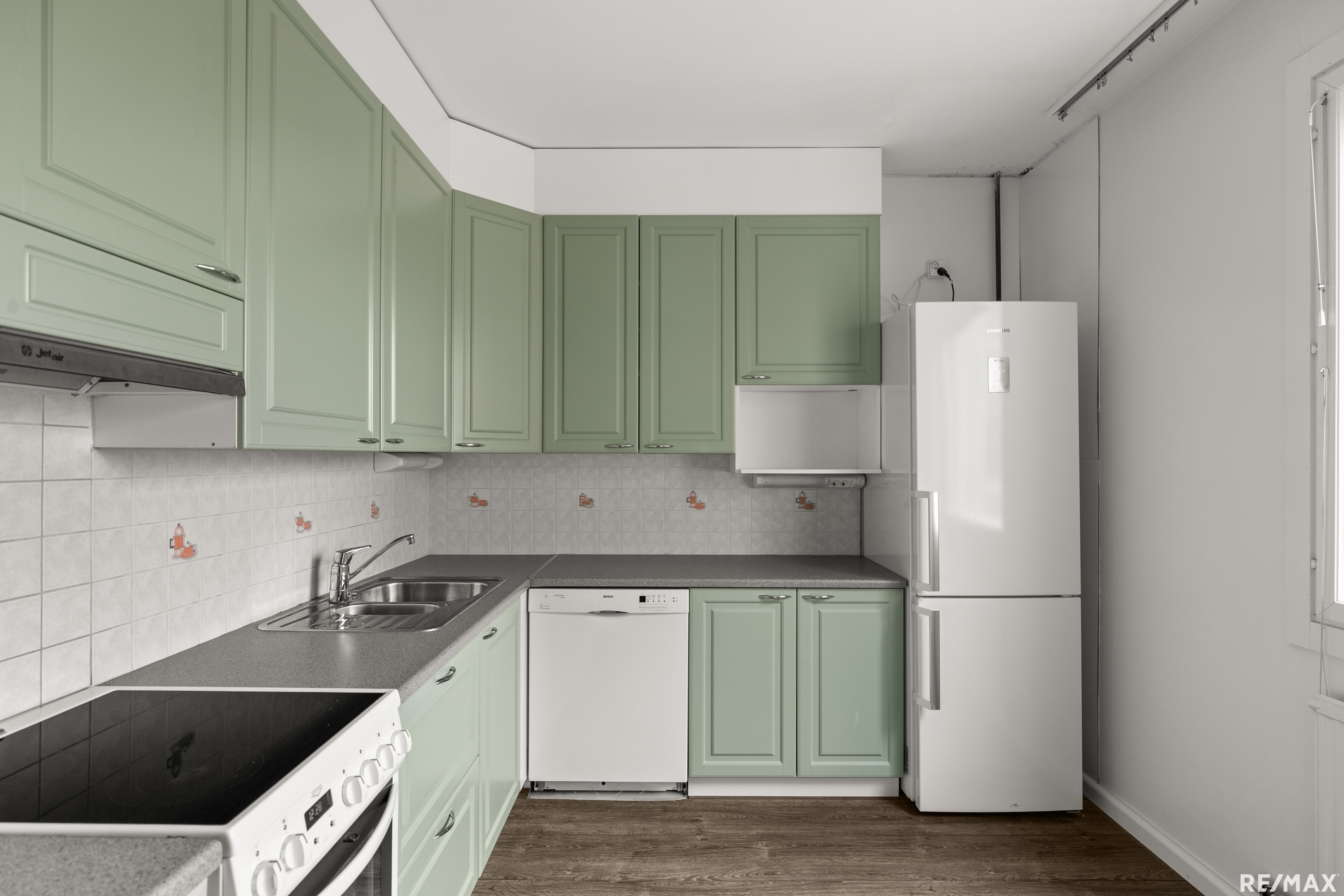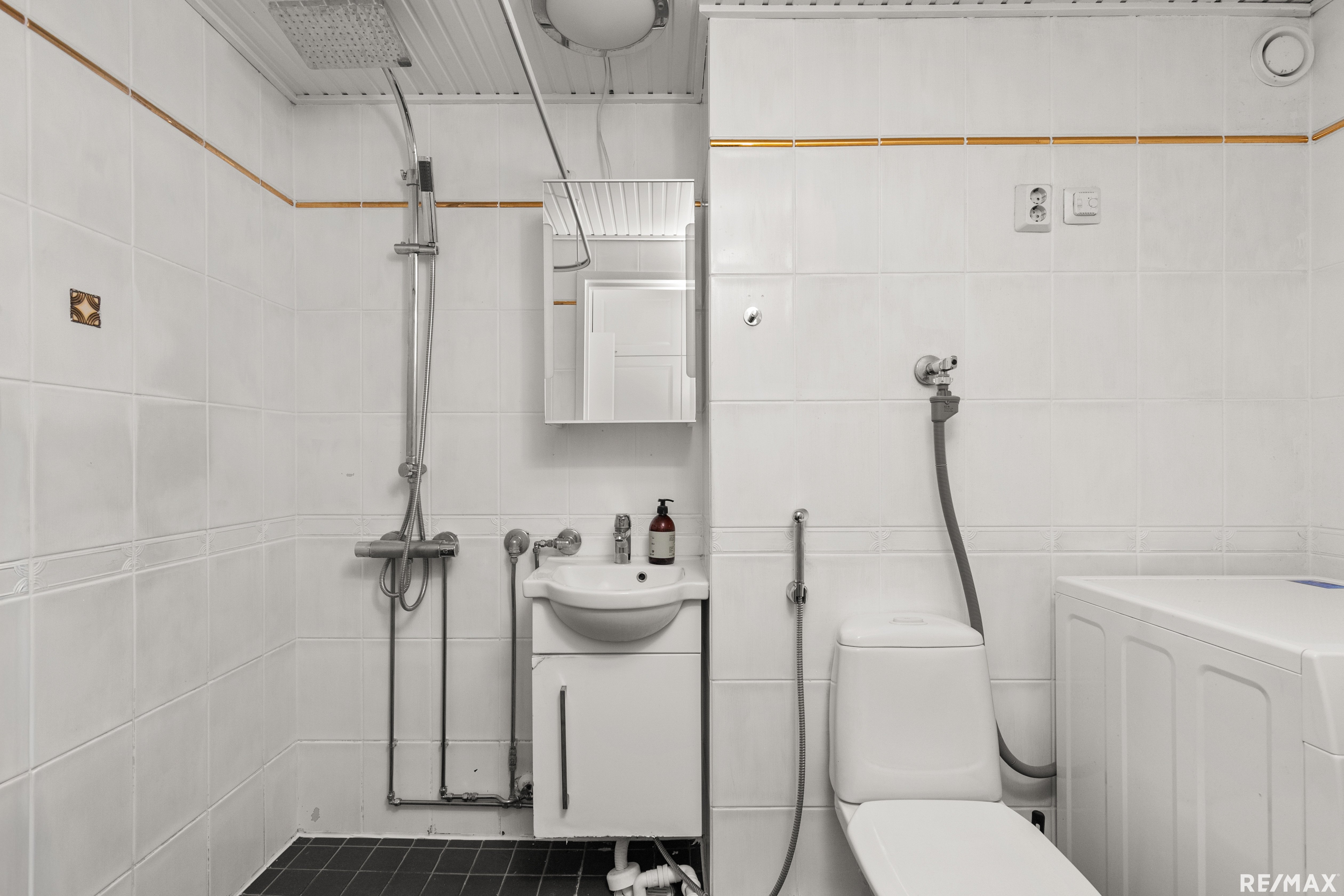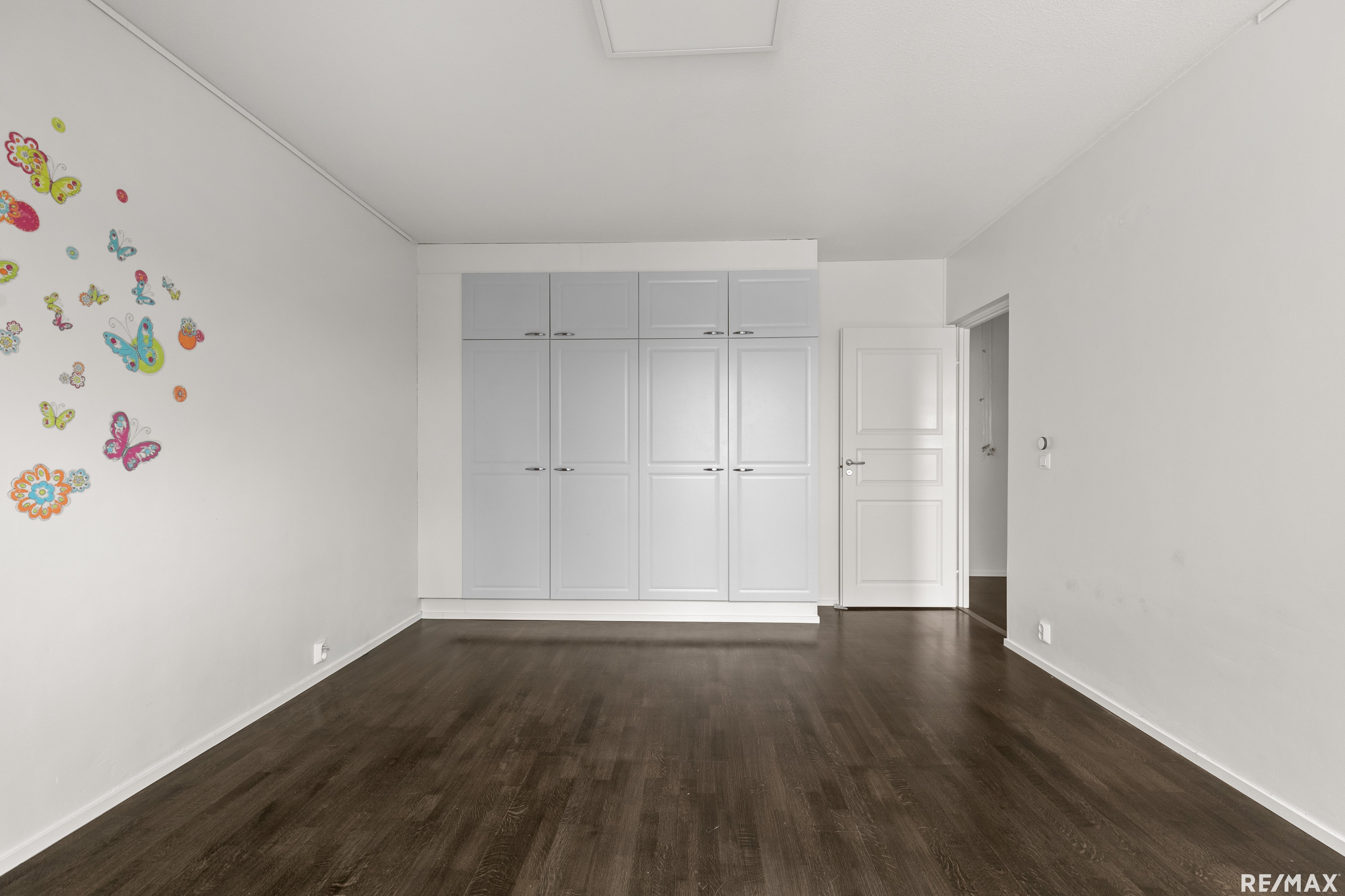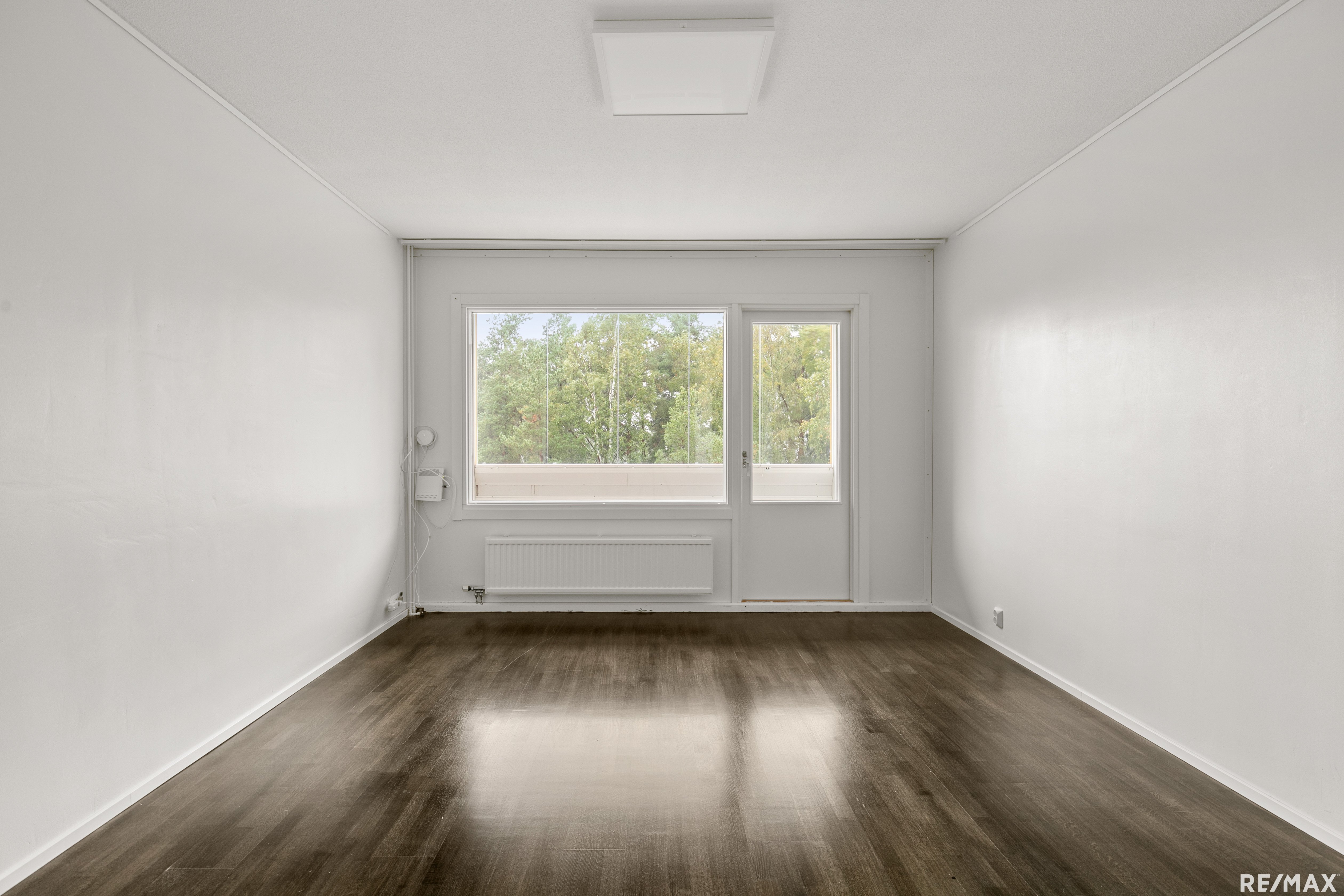 Asunnon sisäseinät ovat siirrettävissä, joten tilankäyttöä voi muokata remontin avulla omien tarpeiden mukaan. Kylpyhuone kaipaa pientä pintaremonttia eikä suurempia linjasaneeraussuunnitelmia ole vielä tiedossa. Keittiössä on käytännöllinen laminaattilattia, kun taas muualla asunnossa katse kiinnittyy tummaan parkettiin – tyylikäs valinta, joka on myös uudelleen hiottavissa. Seinille asennetut taululistat mahdollistavat sisustamisen ilman poraamista, mikä tekee kodin ilmeen päivittämisestä helppoa ja huoletonta.