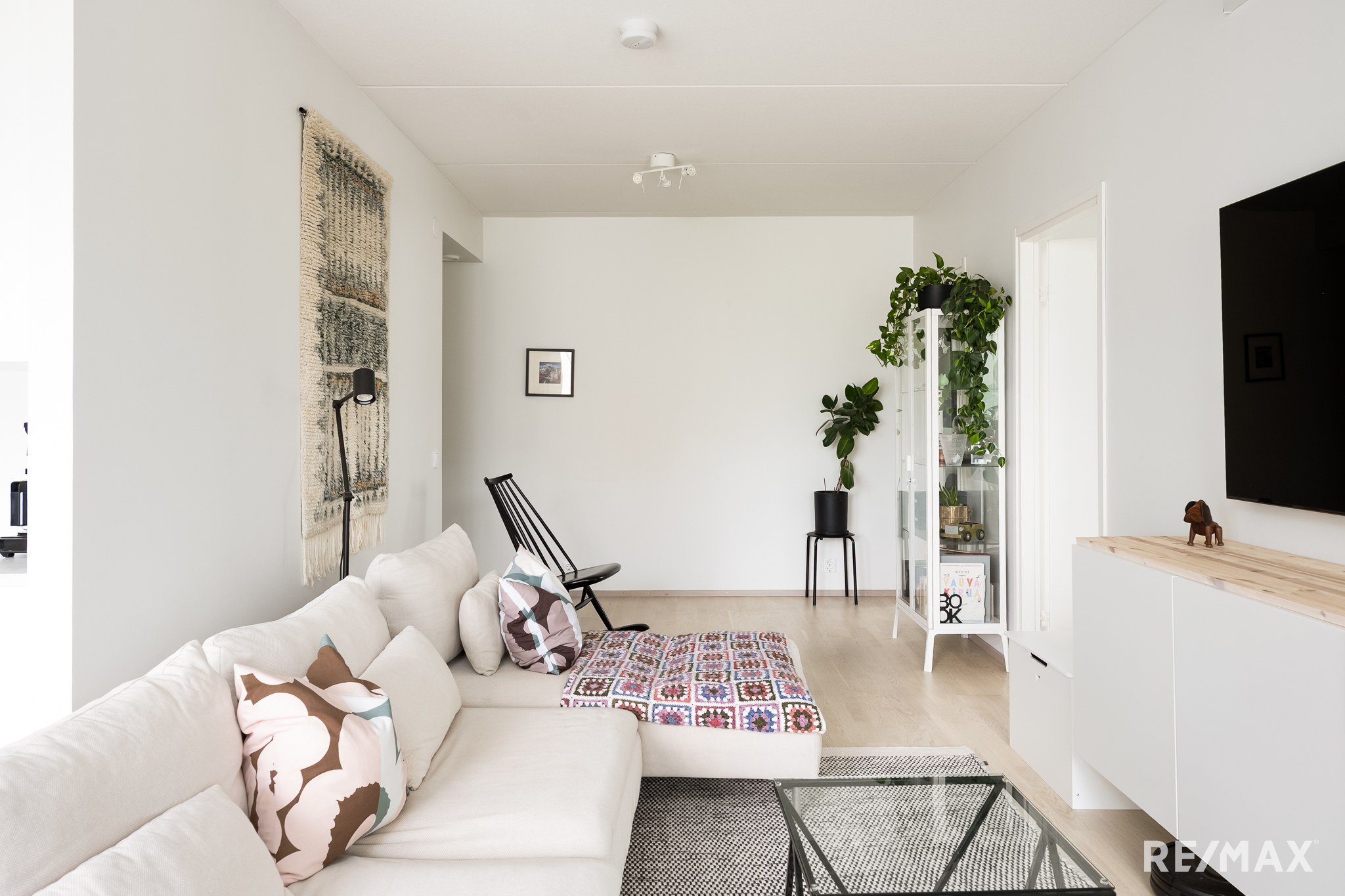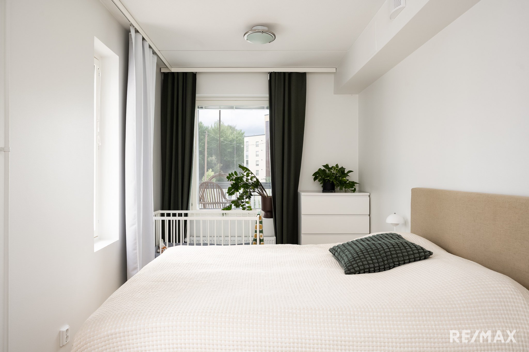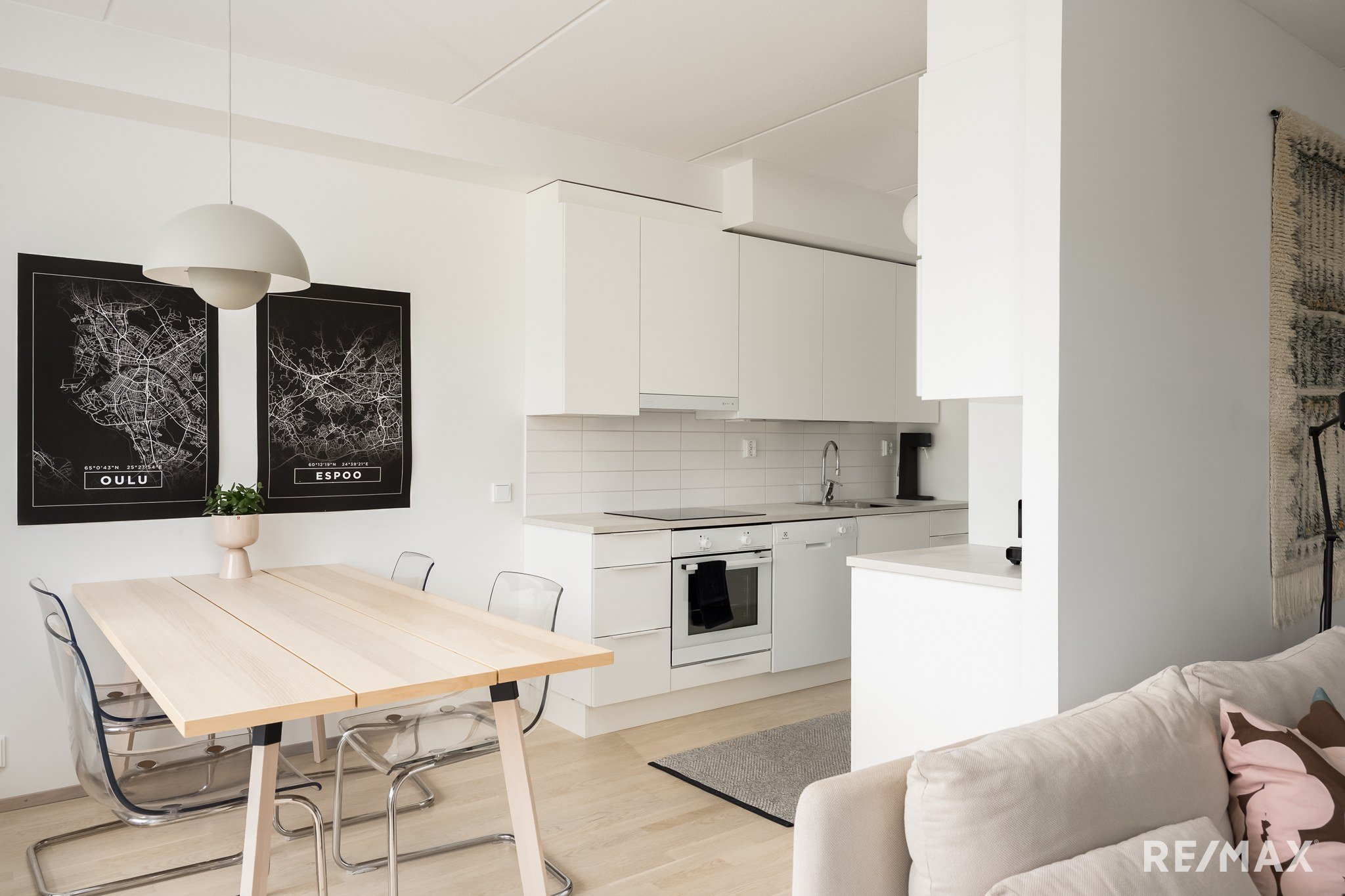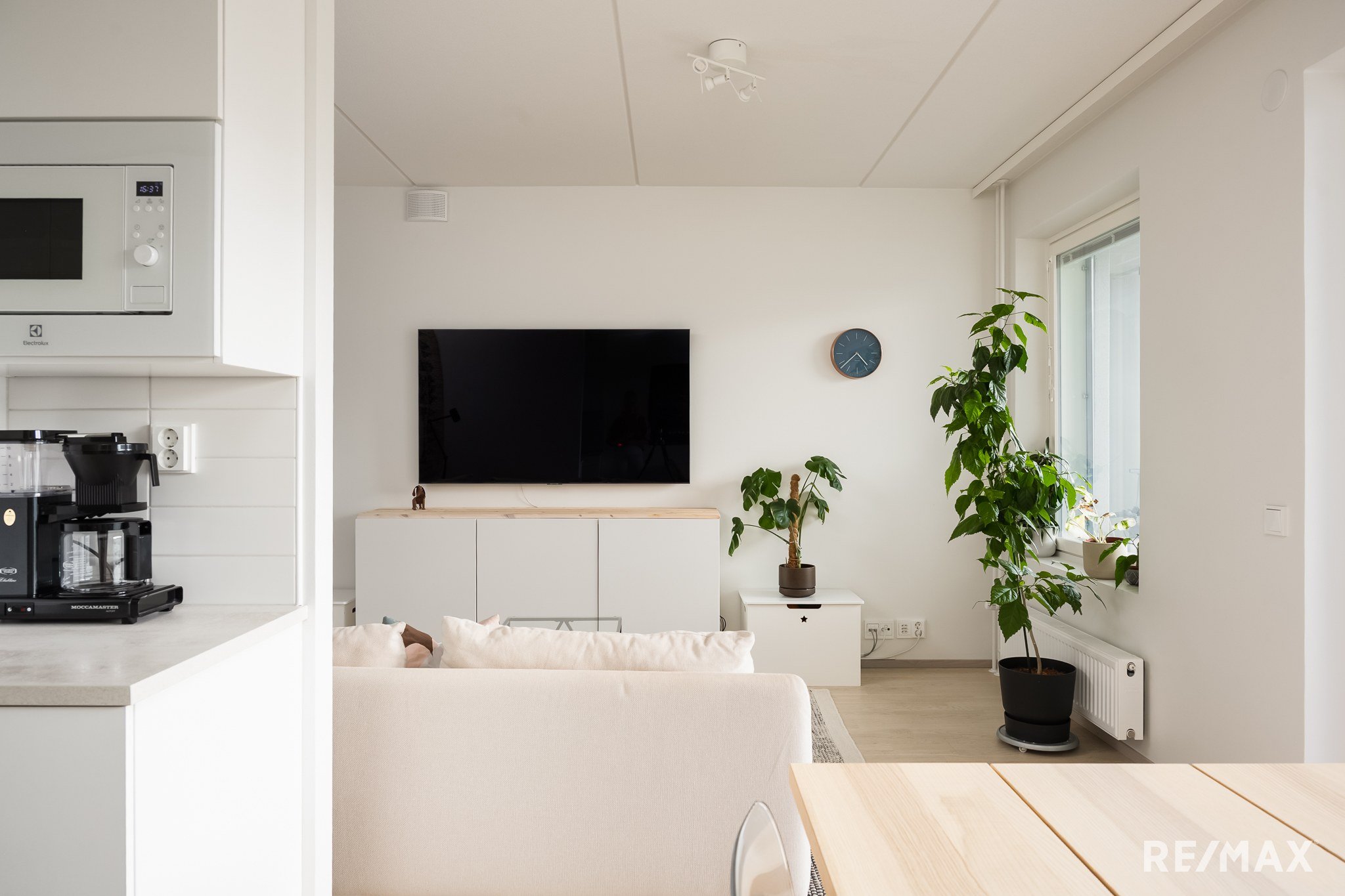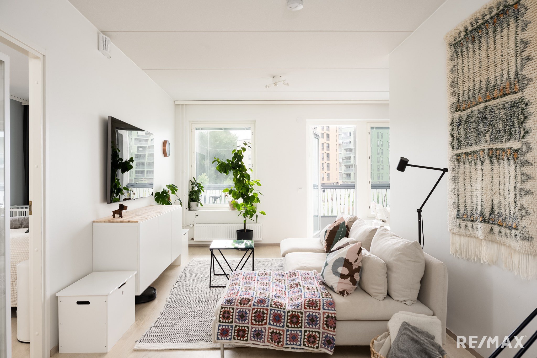 Asunnon 74 neliötä jakautuvat kahteen makuuhuoneeseen, avaraan olohuoneeseen sekä moderniin keittiöön, jossa on laadukkaat kodinkoneet. Suurempi makuuhuoneista on mahdollista jakaa kahdeksi pienmmäksi huoneeksi. Huoneen sähköt, ilmanvaihto ja valokatkaisijat ovat asennetut siten, että muutos on helposti toteuttetavissa.