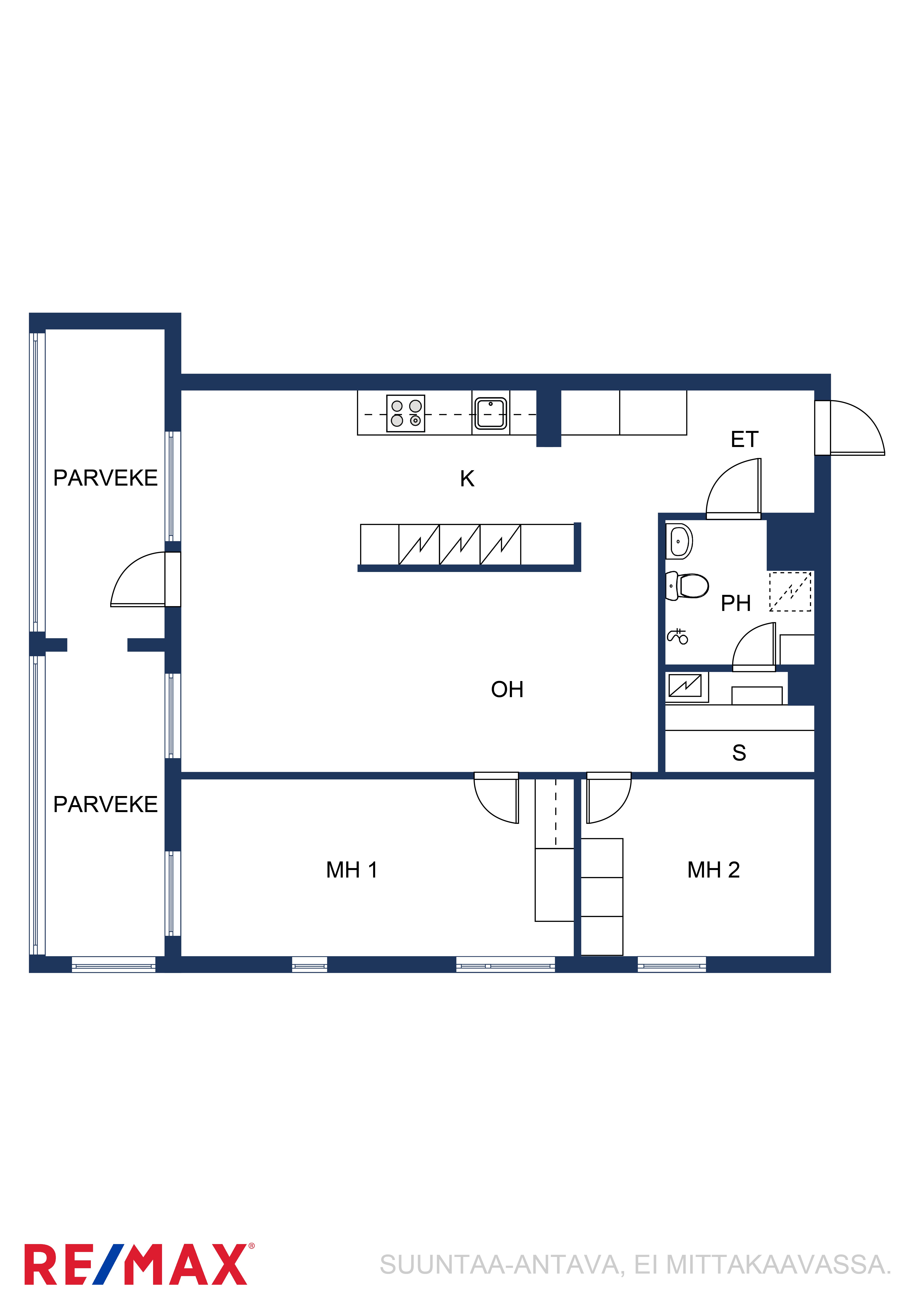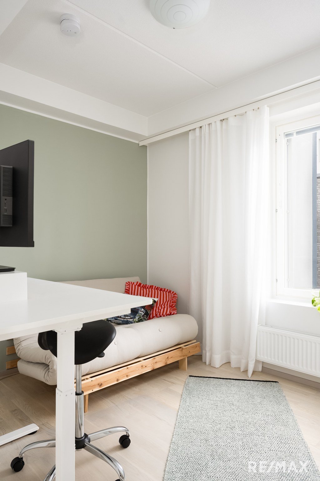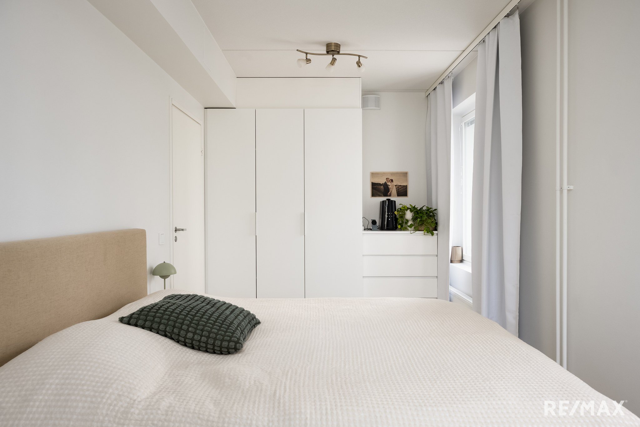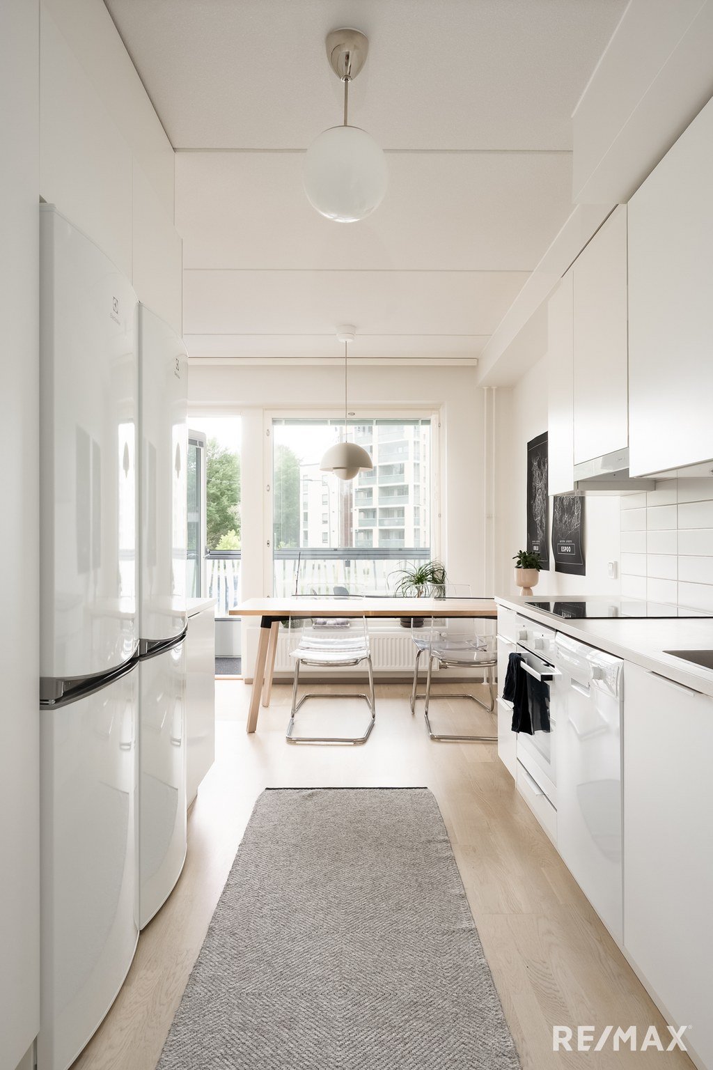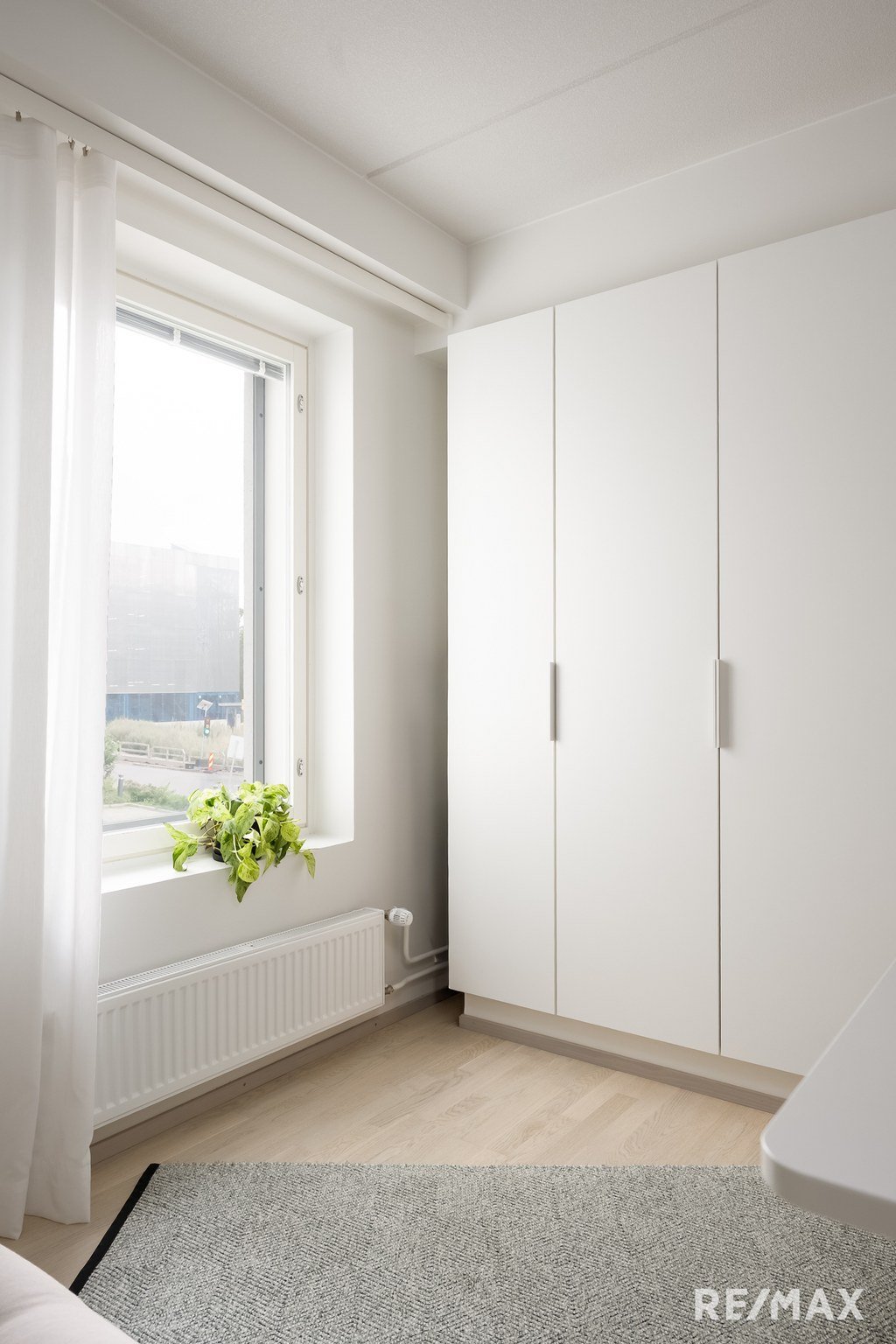 Asunnon 74 neliötä jakautuvat kahteen makuuhuoneeseen, avaraan olohuoneeseen sekä moderniin keittiöön, jossa on laadukkaat kodinkoneet. Suurempi makuuhuoneista on mahdollista jakaa kahdeksi pienmmäksi huoneeksi. Huoneen sähköt, ilmanvaihto ja valokatkaisijat ovat asennetut siten, että muutos on helposti toteuttetavissa.