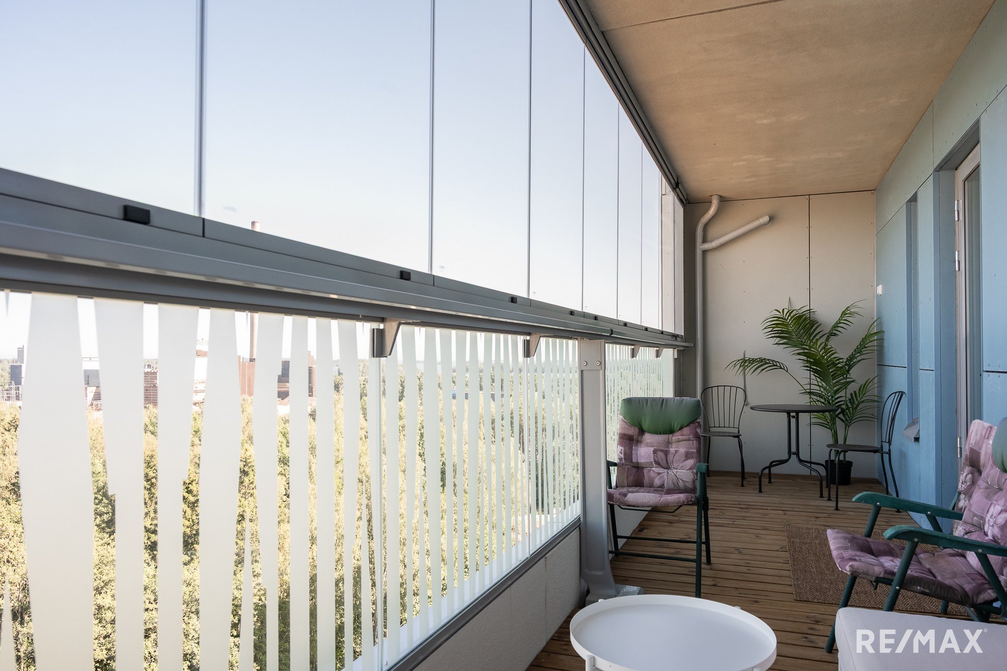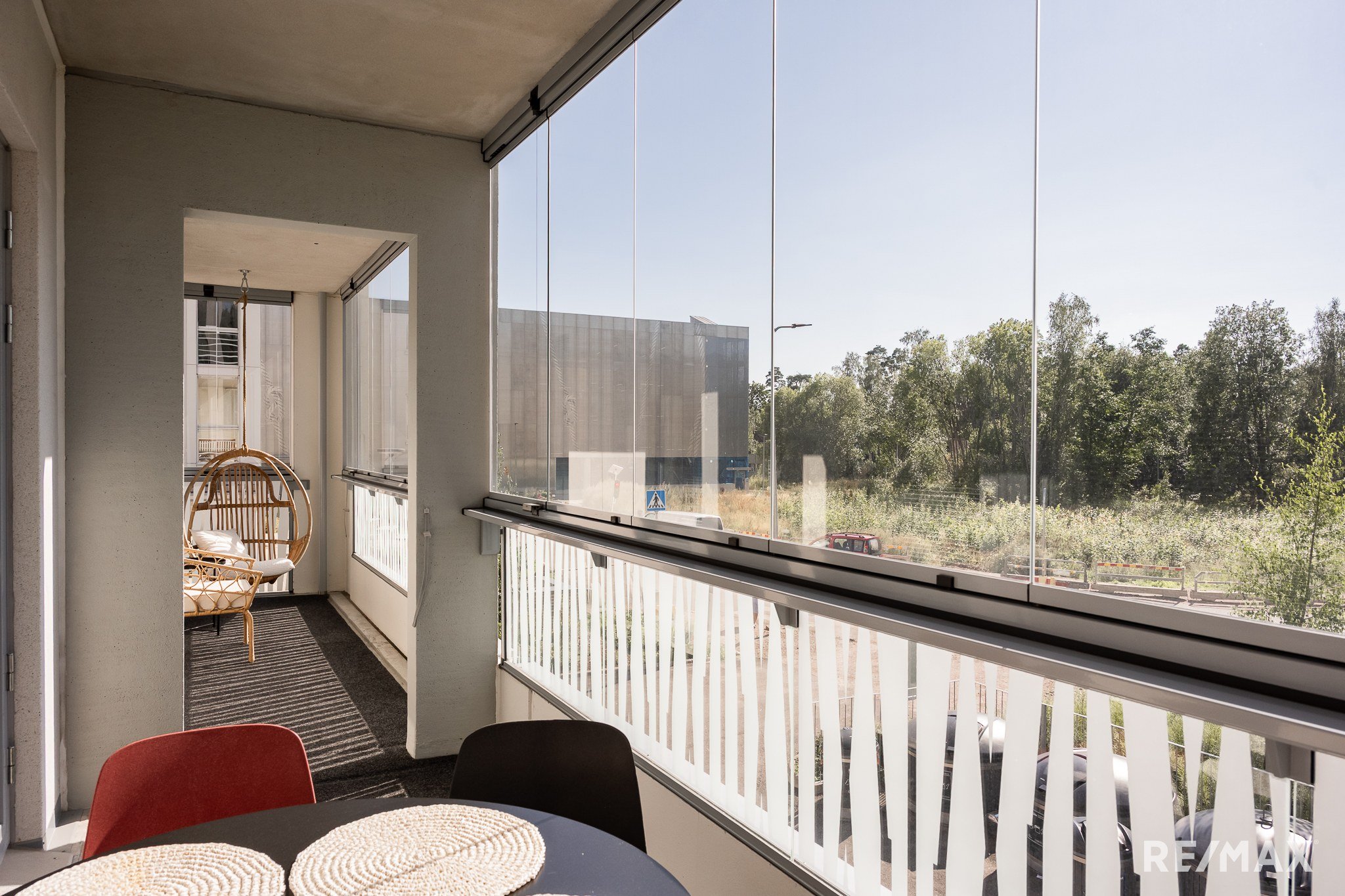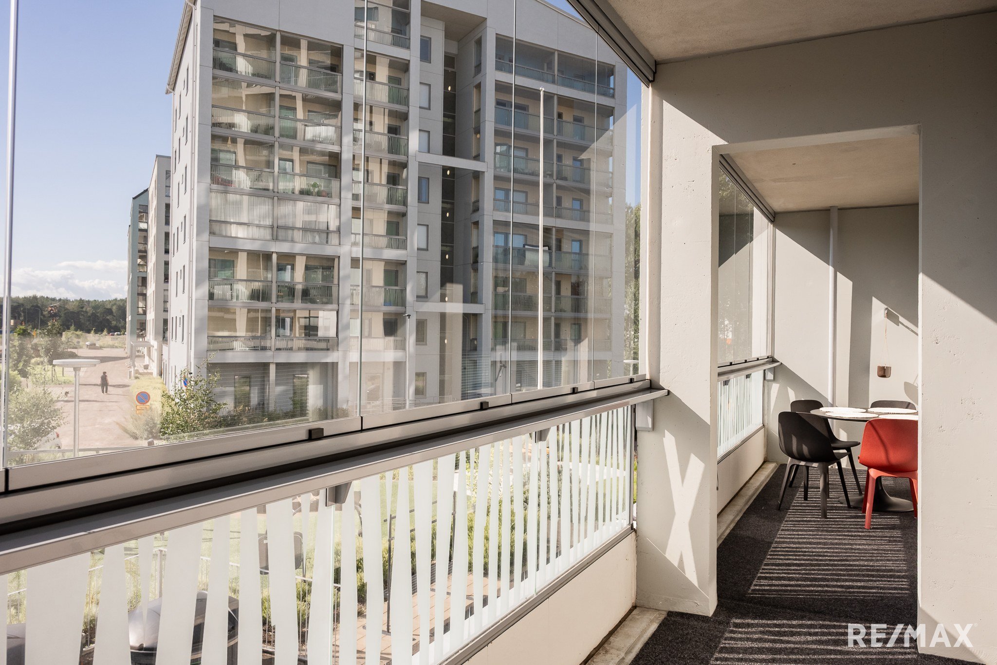 Olohuoneesta avautuu käynti 9,4 m leveälle lasitetulle länsiparvekkeelle, jonne ilta-aurinko luo miellyttävän tunnelman. Parvekkeelta avautuu rauhallinen näkymä, ja se toimii lisätilana ympäri vuoden. Keittiö on varustettu nykyaikaisilla kodinkoneilla, kuten induktioliesi, mikro ja astianpesukone, sekä erilliset jää- ja pakastekaapit. Asunnossa on oma sauna, jossa voi rentoutua päivän päätteeksi.