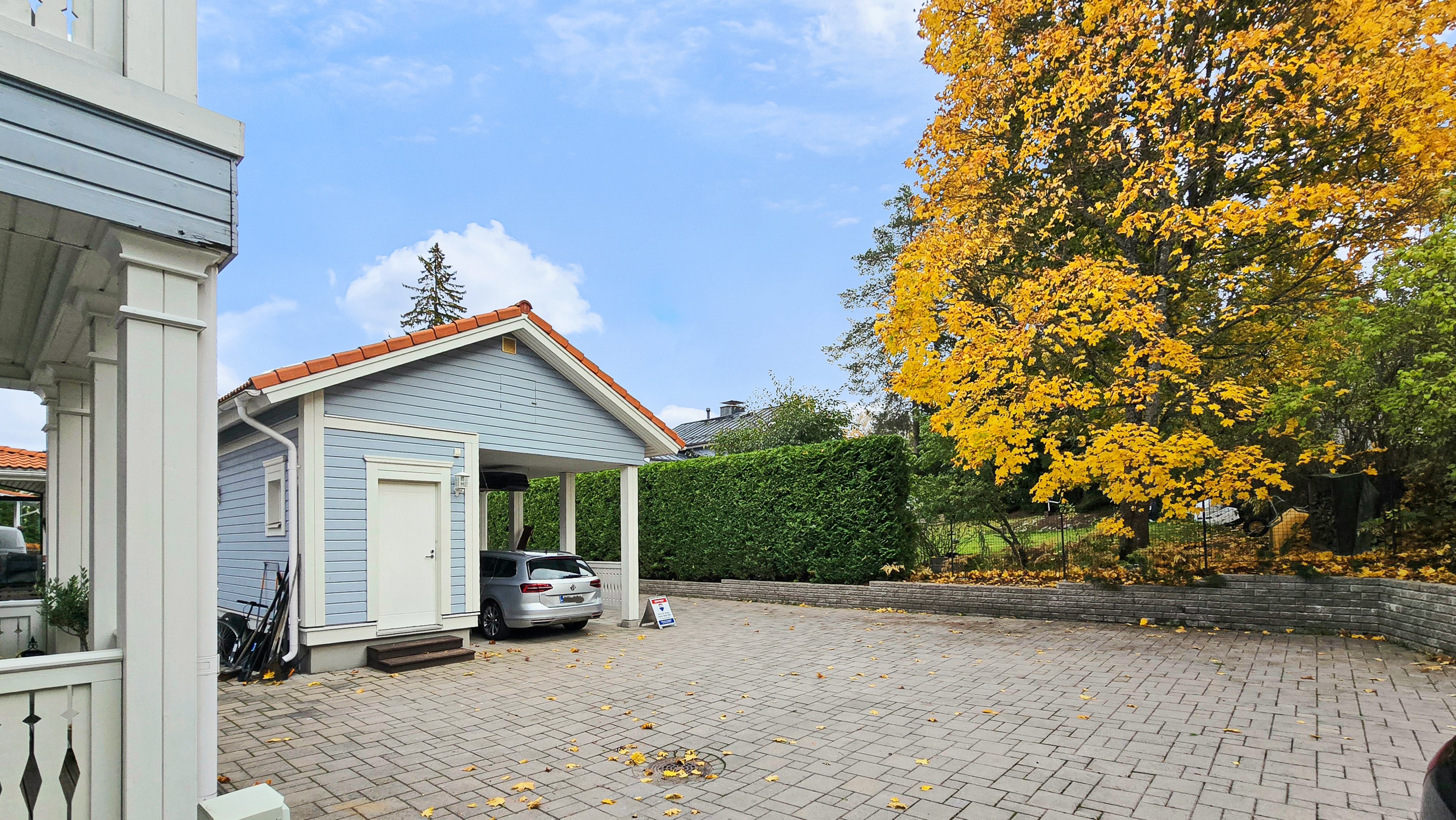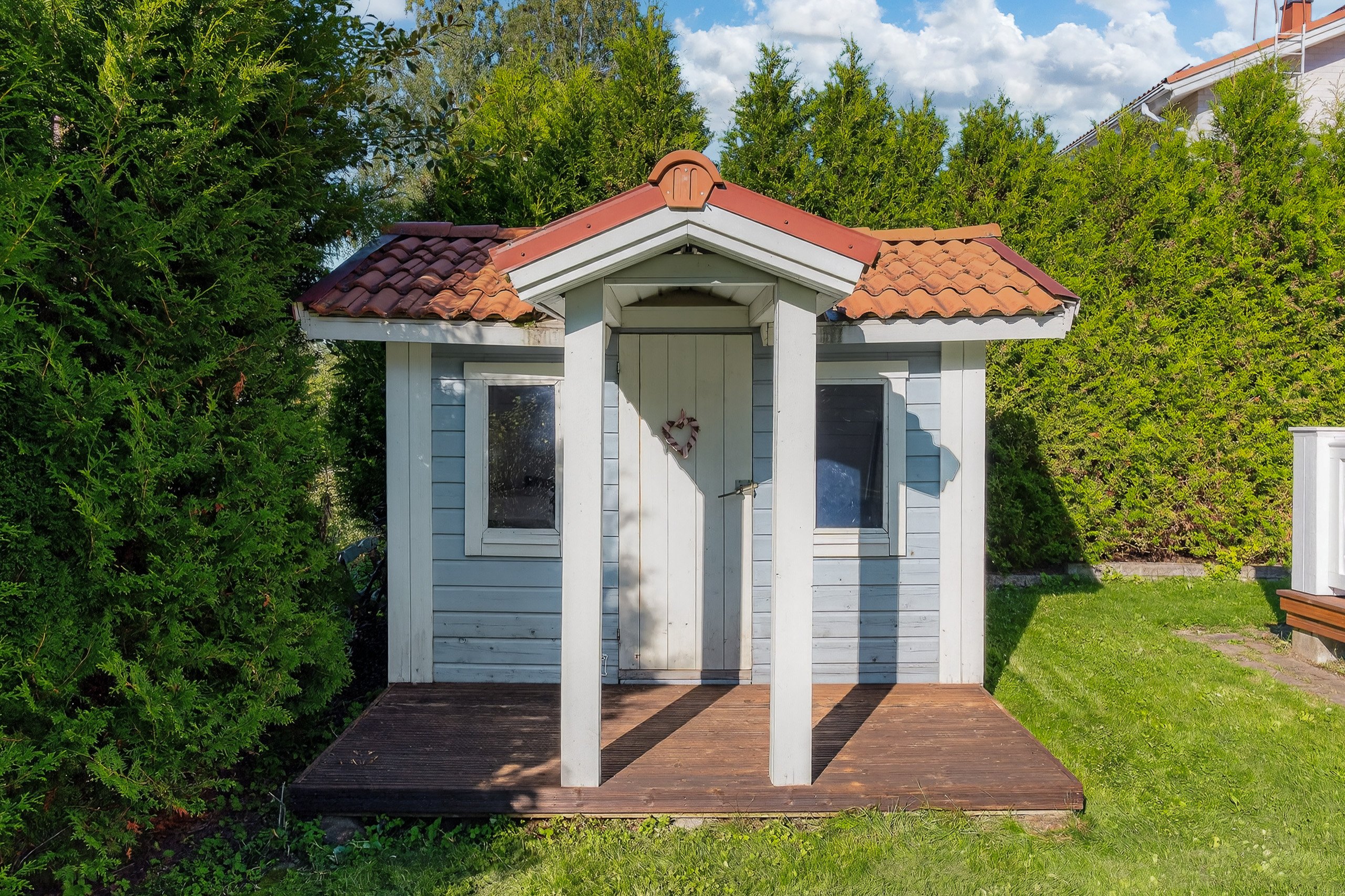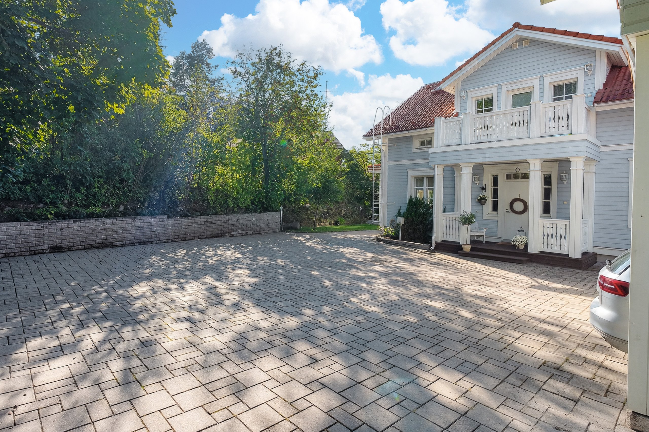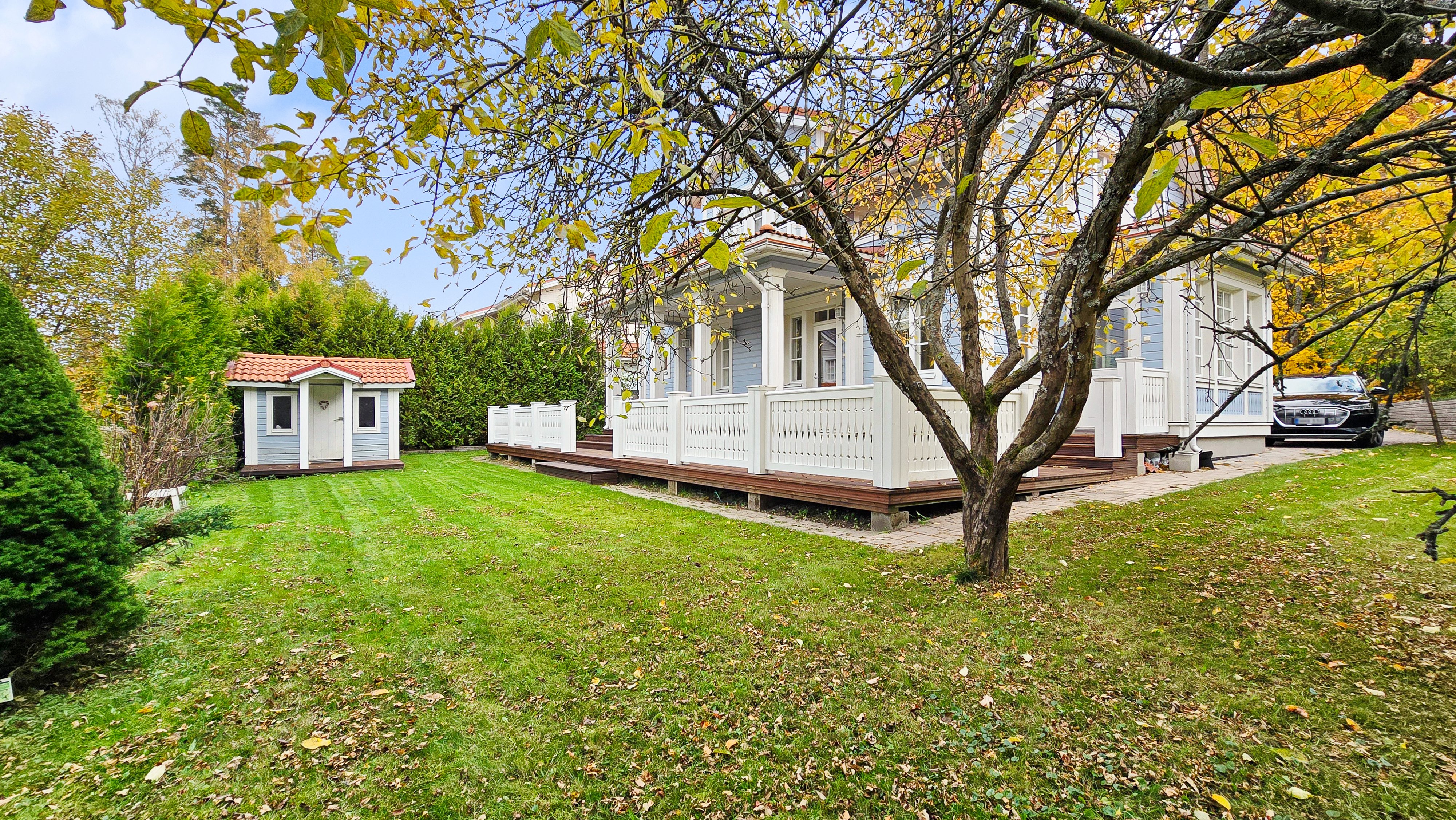 Takapihalla odottaa suuri terassi, siisti nurmialue, istutuksia sekä lasten iloksi leikkimökki. Etupiha on kivetty, tilava ja erittäin käytännöllinen: autokatos, varasto ja runsaasti tilaa usealle autolle tai vaikkapa pihapeleihin – kaikki valmiina uuden perheen käyttöön.