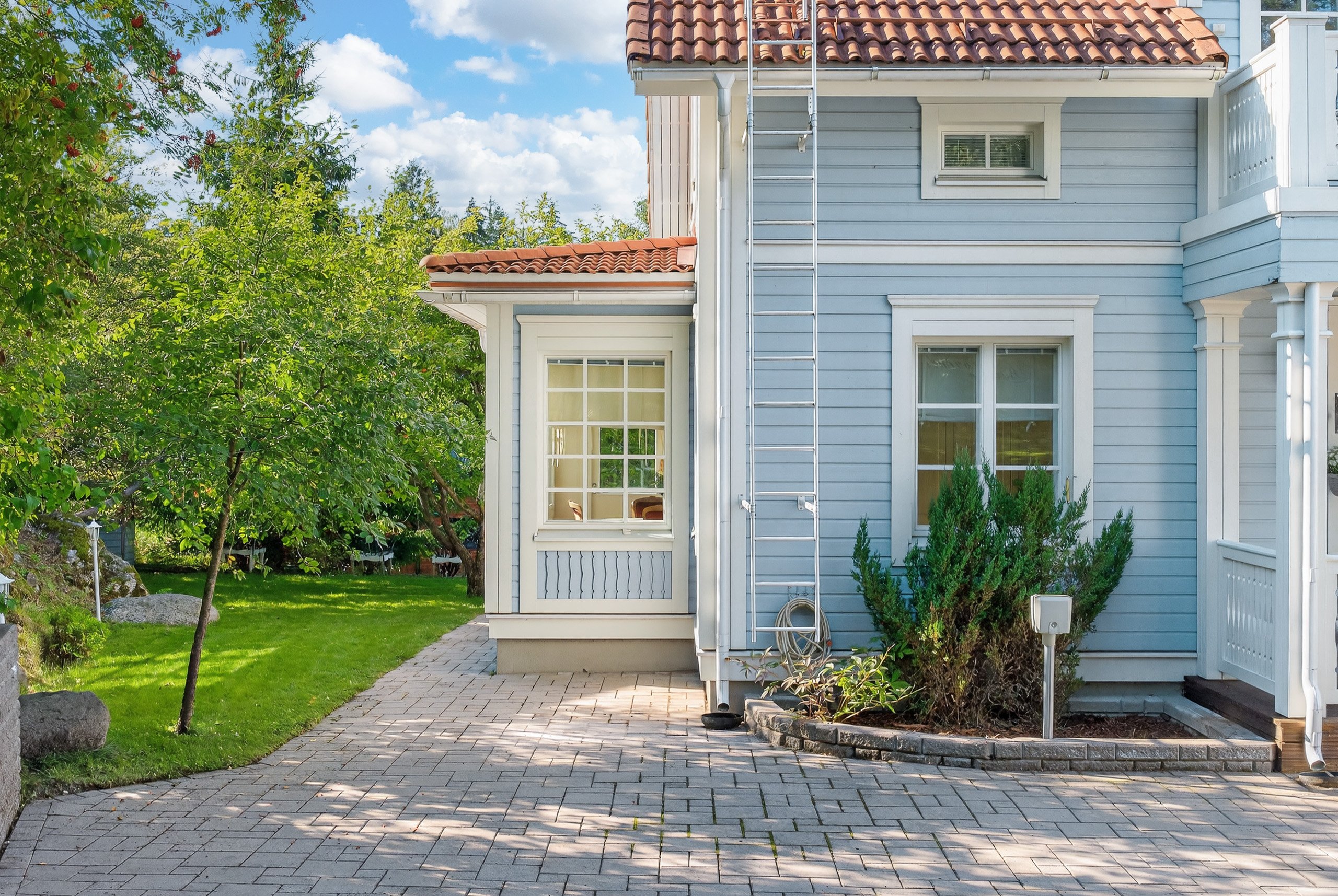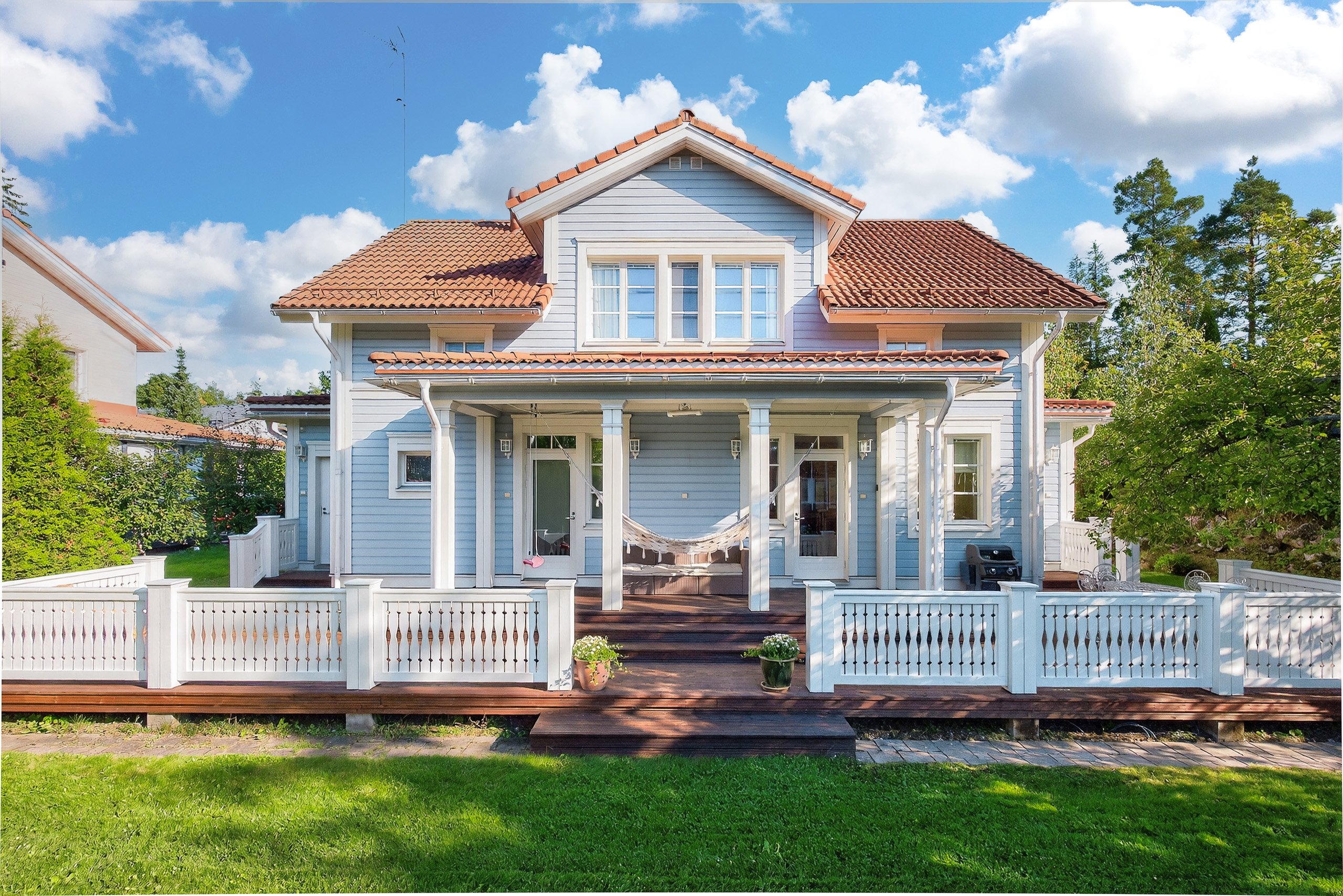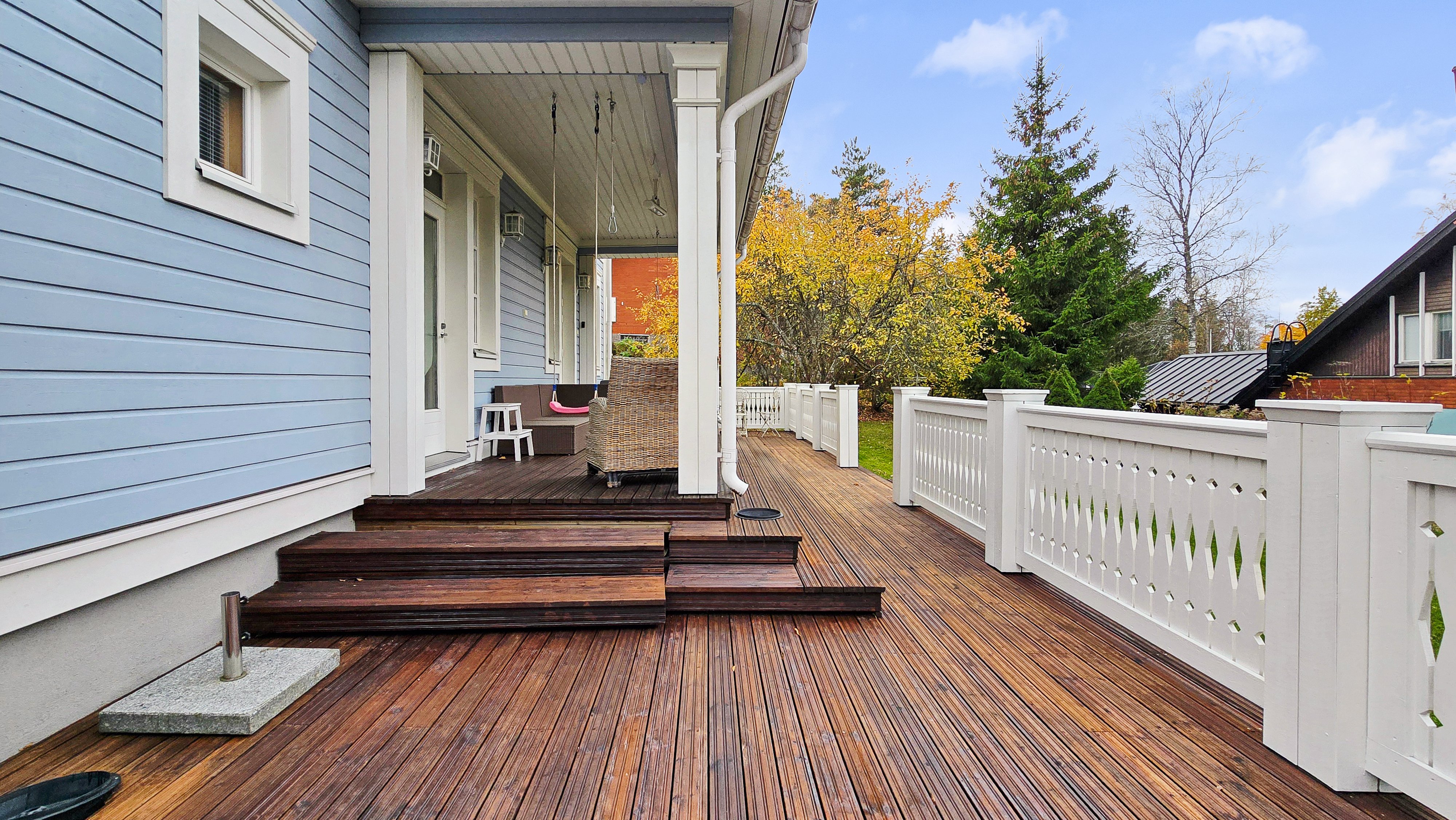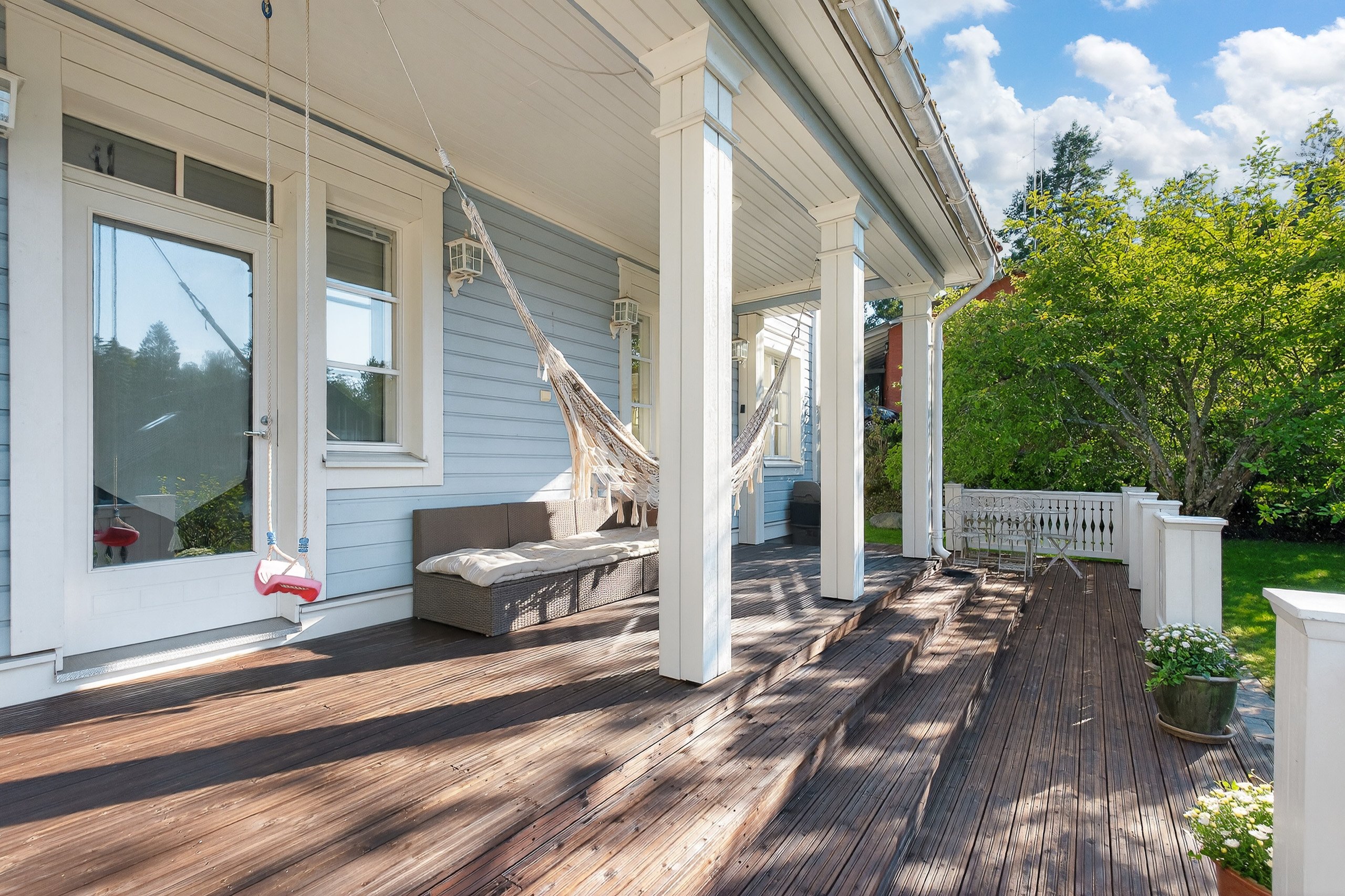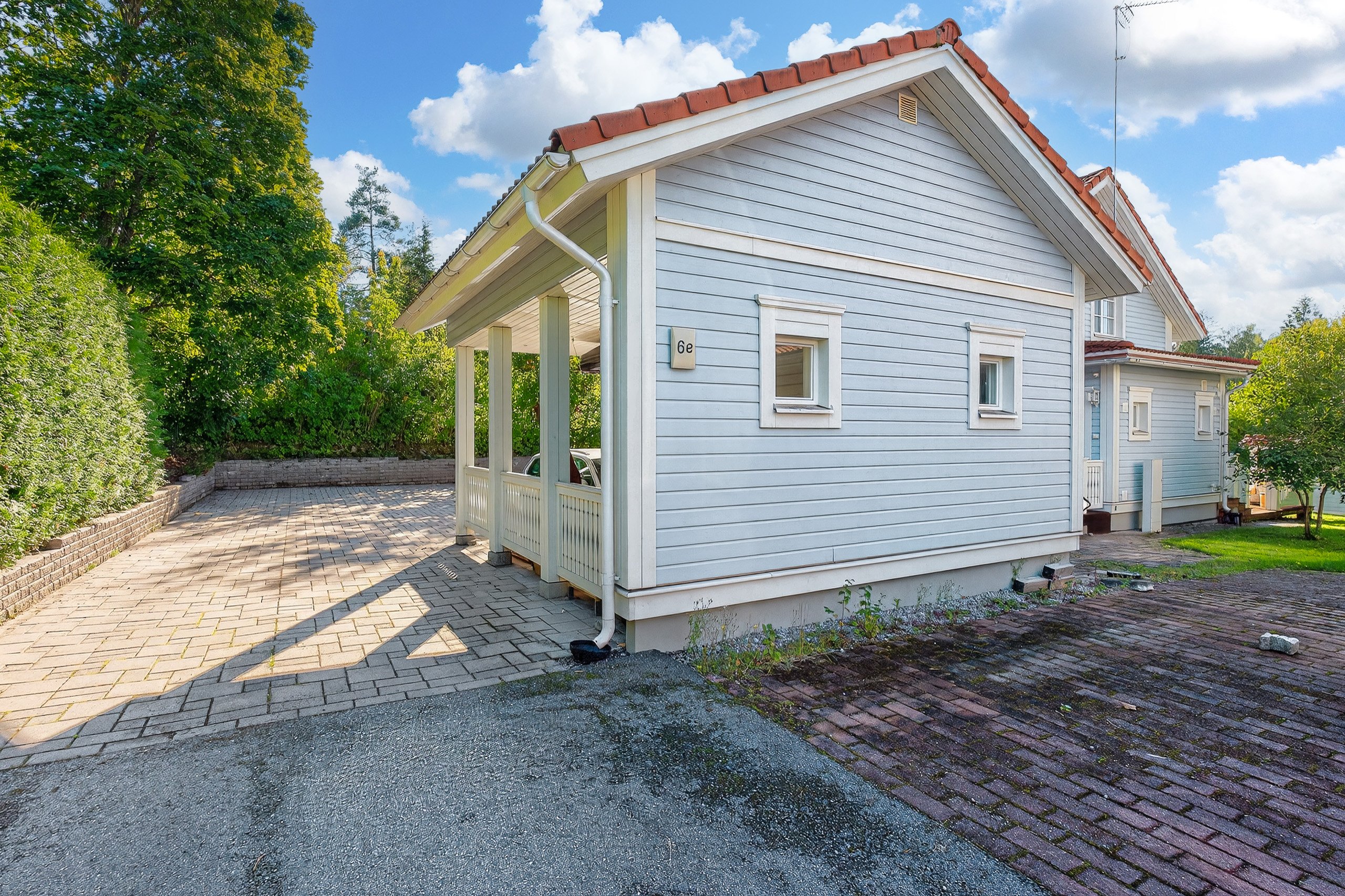 Takapihalla odottaa suuri terassi, siisti nurmialue, istutuksia sekä lasten iloksi leikkimökki. Etupiha on kivetty, tilava ja erittäin käytännöllinen: autokatos, varasto ja runsaasti tilaa usealle autolle tai vaikkapa pihapeleihin – kaikki valmiina uuden perheen käyttöön.