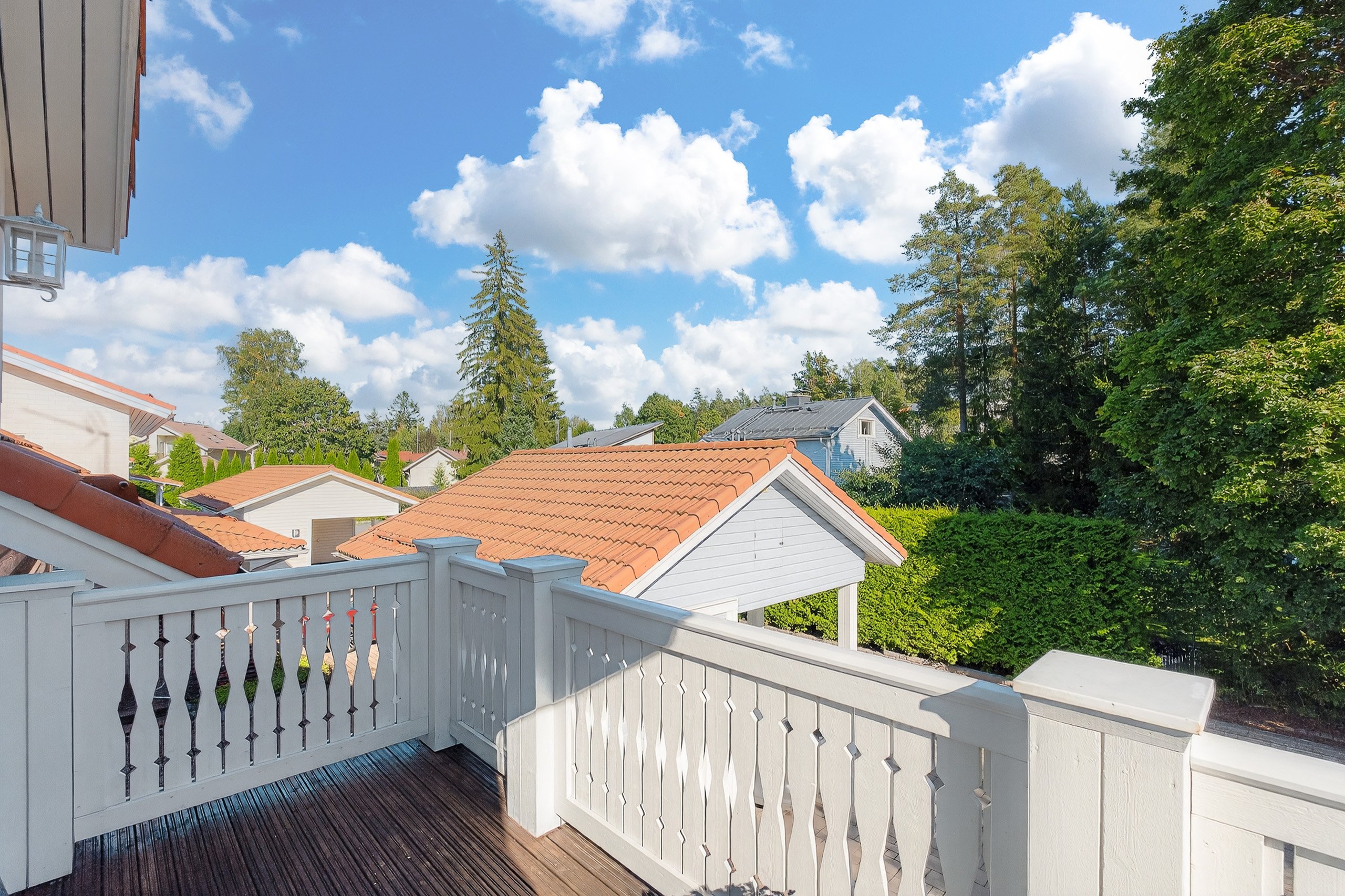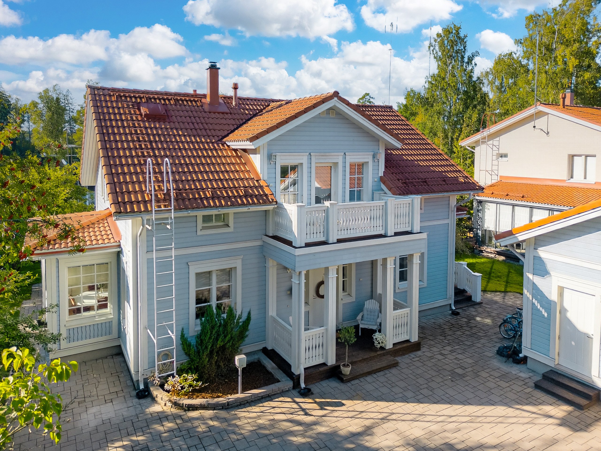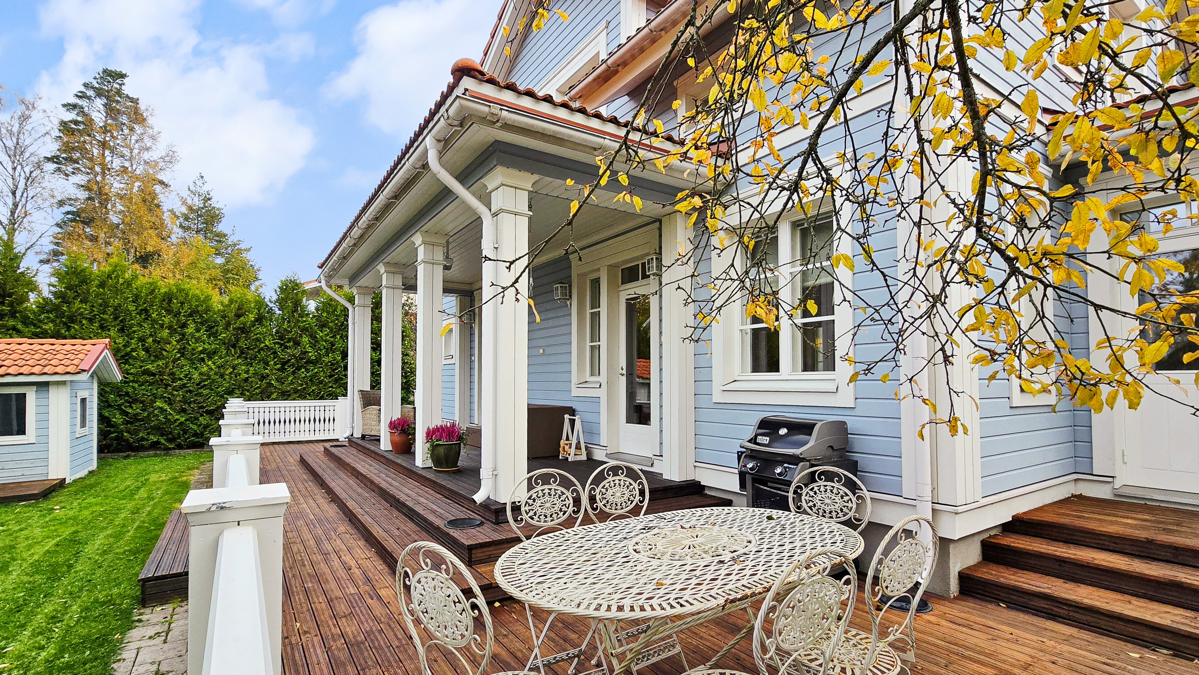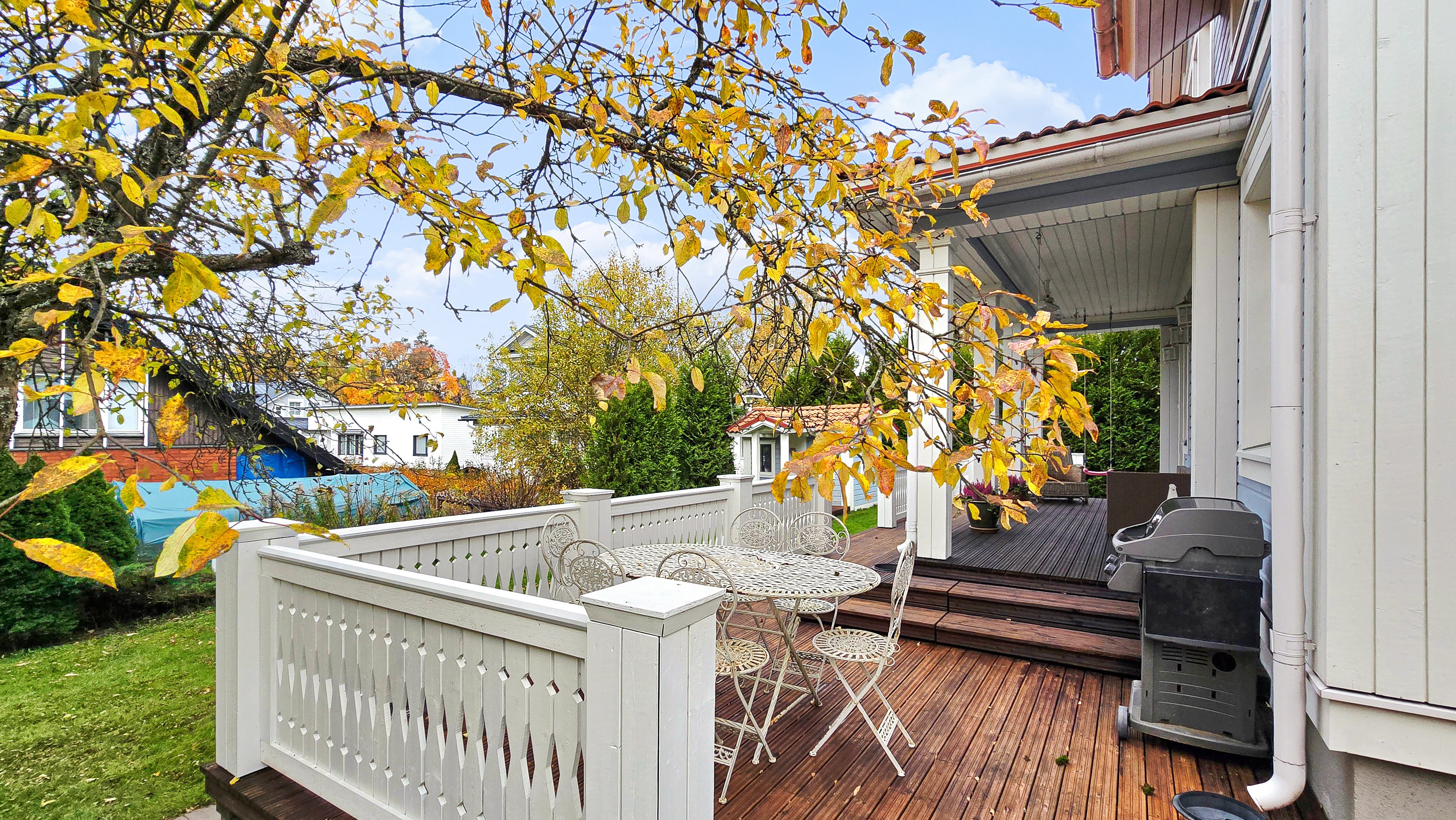 Takapihalla odottaa suuri terassi, siisti nurmialue, istutuksia sekä lasten iloksi leikkimökki. Etupiha on kivetty, tilava ja erittäin käytännöllinen: autokatos, varasto ja runsaasti tilaa usealle autolle tai vaikkapa pihapeleihin – kaikki valmiina uuden perheen käyttöön.