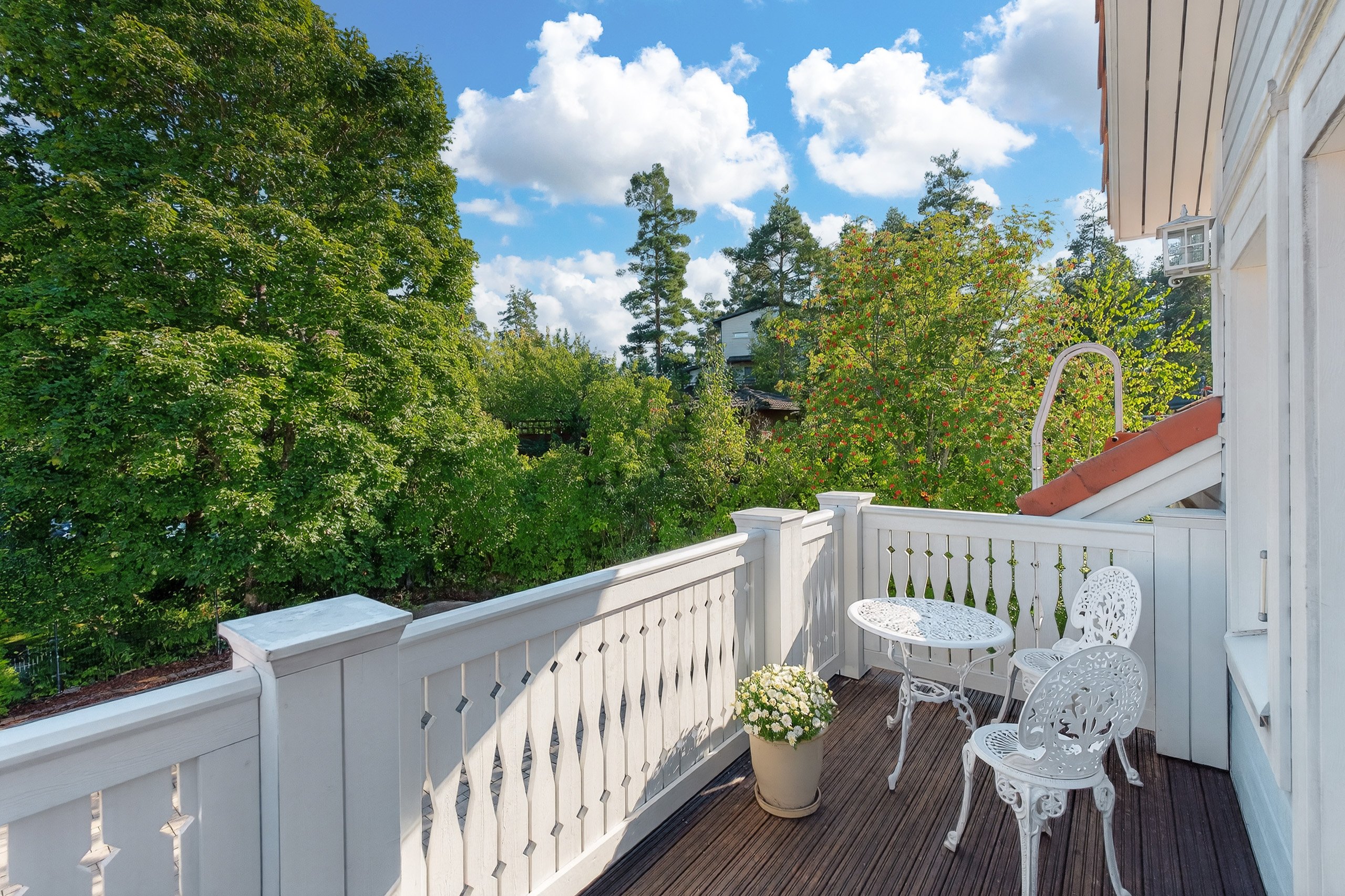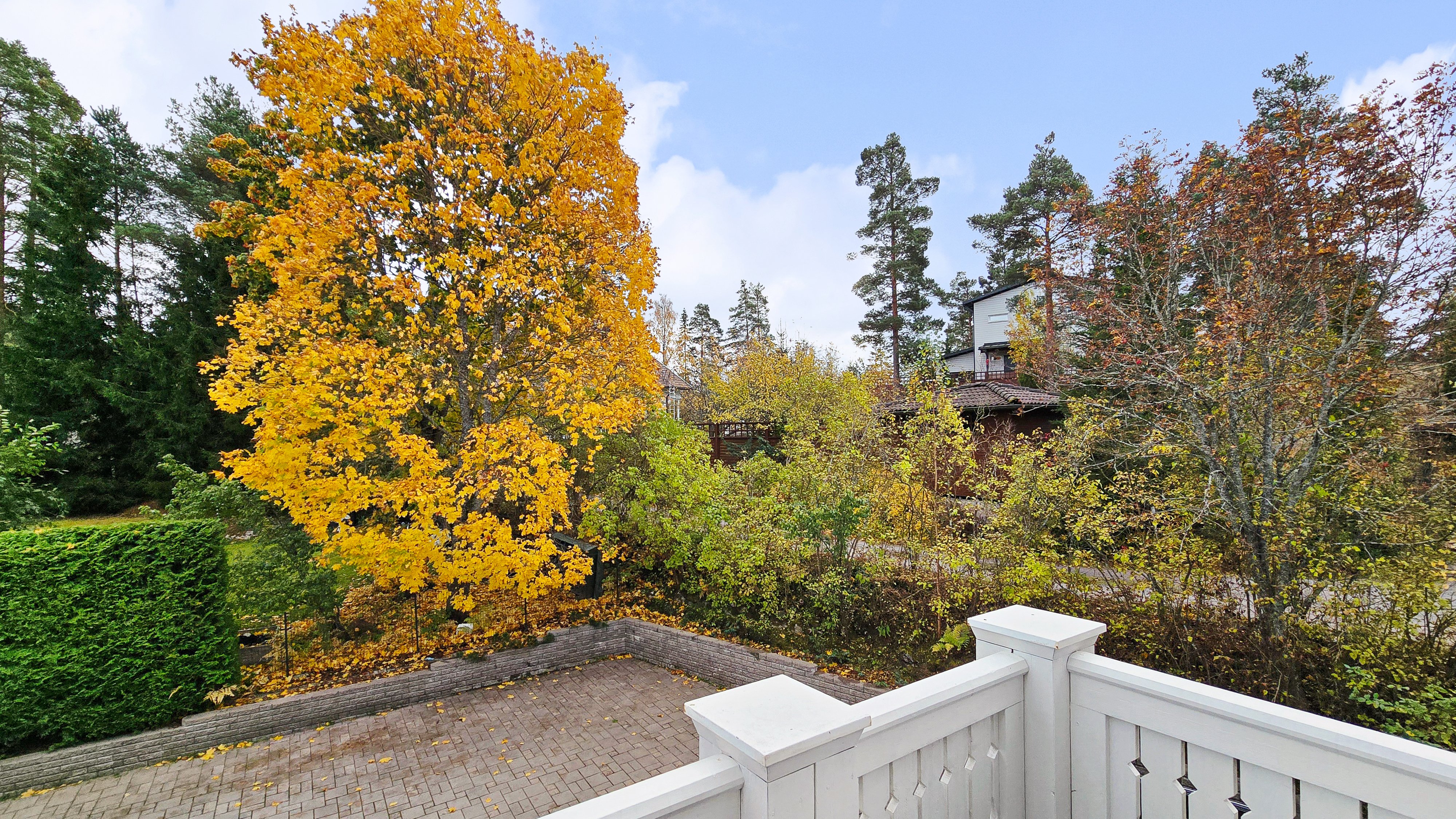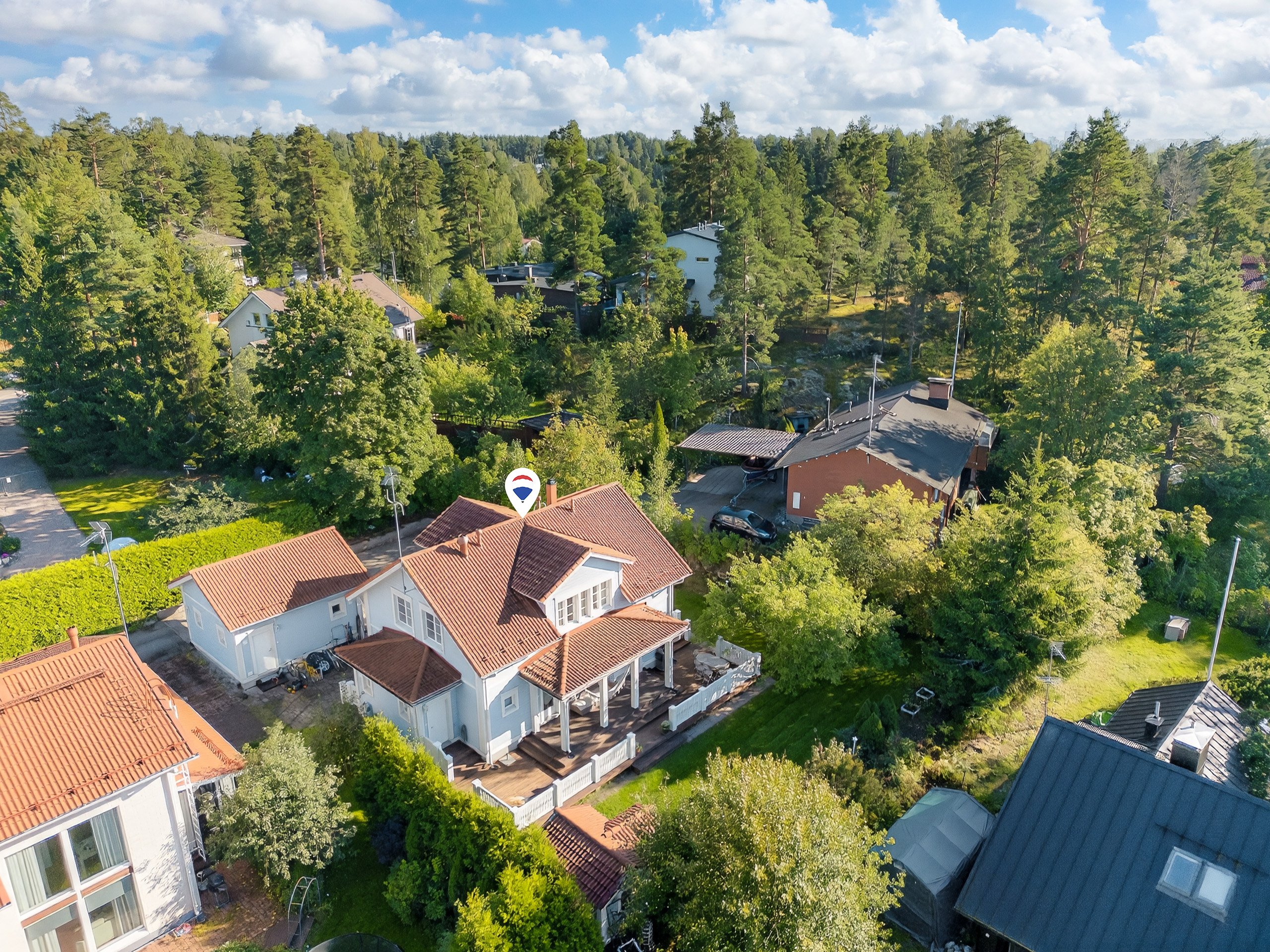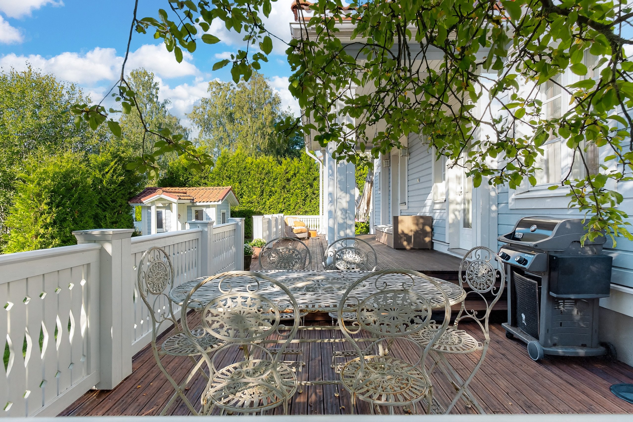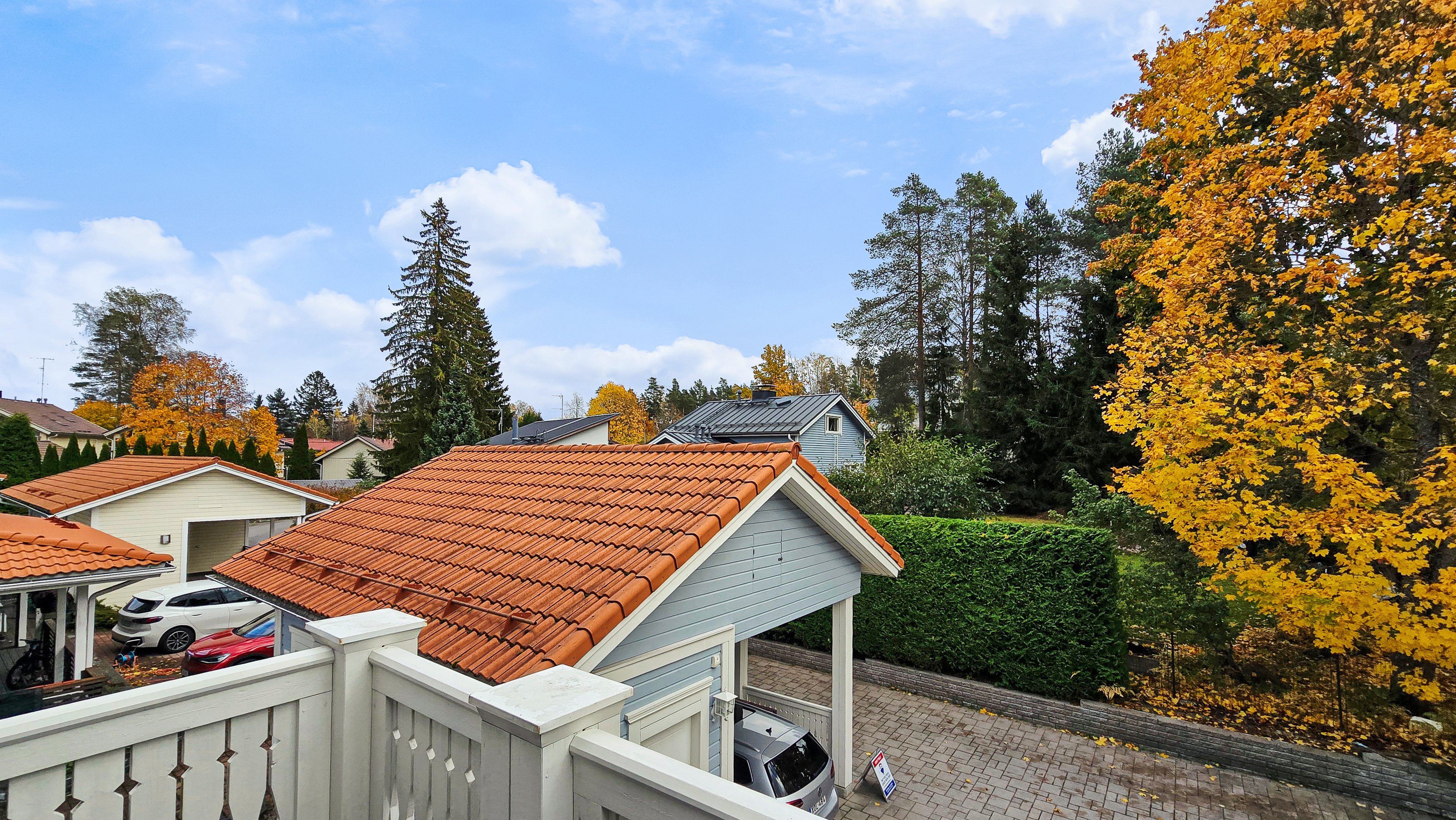 Takapihalla odottaa suuri terassi, siisti nurmialue, istutuksia sekä lasten iloksi leikkimökki. Etupiha on kivetty, tilava ja erittäin käytännöllinen: autokatos, varasto ja runsaasti tilaa usealle autolle tai vaikkapa pihapeleihin – kaikki valmiina uuden perheen käyttöön.