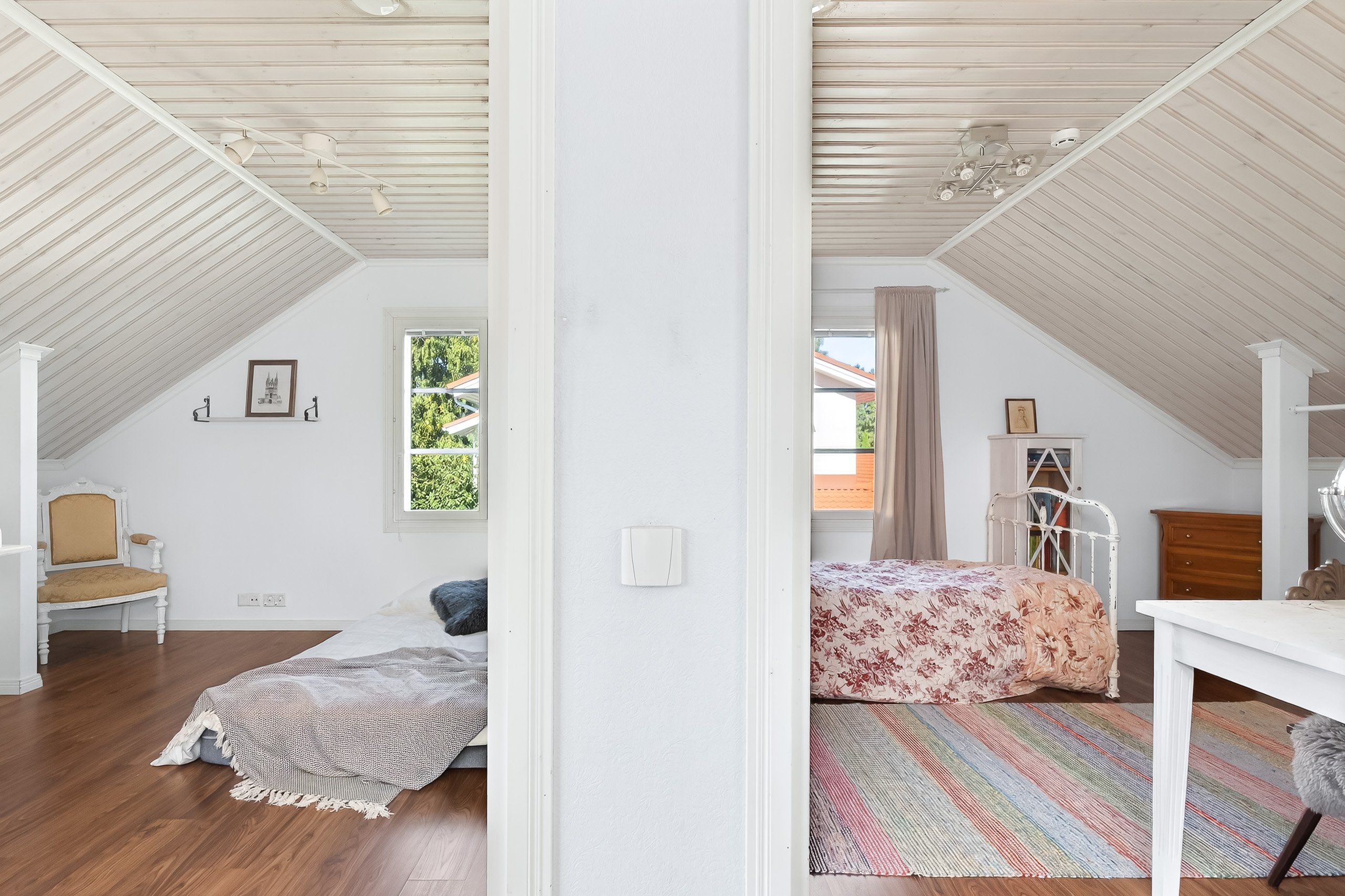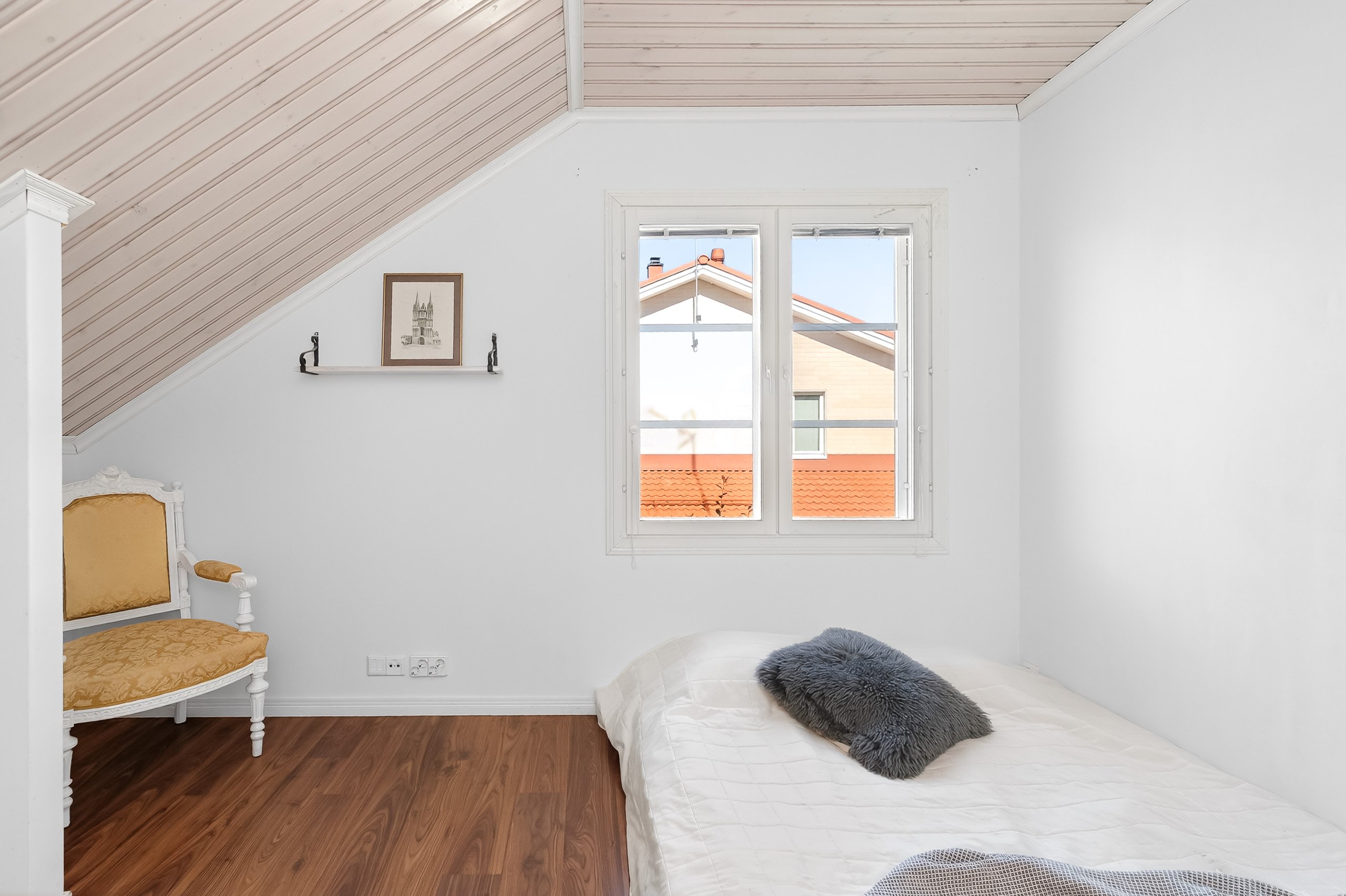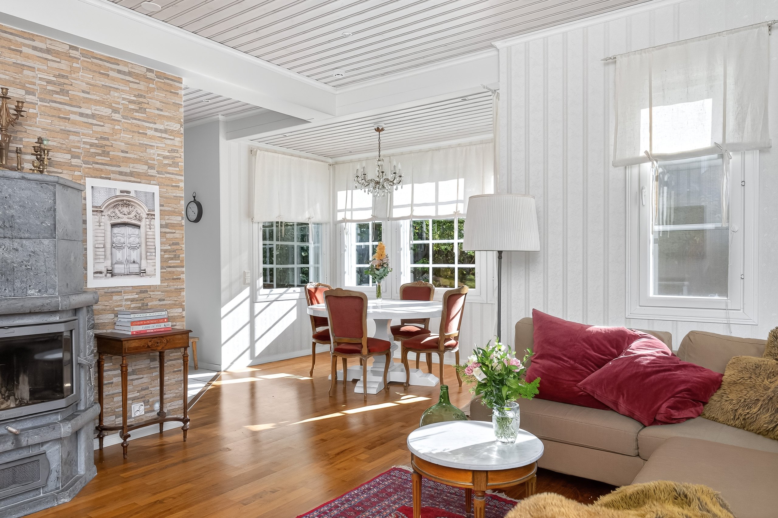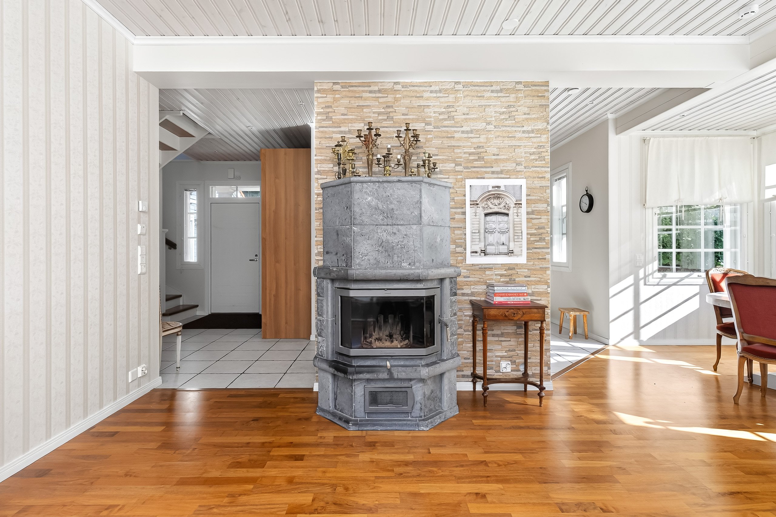 Kodikkaat ja toimivat tilat jakautuvat kahteen kerrokseen. Alakerrasta löytyy yksi makuuhuone, kun taas yläkerrassa on kolme lisää – jokaiselle perheenjäsenelle löytyy oma rauhallinen soppi. Olohuone yhdistyy saumattomasti ruokailutilaan, jossa kaunis takka luo lämpöä ja tunnelmaa pimeneviin iltoihin.