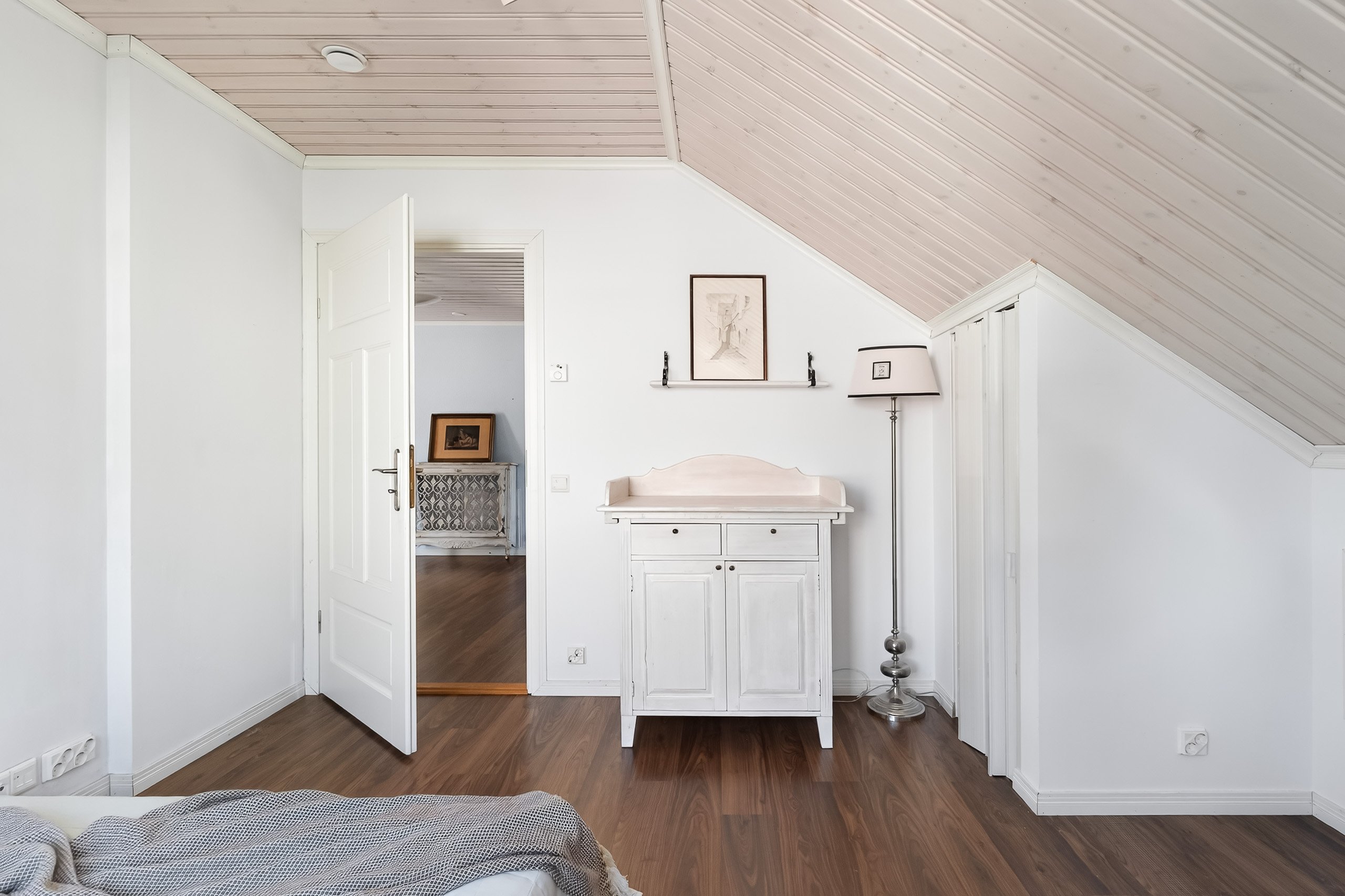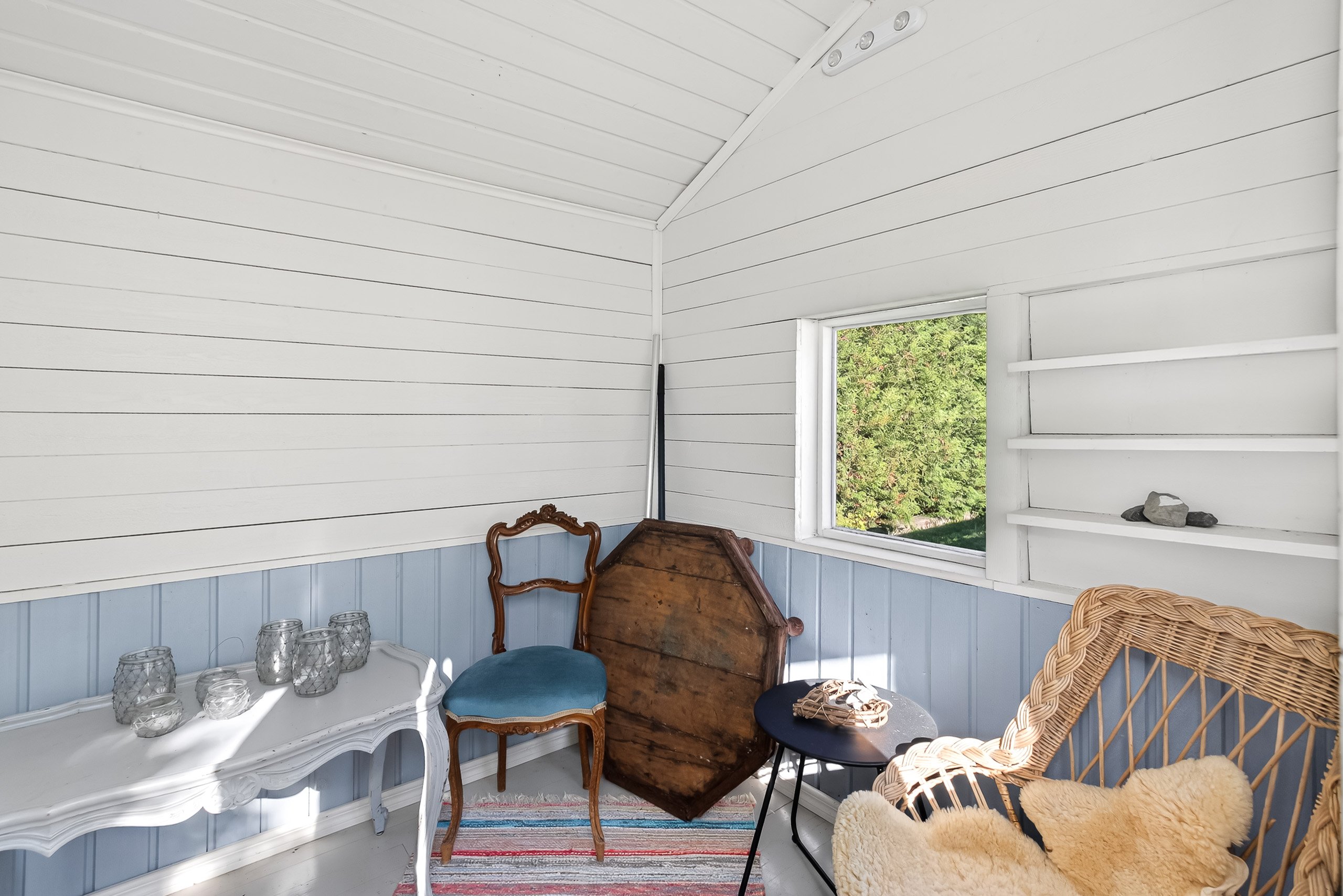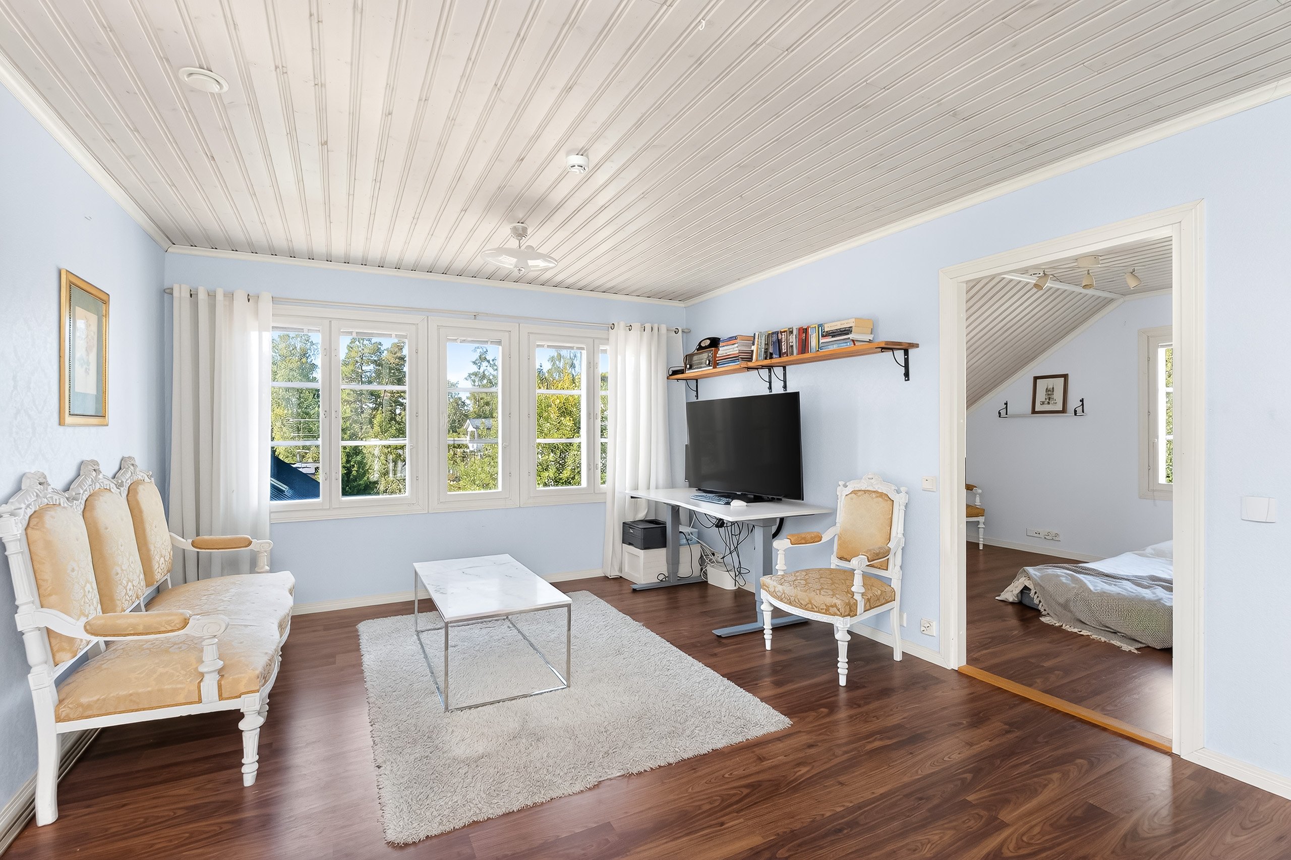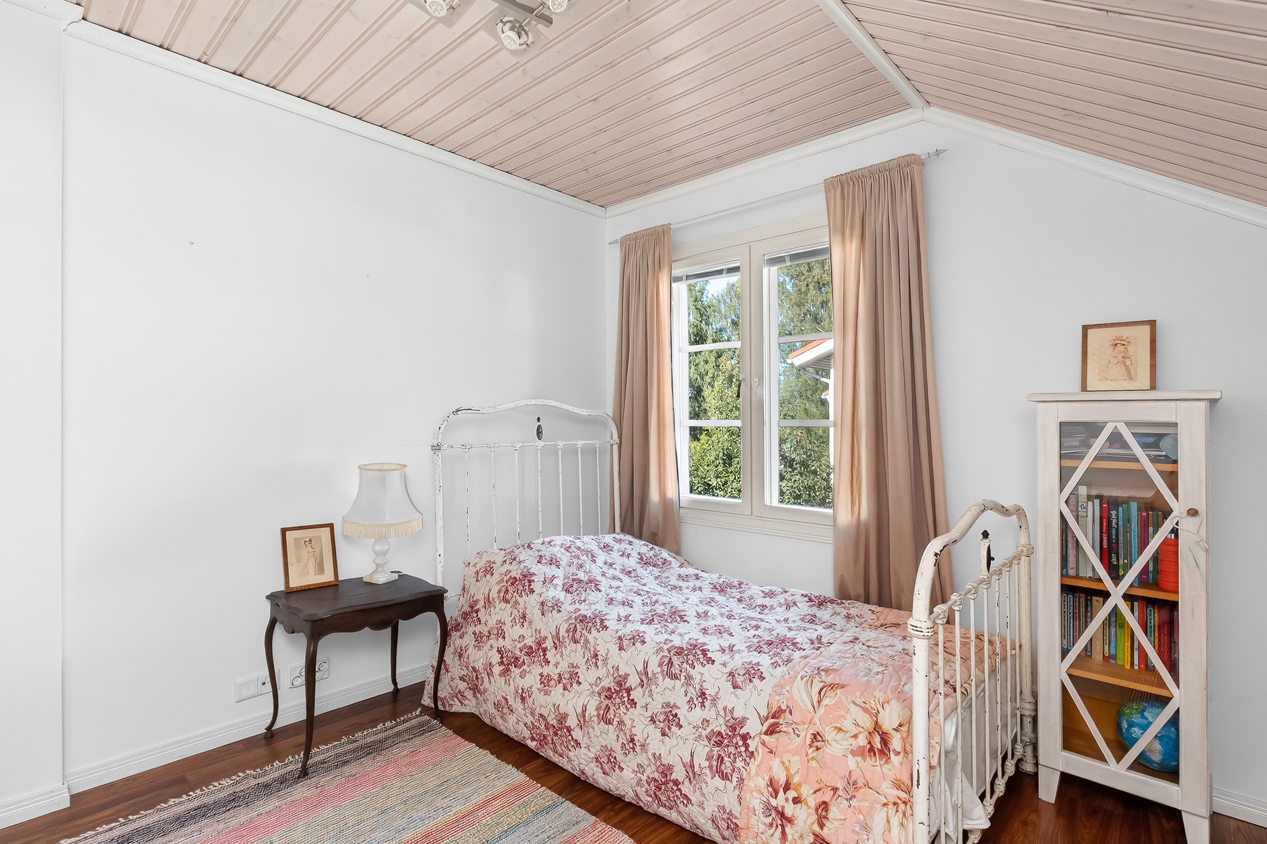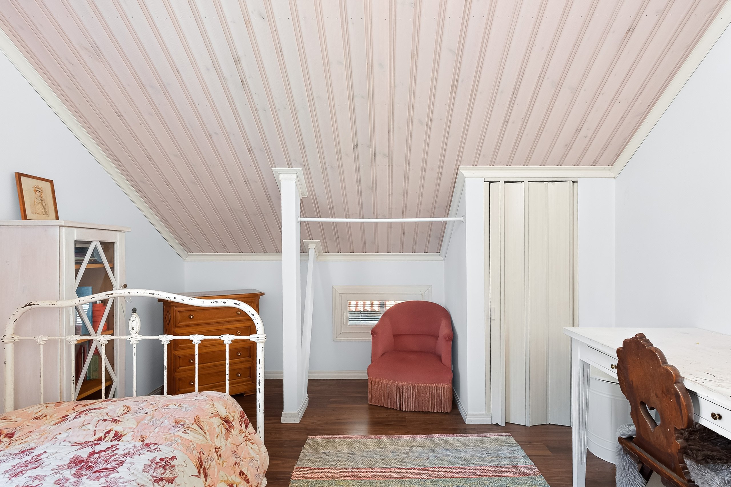 Kodikkaat ja toimivat tilat jakautuvat kahteen kerrokseen. Alakerrasta löytyy yksi makuuhuone, kun taas yläkerrassa on kolme lisää – jokaiselle perheenjäsenelle löytyy oma rauhallinen soppi. Olohuone yhdistyy saumattomasti ruokailutilaan, jossa kaunis takka luo lämpöä ja tunnelmaa pimeneviin iltoihin.