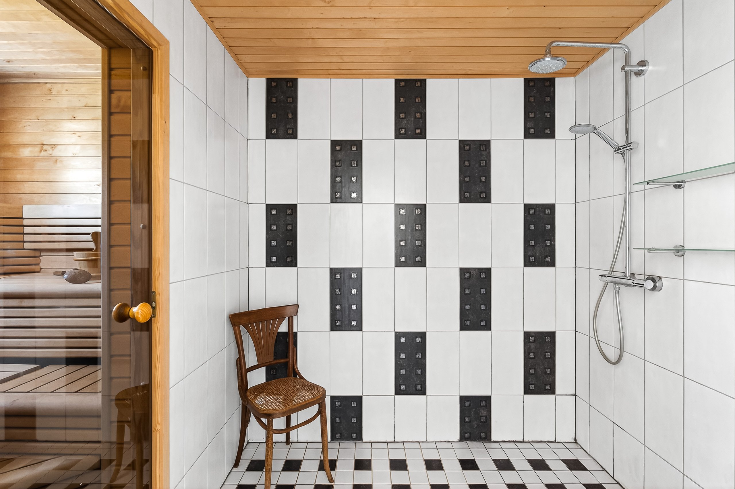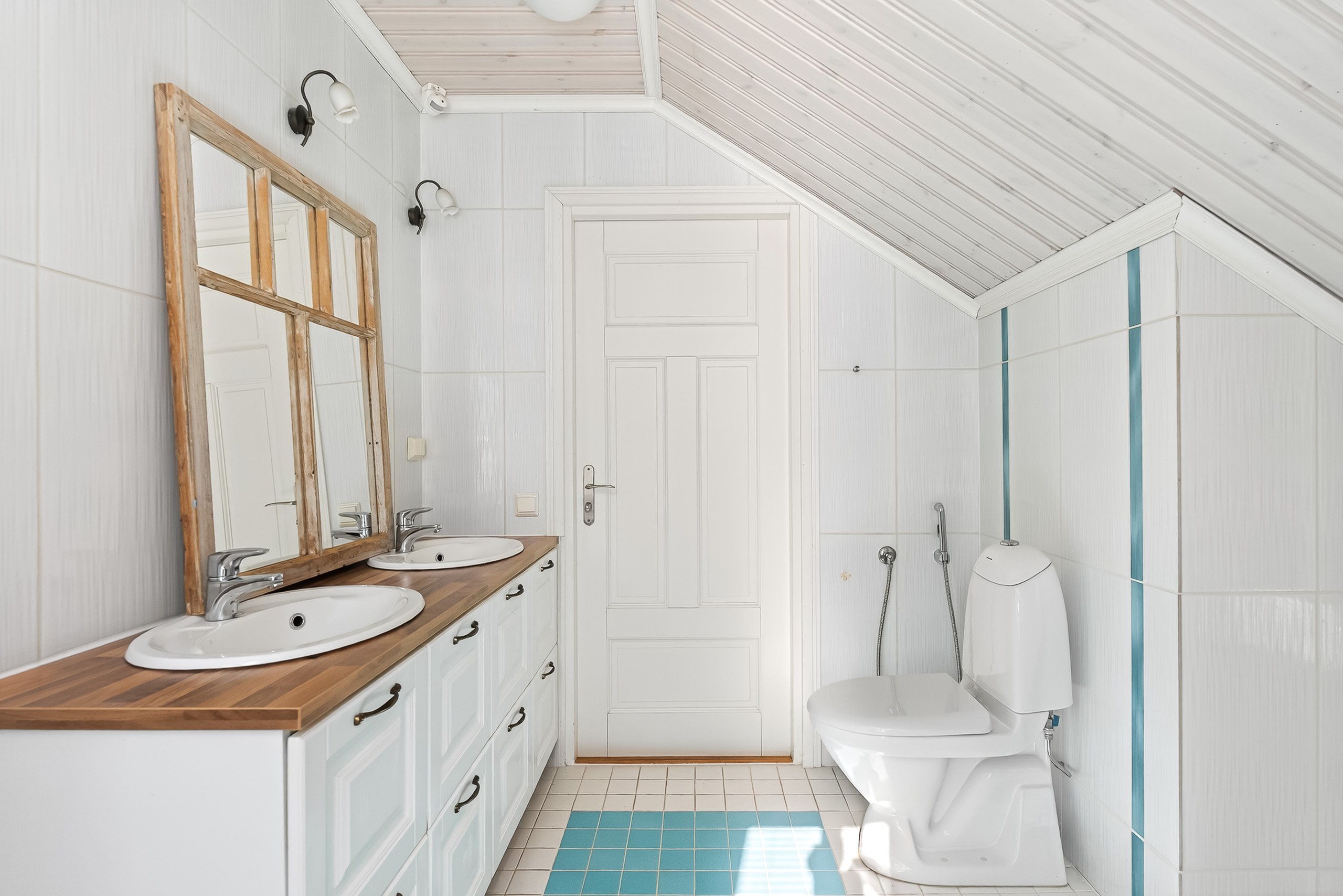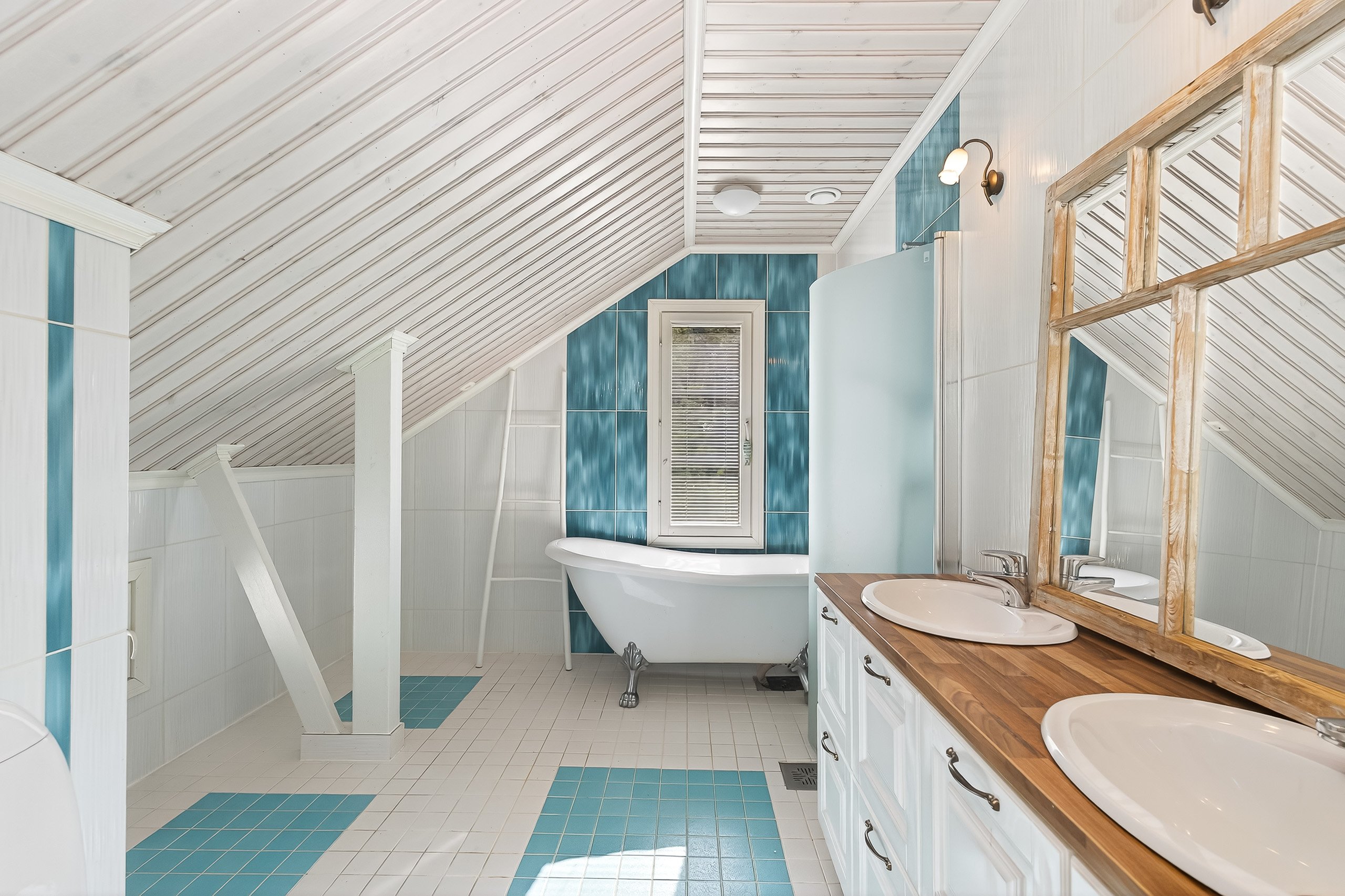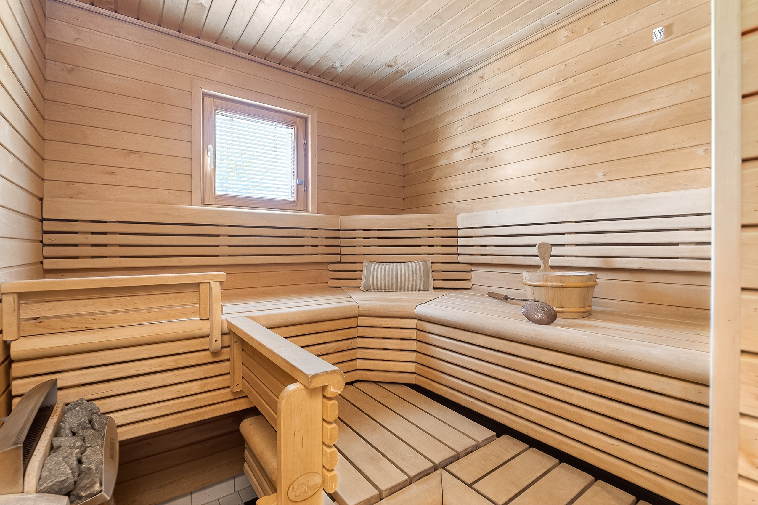 Yläkerran kylpyhuoneessa on kylpyamme ja kaksi pesuallasta – täydellistä kiireettömiin hetkiin. Alakerran pesuhuoneessa on kaksi sadesuihkua, ja lisäksi talossa on ikkunallinen sauna sähkökiukaalla – paikka rentoutua päivän päätteeksi. Arkea helpottaa erillinen wc alakerrassa.