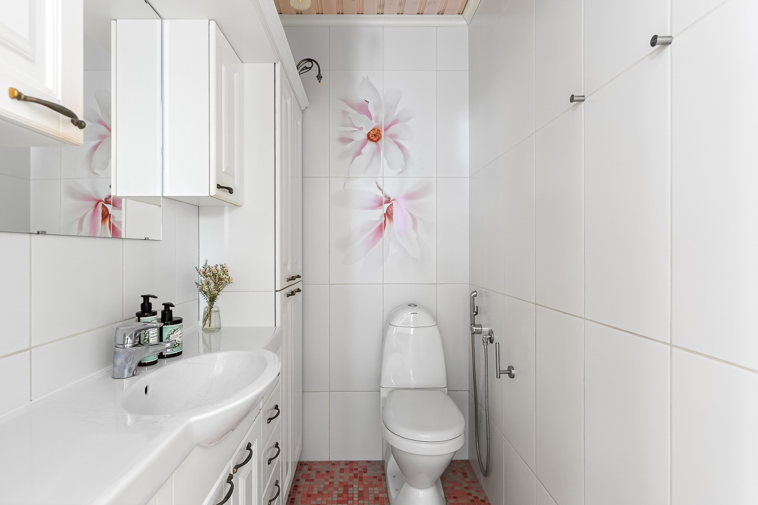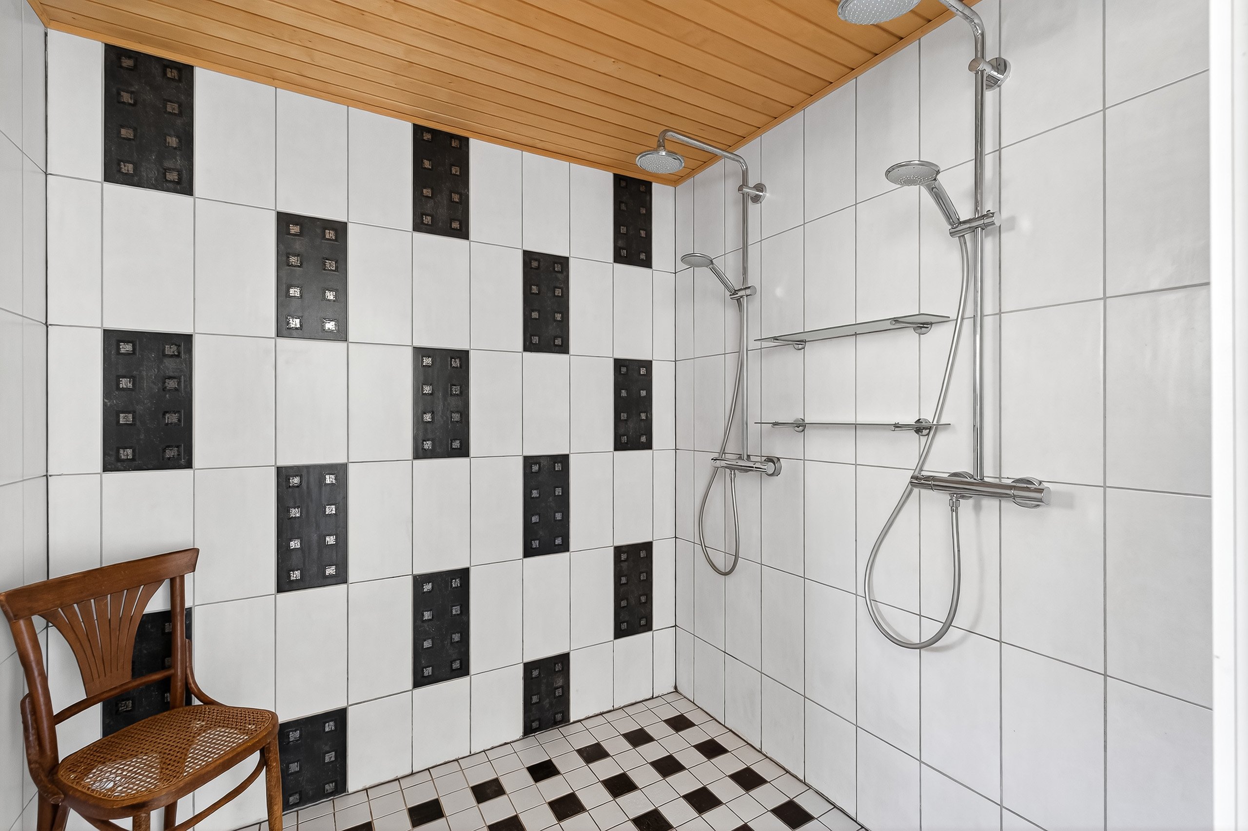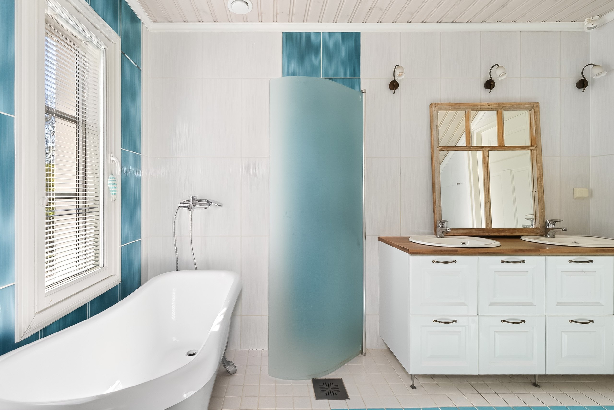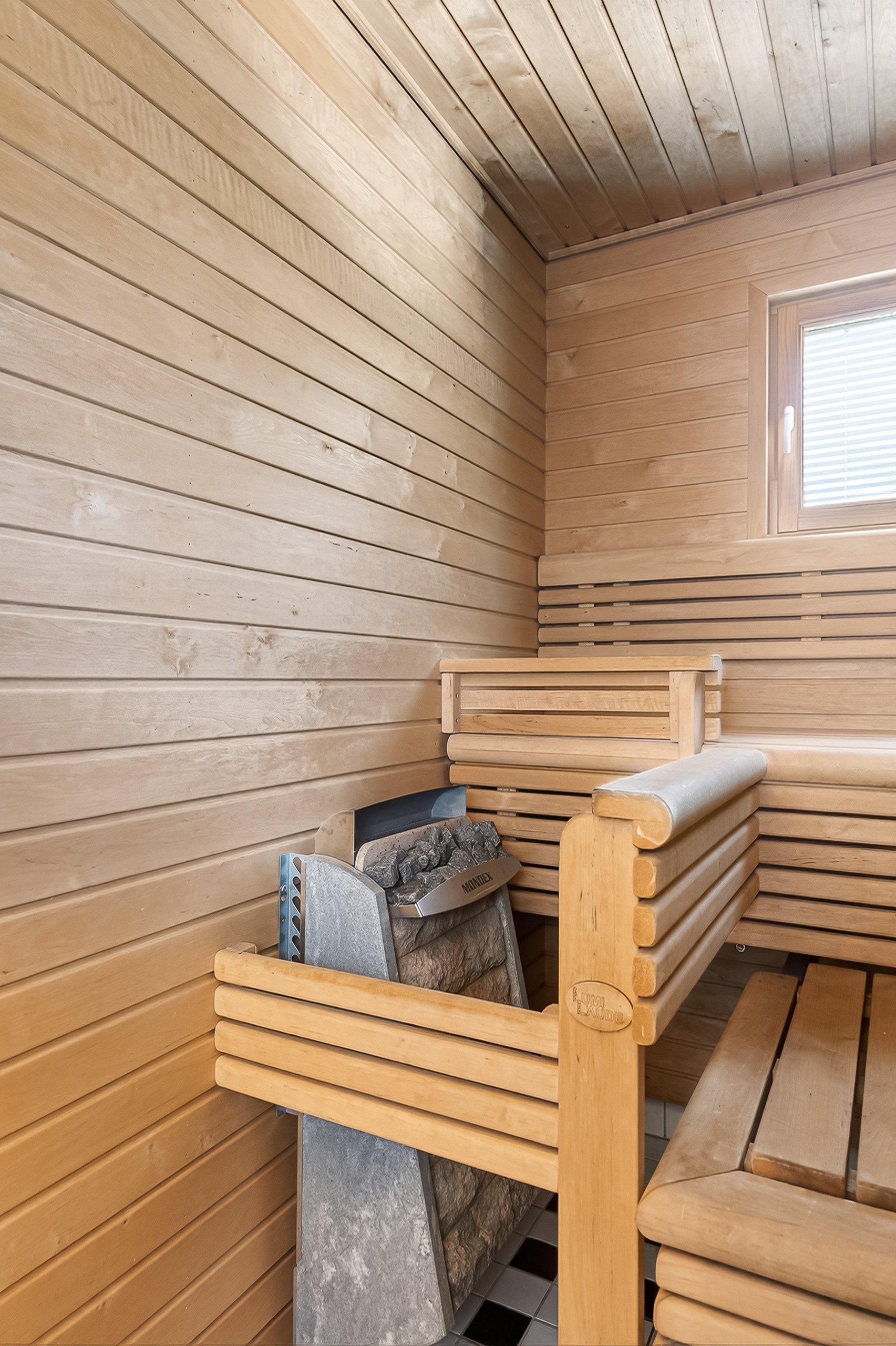Yläkerran kylpyhuoneessa on kylpyamme ja kaksi pesuallasta – täydellistä kiireettömiin hetkiin. Alakerran pesuhuoneessa on kaksi sadesuihkua, ja lisäksi talossa on ikkunallinen sauna sähkökiukaalla – paikka rentoutua päivän päätteeksi. Arkea helpottaa erillinen wc alakerrassa.