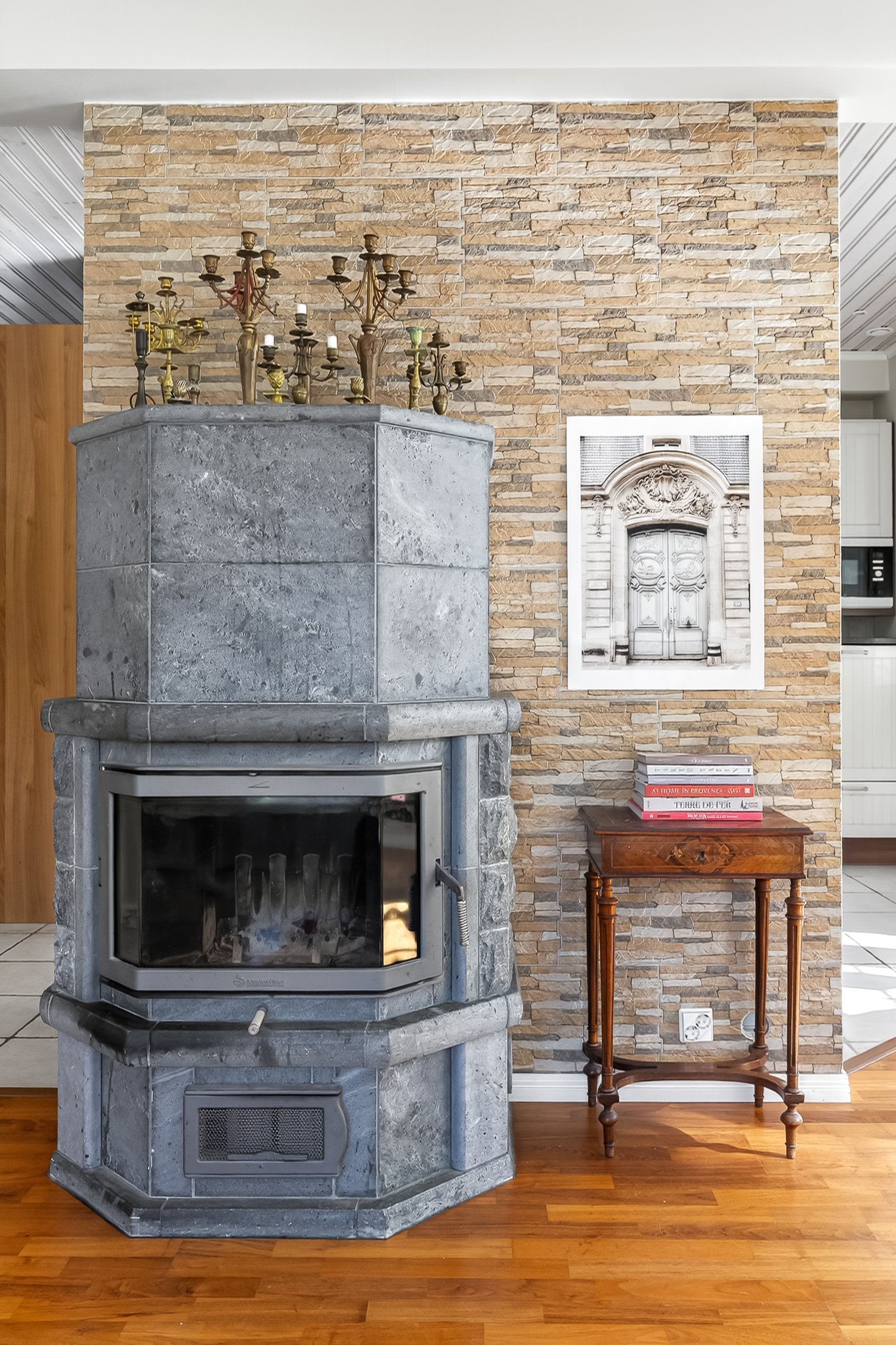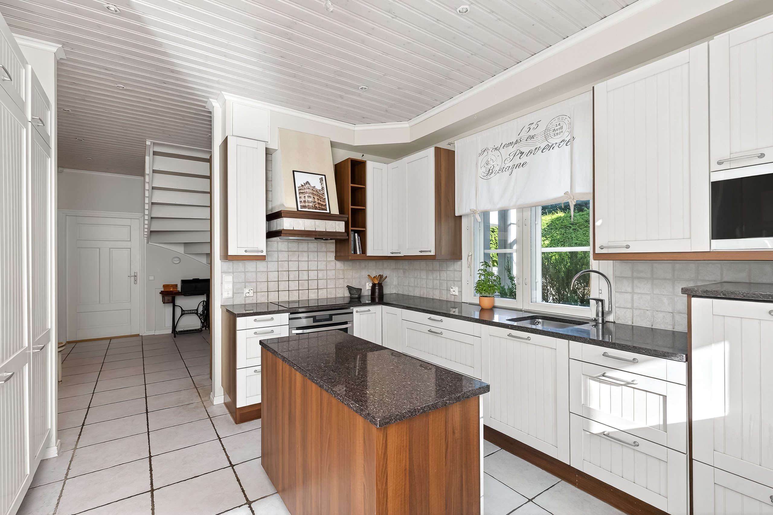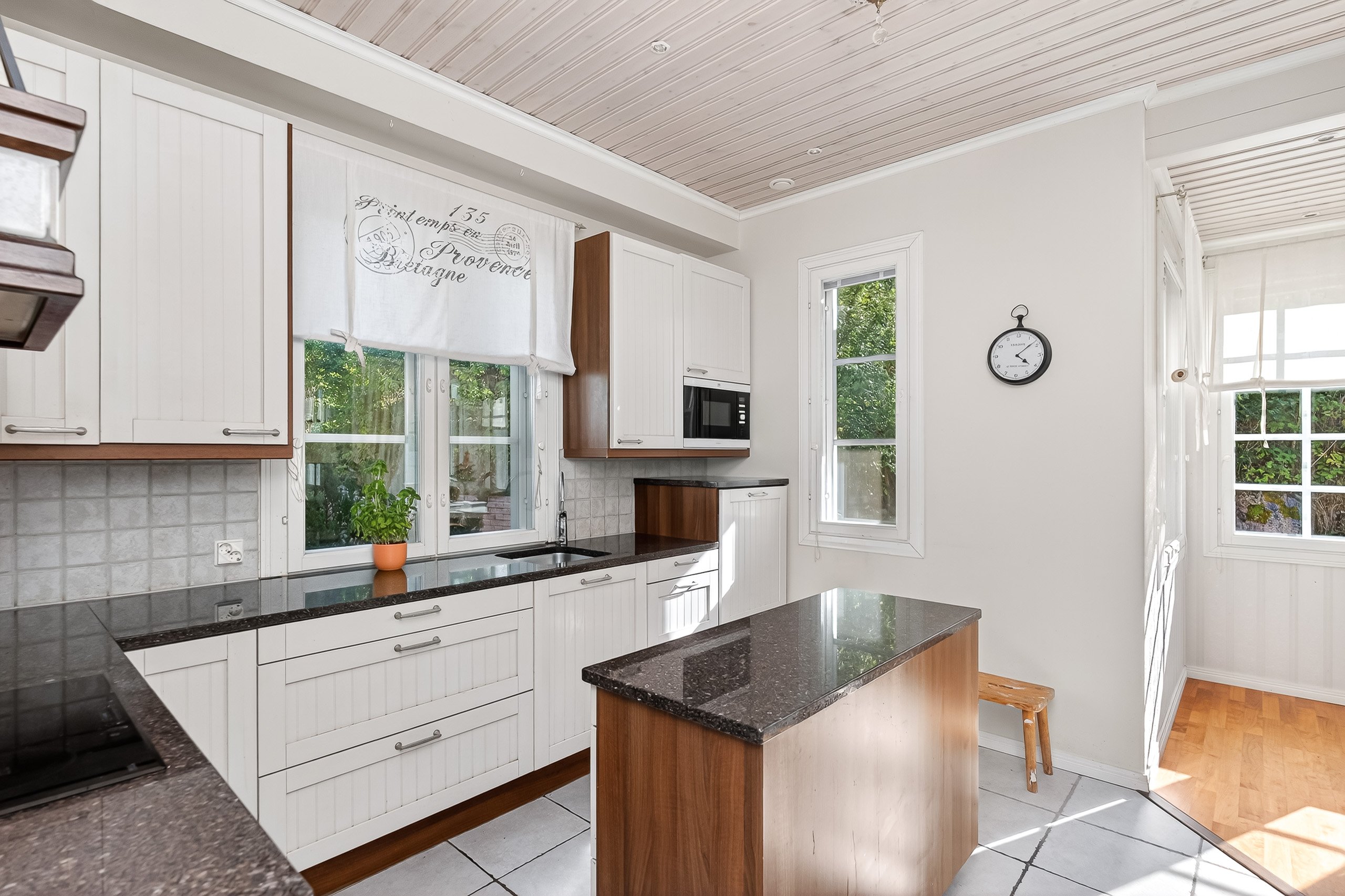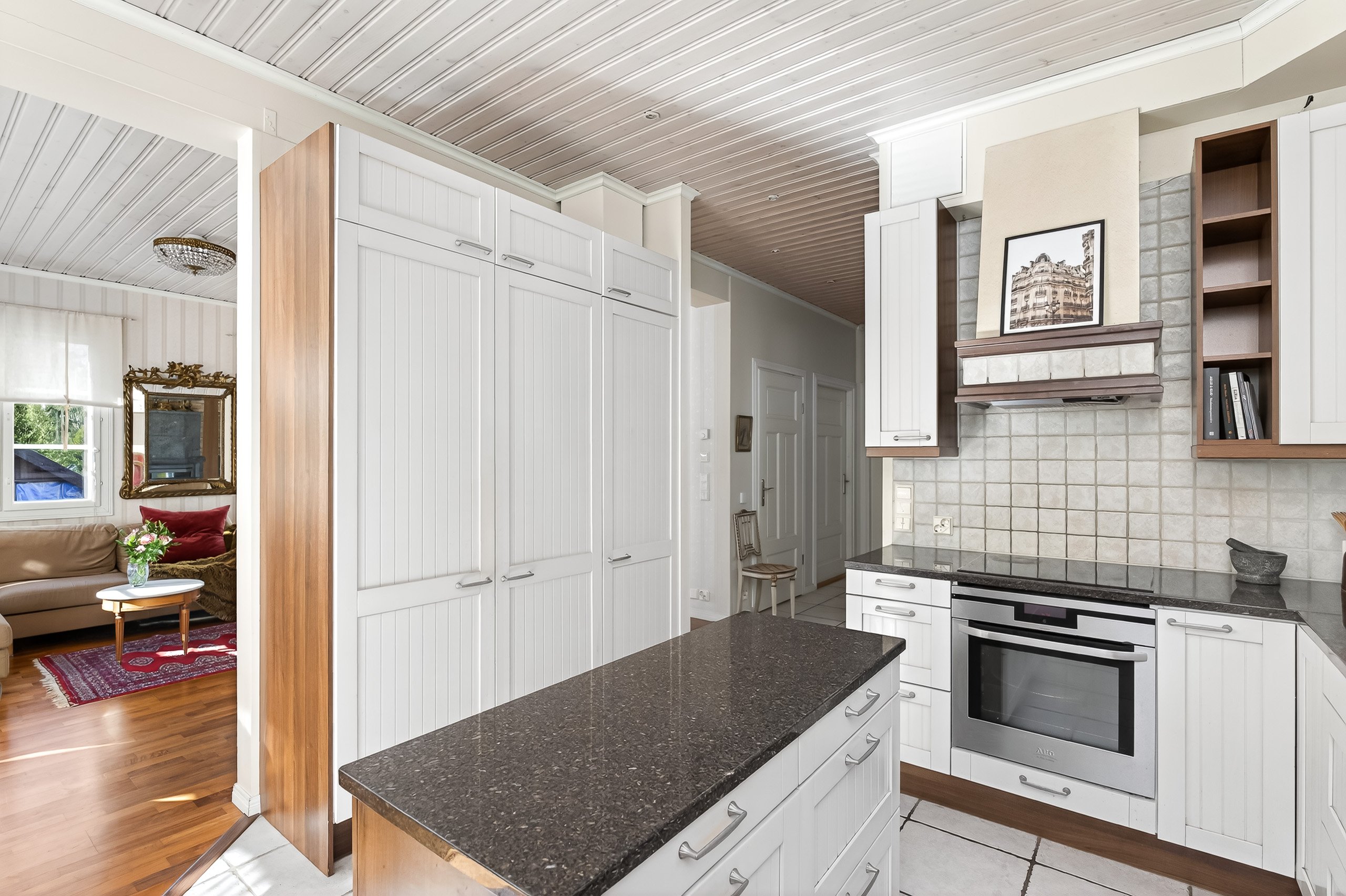 Puustellin keittiö on todellinen arjen helmi: laadukkaat kodinkoneet, kivitasot ja runsaat säilytystilat tekevät ruoanlaitosta nautinnon. Erillinen saareke toimii niin työskentelytilana kuin koko perheen aamiaispaikkana.