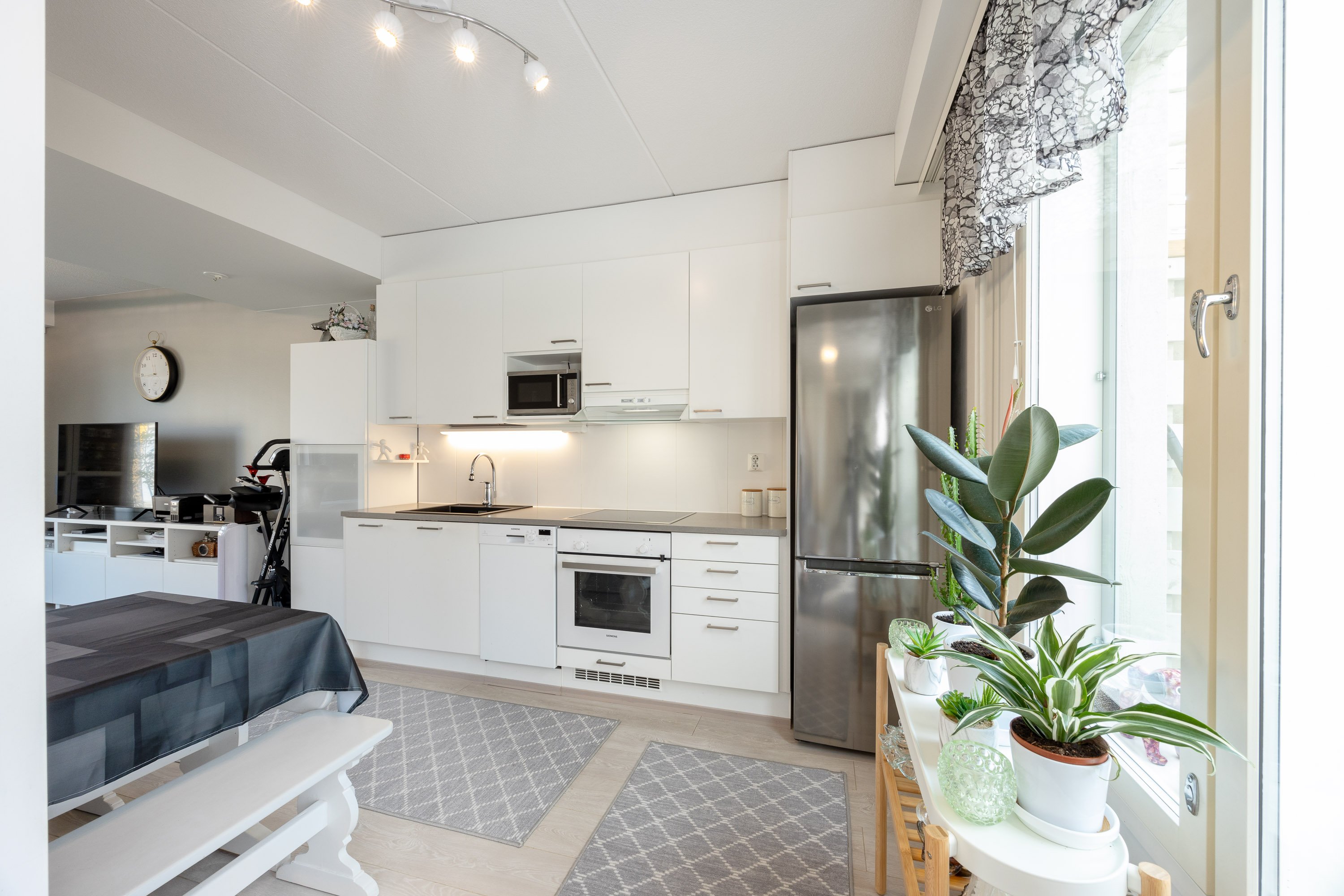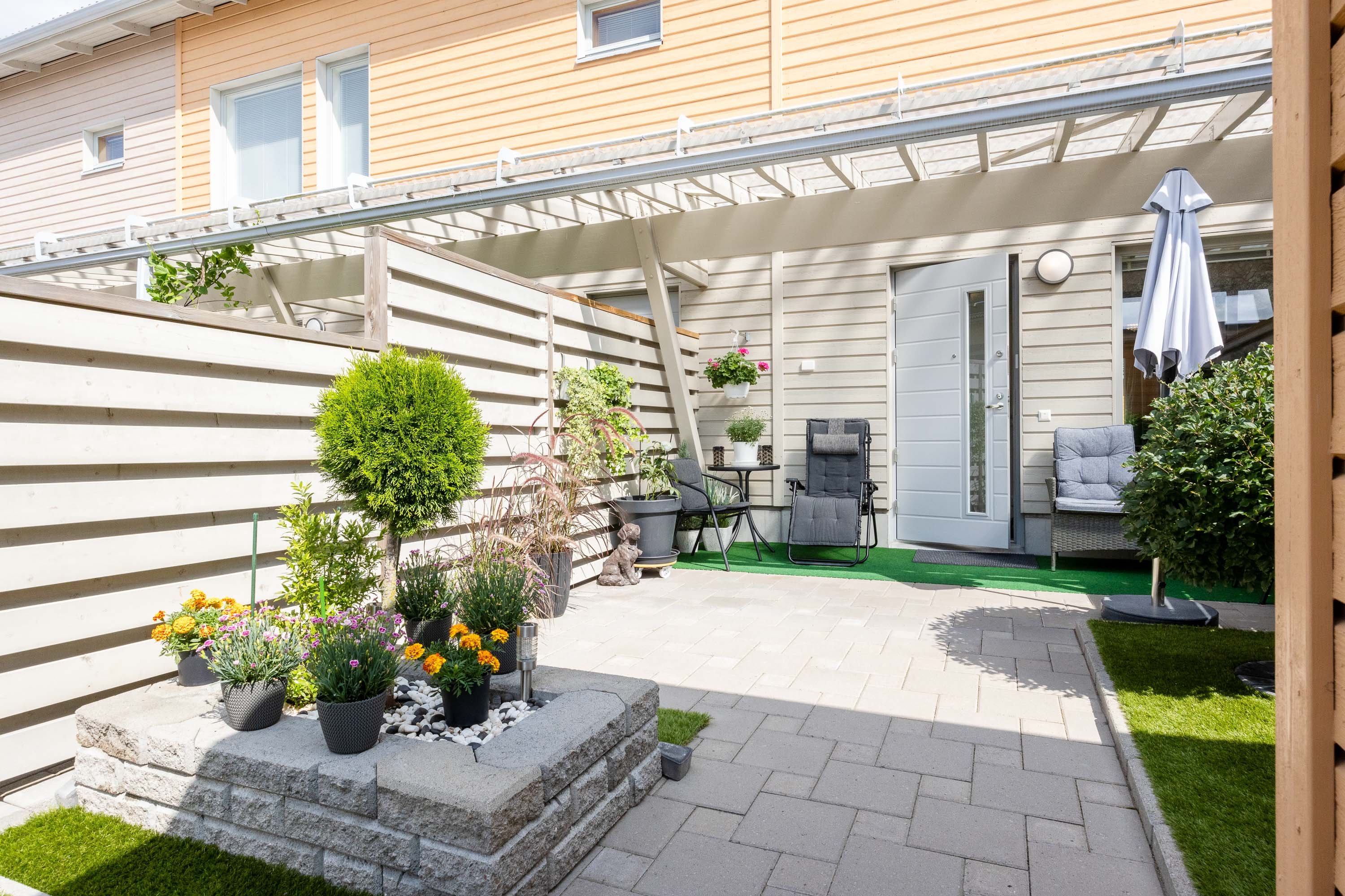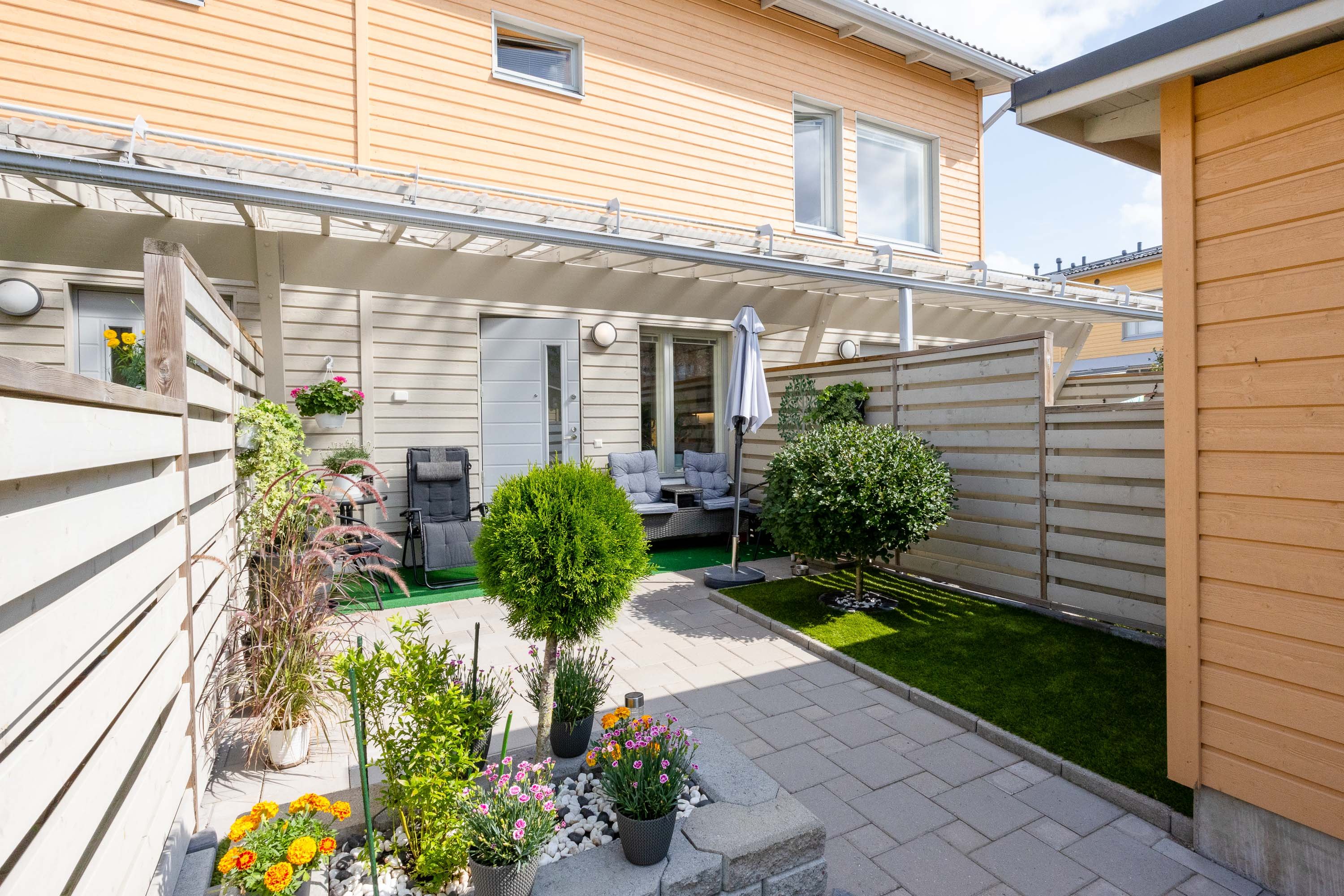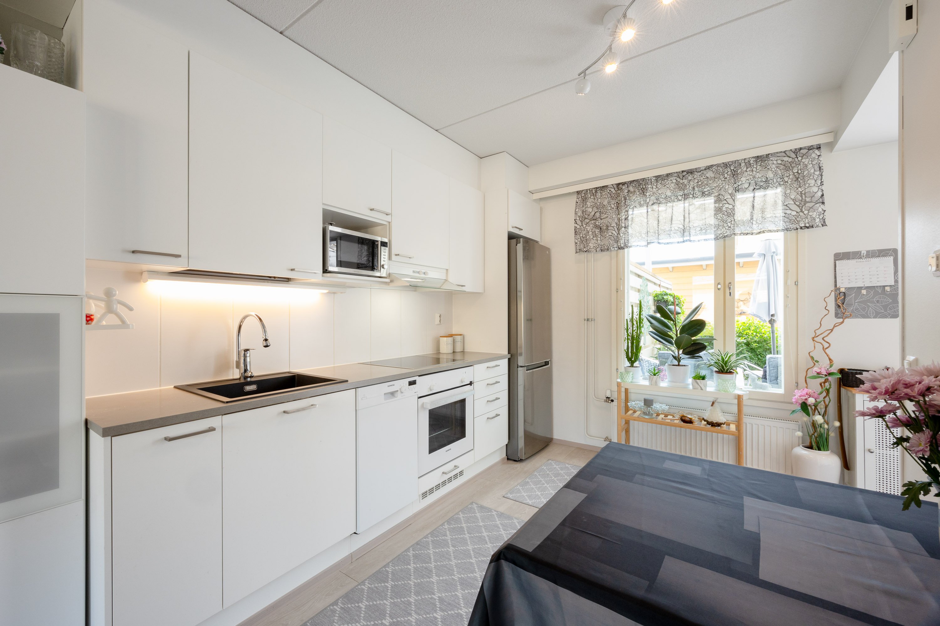 Keittiössä on hyvin tilaa kokkailulle ja allas sekä hana on uusittu tyylikkäämmäksi. Keraamisen lieden tilalle on vaihdettu induktioliesi. Piha on aidattu ja aina hyvännäköinen tekonurmi kivetyksineen on jo tehty, joten piha on todella helppohoitoinen. Asunnolle kuuluu myös portin vieressä oleva kylmävarasto. Jokaiselle osakkaalle on maksullinen autopaikka, latausmahdollisuutta ei vielä ole.