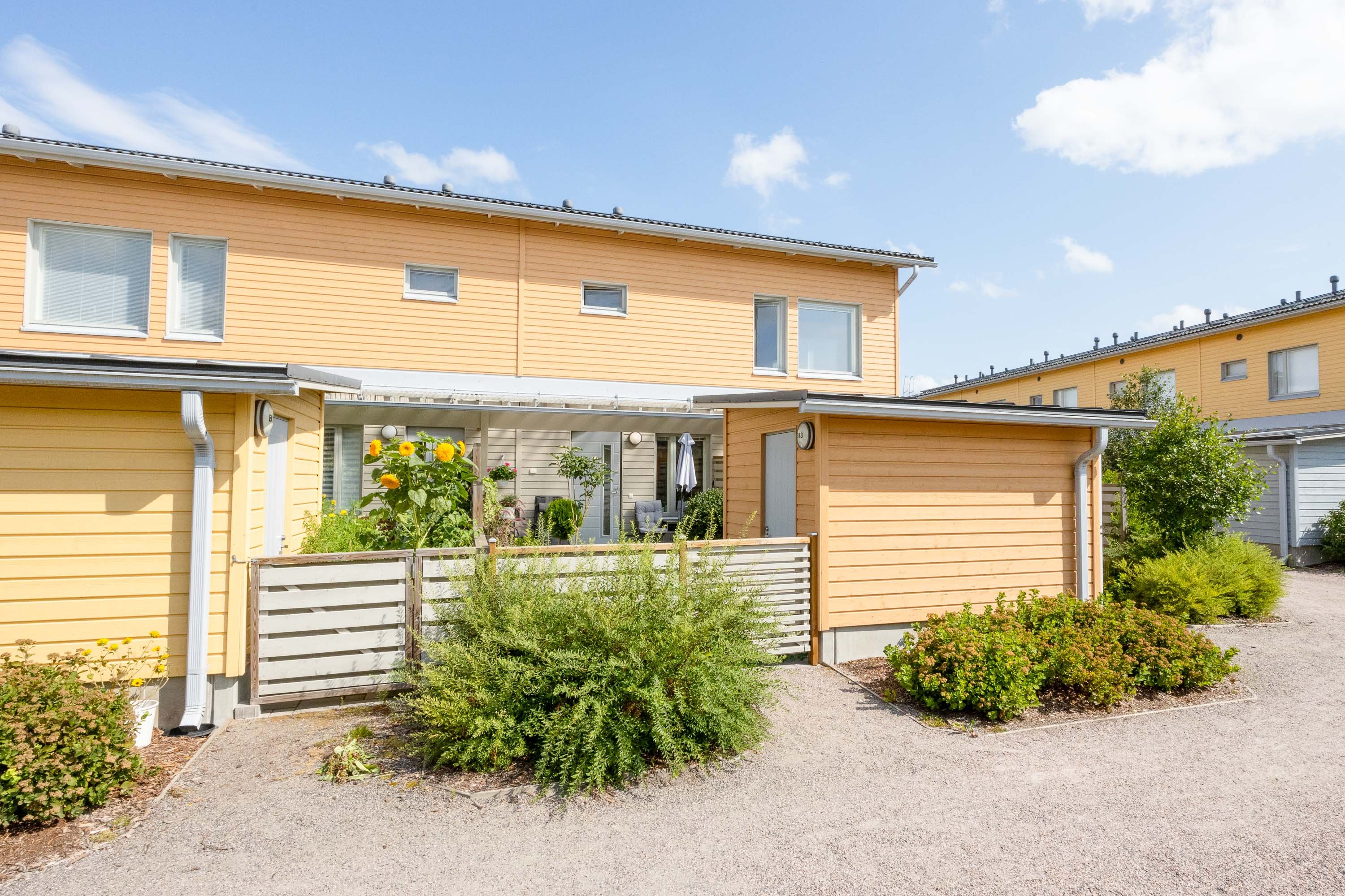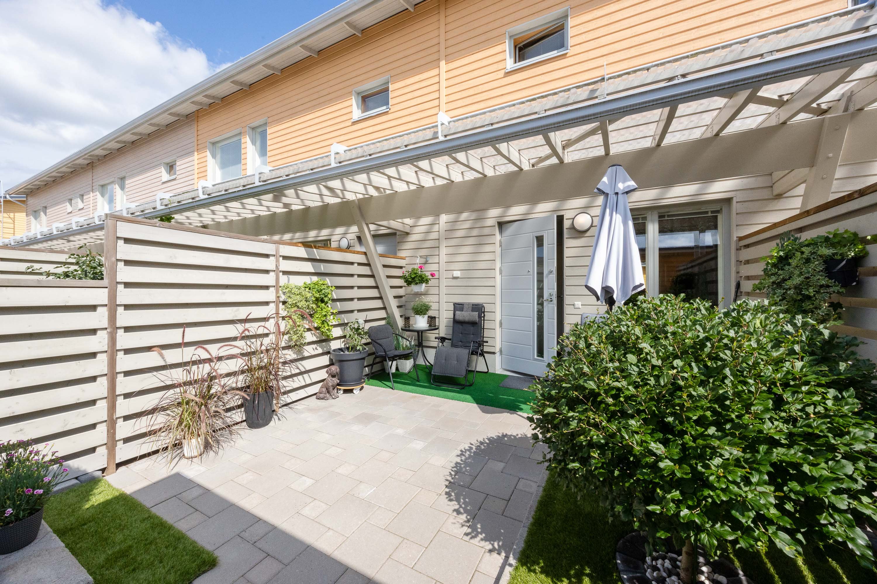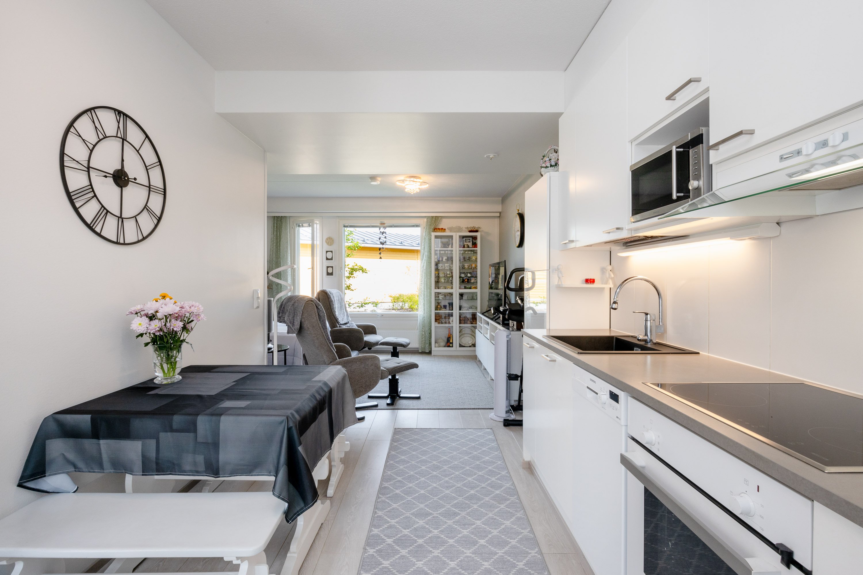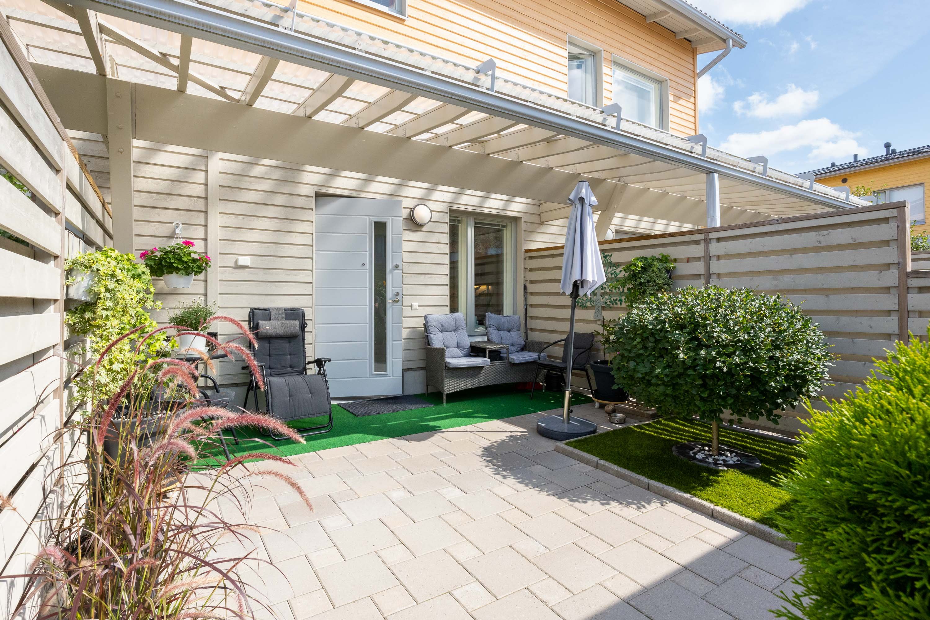 Keittiössä on hyvin tilaa kokkailulle ja allas sekä hana on uusittu tyylikkäämmäksi. Keraamisen lieden tilalle on vaihdettu induktioliesi. Piha on aidattu ja aina hyvännäköinen tekonurmi kivetyksineen on jo tehty, joten piha on todella helppohoitoinen. Asunnolle kuuluu myös portin vieressä oleva kylmävarasto. Jokaiselle osakkaalle on maksullinen autopaikka, latausmahdollisuutta ei vielä ole.