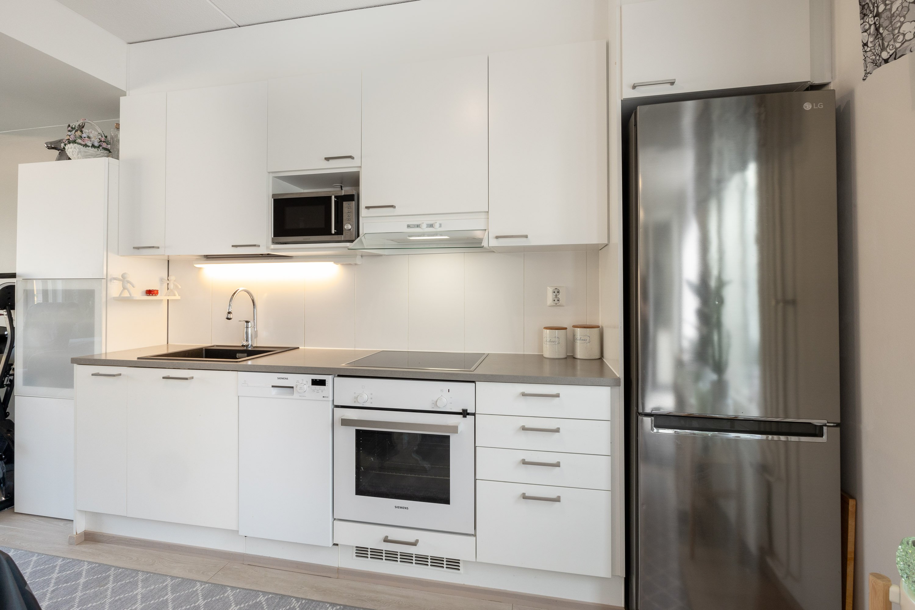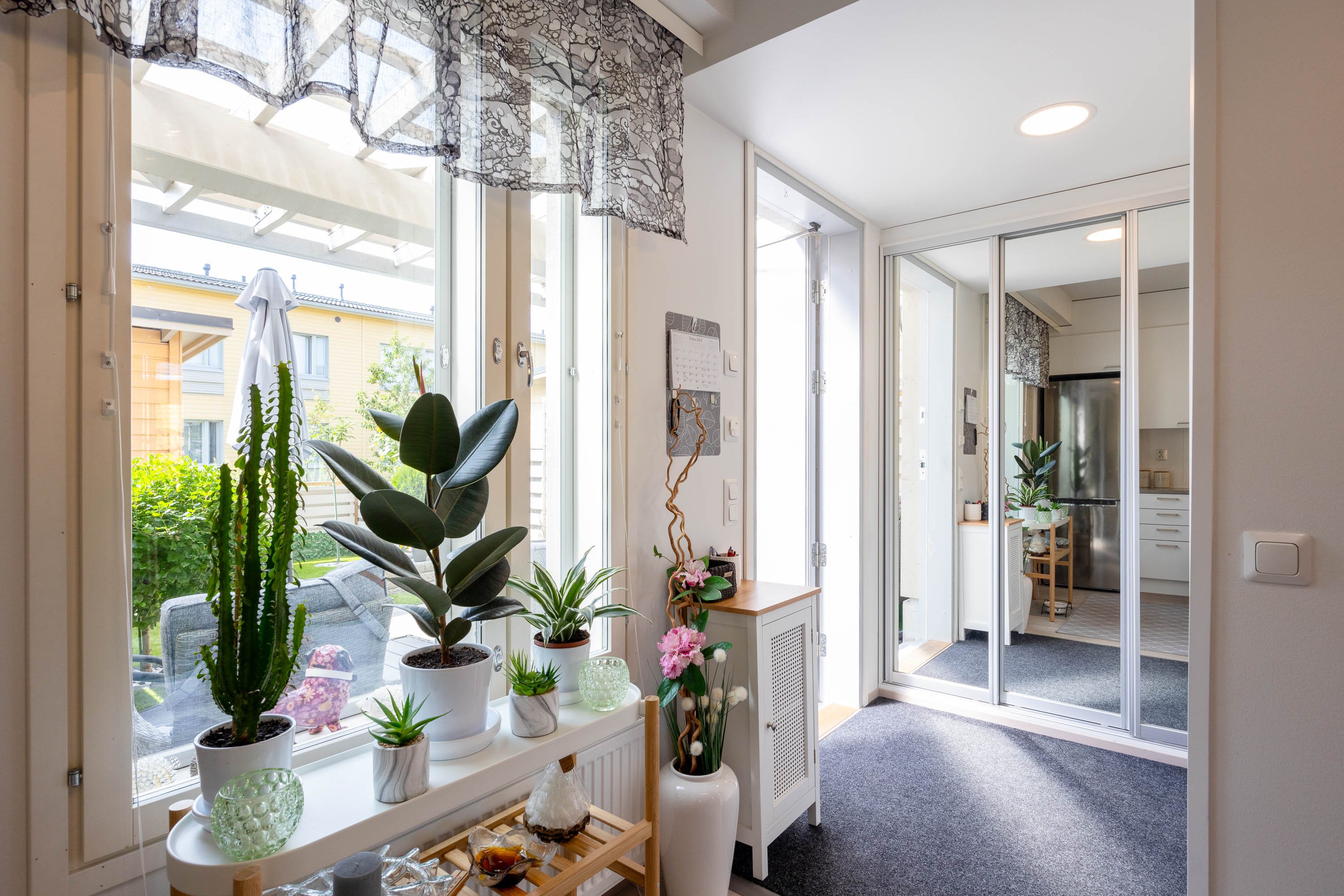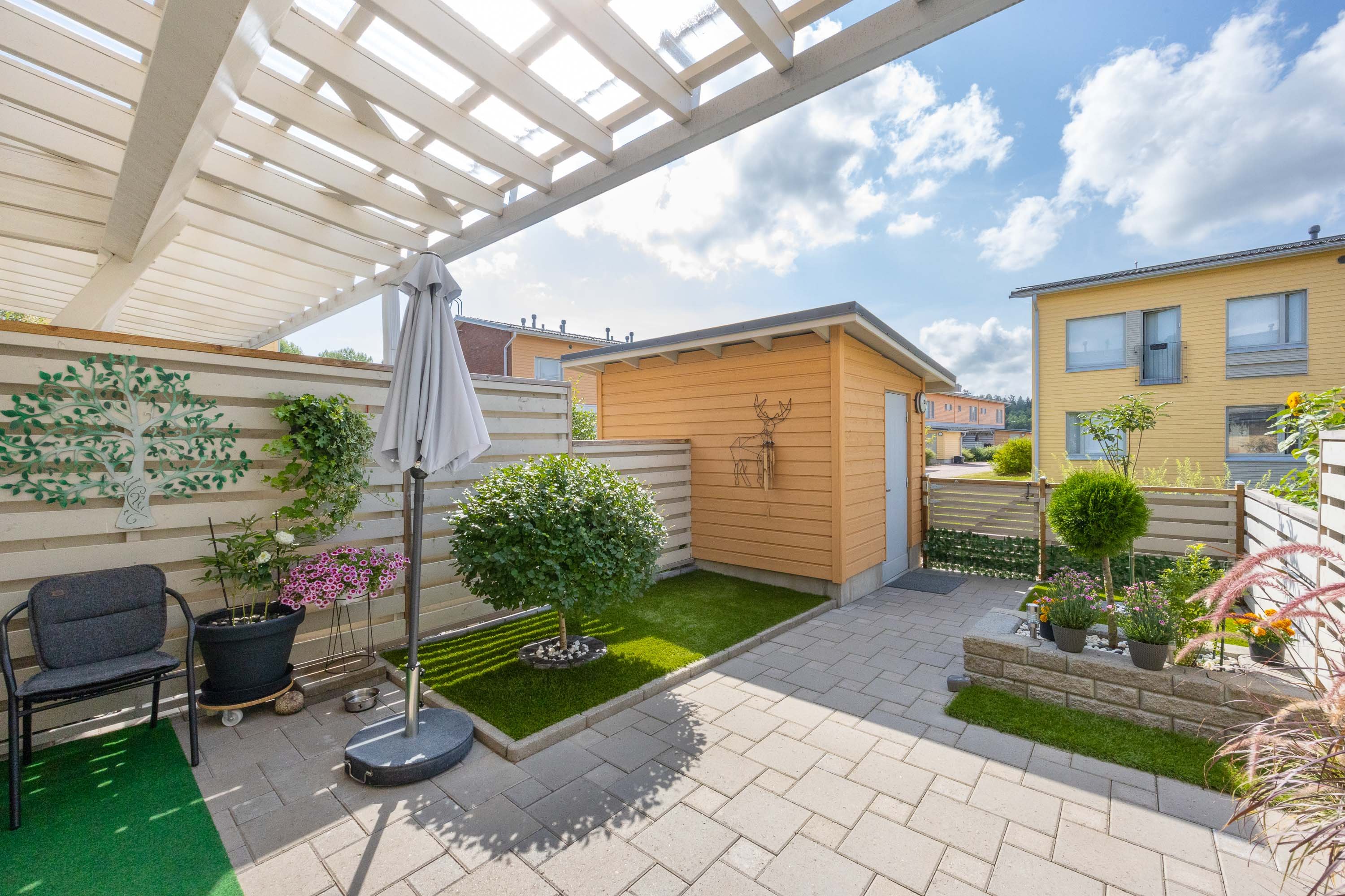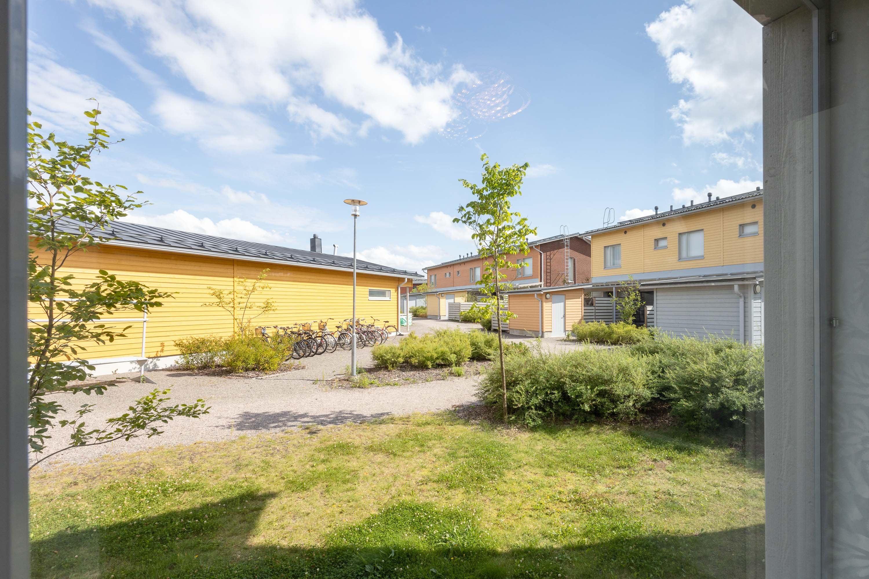 Keittiössä on hyvin tilaa kokkailulle ja allas sekä hana on uusittu tyylikkäämmäksi. Keraamisen lieden tilalle on vaihdettu induktioliesi. Piha on aidattu ja aina hyvännäköinen tekonurmi kivetyksineen on jo tehty, joten piha on todella helppohoitoinen. Asunnolle kuuluu myös portin vieressä oleva kylmävarasto. Jokaiselle osakkaalle on maksullinen autopaikka, latausmahdollisuutta ei vielä ole.