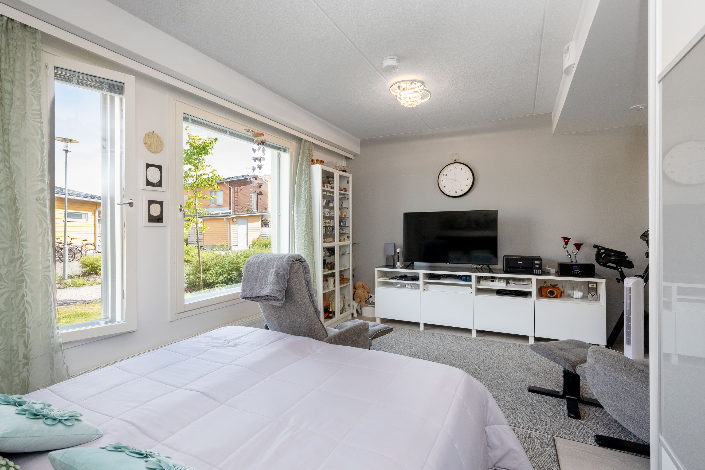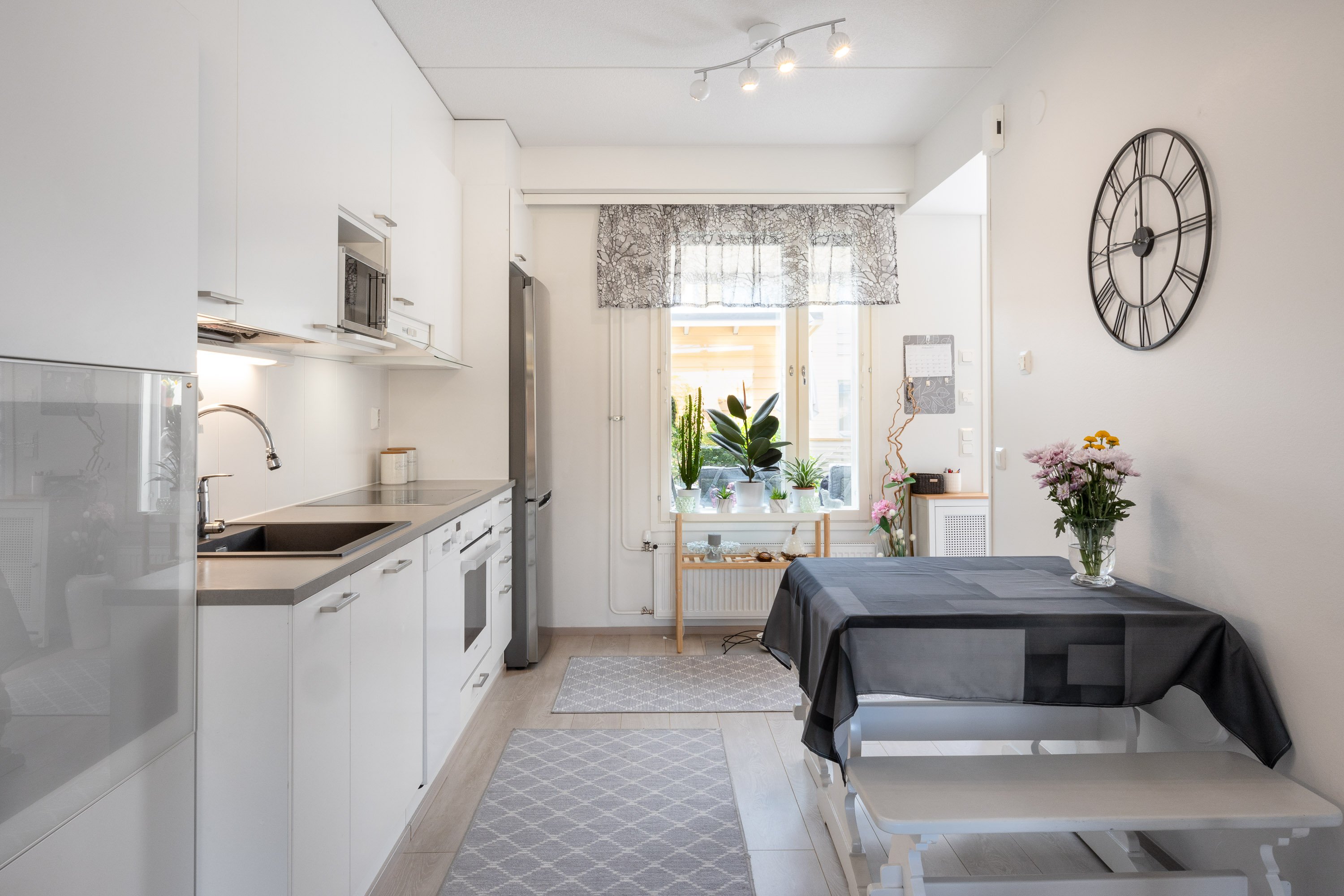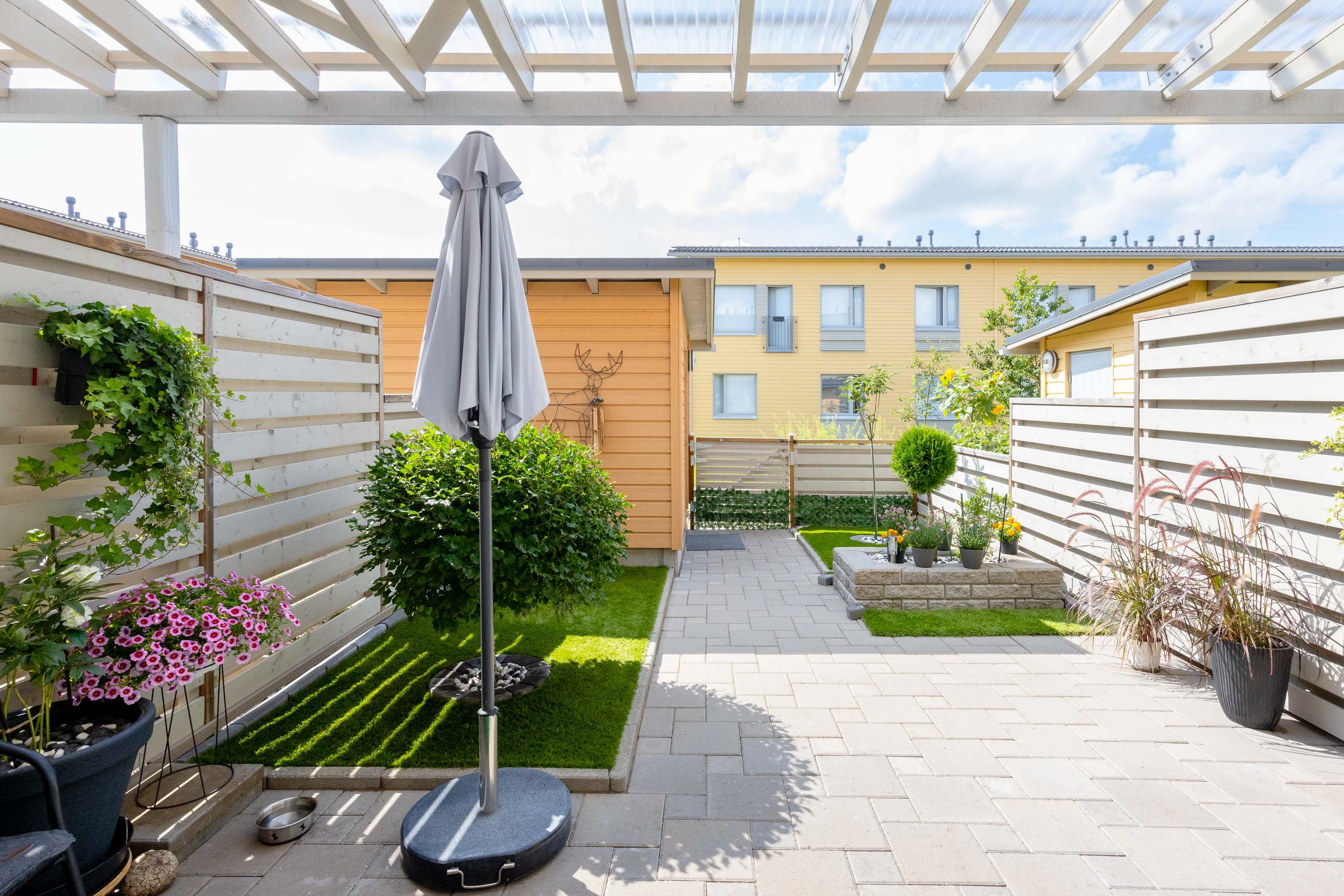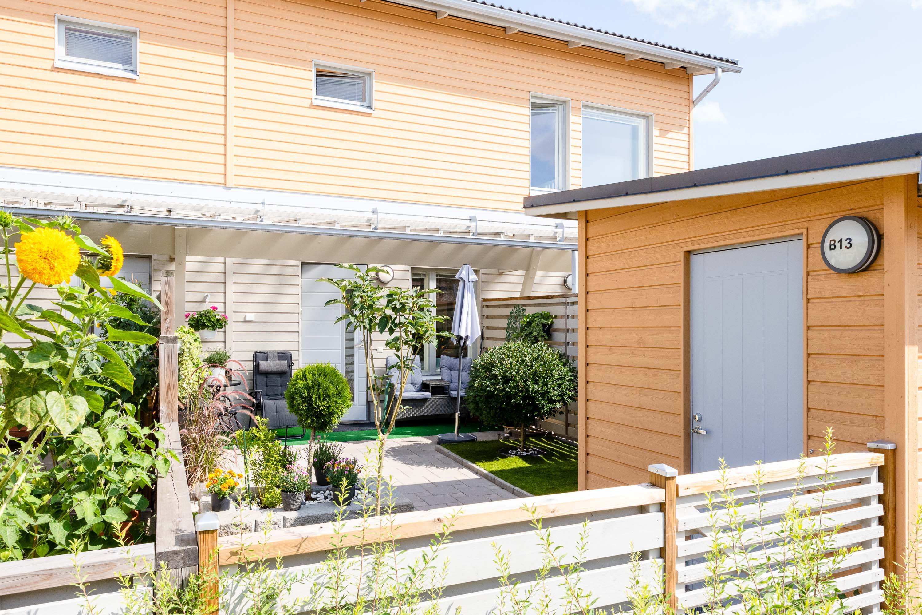 Keittiössä on hyvin tilaa kokkailulle ja allas sekä hana on uusittu tyylikkäämmäksi. Keraamisen lieden tilalle on vaihdettu induktioliesi. Piha on aidattu ja aina hyvännäköinen tekonurmi kivetyksineen on jo tehty, joten piha on todella helppohoitoinen. Asunnolle kuuluu myös portin vieressä oleva kylmävarasto. Jokaiselle osakkaalle on maksullinen autopaikka, latausmahdollisuutta ei vielä ole.