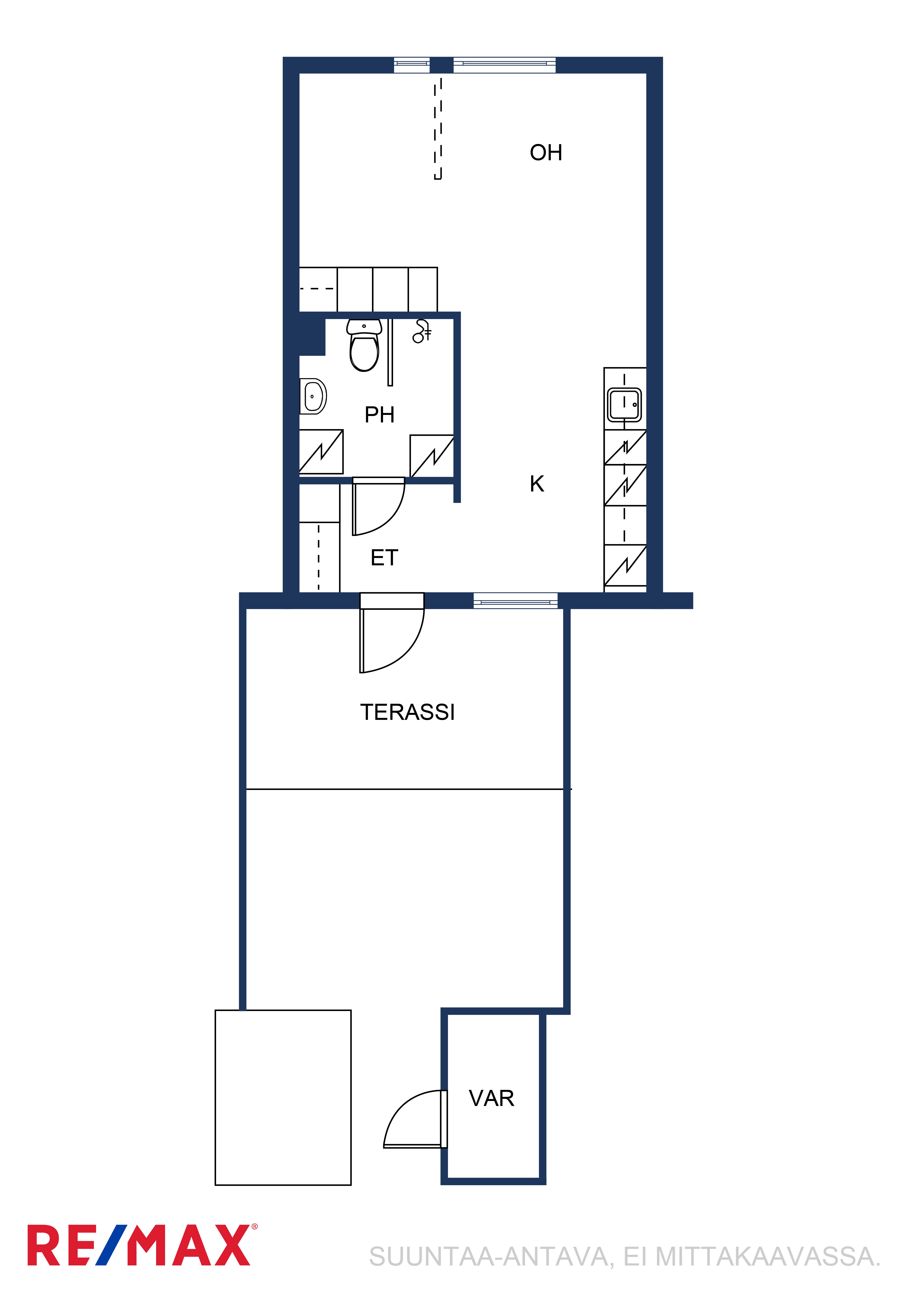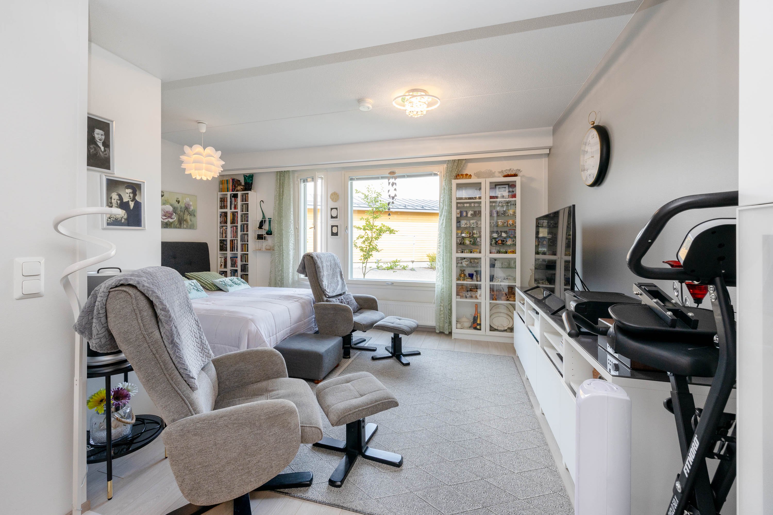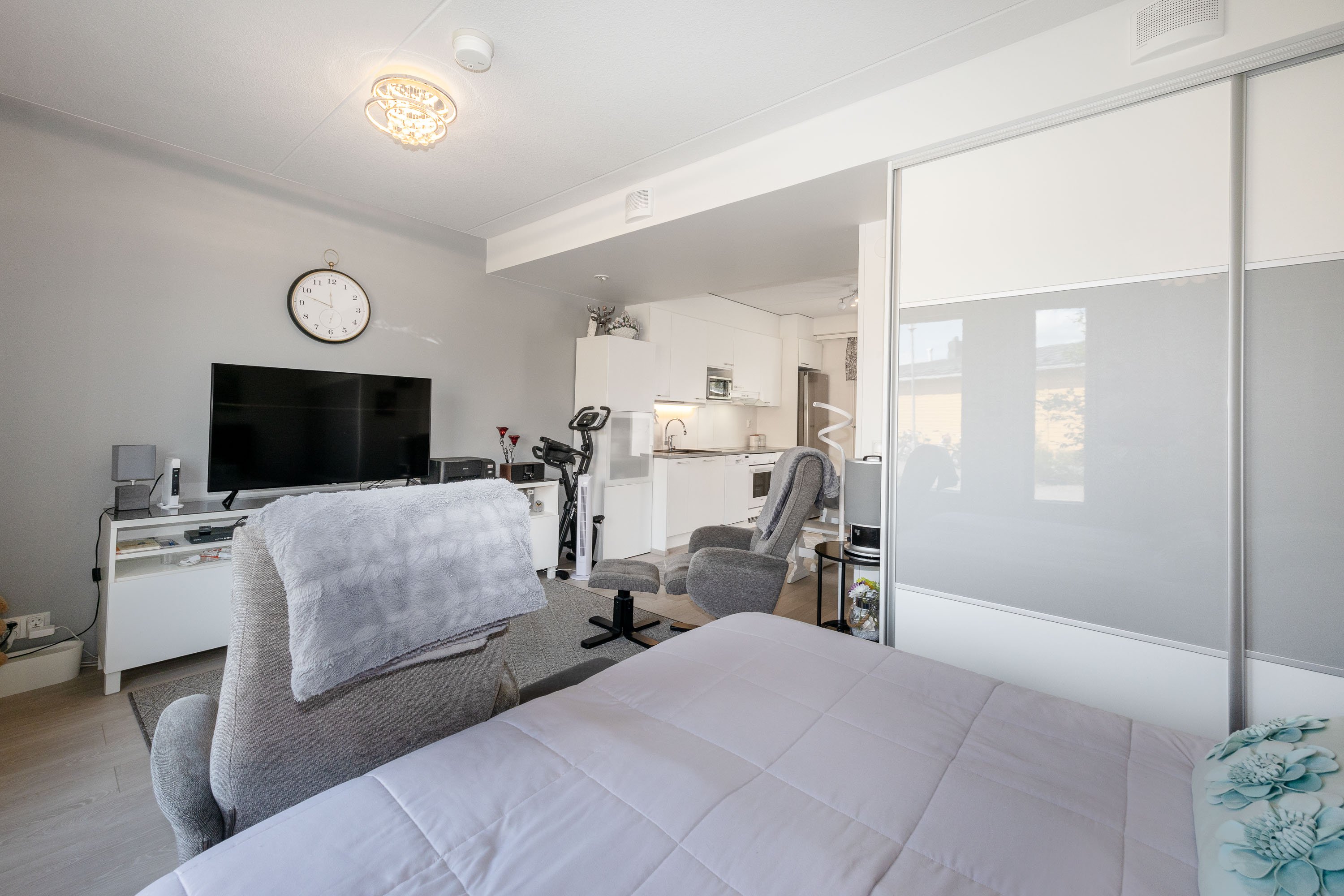 Tilava läpitalon yksiö omalla etelään suuntaavalla terassipihalla. Eteisessä on hyvät vaatekaapit ja siitä on myös kulku isoon kylpyhuoneeseen sekä avokeittiöön.