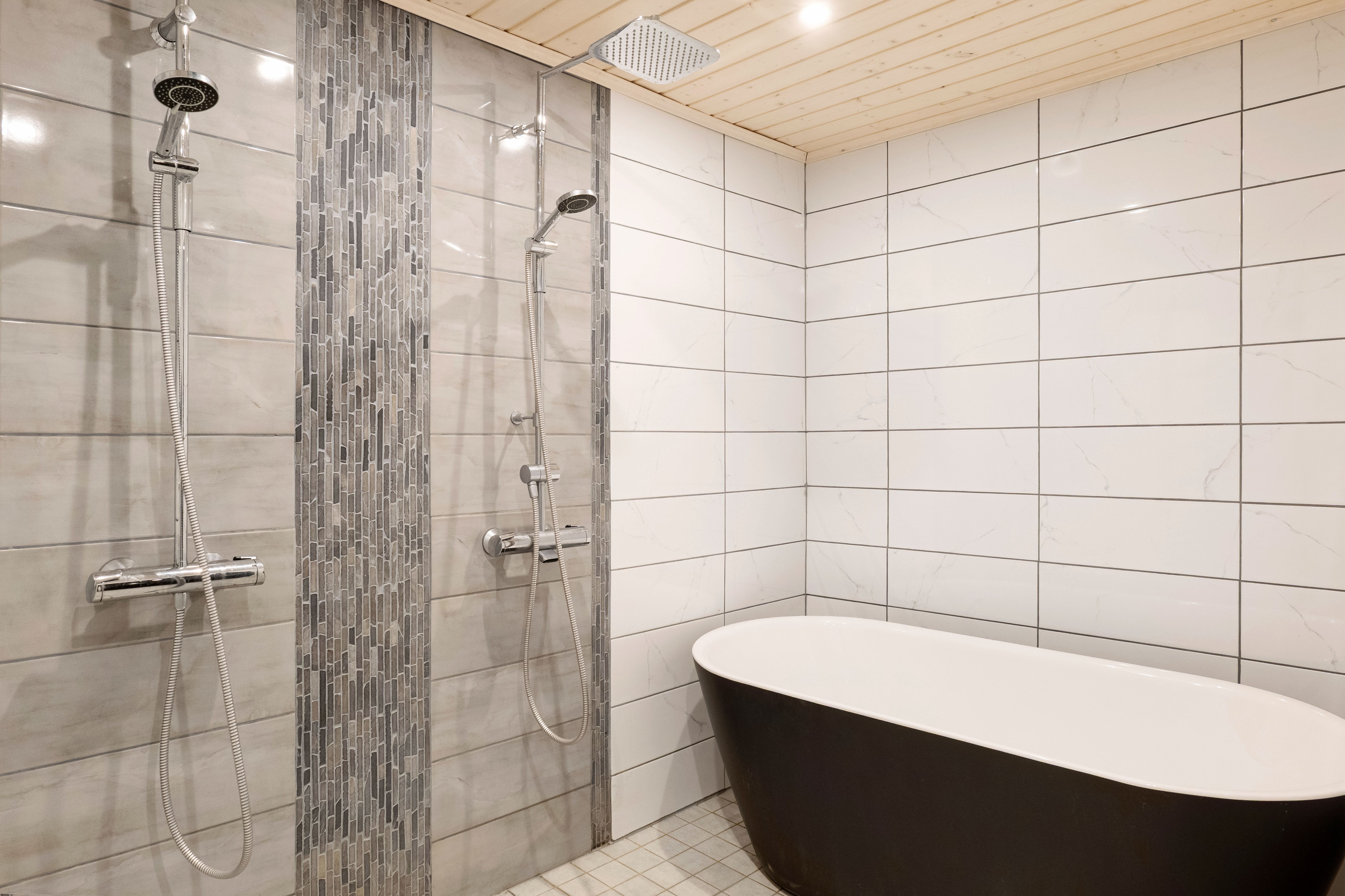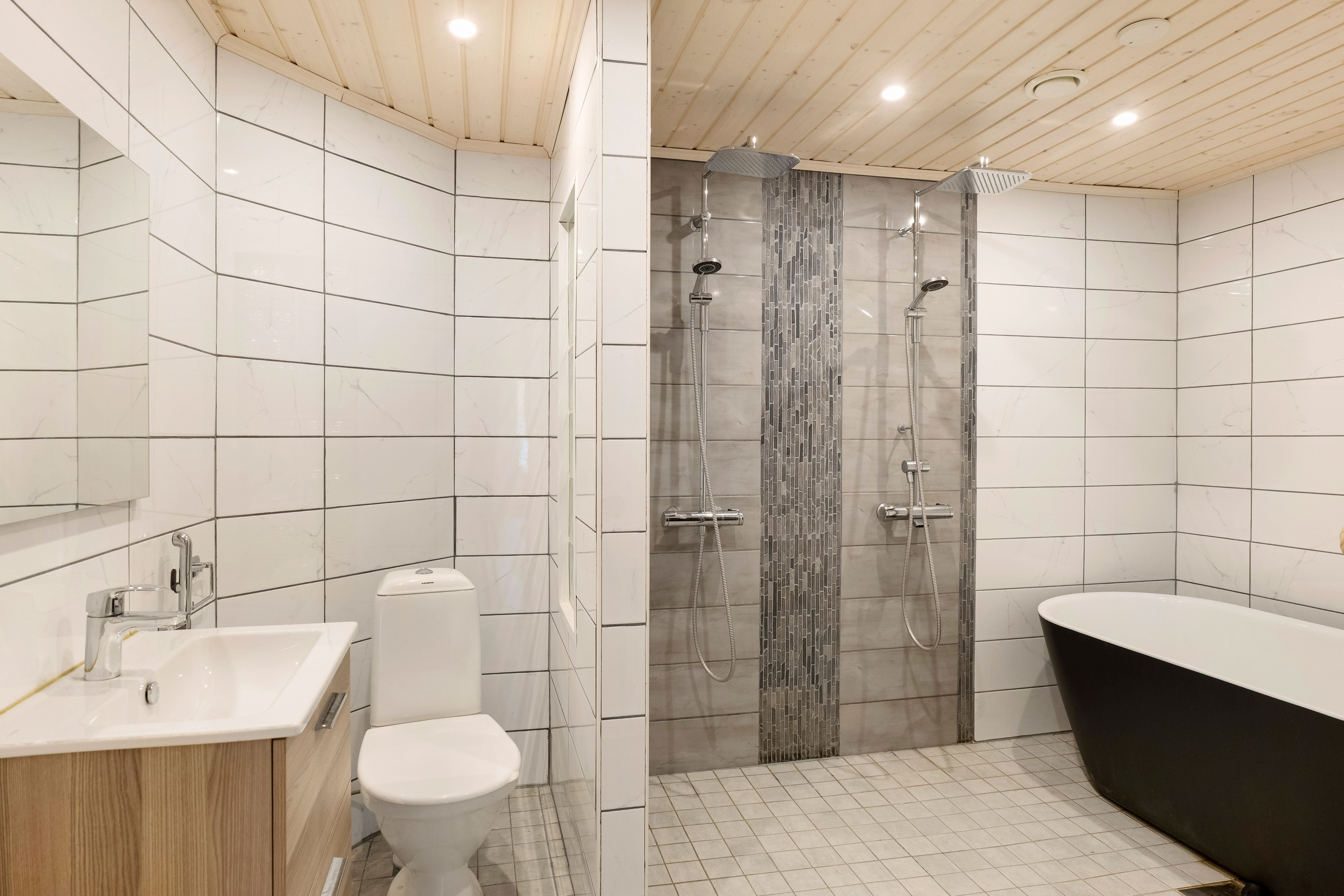 WC-istuin, suihku, kylpyamme, lattialämmitys, allaskaappi ja peili