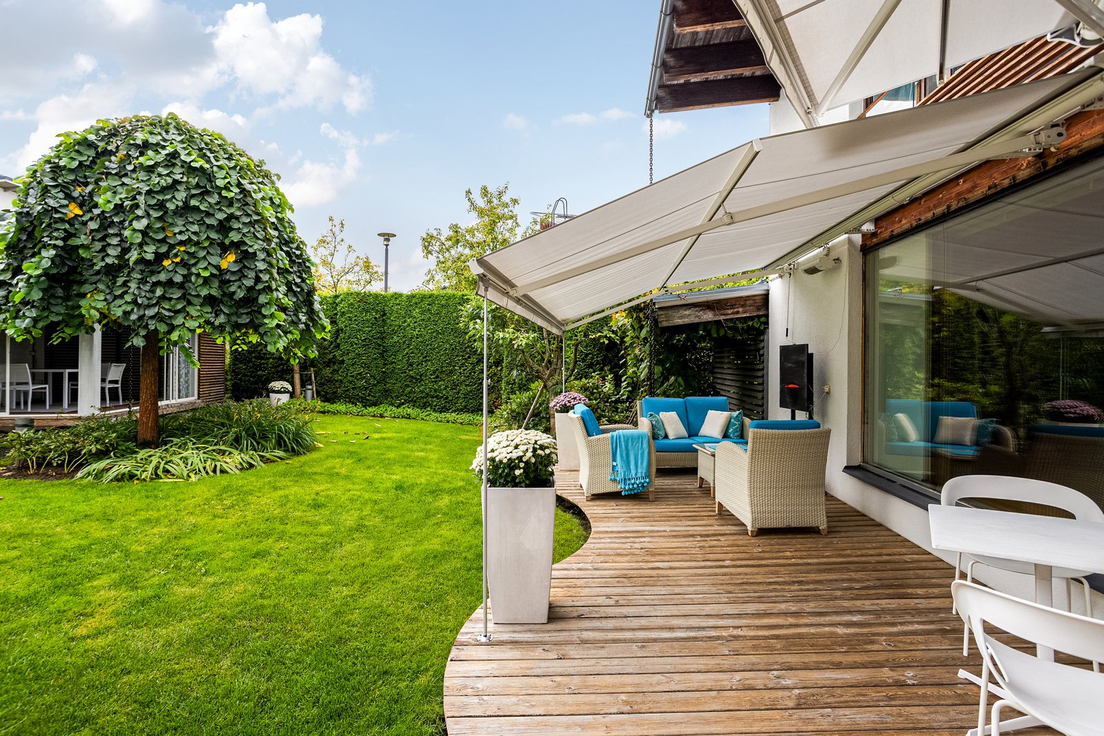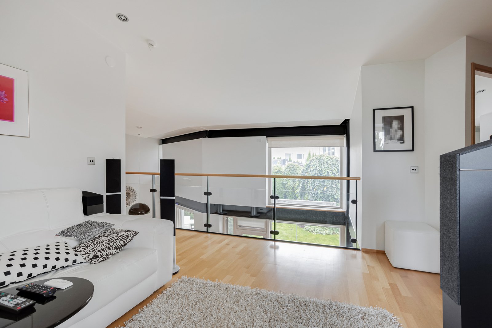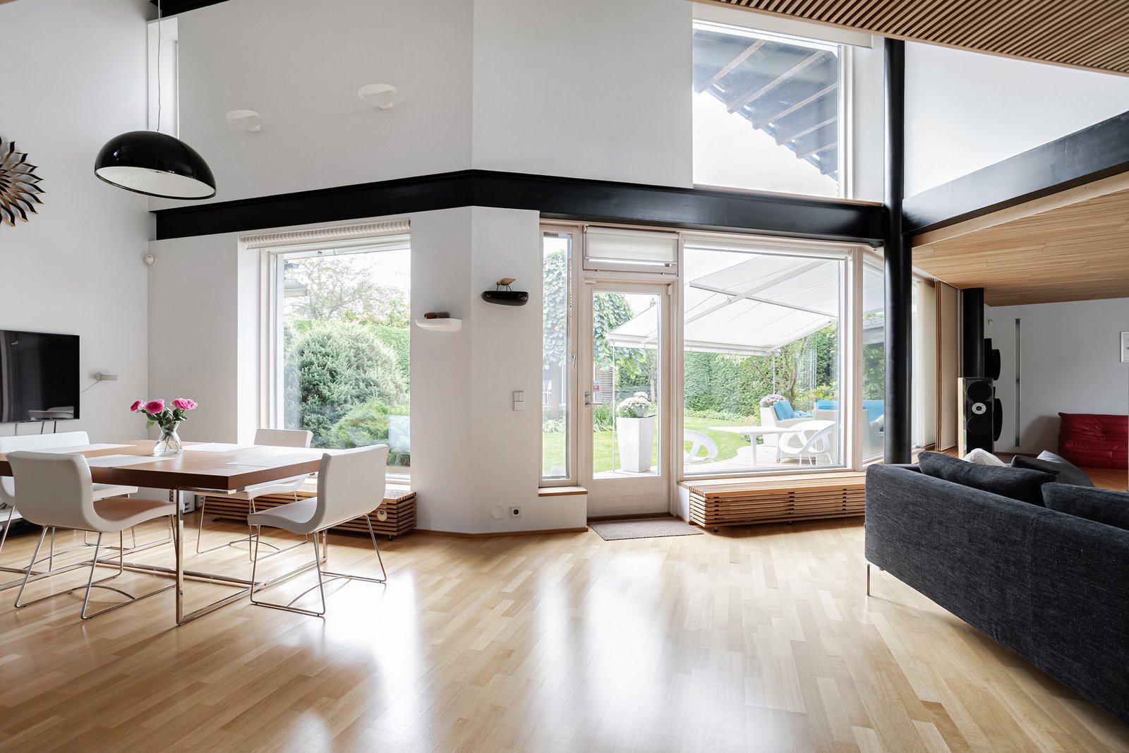 Alakerran oleskelutilasta avautuvat näkymät ylös toiseen kerrokseen ja suurten ikkunoiden kautta ulos katetulle terassille , puutarhaan ja tyylikkääseen kesäkeittiö rakennukseen.