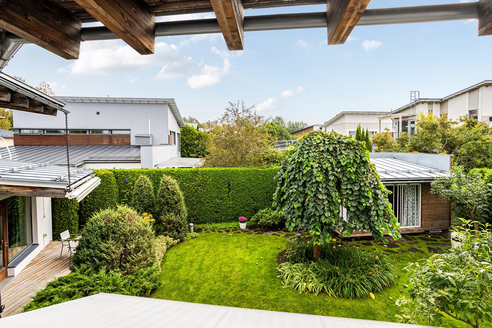 The downstairs living area offers views up to the second floor and through large windows to the covered terrace, garden and stylish summer kitchen building.