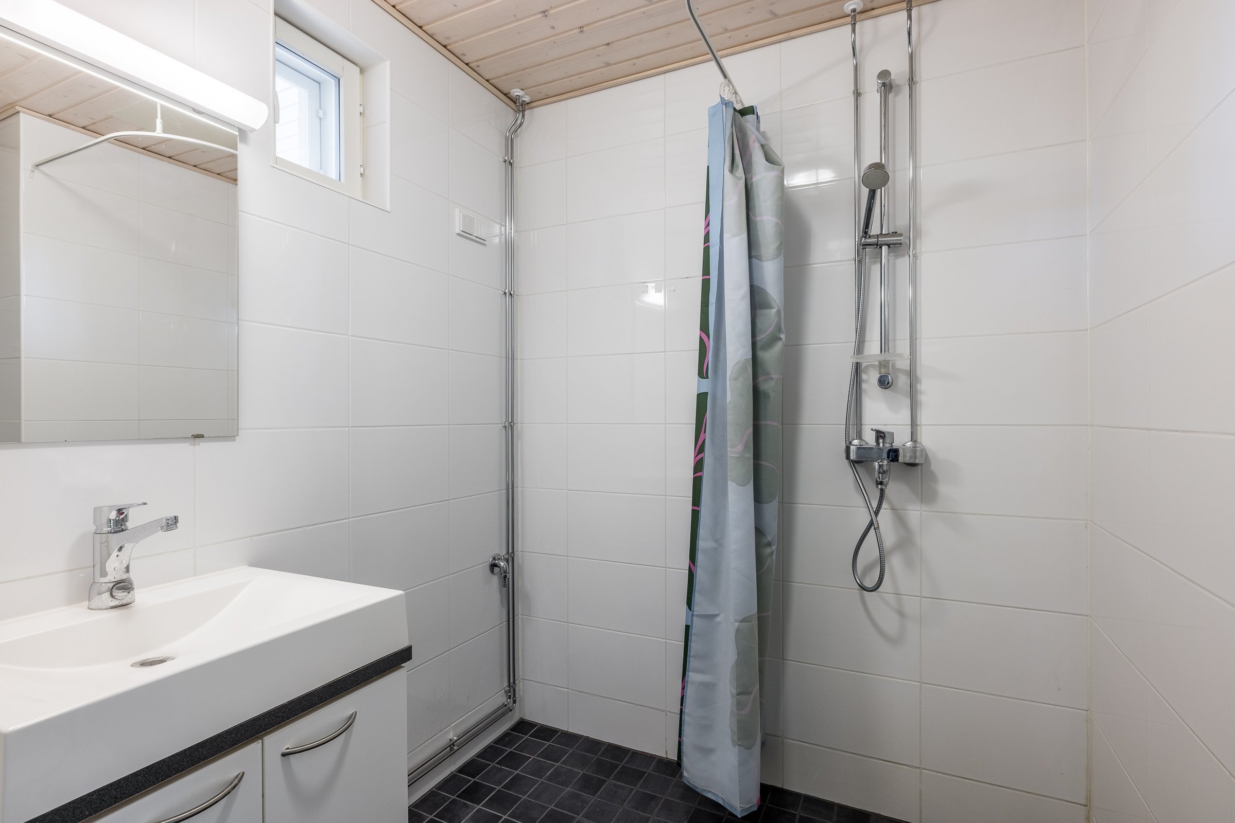 Laadukas ja moderni kylpyhuone, jossa on tilaa myös pyykinpesukoneelle.