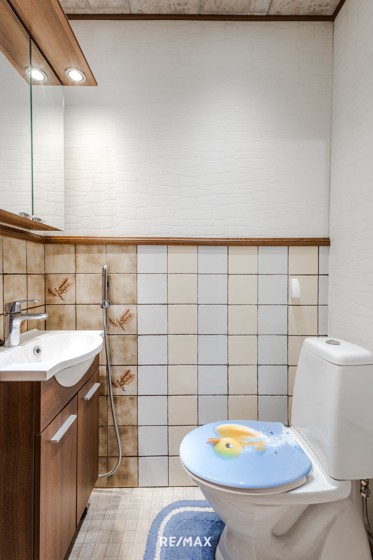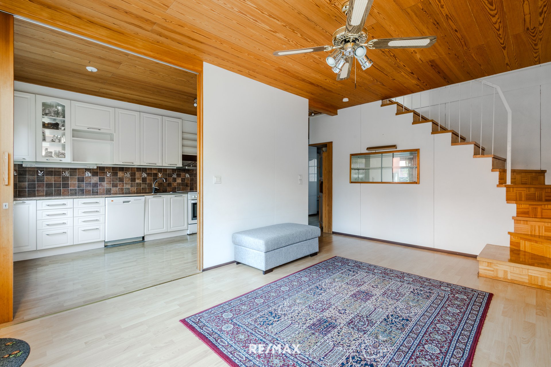 Asunnon sisääntulokerroksessa sijaitsevat keittiö, kylpyhuone saunoineen ja olohuone, josta käynti aidatulle länteen avautuvalle pihalle. Alakerrassa sijaitsee erillinen wc, joka tuo arkeen käytännöllisyyttä. Eteisessä on hyvin tilaa myös kausivaatteille.