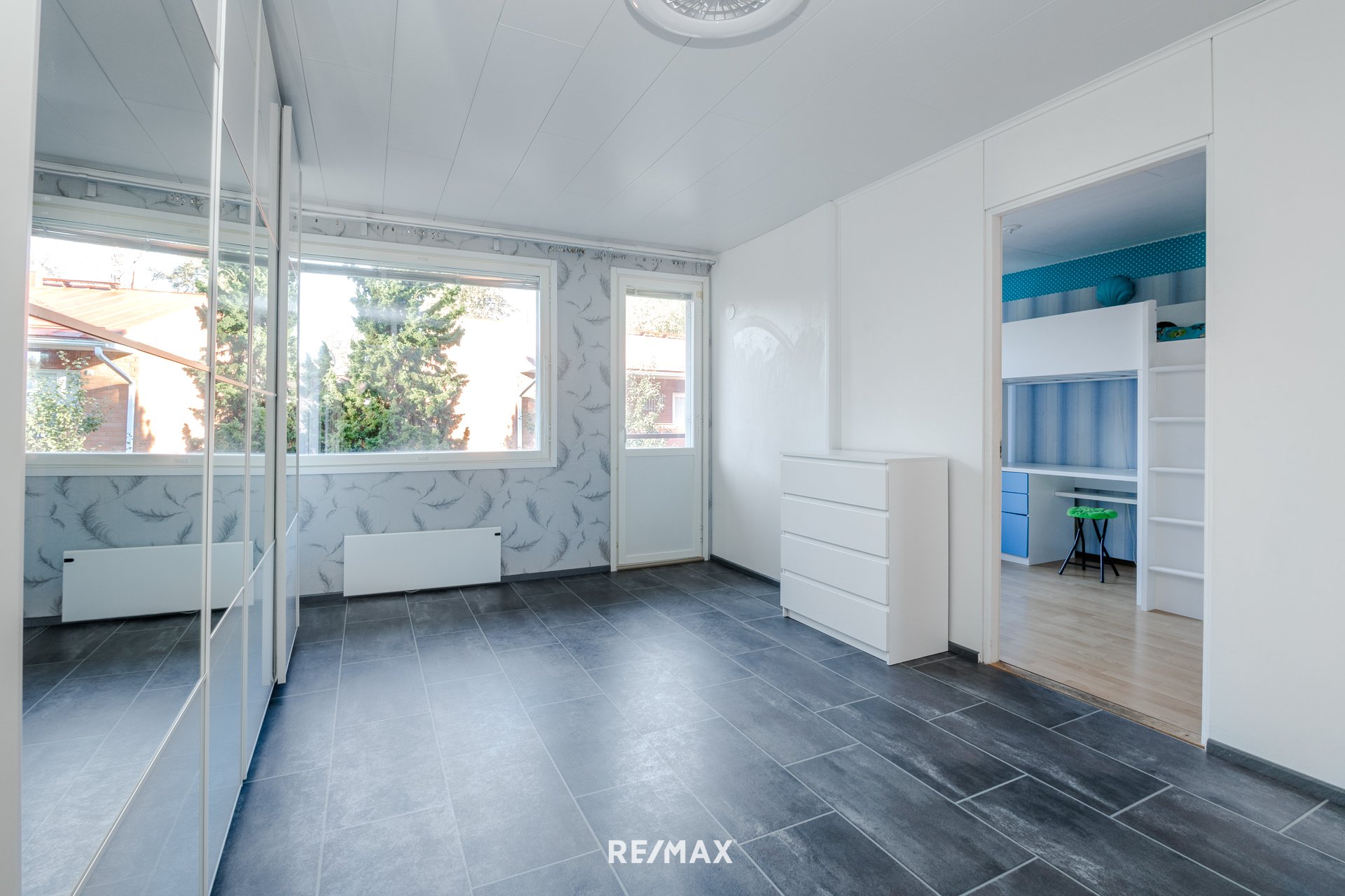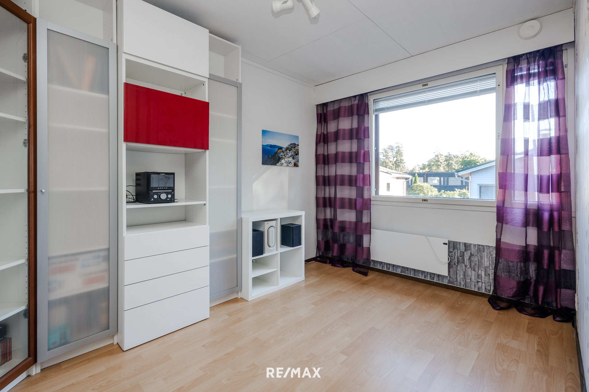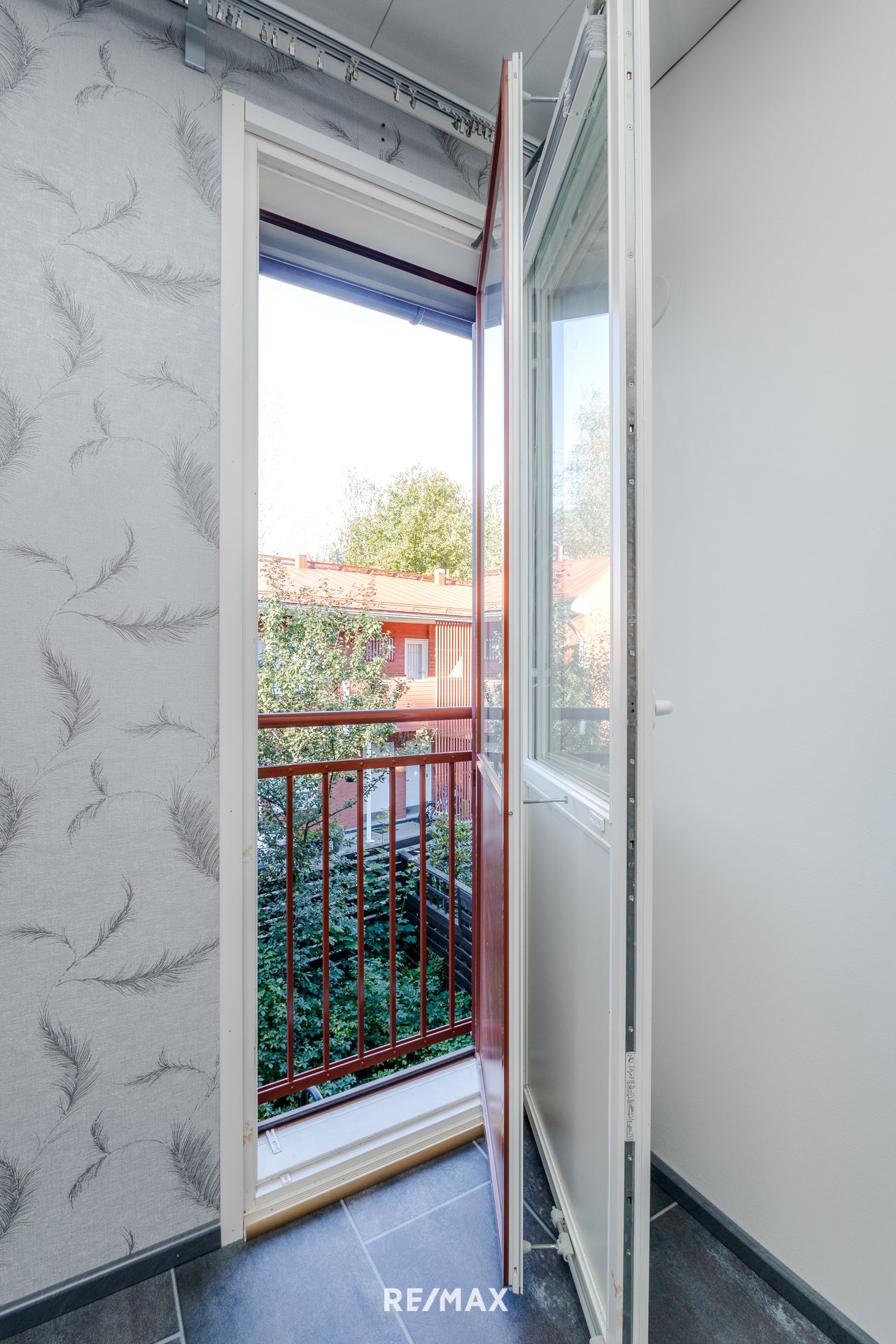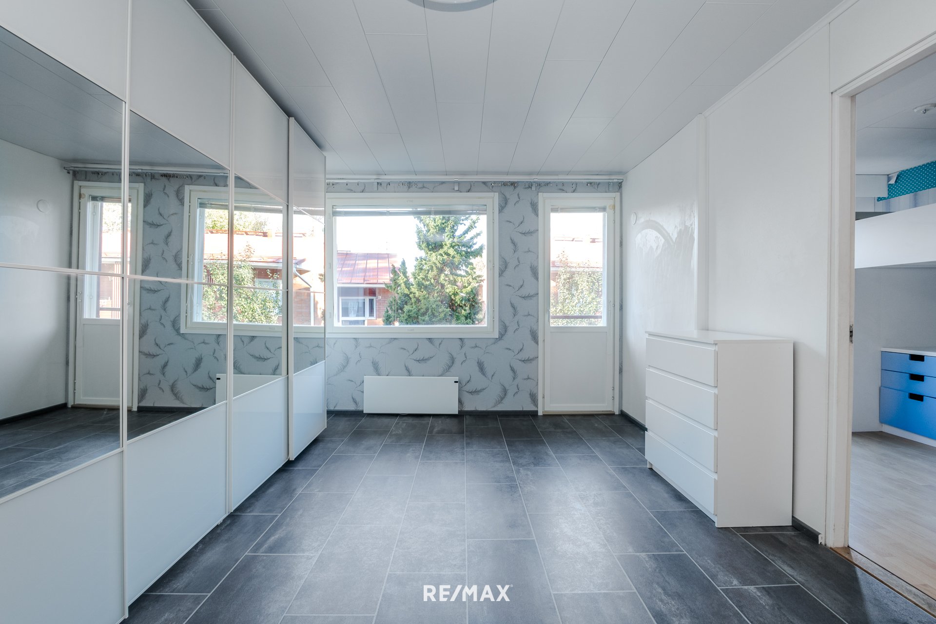 Yläkerrasta löytyvät kaksi makuuhuonetta ja aulatila/olohuone, josta helposti saa kolmannen makuuhuoneen. Yläkerrassa on hyvin säilytystilaa, ranskalainen parveke sekä erillinen wc.