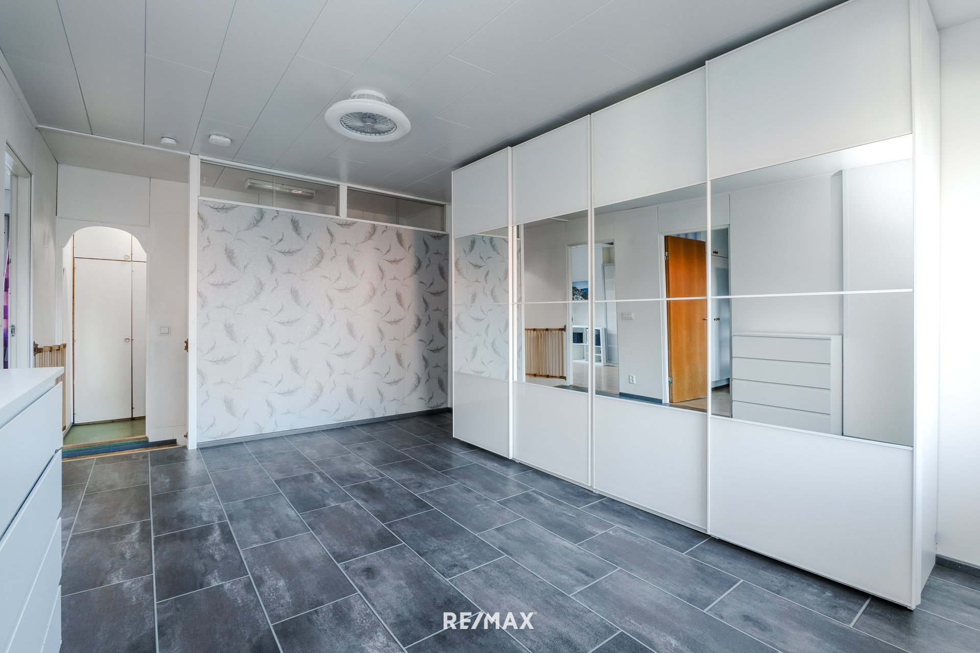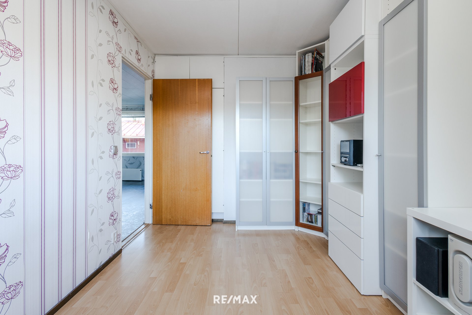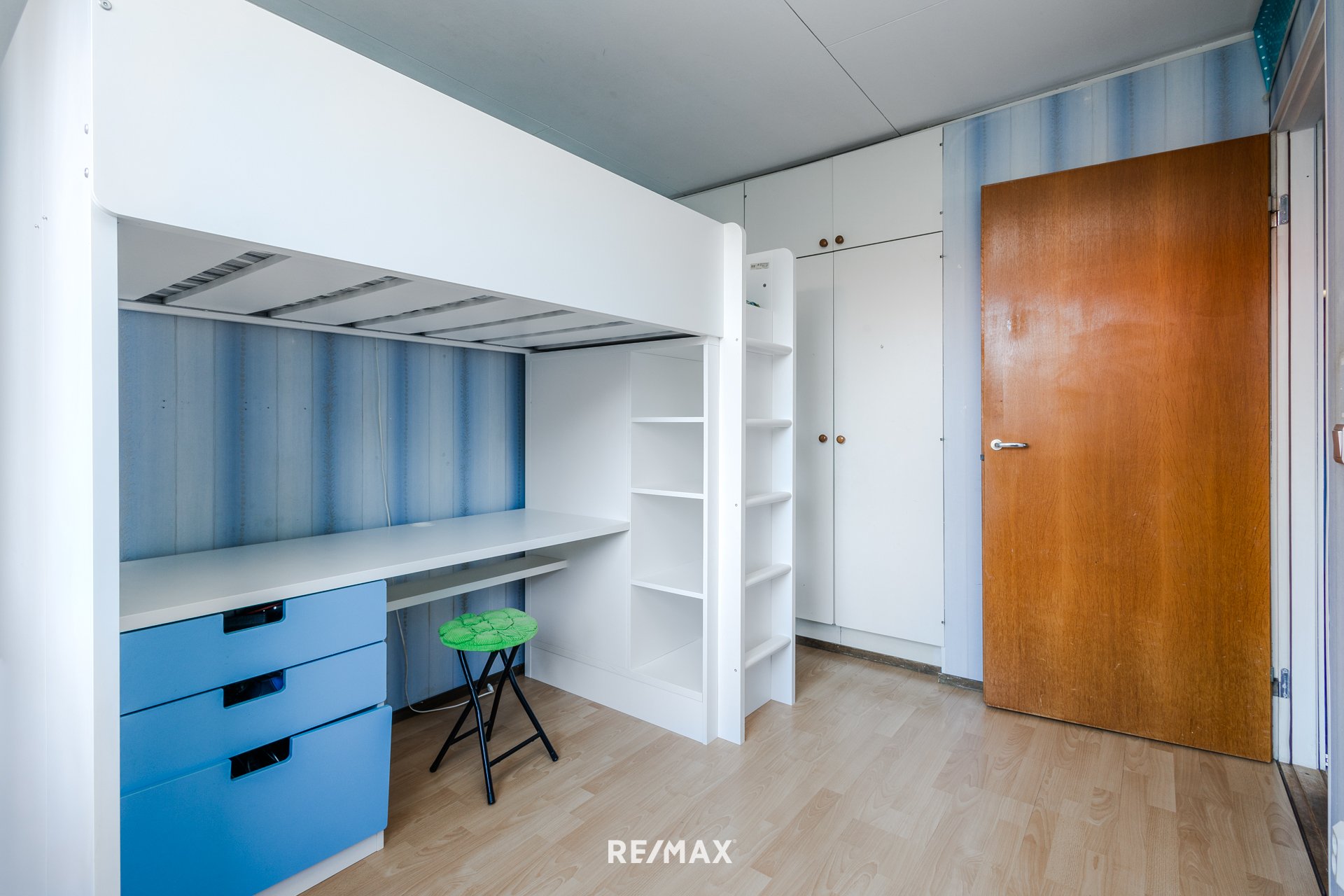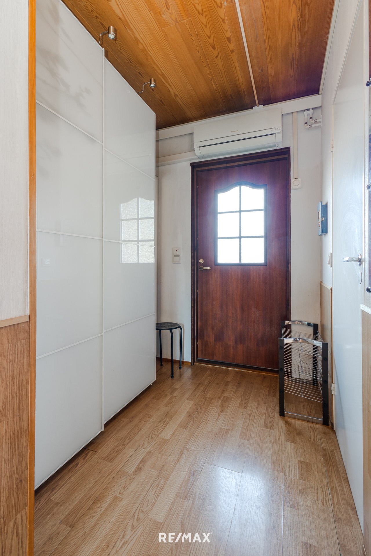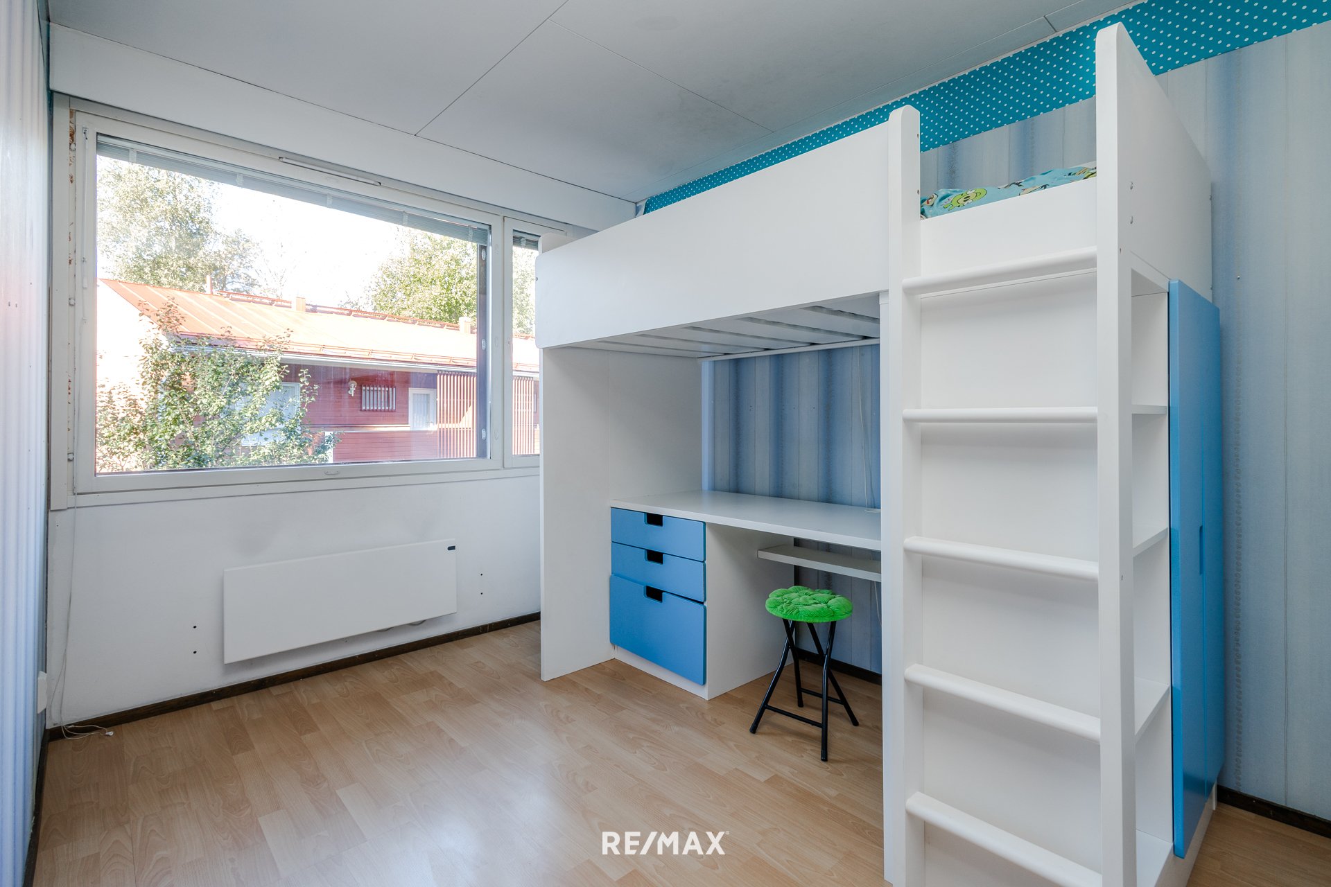 Yläkerrasta löytyvät kaksi makuuhuonetta ja aulatila/olohuone, josta helposti saa kolmannen makuuhuoneen. Yläkerrassa on hyvin säilytystilaa, ranskalainen parveke sekä erillinen wc.