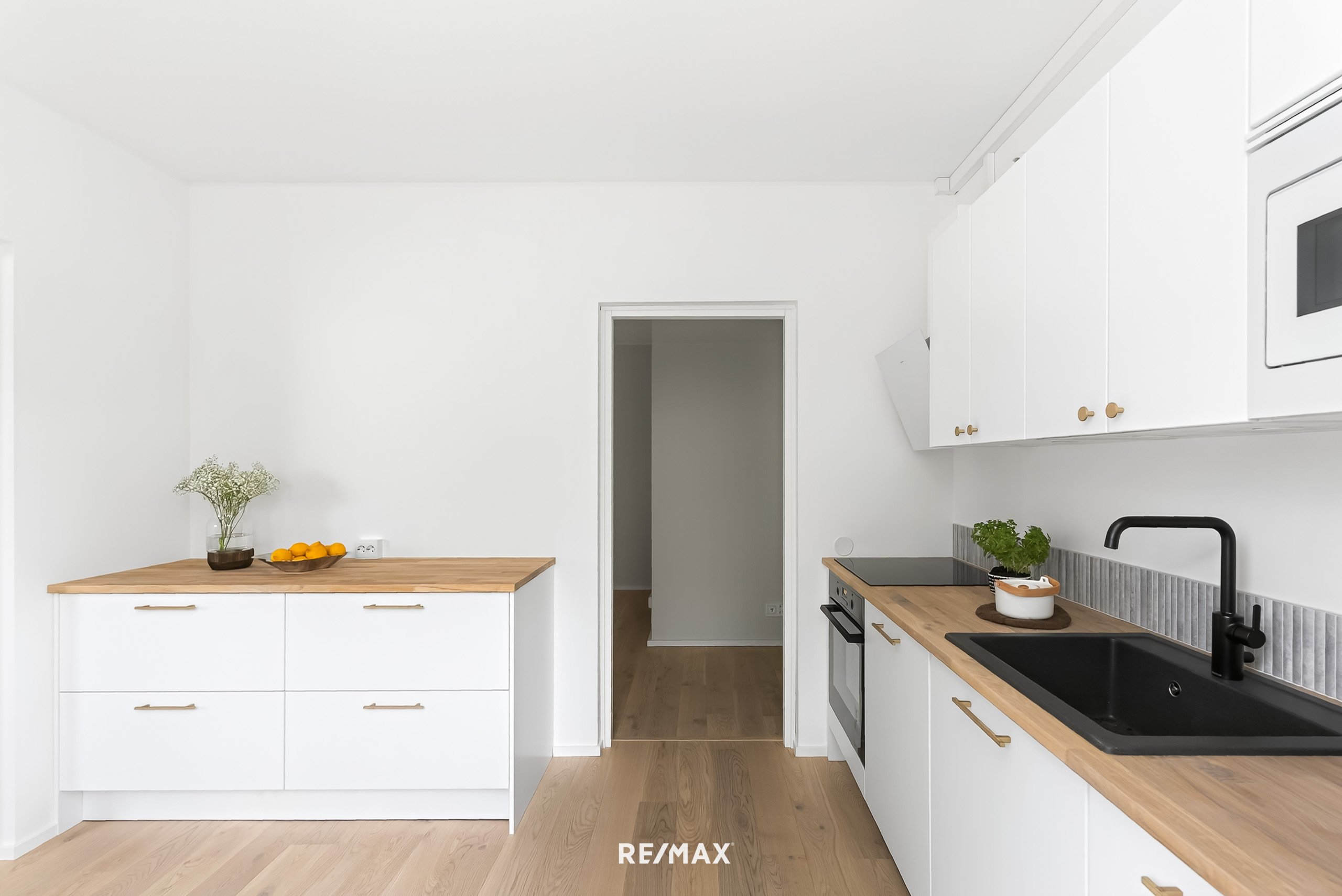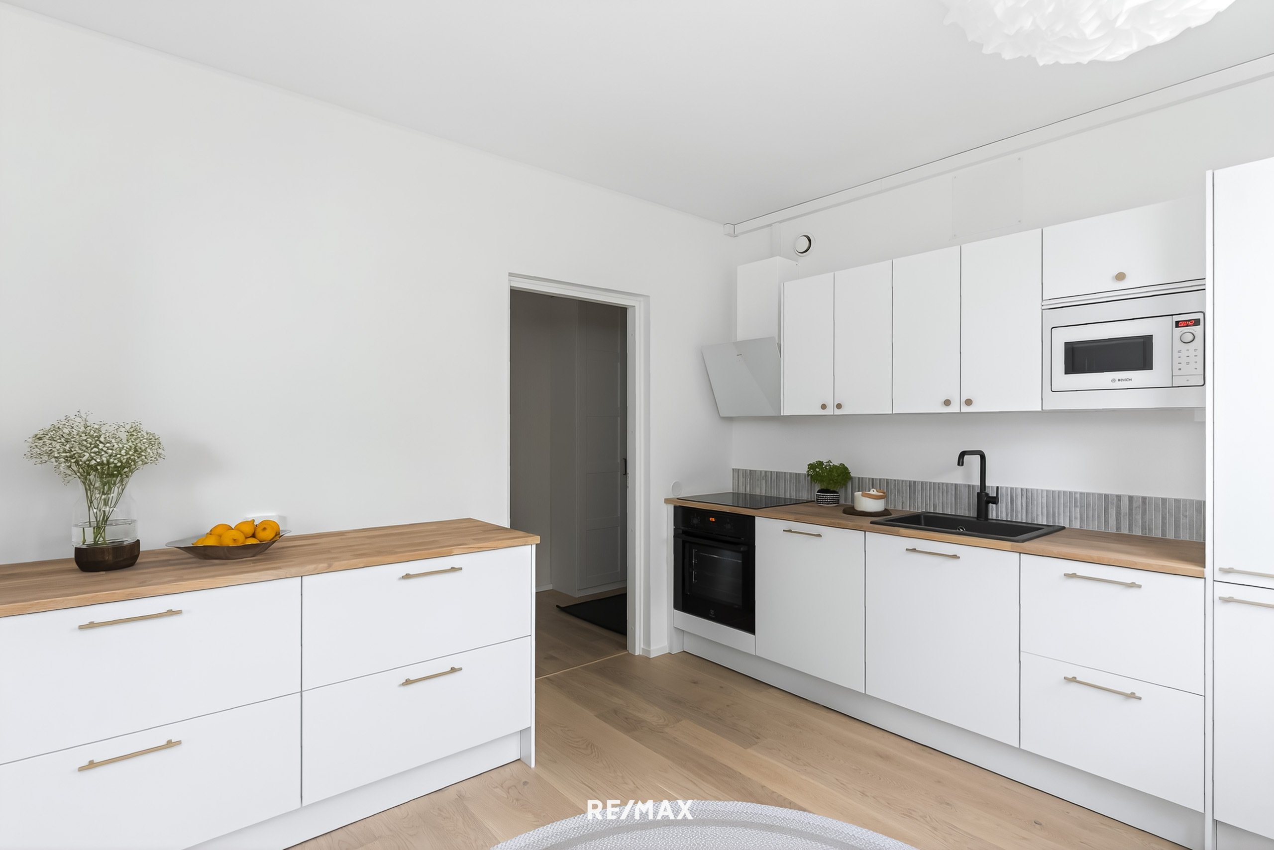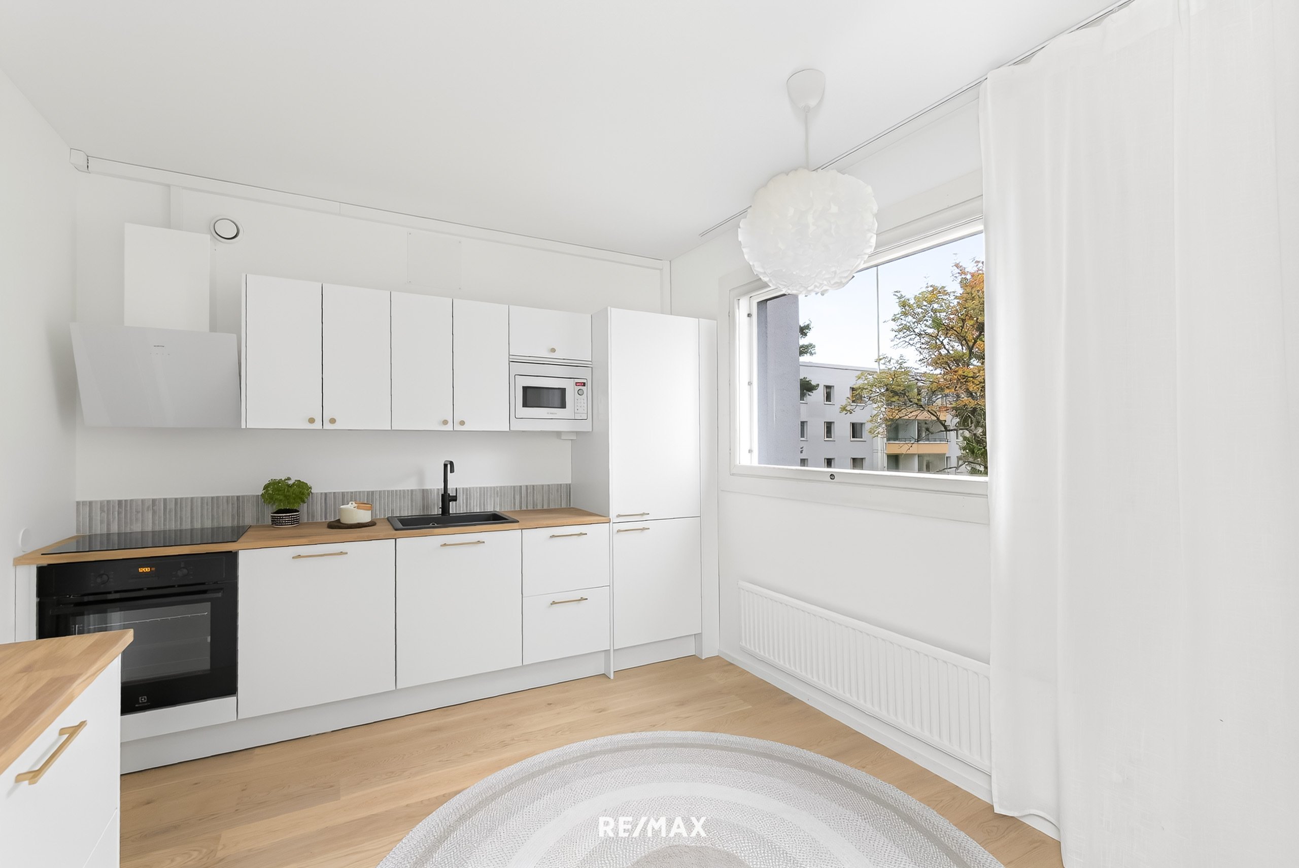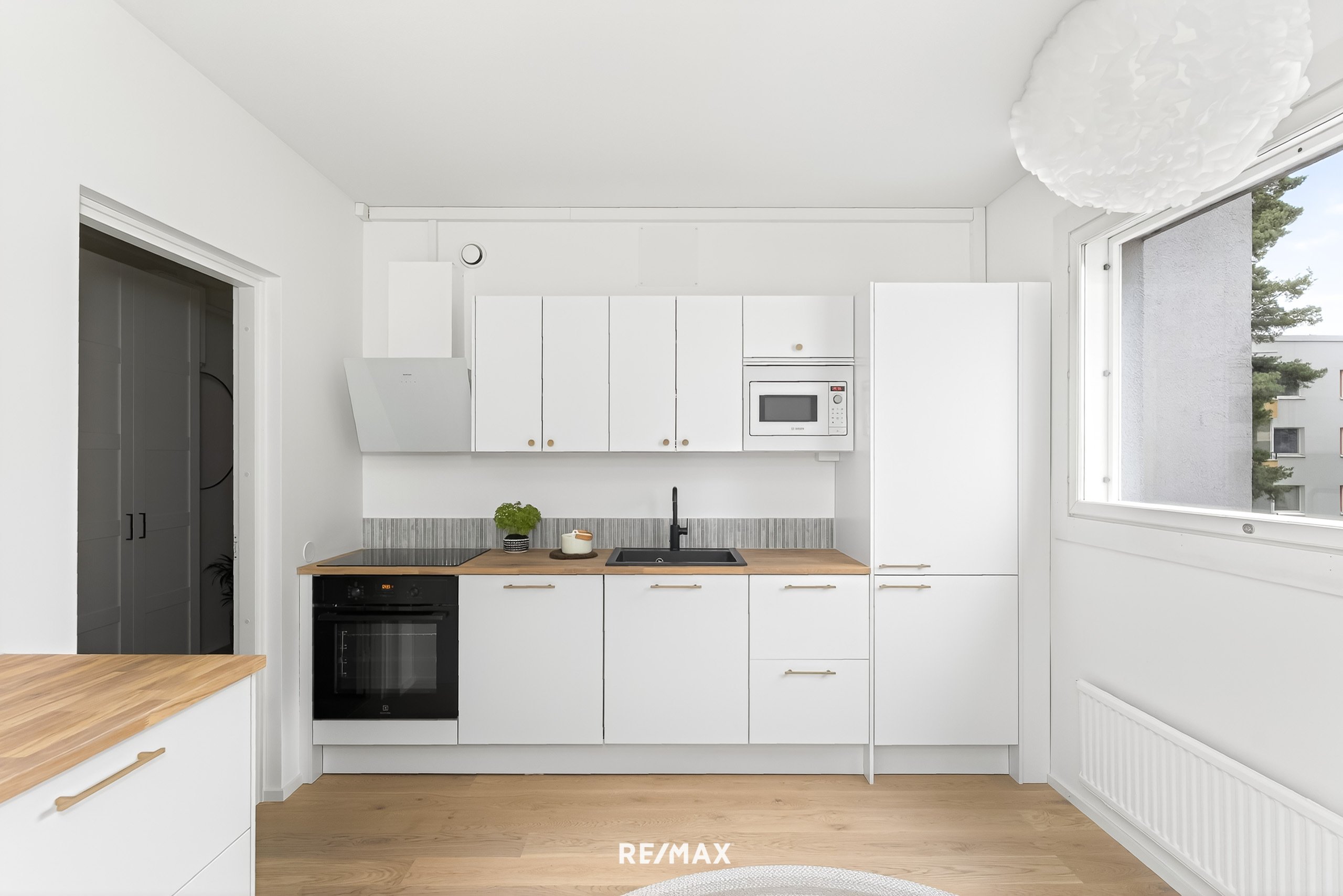 Huoneisto on juuri remontoitu uuteen uskoon! Keittiö ja huoneiston pintamateriaalit ovat uusia ja käyttämättömiä. Modernin tyylikäs keittiö on uusittu kokonaan: valkoiset Carlo Casagranden kaapistot trendikkäillä messingin värisillä vetimillä, massiivipuutasoilla ja integroiduilla kodinkodeilla. Tässä keittiössä on ilo puuhastella koko perheen kanssa. Työskentelytilaa riittää ja tilavaan keittiöön mahtuu myös ruokailuryhmä.