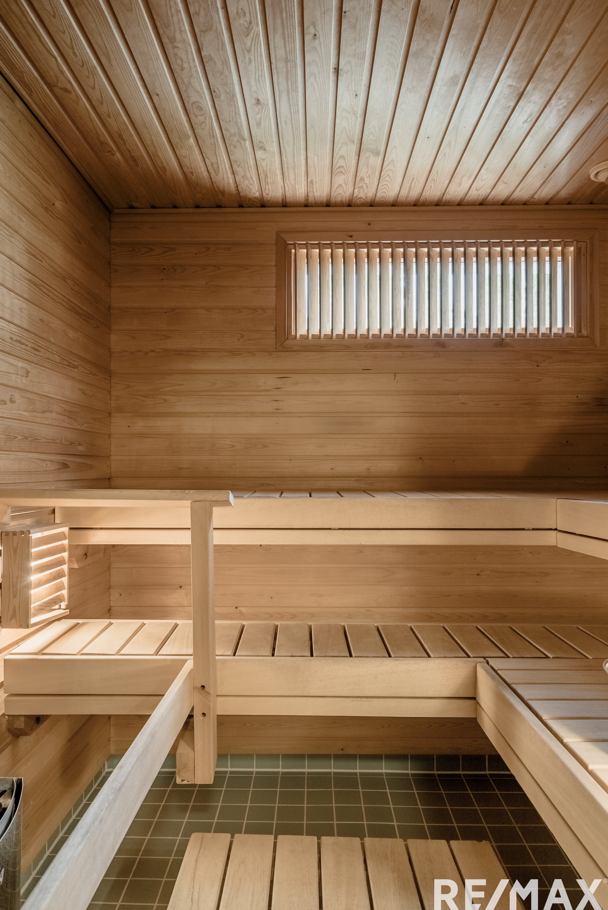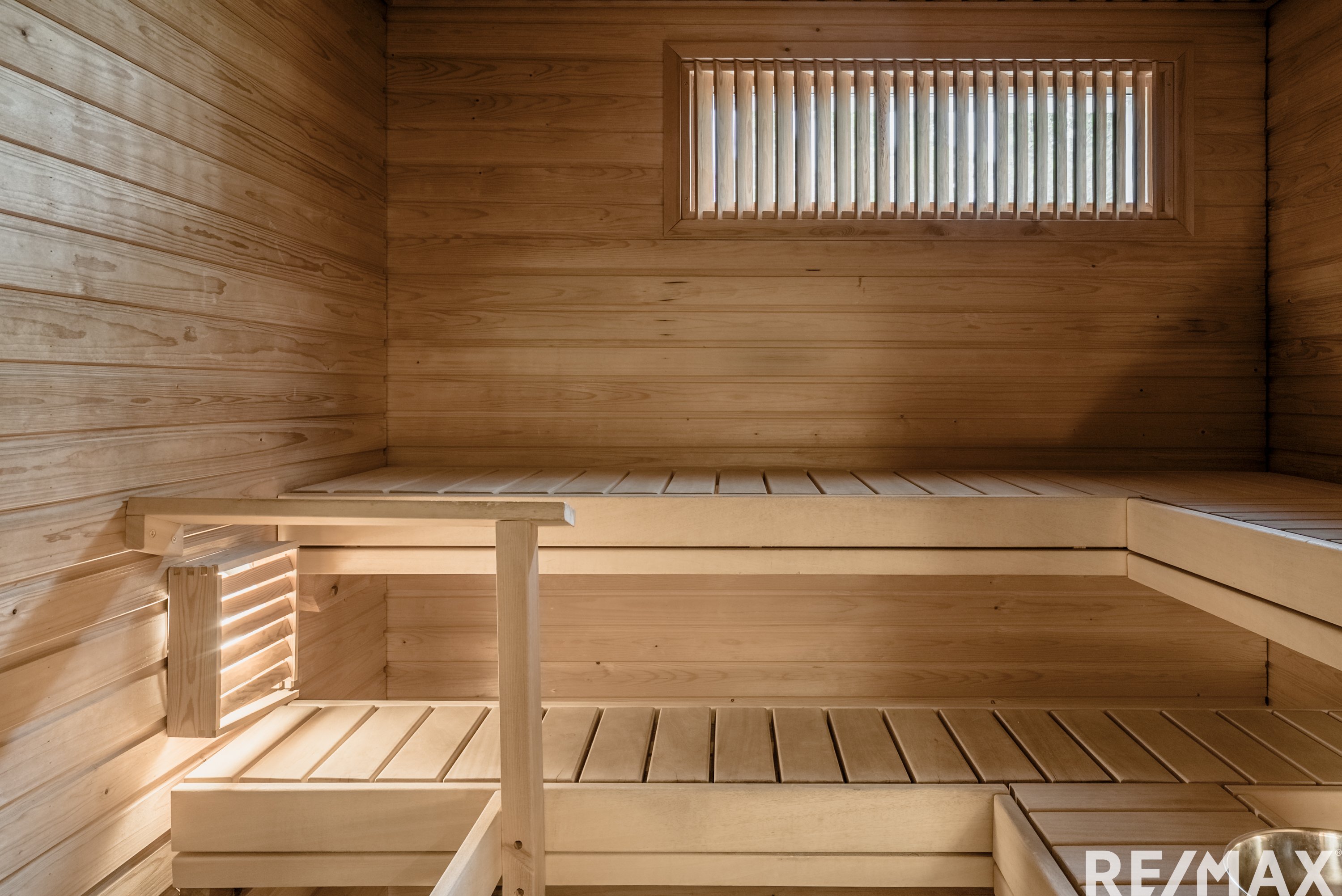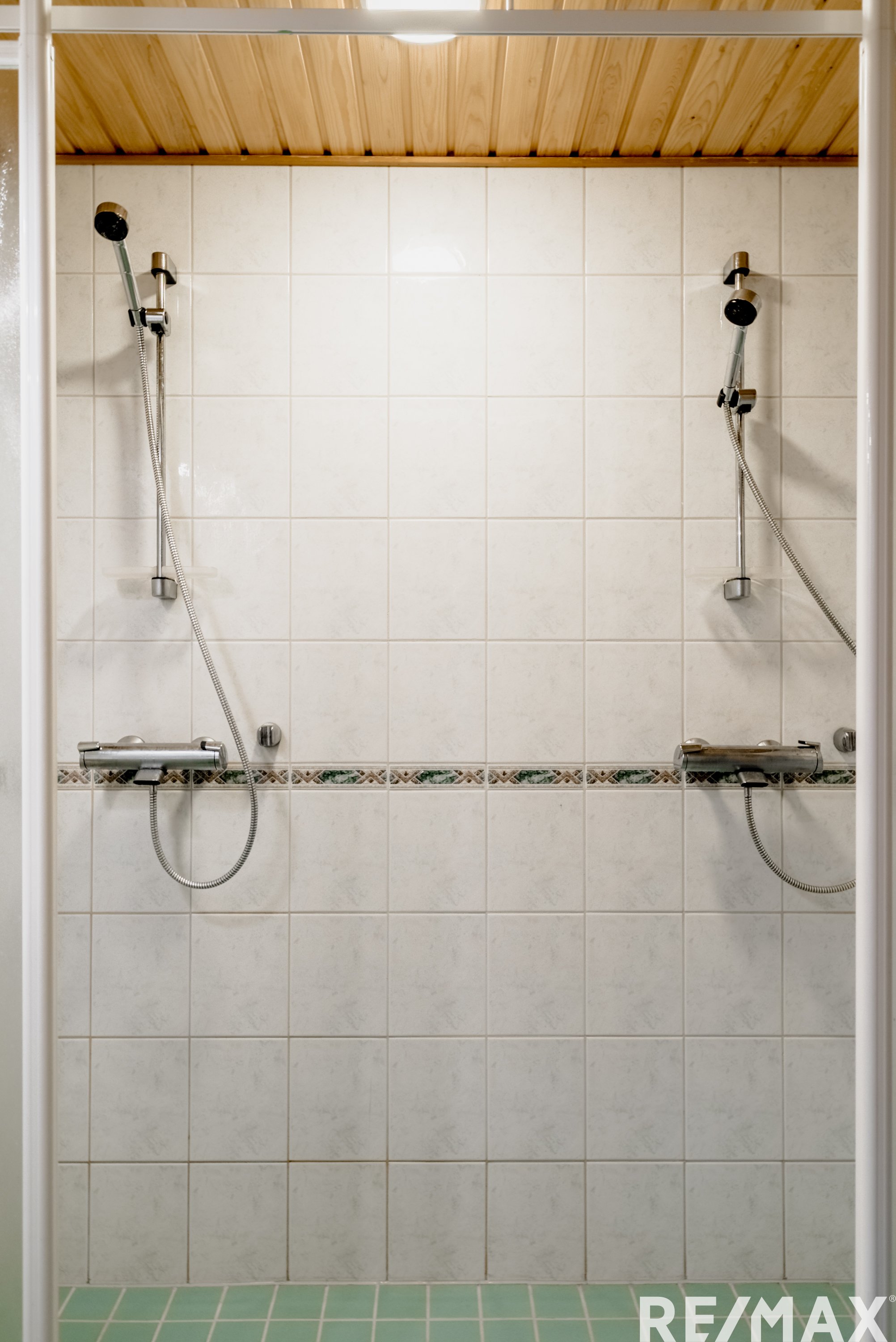 Downstairs reveals the heart of the home: a spacious living room and kitchen form a unified, bright area. The through-house layout is flooded with natural light, and the living room opens up to a large backyard. The ground floor also includes a bathroom with two showers, a roomy sauna, and a practical utility room equipped with a washing machine and dryer. A separate toilet adds everyday convenience.