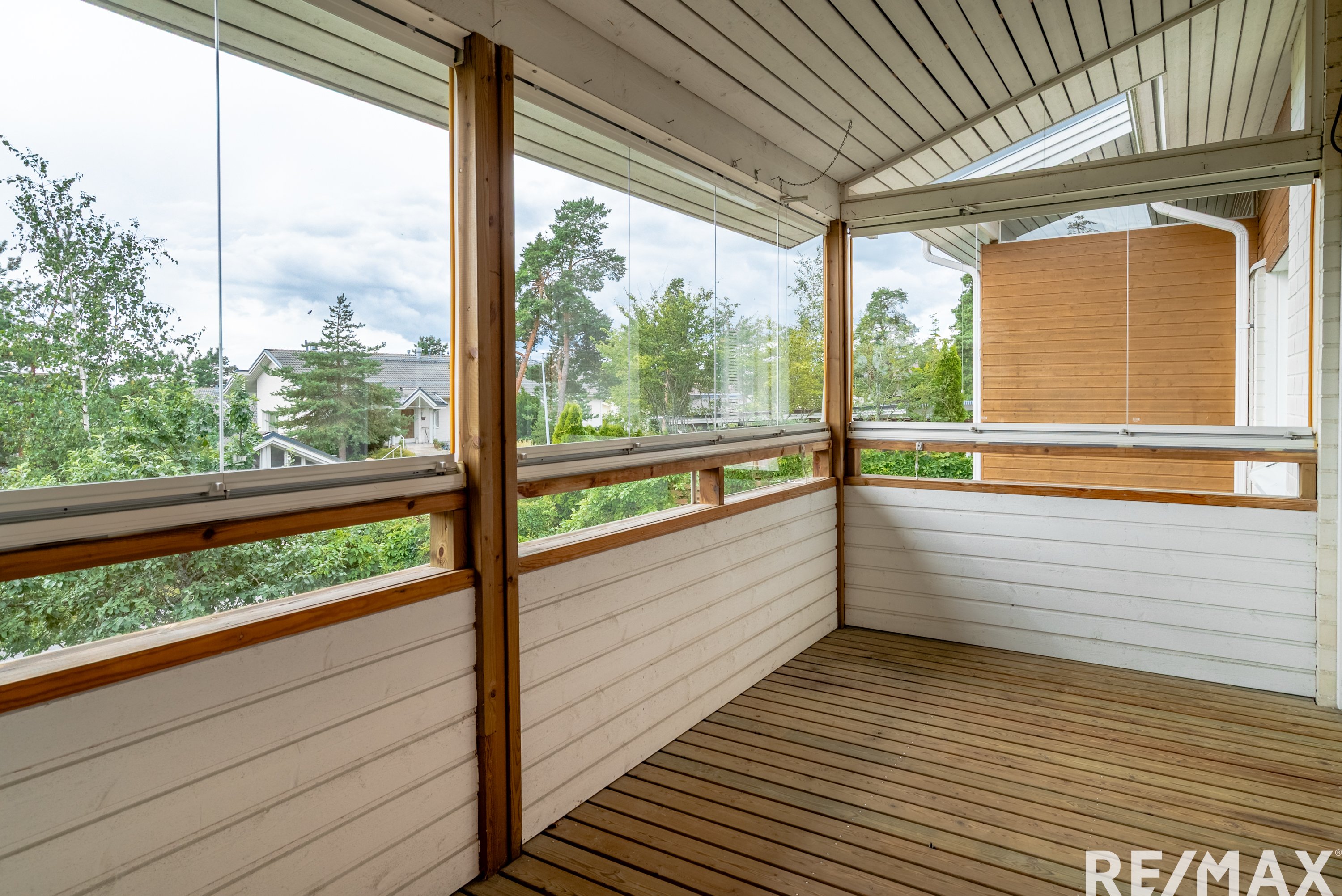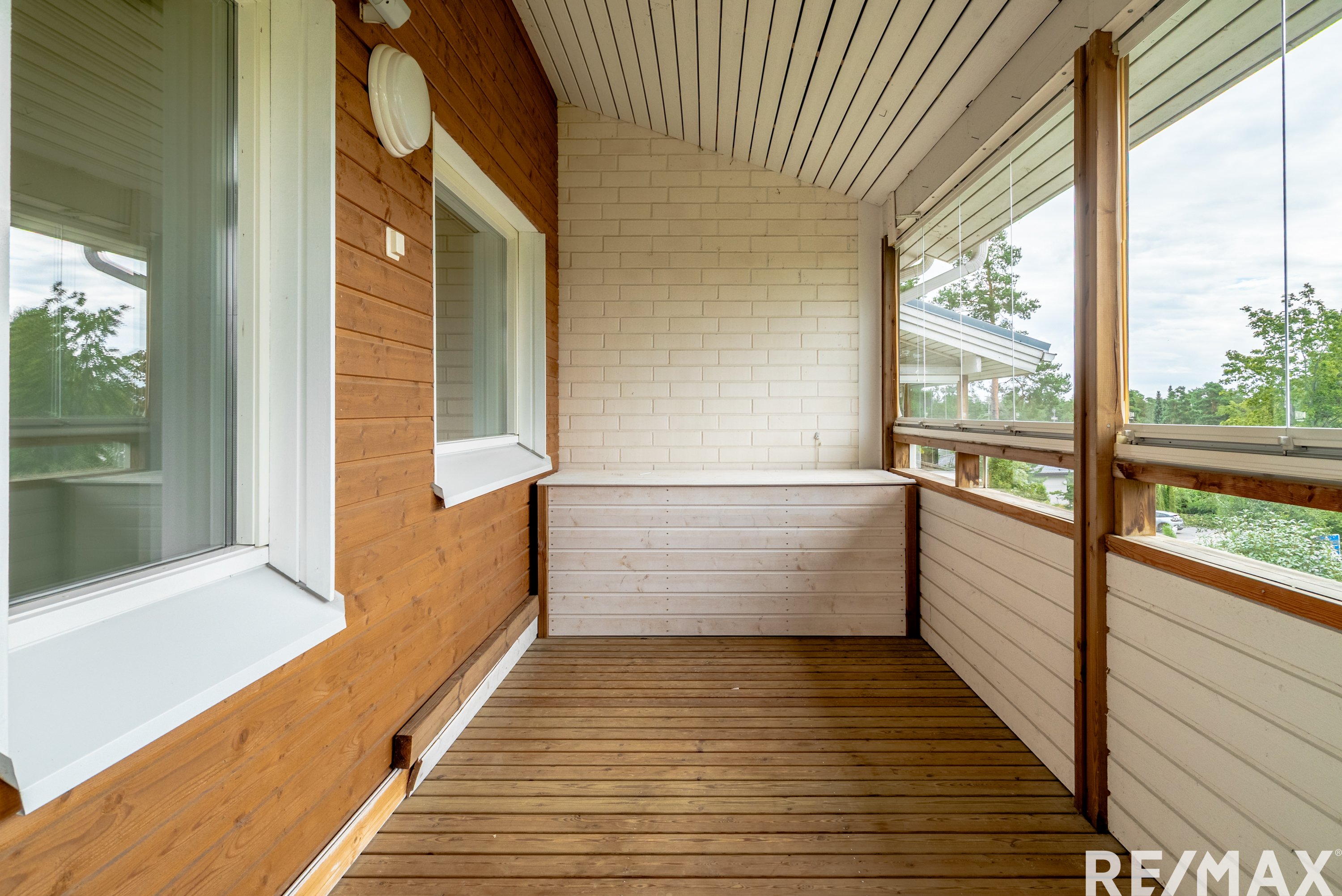 Yläkerrassa sijaitsevat makuuhuoneet rauhoittavat tilan levolliselle unelle. Yläkerrasta löytyy myös kylpyhuone suihkulla sekä aulasta käynti lasitetulle terassille, joka tuo lisää viihtyisää oleskelutilaa ympäri vuoden.