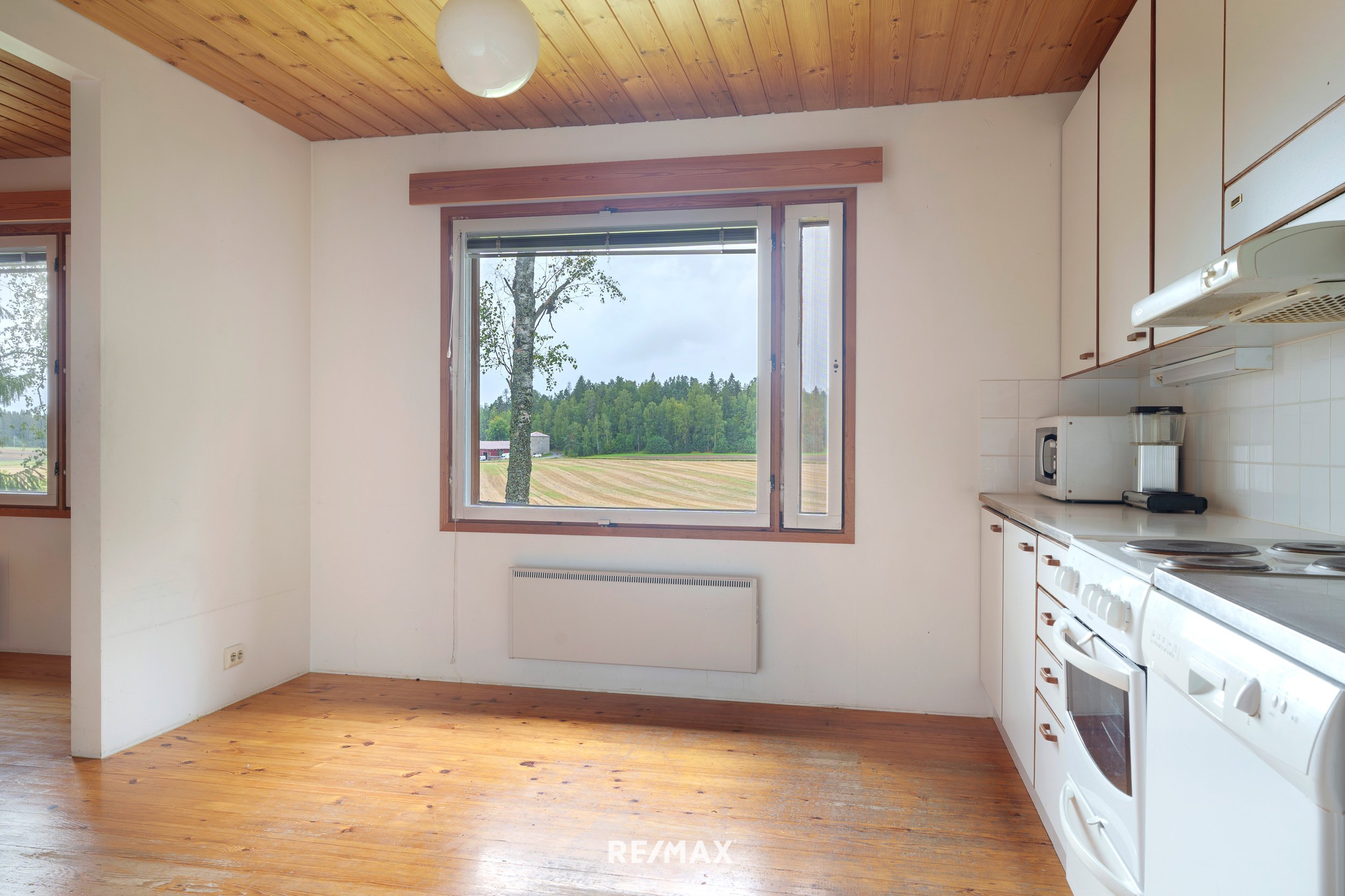 Talon keittiö ja olohuone avautuvat upeisiin piha- ja peltonäkymiin, jotka tuovat luonnon lähelle. Pihapiirissä on ollut hedelmäpuita, kuten omenapuita, kirsikkaa ja luumua, mikä tarjoaa mahdollisuuden luoda ikioma puutarhasi. Takkahuoneessa on varaava takka, joka luo lämpöä ja tunnelmaa viileinä iltoina.