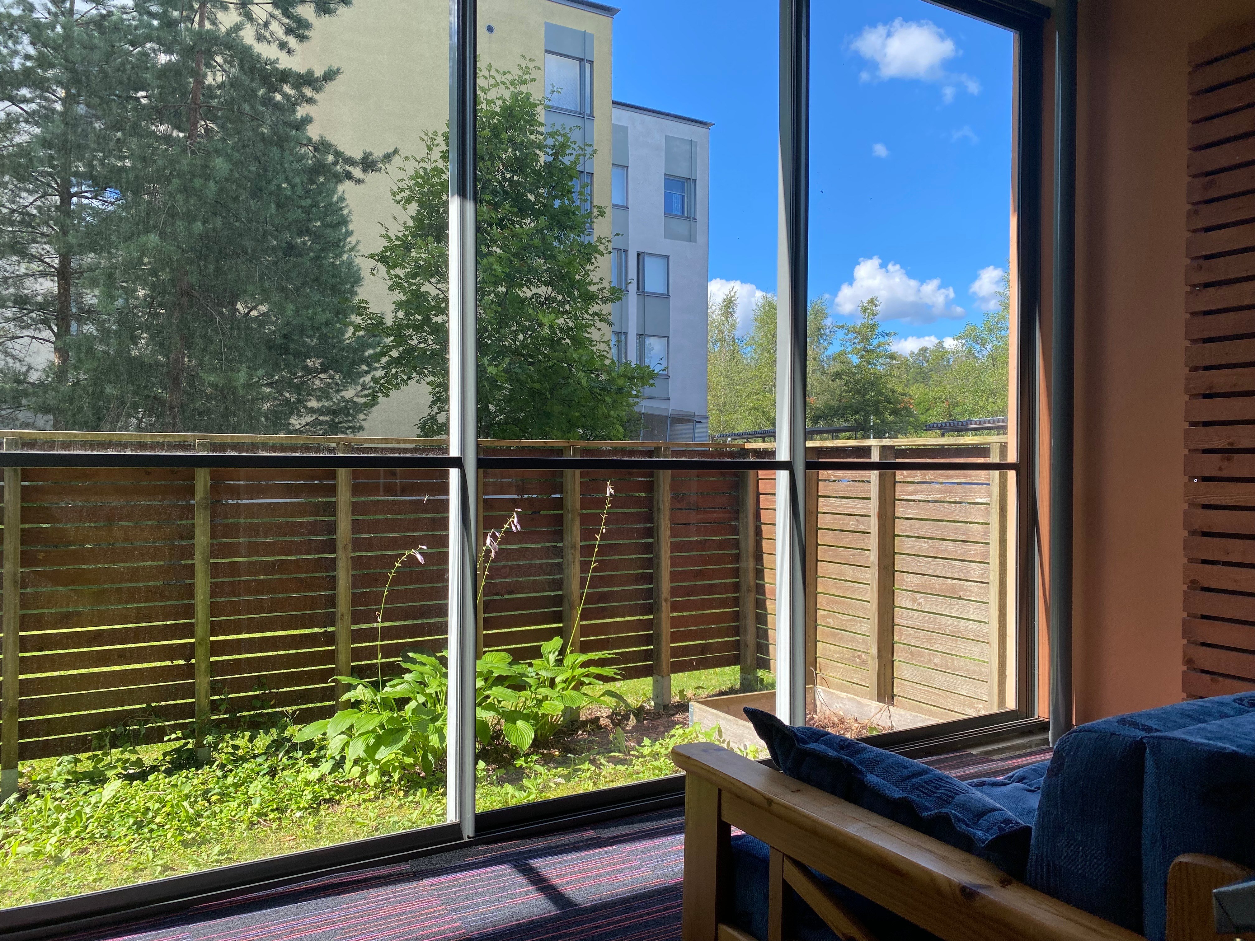 Tervetuloa tähän ihastuttavaan ja avaraan kaksioon, joka sijaitsee rauhallisessa ensimmäisessä kerroksessa! Asunnon helmi on tilava lasitettu terassiparveke ja pieni piha, joista avautuvat vehreät maisemat taloyhtiön suojaisalle sisäpihalle – ilmansuunta länteen takaa upeat iltapäivän ja- ilta-auringon sävyt.