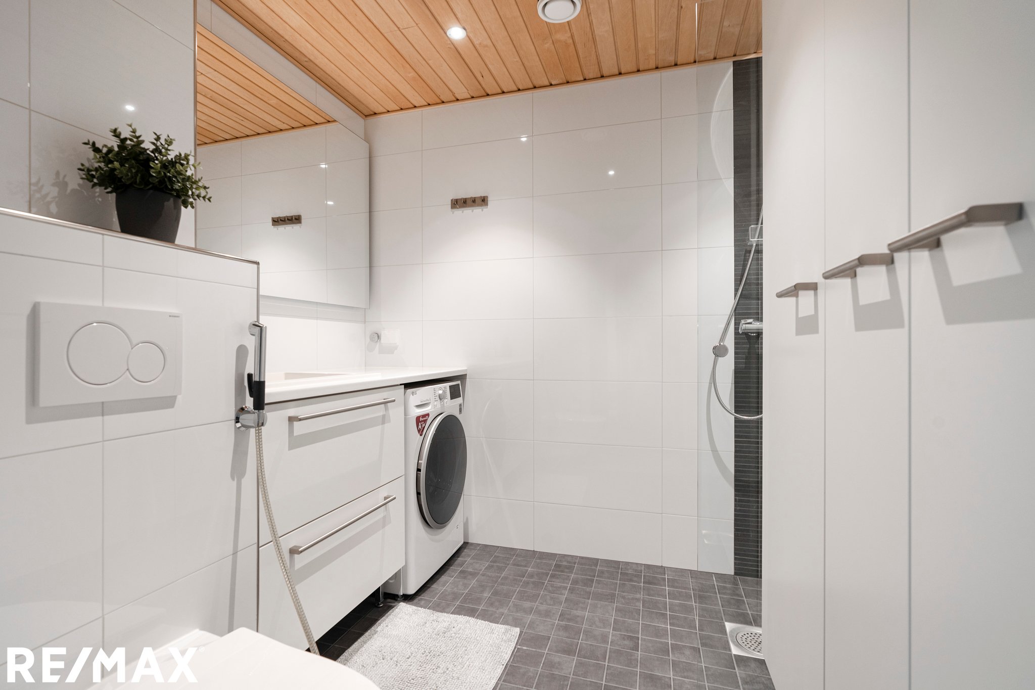 WC-istuin, suihku, suihkuseinä, pesukoneliitäntä, lattialämmitys, peili, pesuallas, allaskaappi ja bidee-suihku