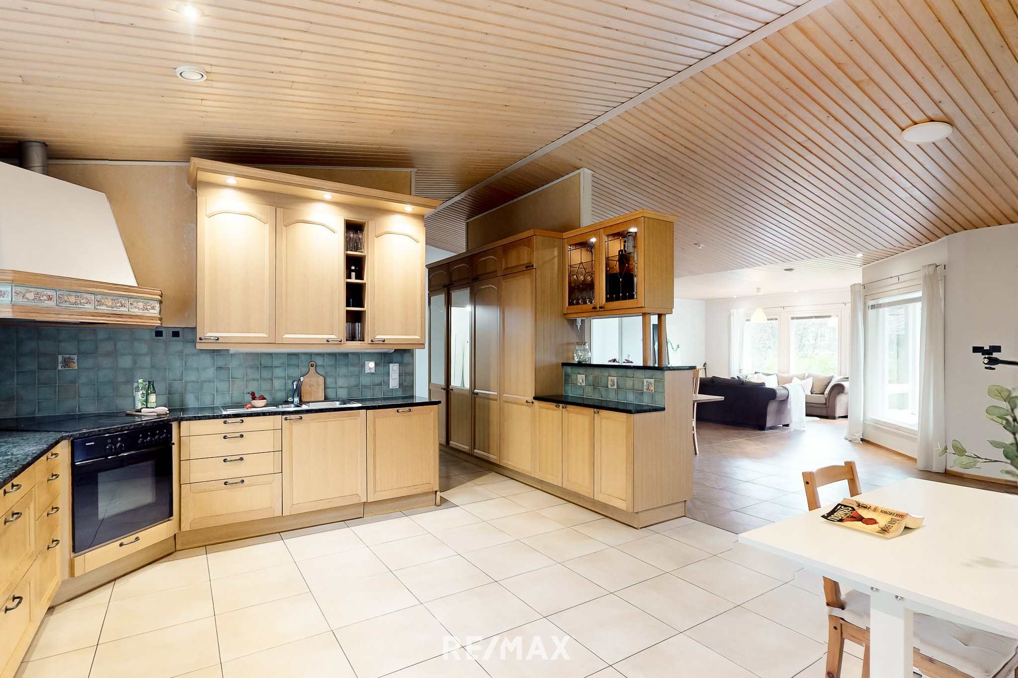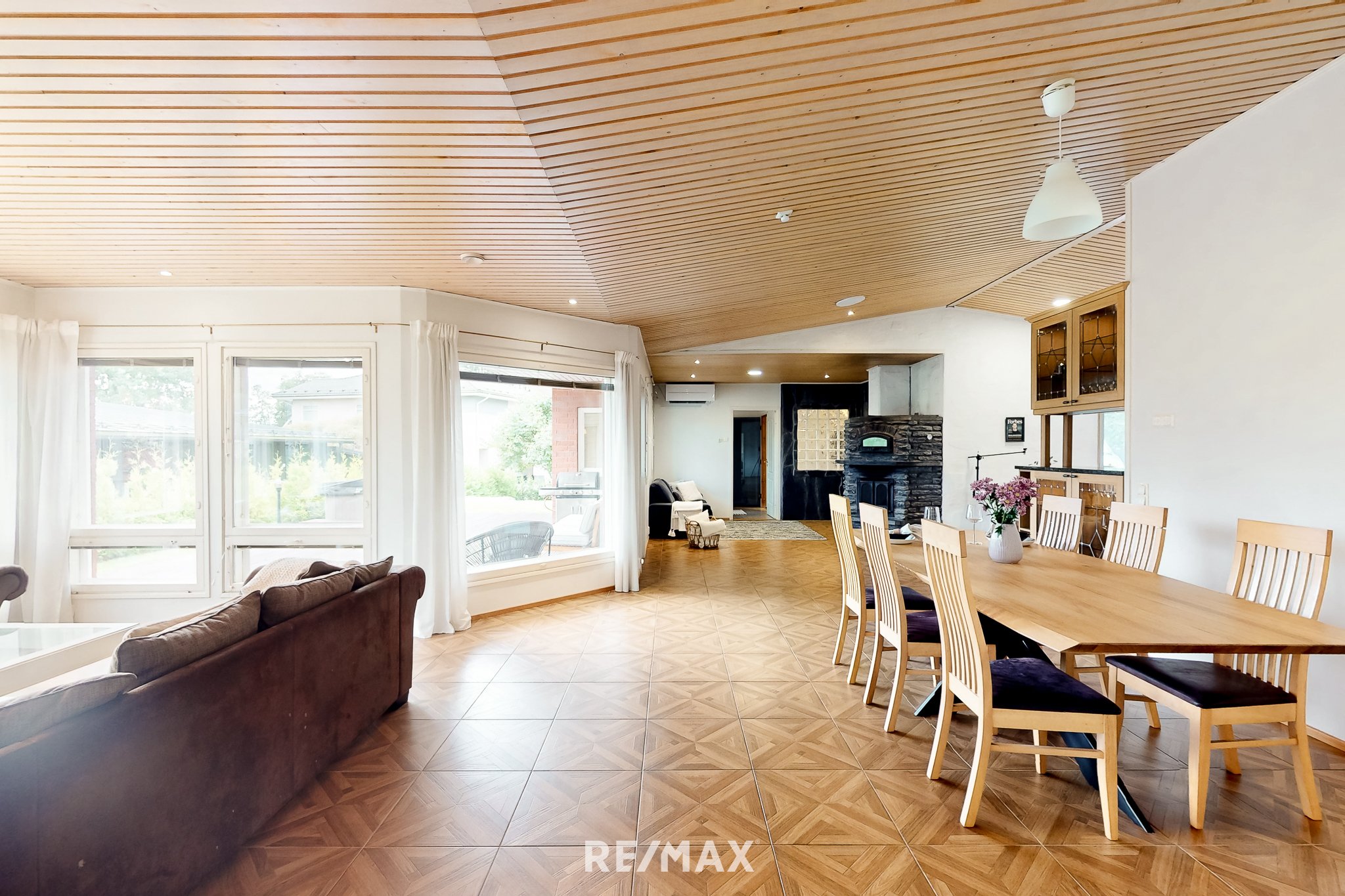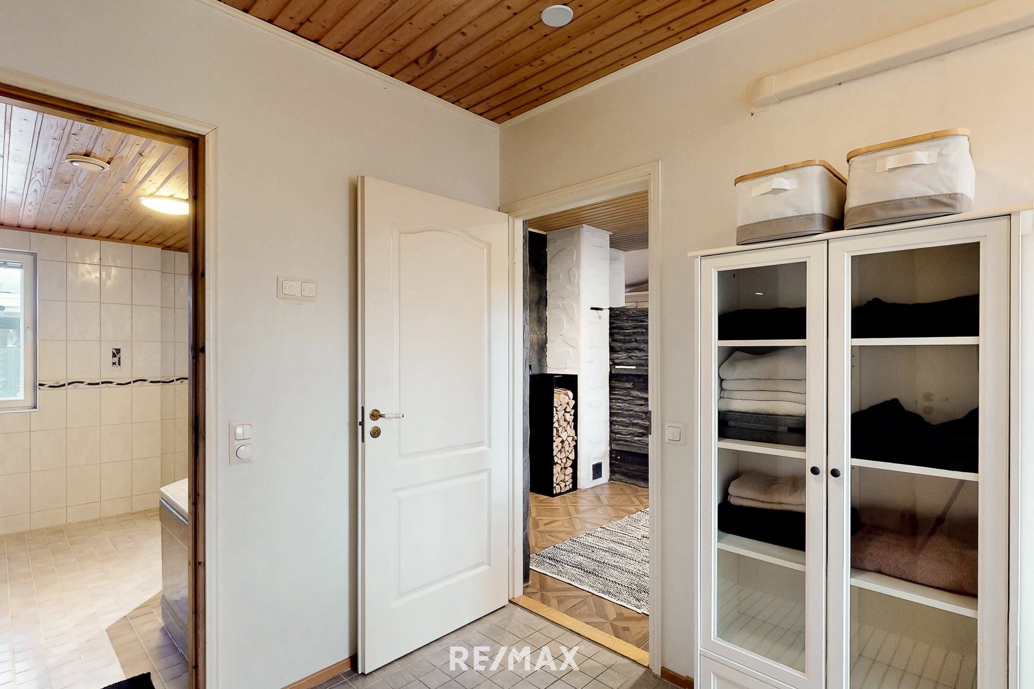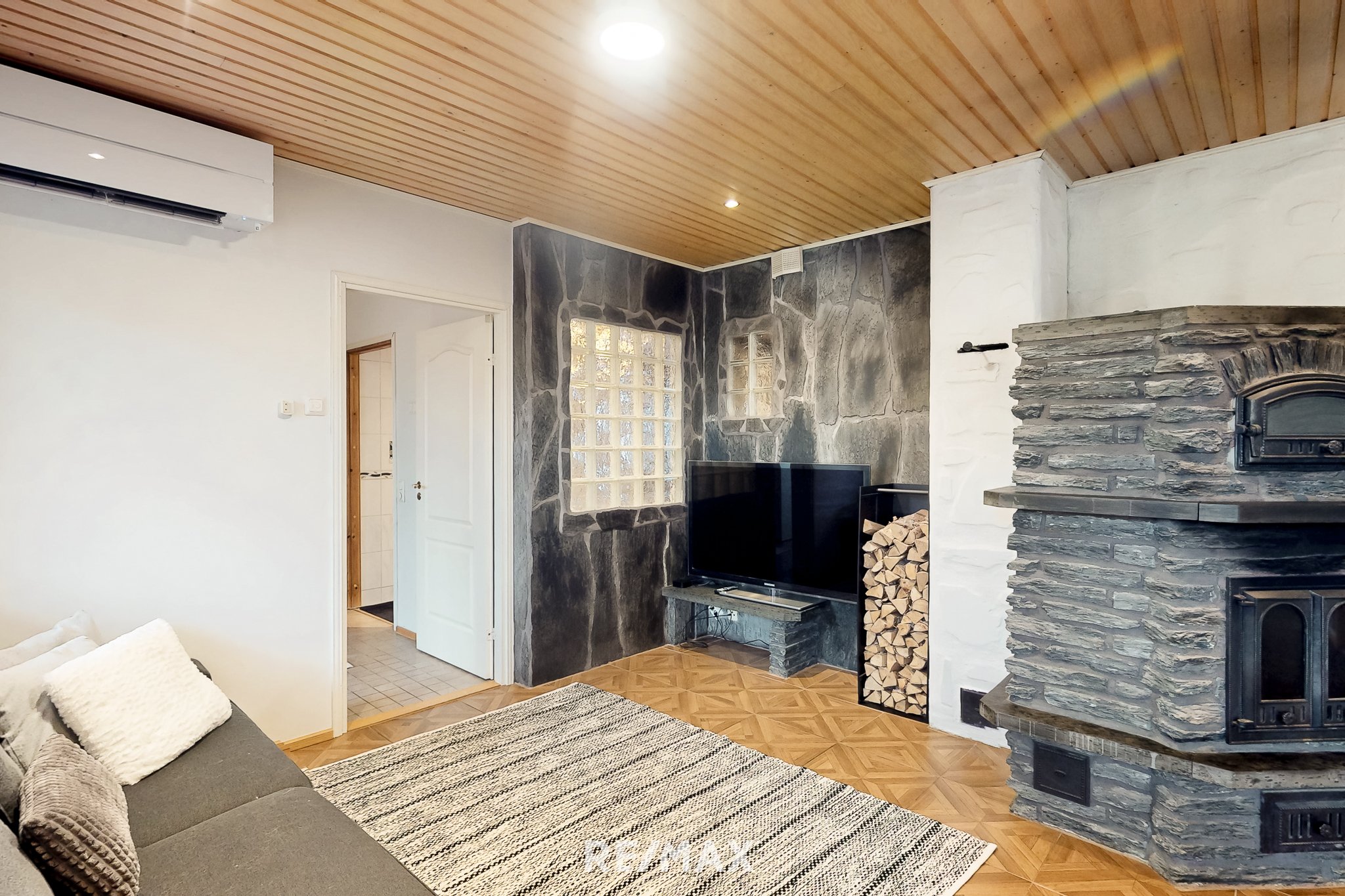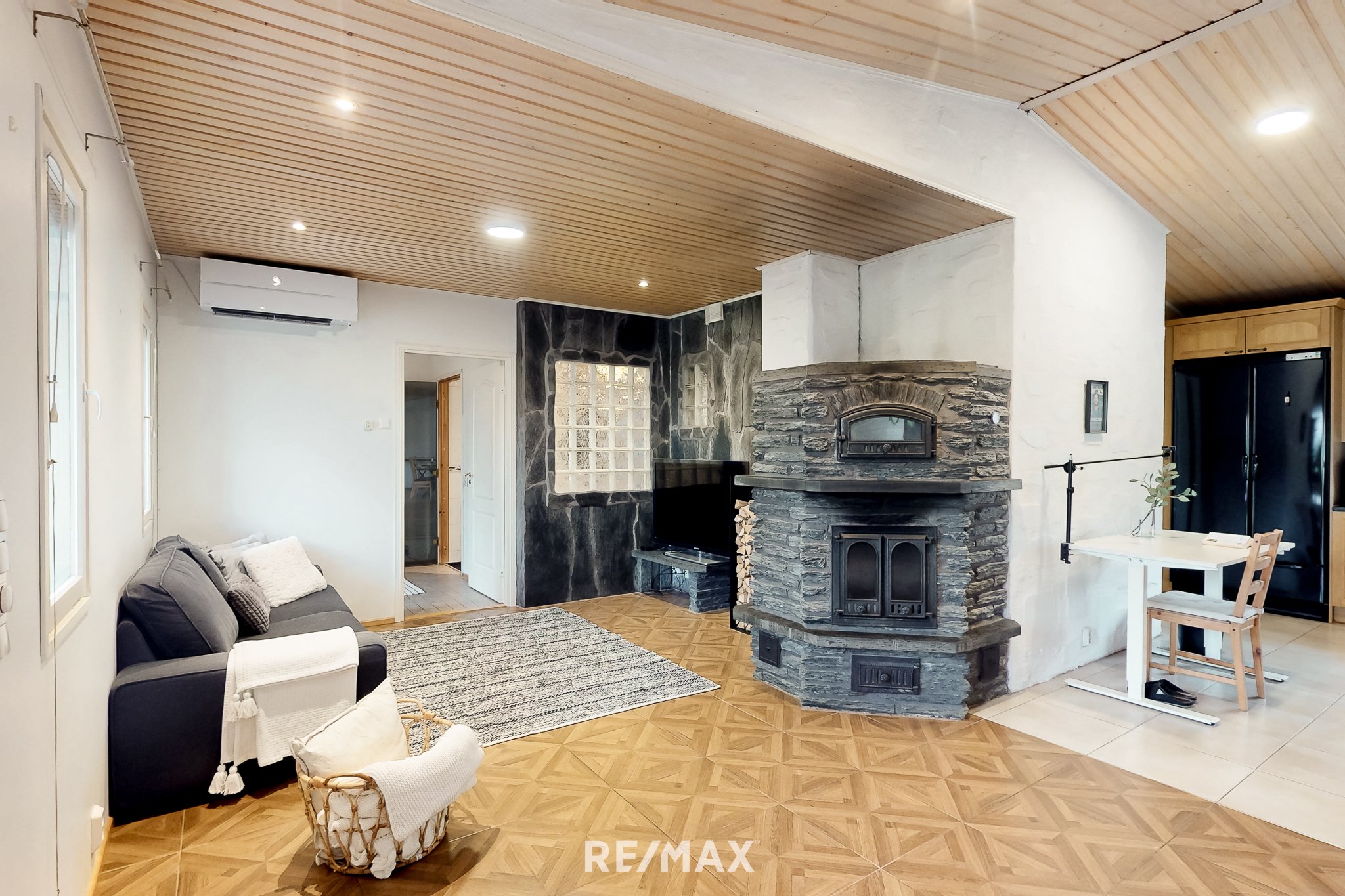 Olohuoneen ja keittiön väliin sijoittuu näyttävä varaava takka, jossa on myös leivinuuni – täydellinen tunnelmanluoja ja lämmönlähde viileämpiin vuodenaikoihin.