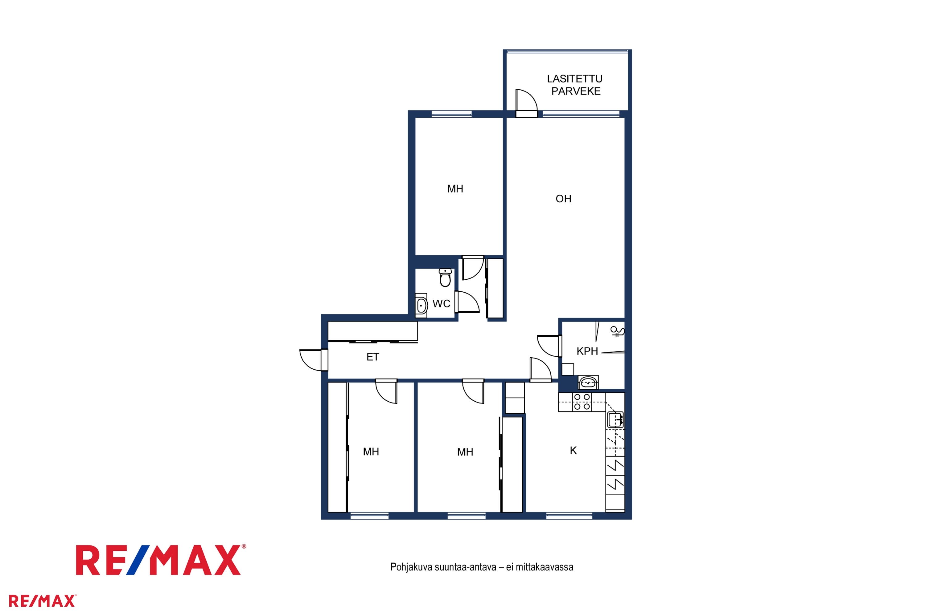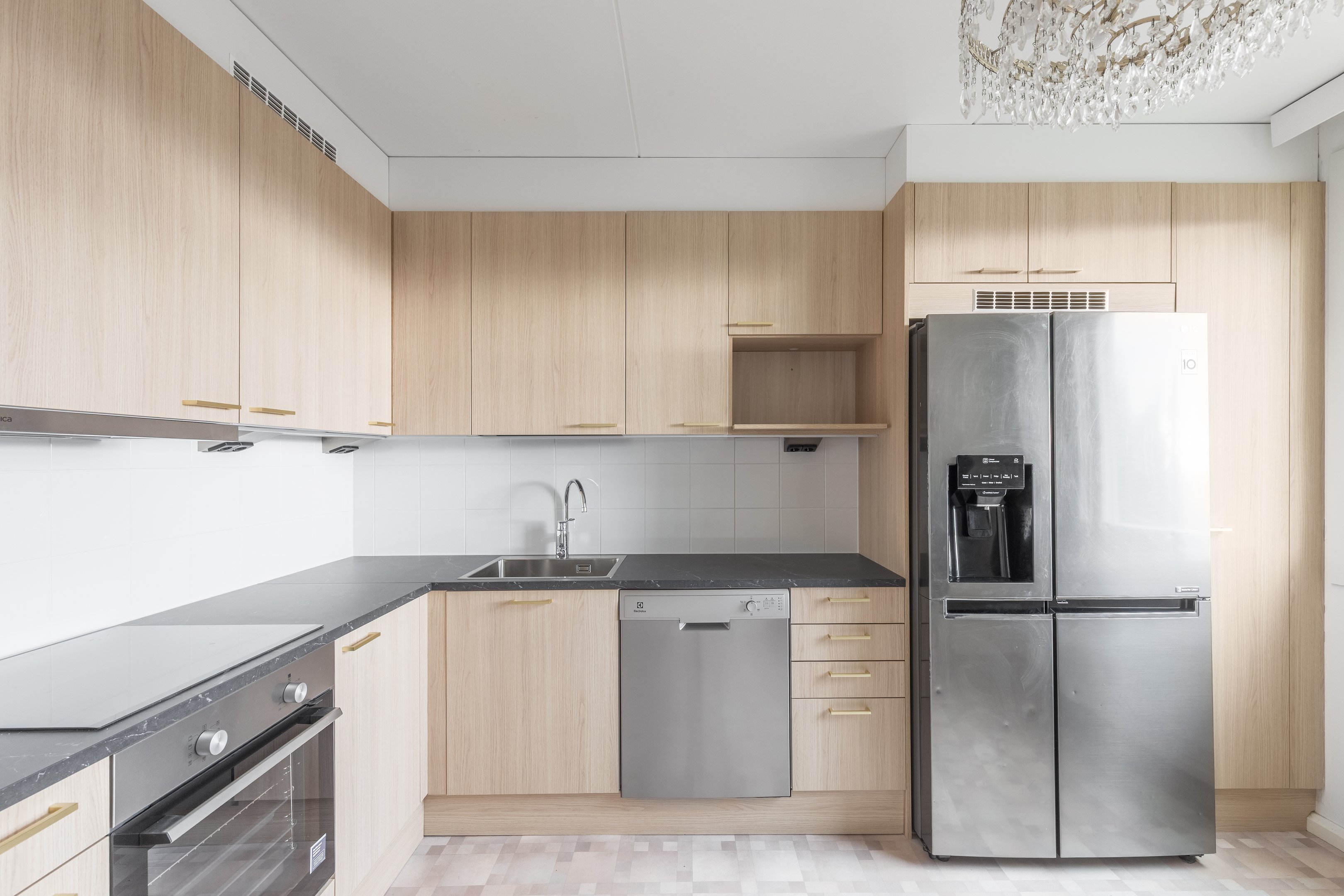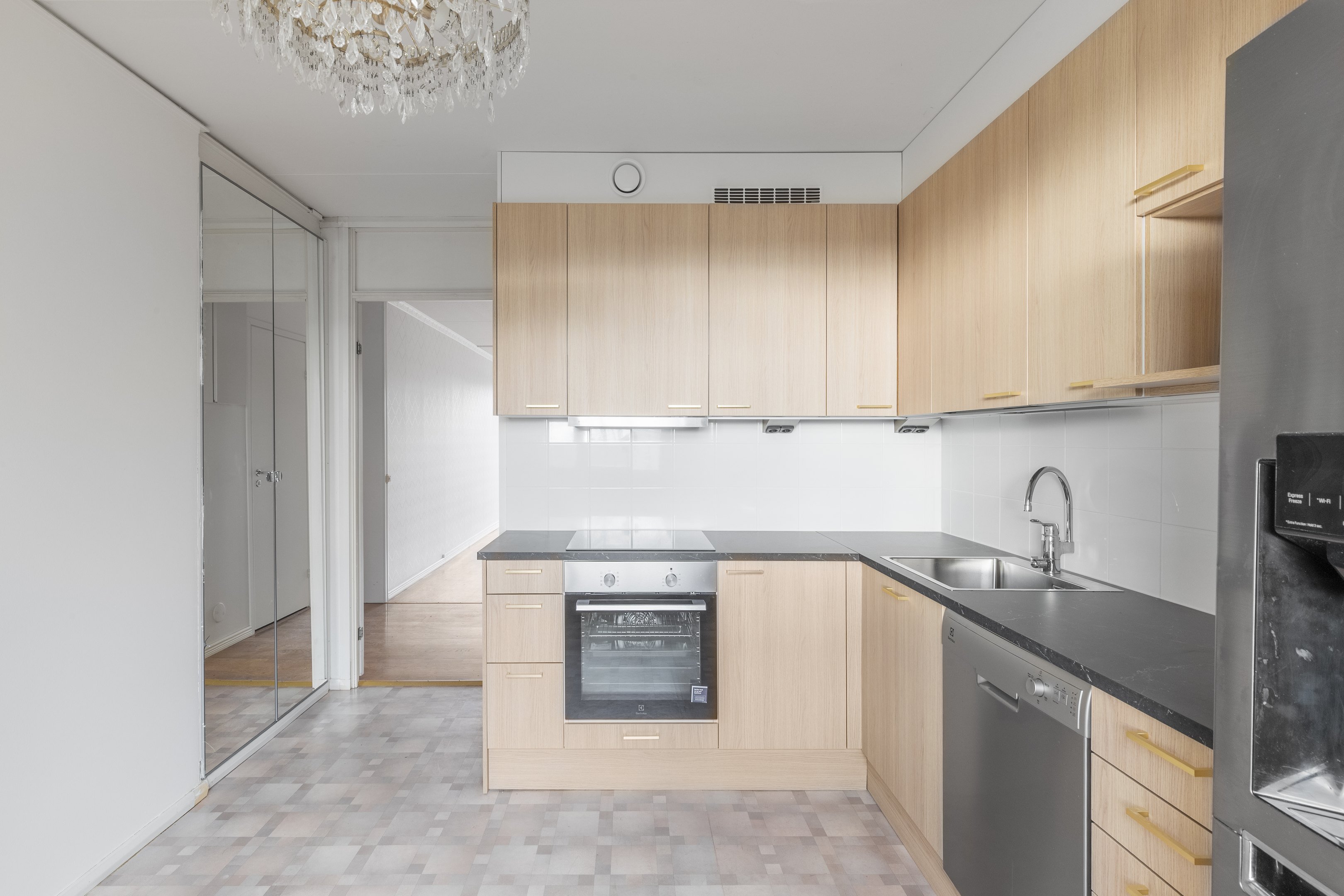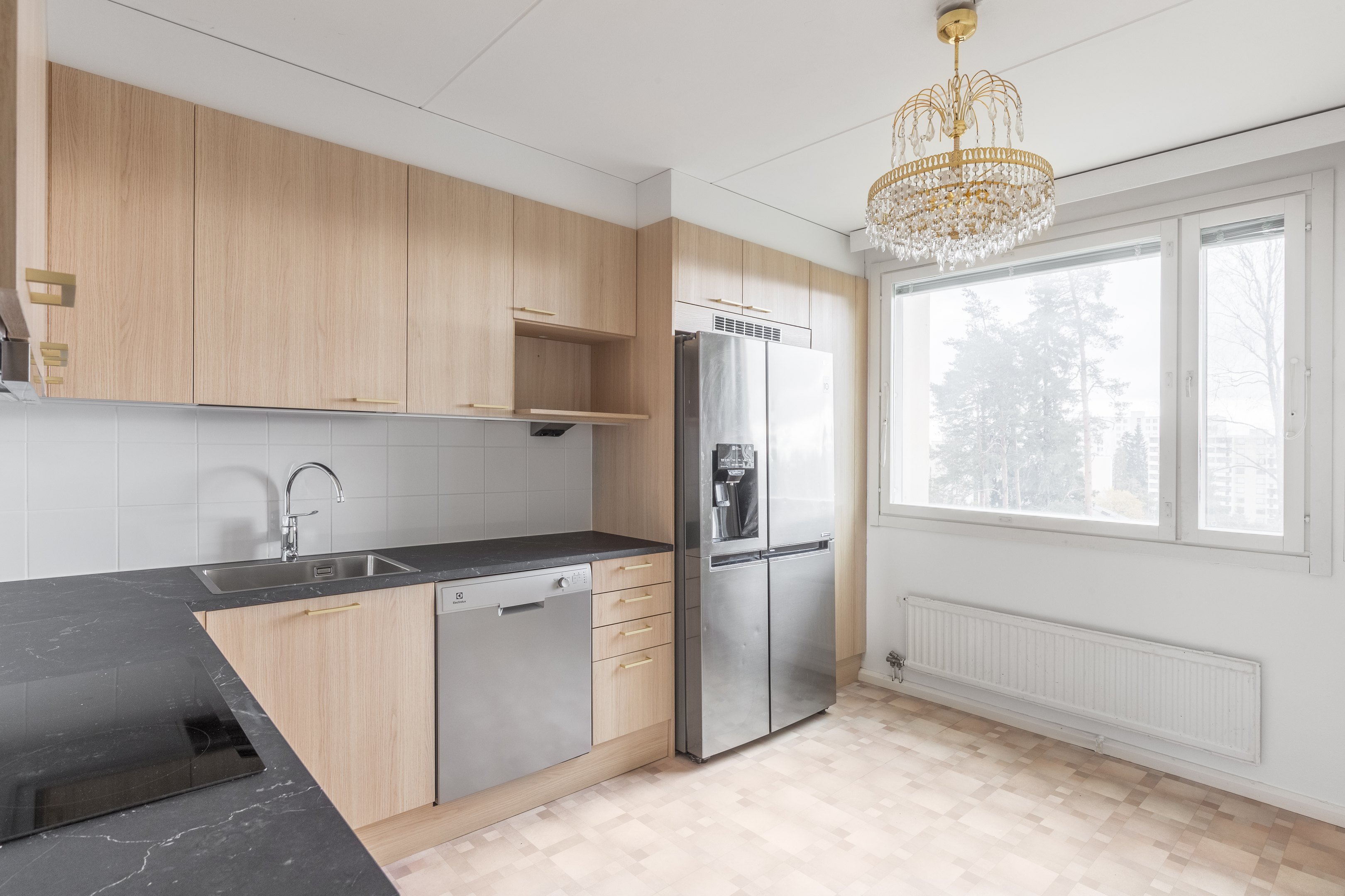 Keittiö on hyvin varusteltu ja siellä on reilusti säilytystilaa sekä paikka ruokapöydälle. Induktioliesi ja astianpesukone tekevät arjesta sujuvaa. Kolme makuuhuonetta tarjoavat joustavasti tilaa perheelle, työhuoneeksi tai vieraskäyttöön. Tilava kylpyhuone ja erillinen WC lisäävät asumismukavuutta.