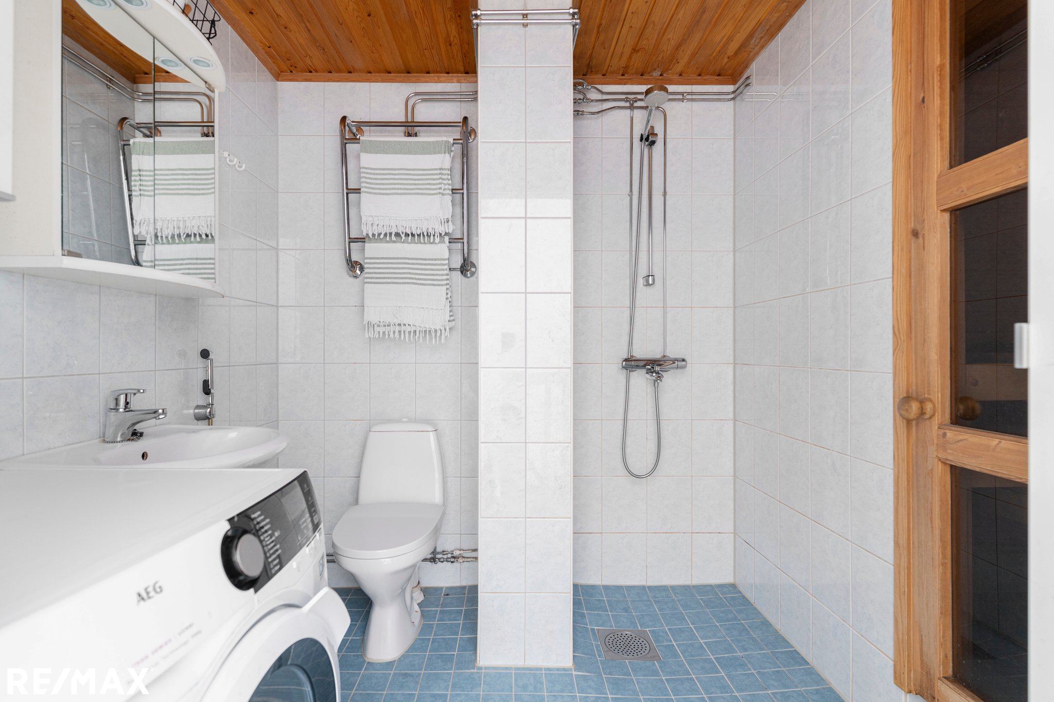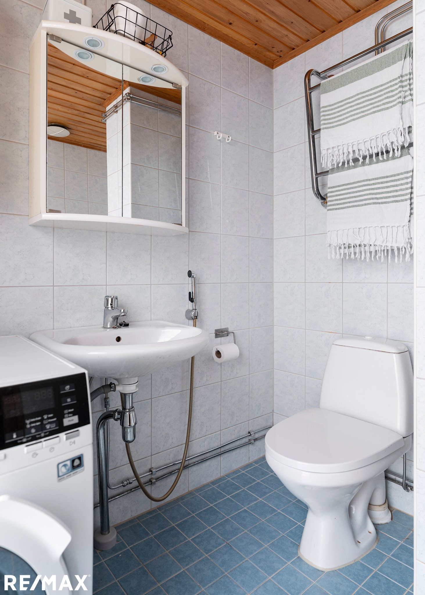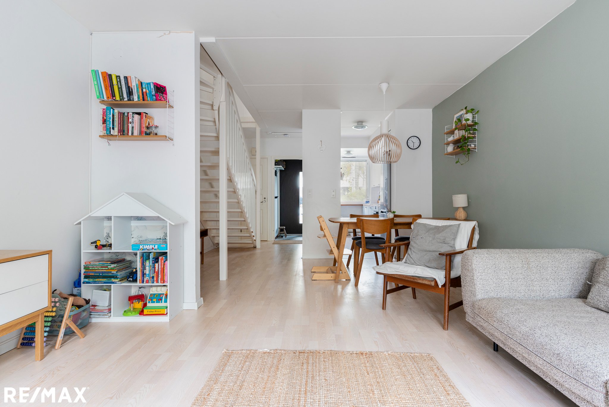 Asunnon sydän on alakerran osittain yhtenäinen tila, jossa keittiö, ruokailutila ja olohuone muodostavat käytännöllisen ja viihtyisän kokonaisuuden. Olohuoneesta avautuu kulku aidatulle piha-alueelle, jossa on iso terassi ja suojaisa puu – täydellinen paikka kesäpäiviin ja yhdessäoloon. Alakerrassa on lisäksi erillinen wc, joka helpottaa arkea.
