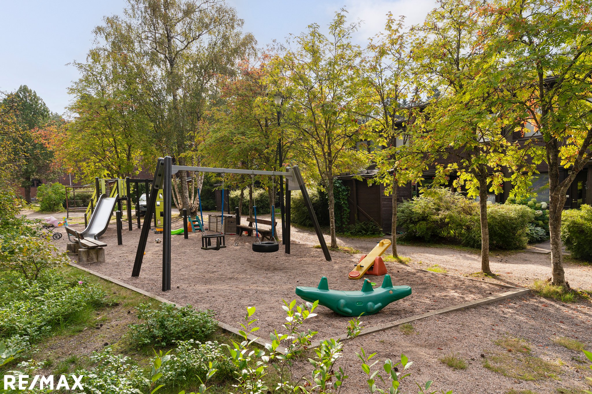 Etupihan edustalla on lasten leikkipaikka, joka tekee tästä kodista erityisen houkuttelevan lapsiperheille.