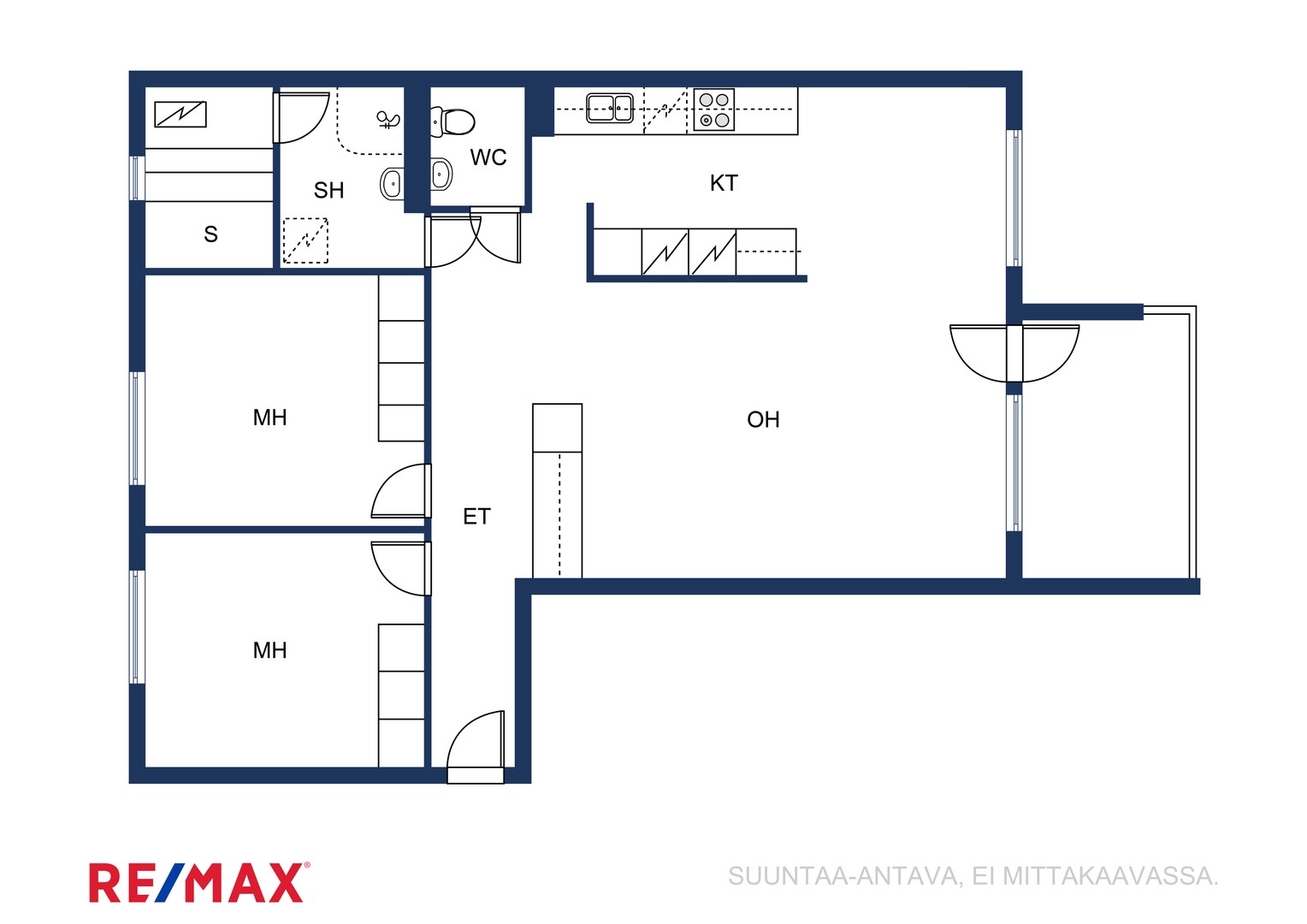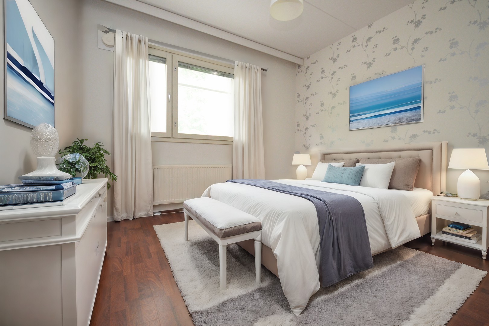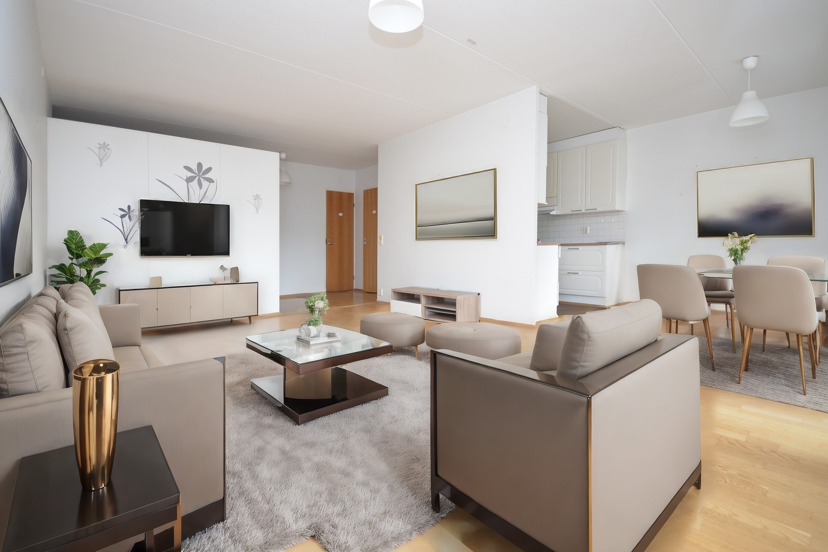 Vaaleasävyinen avara koti, jossa kookas olohuone ja avokeittiö. Oma sauna ja erillinen wc-tila.