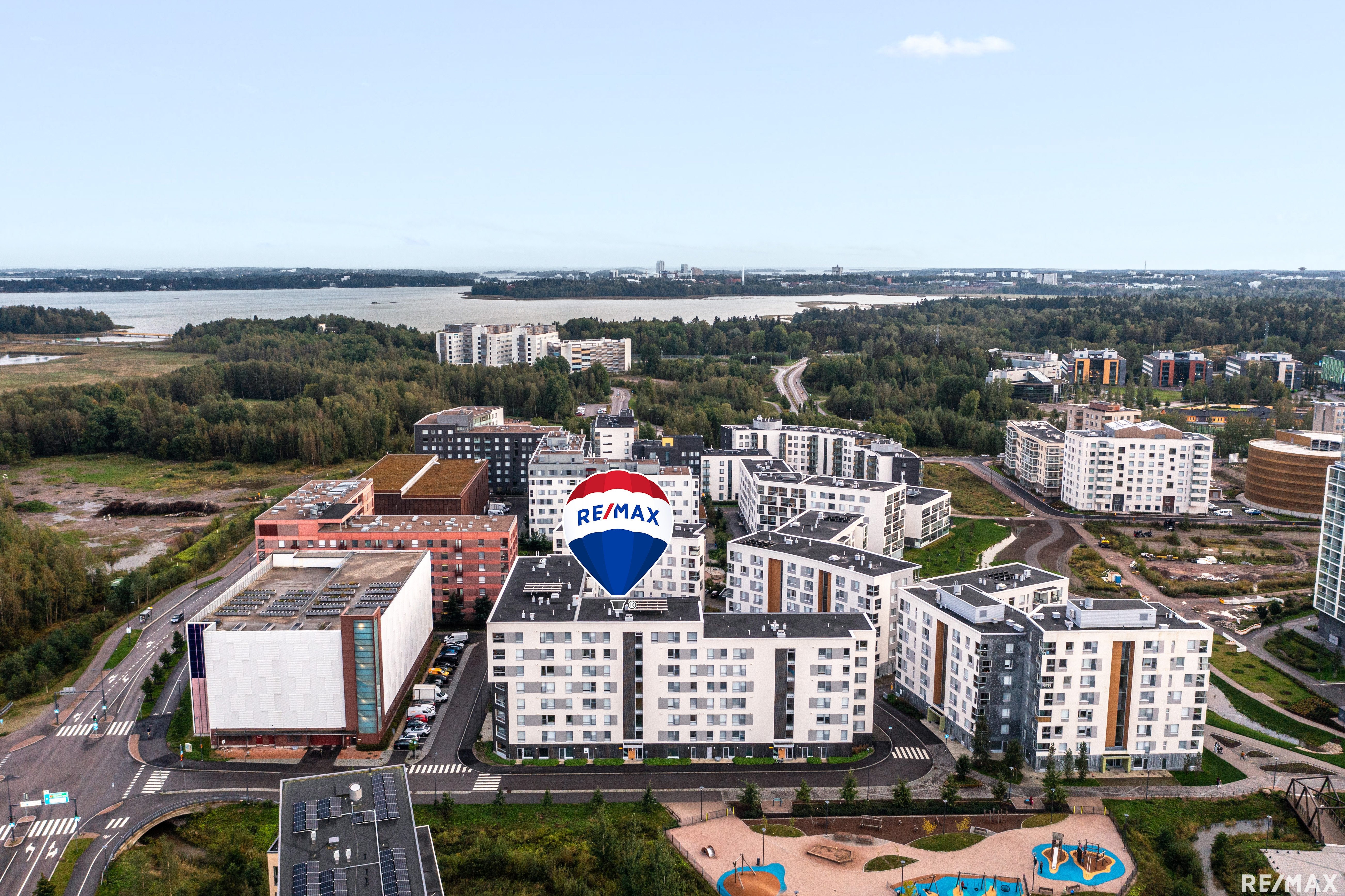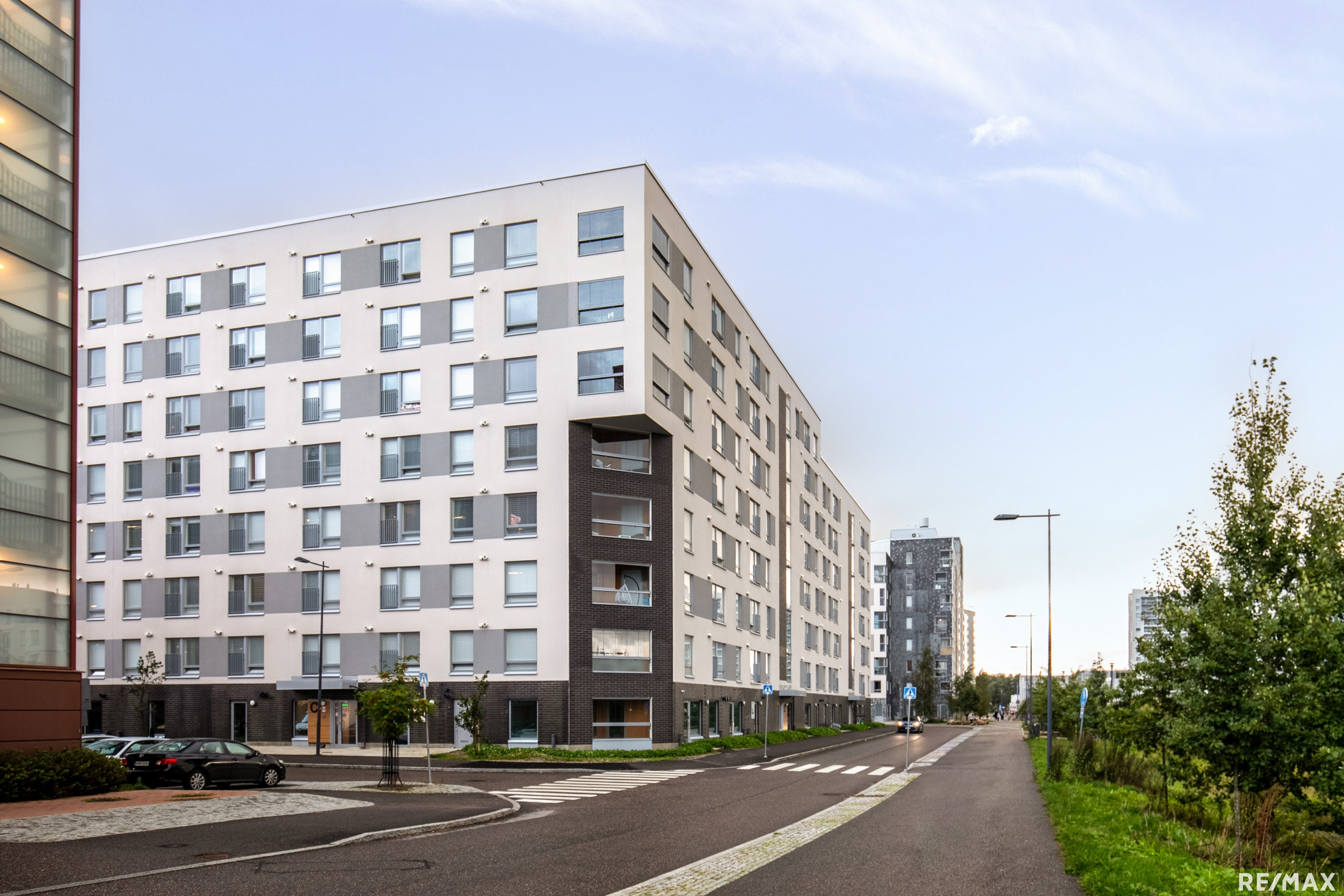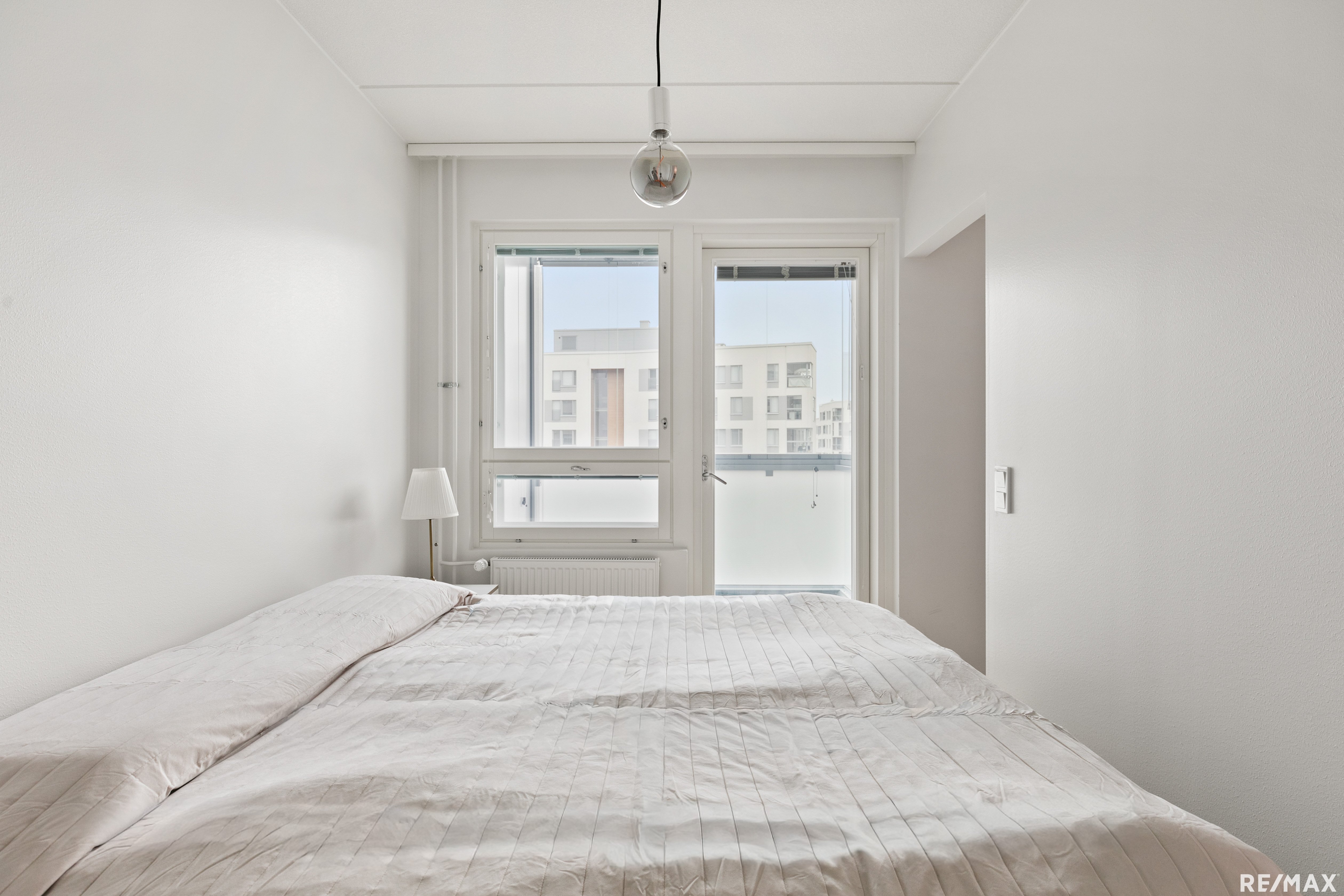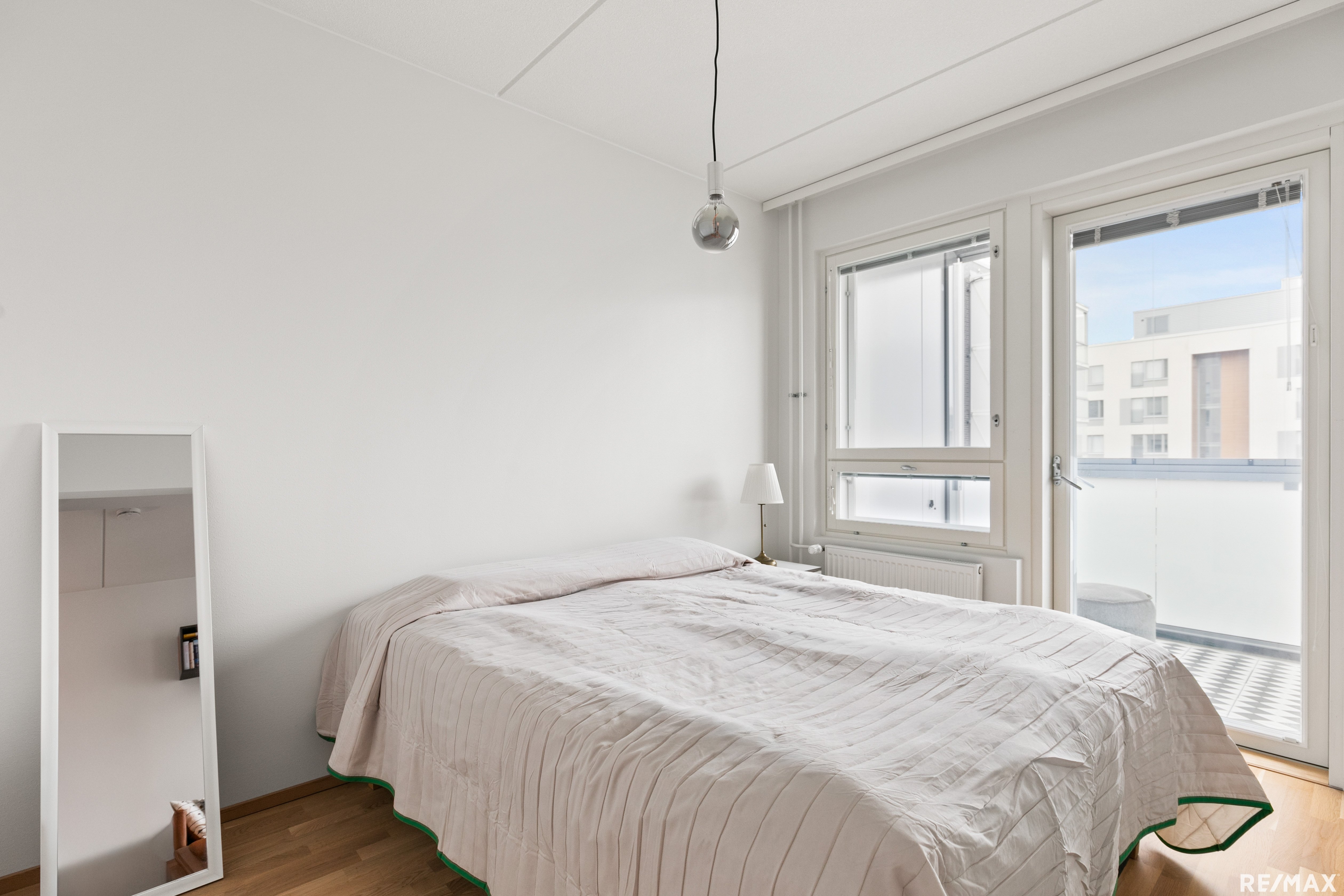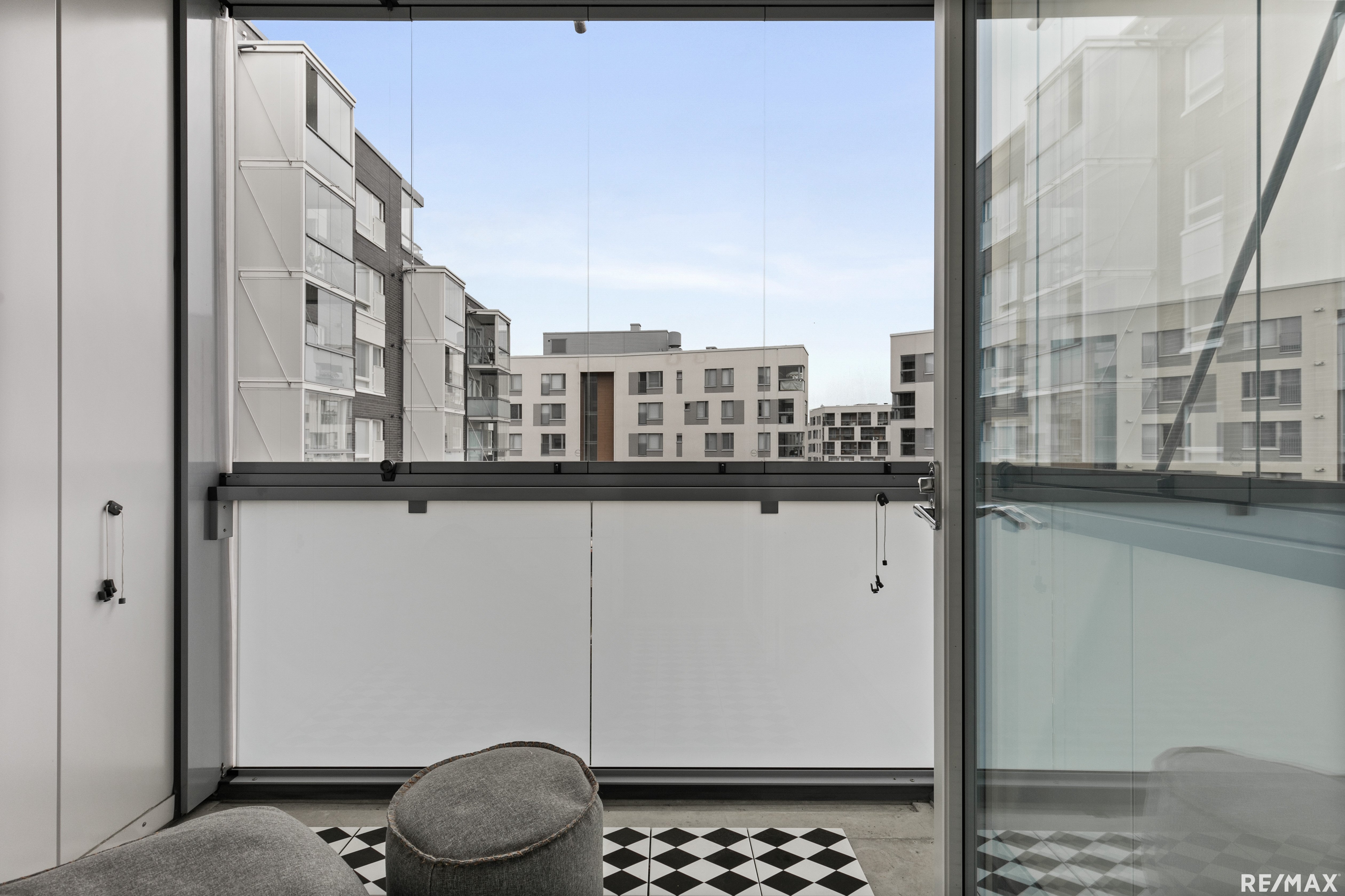 Tämä viidennen kerroksen kaksio tarjoaa modernia ja kodikasta asumista erinomaisella sijainnilla. Asunnon avara pohjaratkaisu tekee tiloista helppokäyttöiset arjessa ja juhlassa, ja laadukkaat materiaalivalinnat näkyvät viimeistelyssä. Tyylikäs avokeittiö integroiduilla kodinkoneilla avautuu sujuvasti olohuonetilaan. Makuuhuoneesta on käynti etelään suuntautuvalle lasitetulle parvekkeelle, jolta avautuu rauhallinen ja näkymä taloyhtiön piha-alueelle. Parveke toimii erinomaisena lisätilana kesästä talveen ja tuo kotiin lisävaloa sekä ulkoilmaelämän tuntua. Lasituksen alaosa on maitolasityyppinen, mikä lisää yksityisyyttä, ja tätä yksityiskohtaa ei ole kaikissa talon asunnoissa. Käytännöllinen kylpyhuone on viimeistelty hillityn harmailla laatoilla, jotka luovat ajattoman ja helppohoitoisen ilmeen. Tilassa on lasinen suihkuseinä, seinään asennettu wc piilotetulla huuhtelusäiliöllä sekä siistit säilytysratkaisut peili- ja allaskaappien muodossa. Huoneistokohtainen ilmanvaihtokone on sijoitettu huomaamattomasti yhtenäisen kiintokalusteen taakse ja sen alapuolelta löytyy sekä varaus pesukoneelle että tilaa pesutornille, mikä tekee pyykinpesusta helppoa ja siistiä