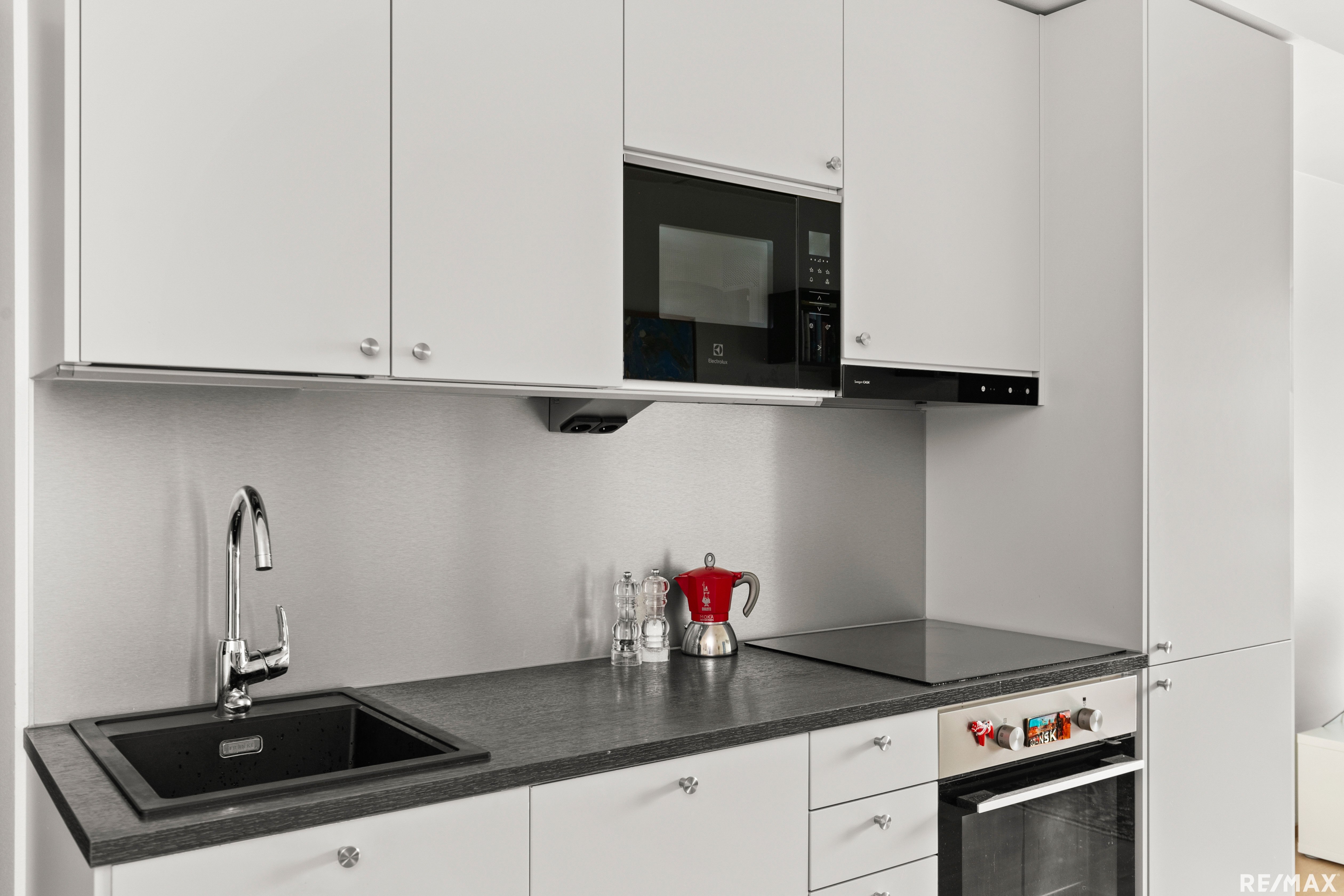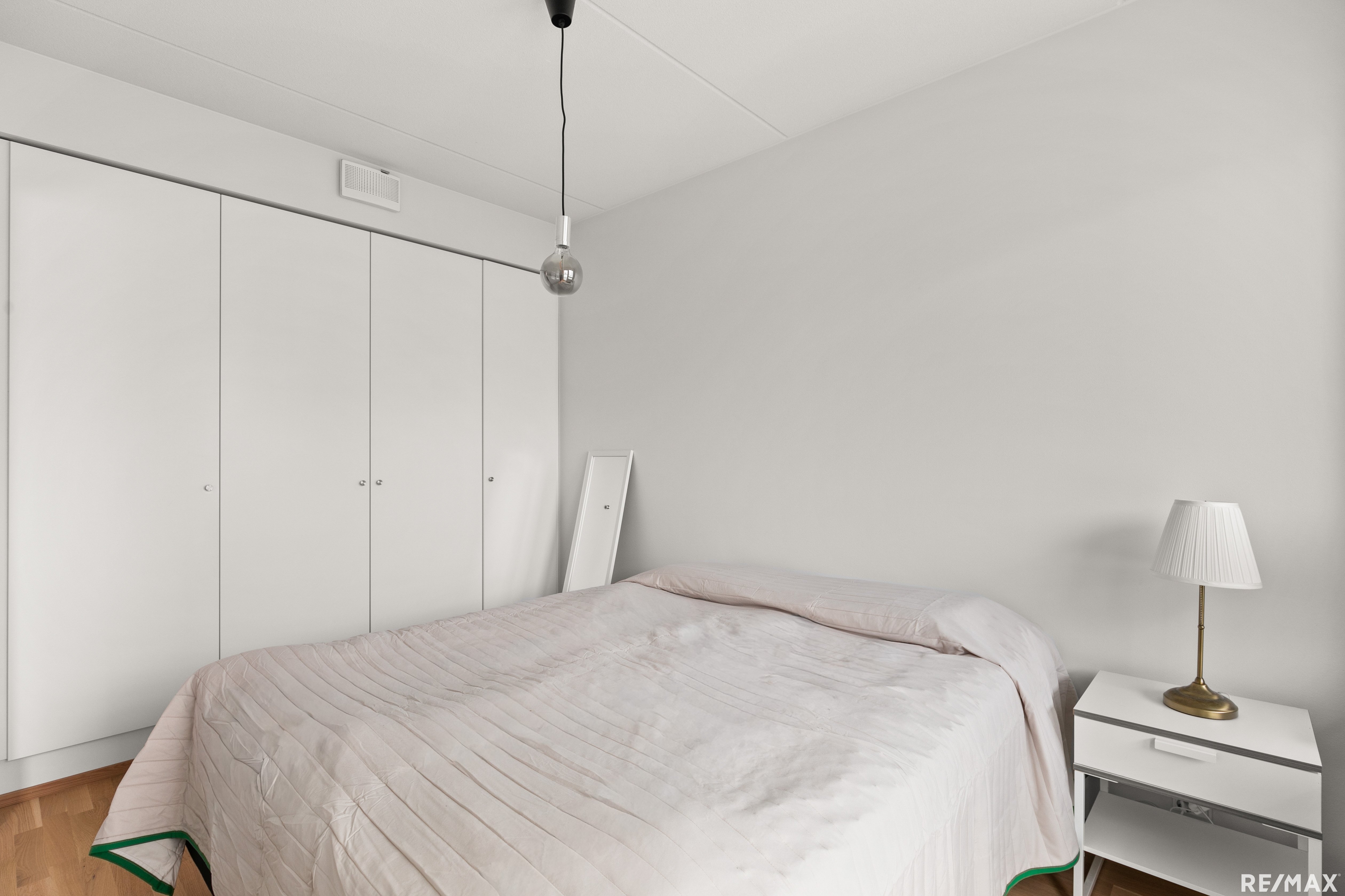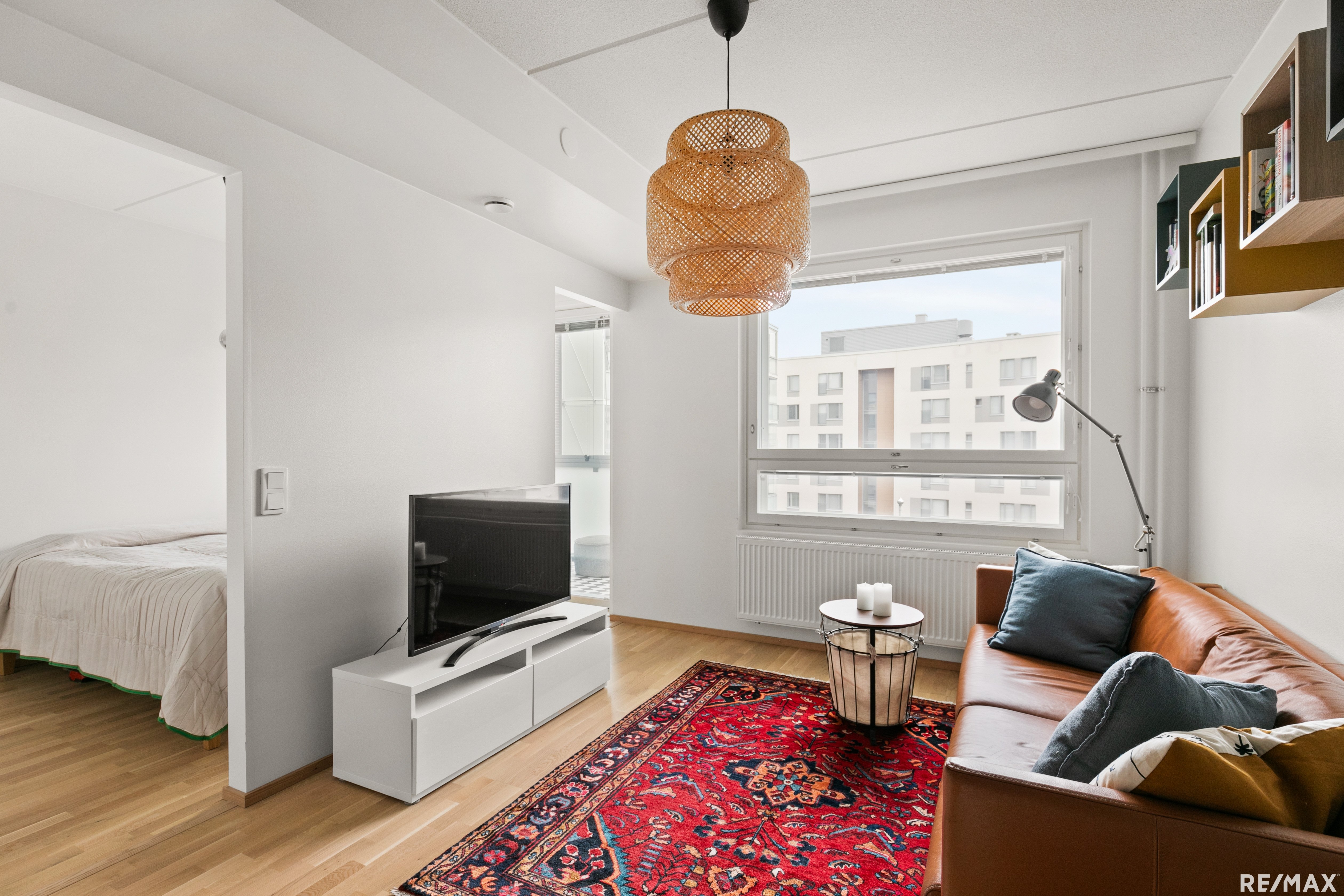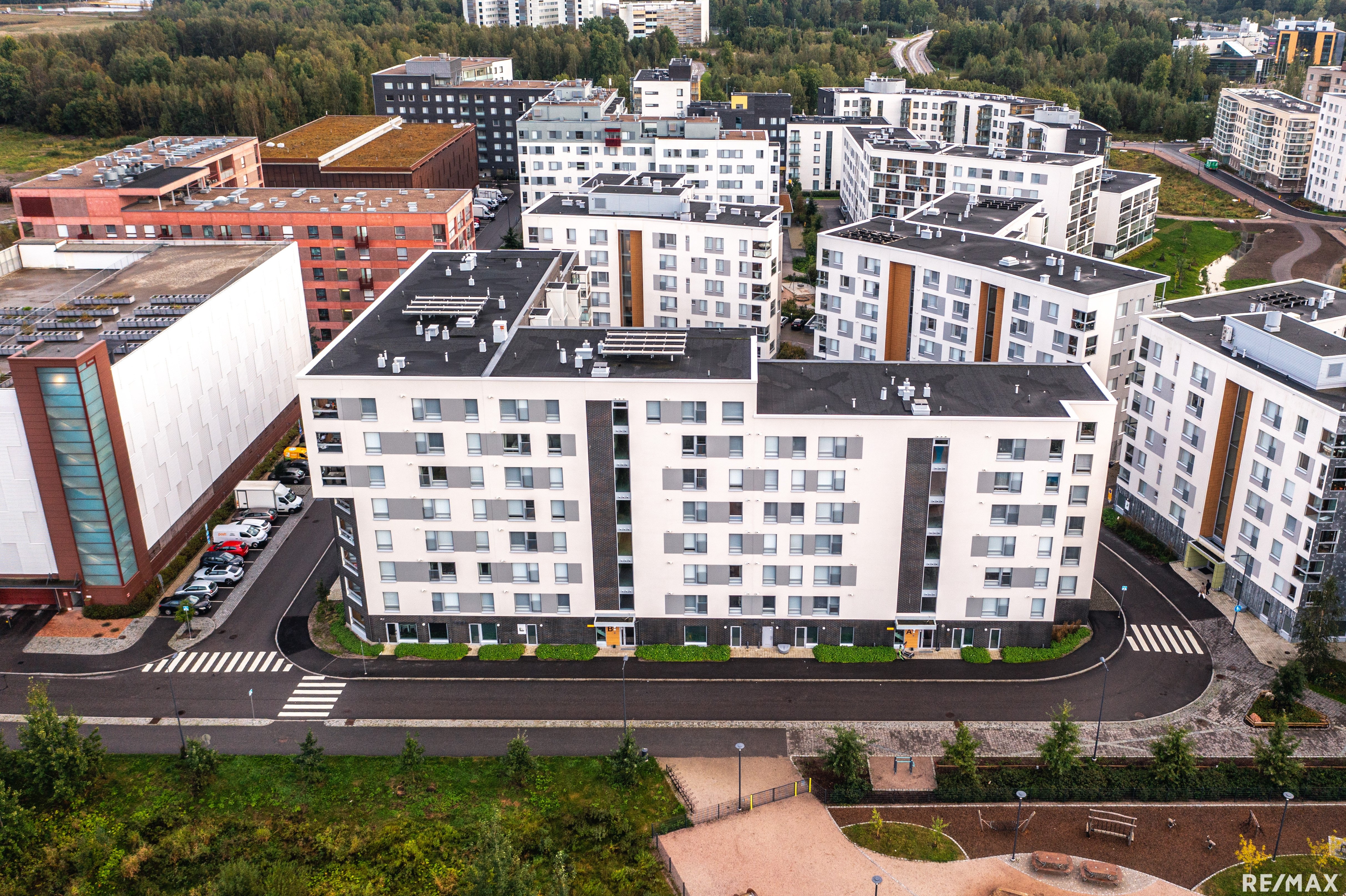 Tämä viidennen kerroksen kaksio tarjoaa modernia ja kodikasta asumista erinomaisella sijainnilla. Asunnon avara pohjaratkaisu tekee tiloista helppokäyttöiset arjessa ja juhlassa, ja laadukkaat materiaalivalinnat näkyvät viimeistelyssä. Tyylikäs avokeittiö integroiduilla kodinkoneilla avautuu sujuvasti olohuonetilaan. Makuuhuoneesta on käynti etelään suuntautuvalle lasitetulle parvekkeelle, jolta avautuu rauhallinen ja näkymä taloyhtiön piha-alueelle. Parveke toimii erinomaisena lisätilana kesästä talveen ja tuo kotiin lisävaloa sekä ulkoilmaelämän tuntua. Lasituksen alaosa on maitolasityyppinen, mikä lisää yksityisyyttä, ja tätä yksityiskohtaa ei ole kaikissa talon asunnoissa. Käytännöllinen kylpyhuone on viimeistelty hillityn harmailla laatoilla, jotka luovat ajattoman ja helppohoitoisen ilmeen. Tilassa on lasinen suihkuseinä, seinään asennettu wc piilotetulla huuhtelusäiliöllä sekä siistit säilytysratkaisut peili- ja allaskaappien muodossa. Huoneistokohtainen ilmanvaihtokone on sijoitettu huomaamattomasti yhtenäisen kiintokalusteen taakse ja sen alapuolelta löytyy sekä varaus pesukoneelle että tilaa pesutornille, mikä tekee pyykinpesusta helppoa ja siistiä