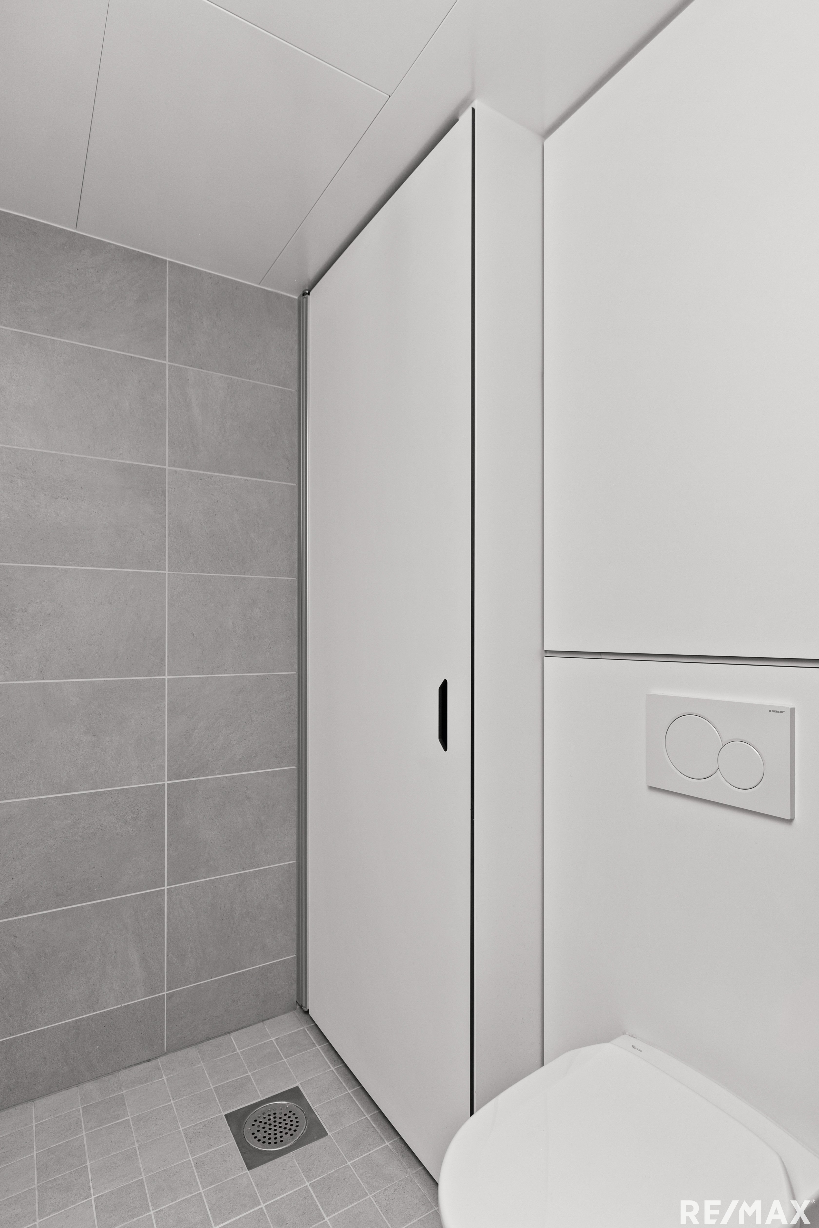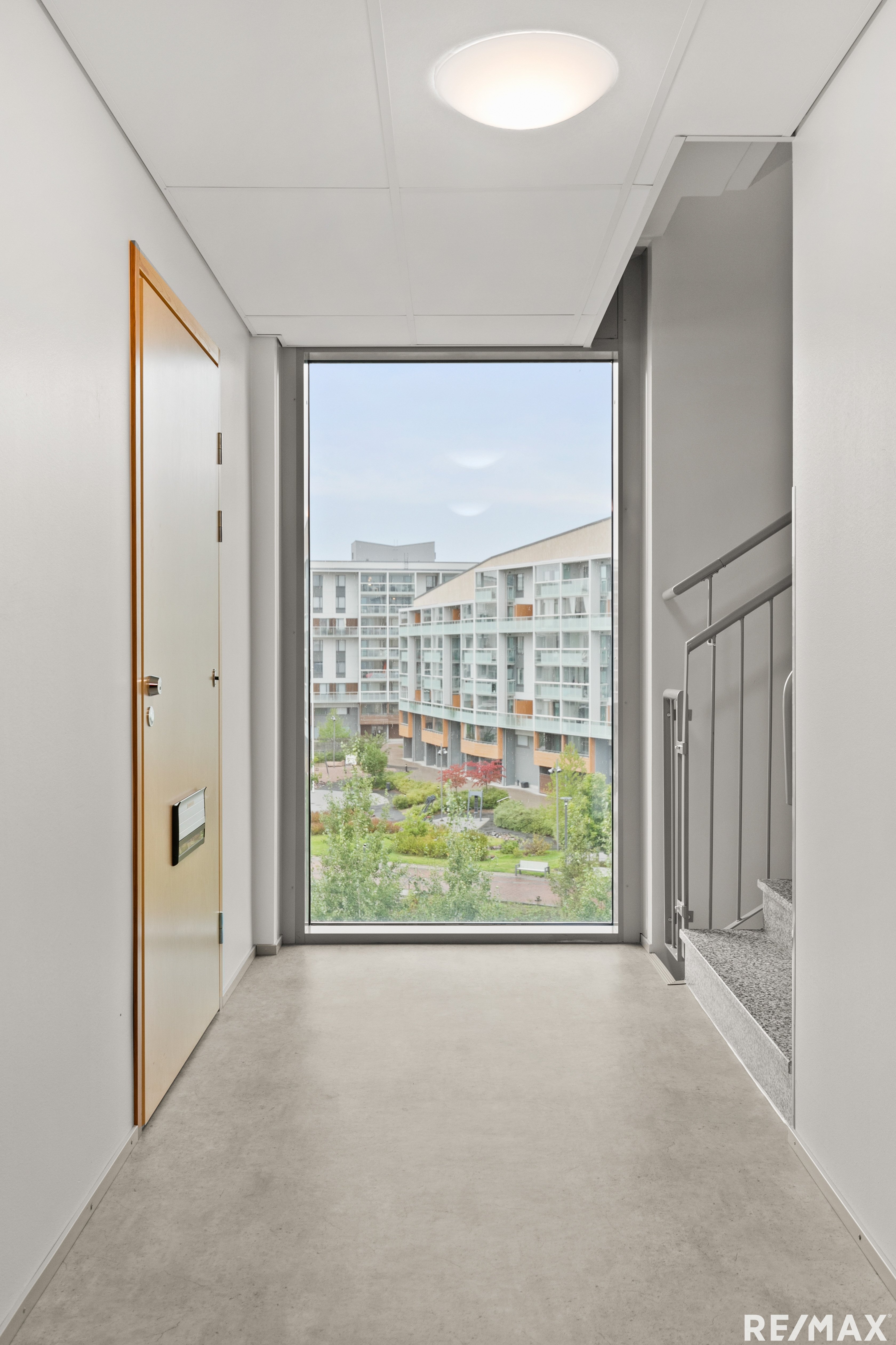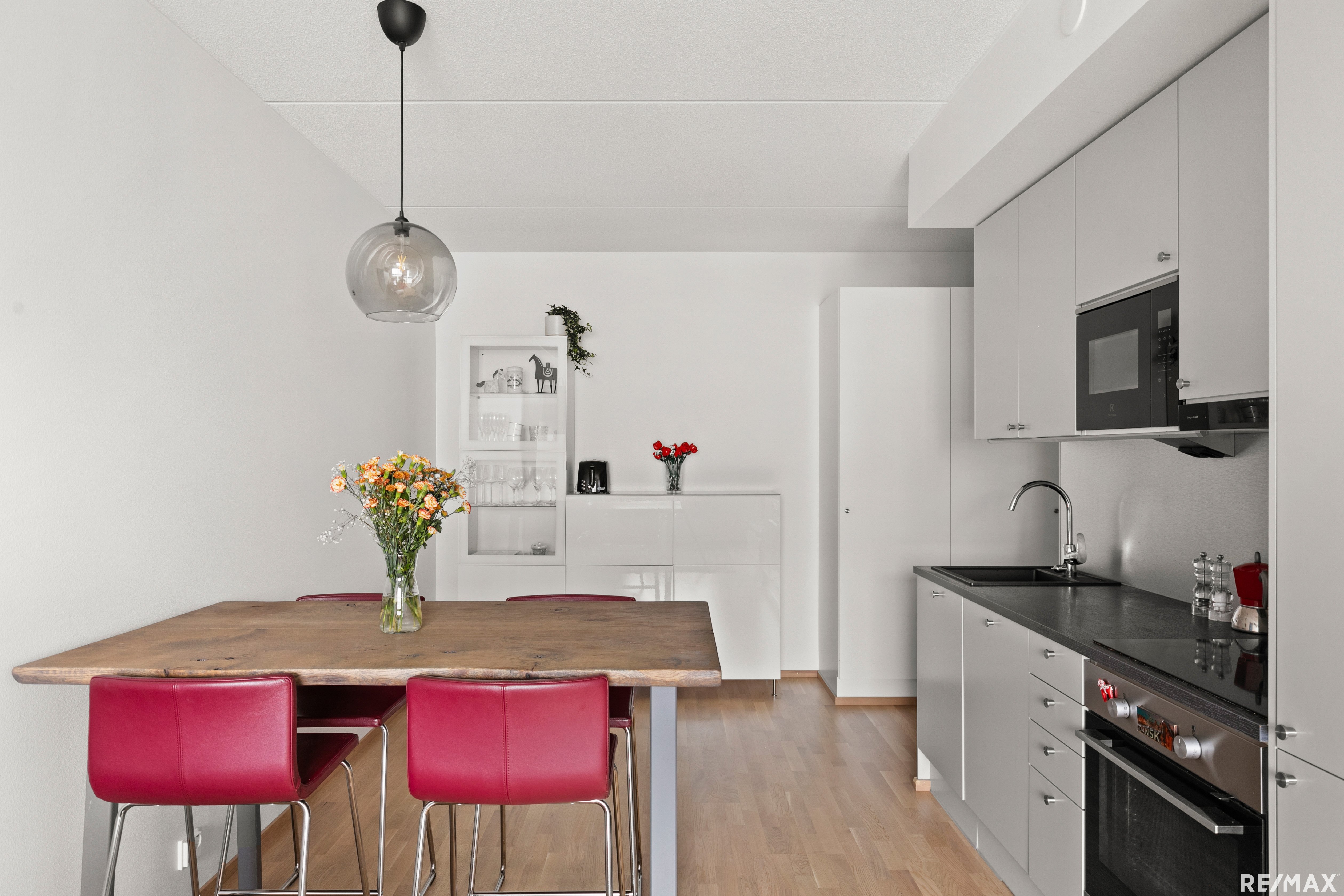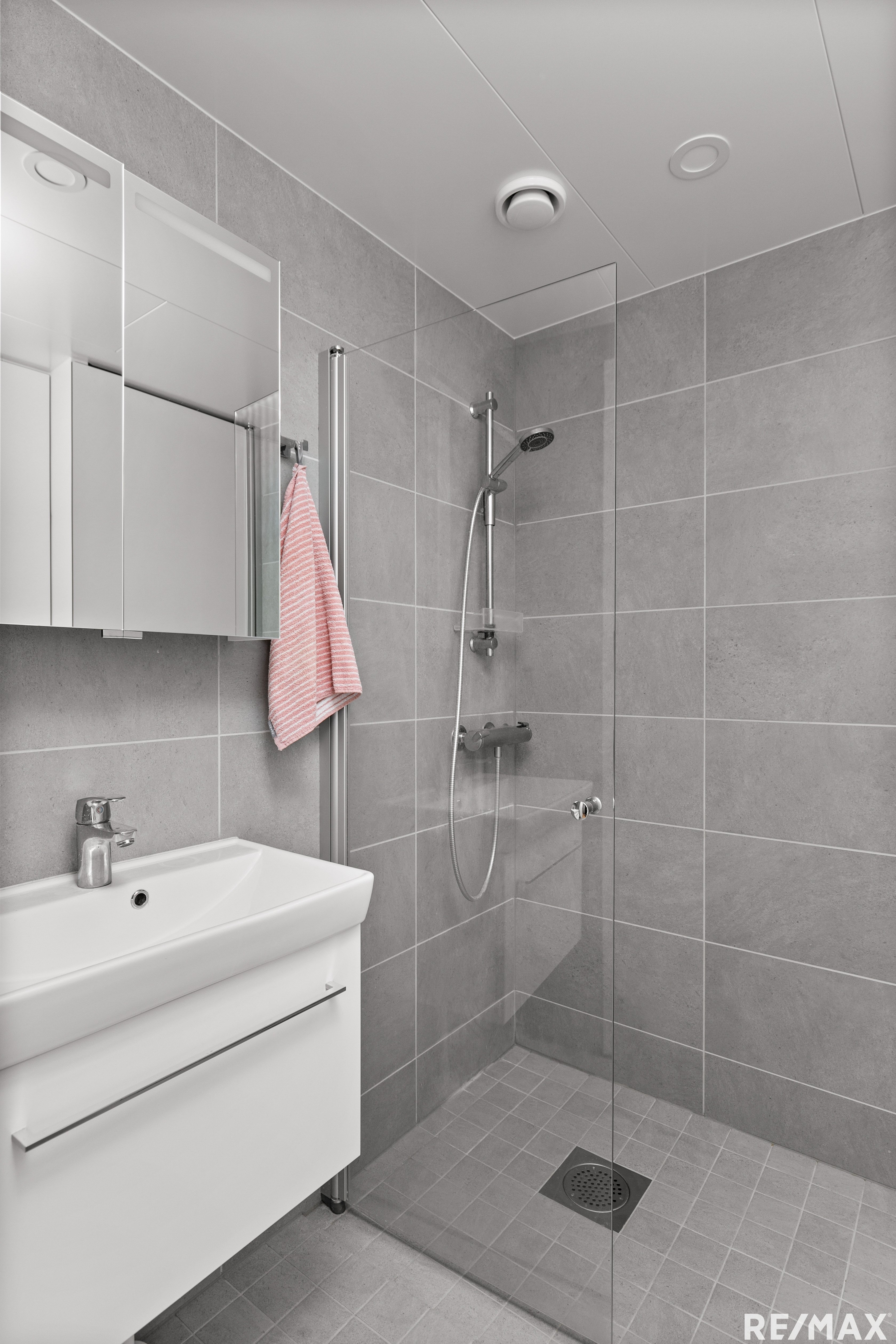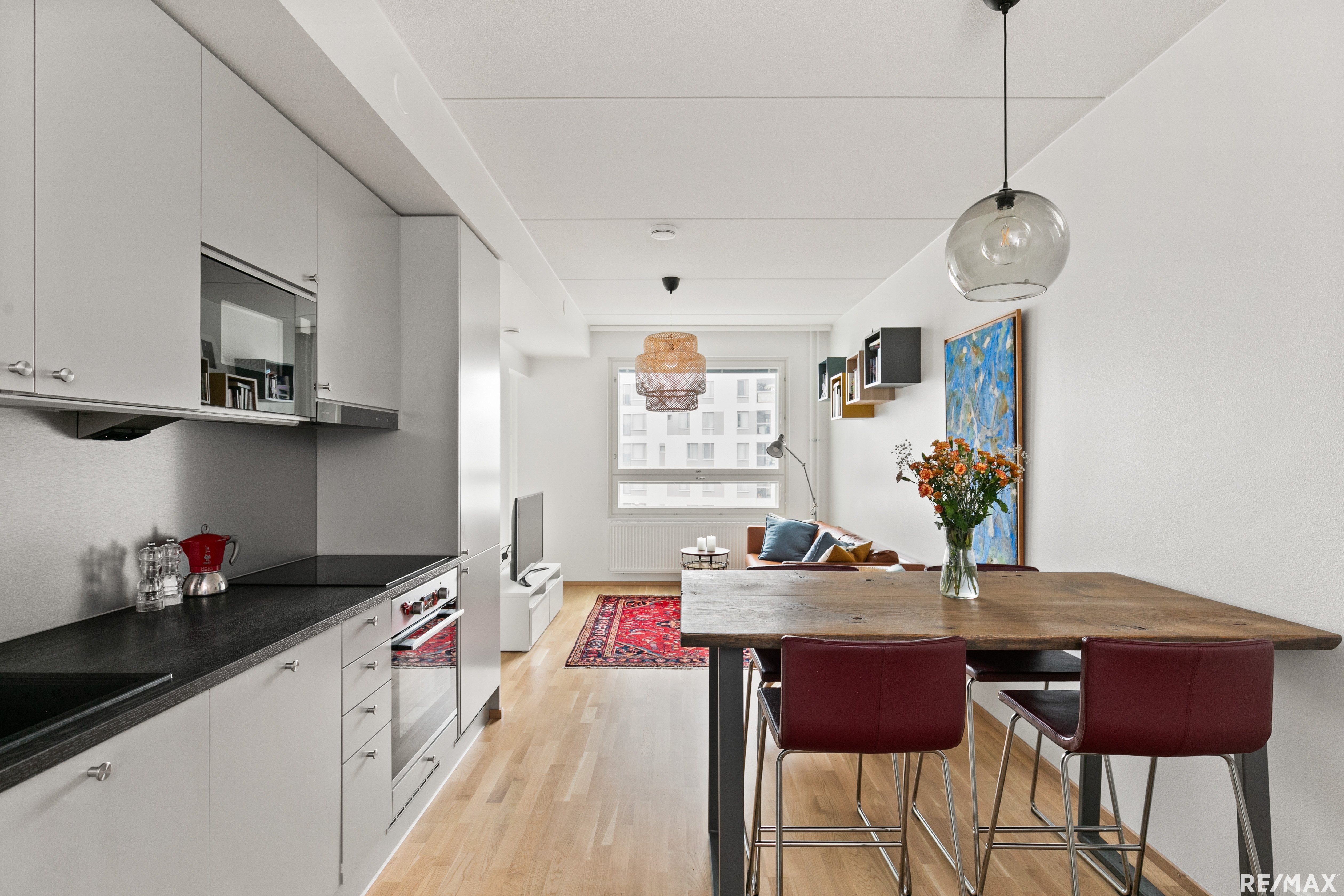 Tämä viidennen kerroksen kaksio tarjoaa modernia ja kodikasta asumista erinomaisella sijainnilla. Asunnon avara pohjaratkaisu tekee tiloista helppokäyttöiset arjessa ja juhlassa, ja laadukkaat materiaalivalinnat näkyvät viimeistelyssä. Tyylikäs avokeittiö integroiduilla kodinkoneilla avautuu sujuvasti olohuonetilaan. Makuuhuoneesta on käynti etelään suuntautuvalle lasitetulle parvekkeelle, jolta avautuu rauhallinen ja näkymä taloyhtiön piha-alueelle. Parveke toimii erinomaisena lisätilana kesästä talveen ja tuo kotiin lisävaloa sekä ulkoilmaelämän tuntua. Lasituksen alaosa on maitolasityyppinen, mikä lisää yksityisyyttä, ja tätä yksityiskohtaa ei ole kaikissa talon asunnoissa. Käytännöllinen kylpyhuone on viimeistelty hillityn harmailla laatoilla, jotka luovat ajattoman ja helppohoitoisen ilmeen. Tilassa on lasinen suihkuseinä, seinään asennettu wc piilotetulla huuhtelusäiliöllä sekä siistit säilytysratkaisut peili- ja allaskaappien muodossa. Huoneistokohtainen ilmanvaihtokone on sijoitettu huomaamattomasti yhtenäisen kiintokalusteen taakse ja sen alapuolelta löytyy sekä varaus pesukoneelle että tilaa pesutornille, mikä tekee pyykinpesusta helppoa ja siistiä