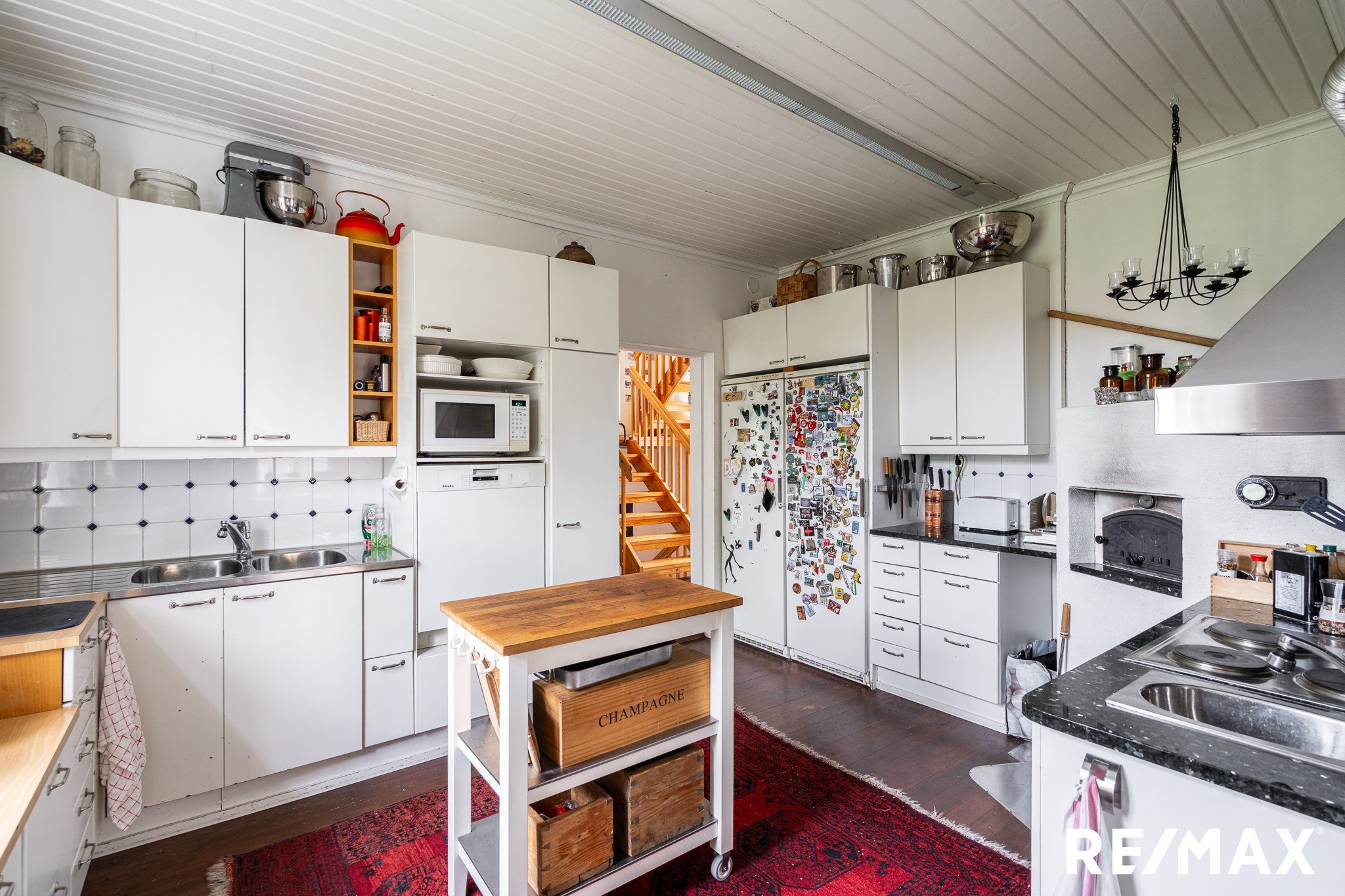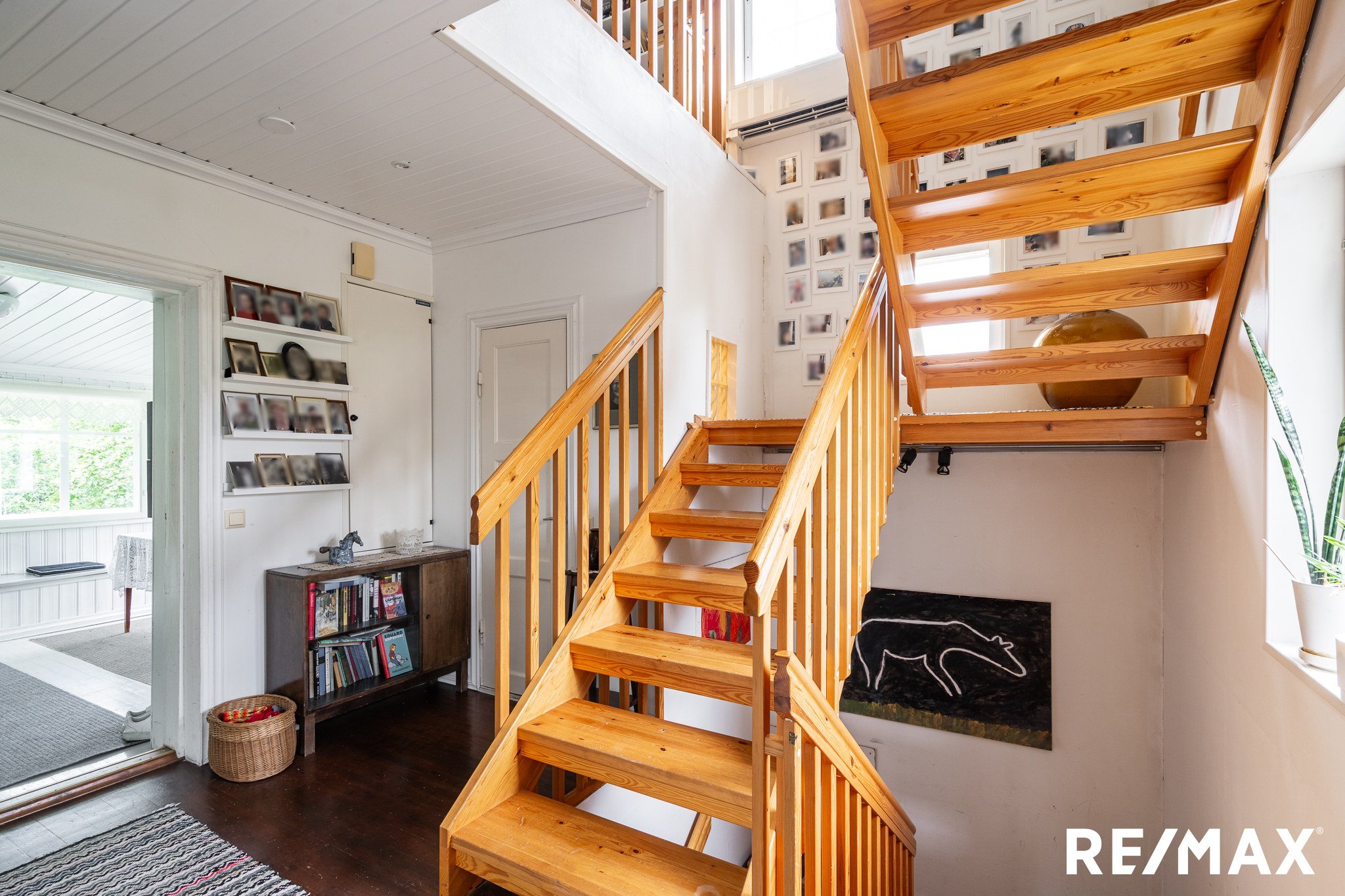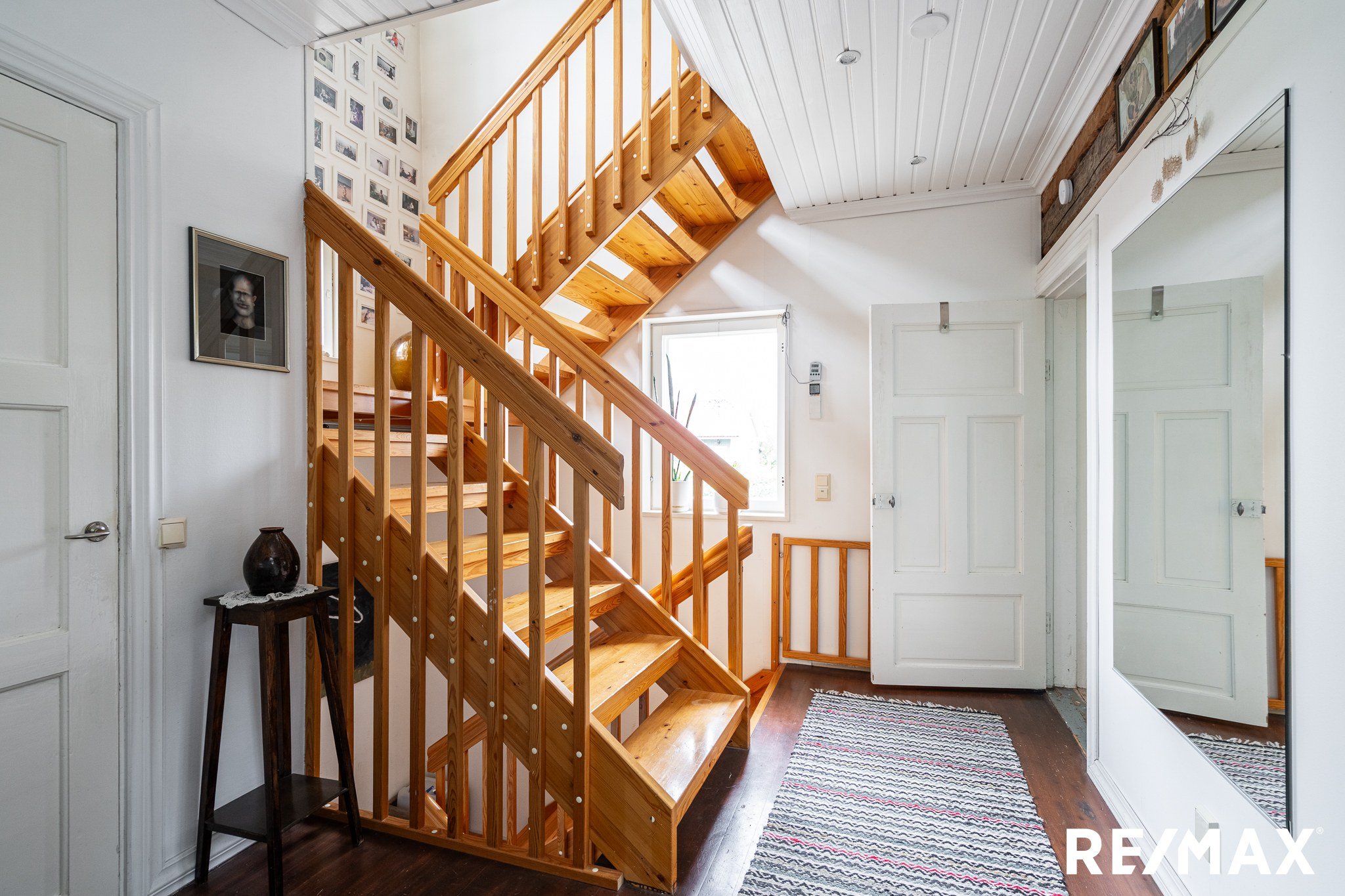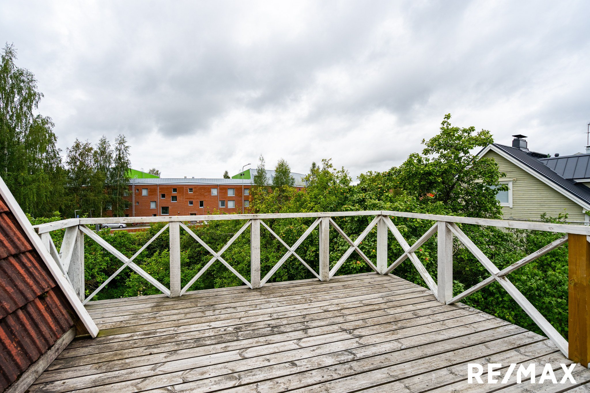Kolmikerroksinen talo tarjoaa runsaasti tilaa, ja sen korkeat huoneet luovat avaran ja valoisan tunnelman. Keskikerroksen keittiössä on leivinuuni, joka tuo lämpöä ja kodikkuutta. Yläkerran parveke avautuu lounaaseen, tarjoten kauniit näkymät ja iltapäivän auringon. Alakerrassa on sauna, jossa voi rentoutua puukiukaan lämmössä.