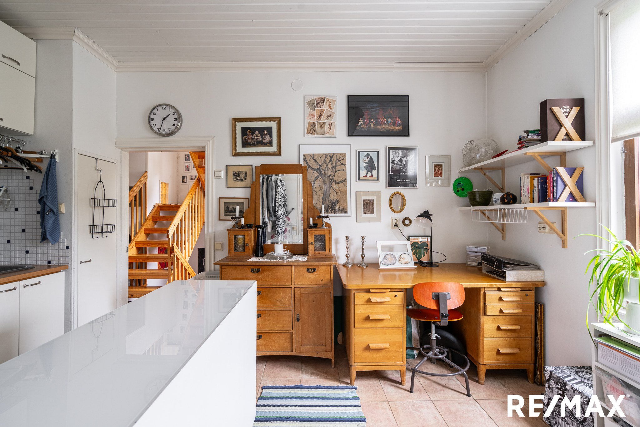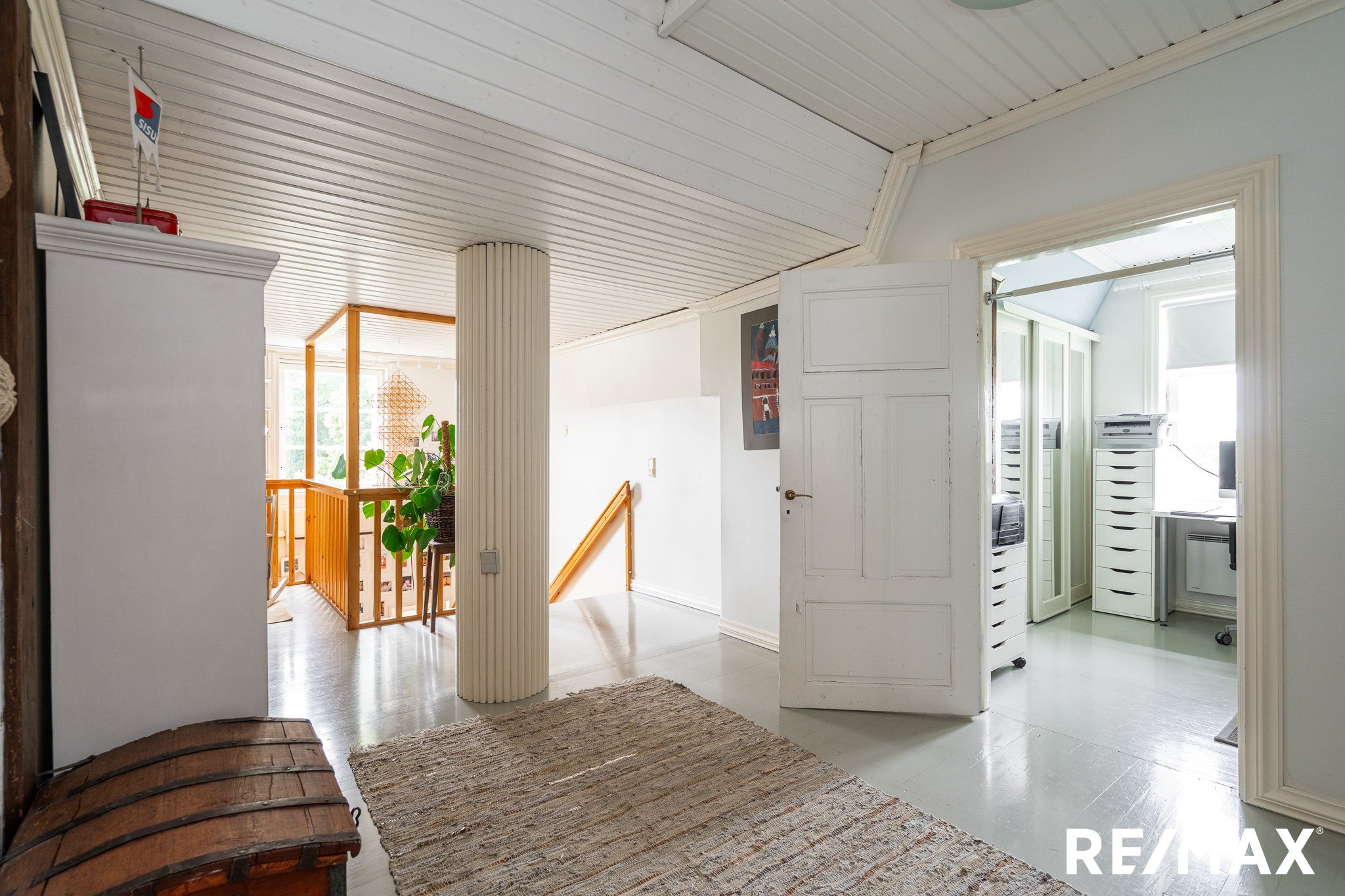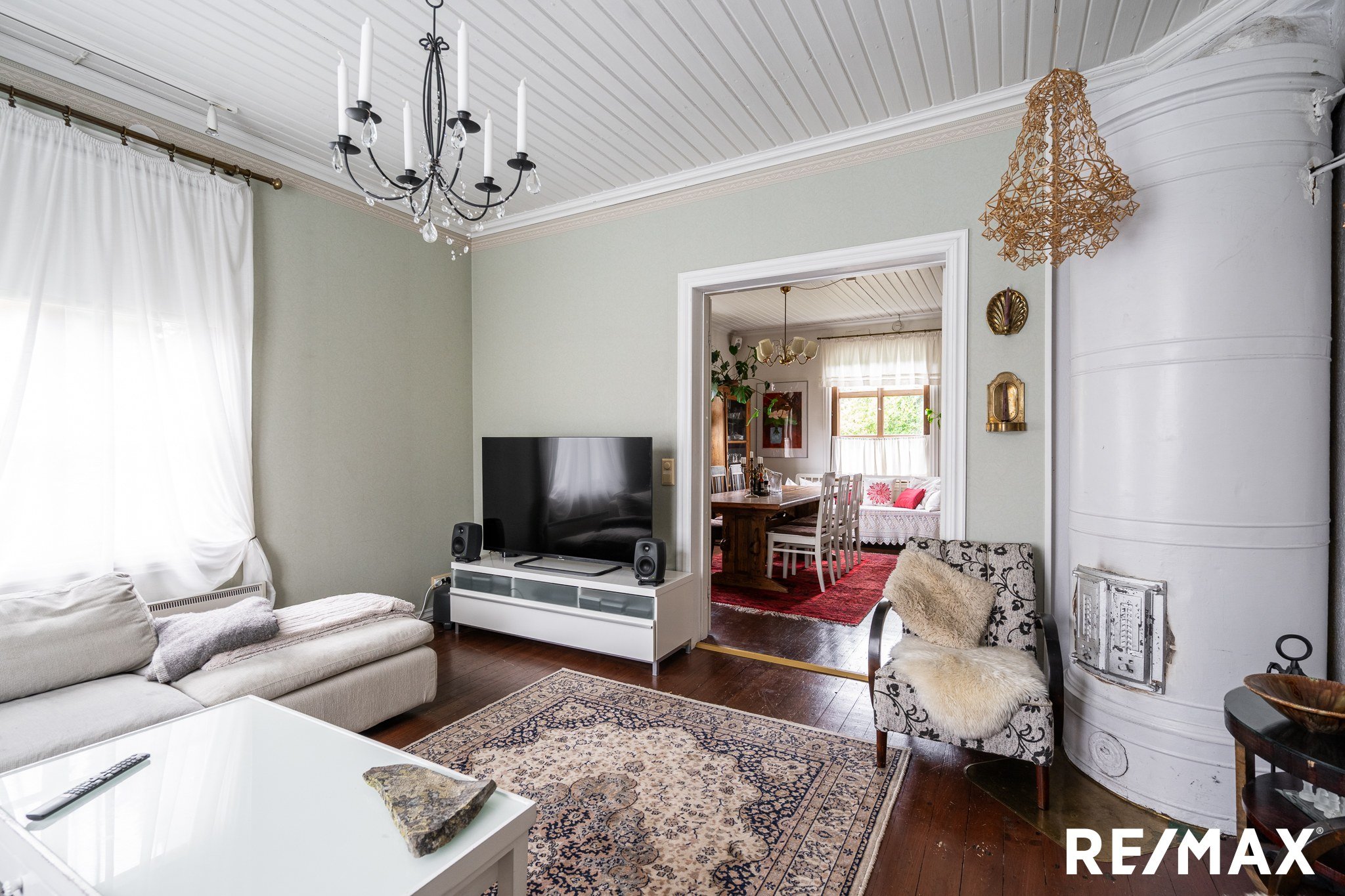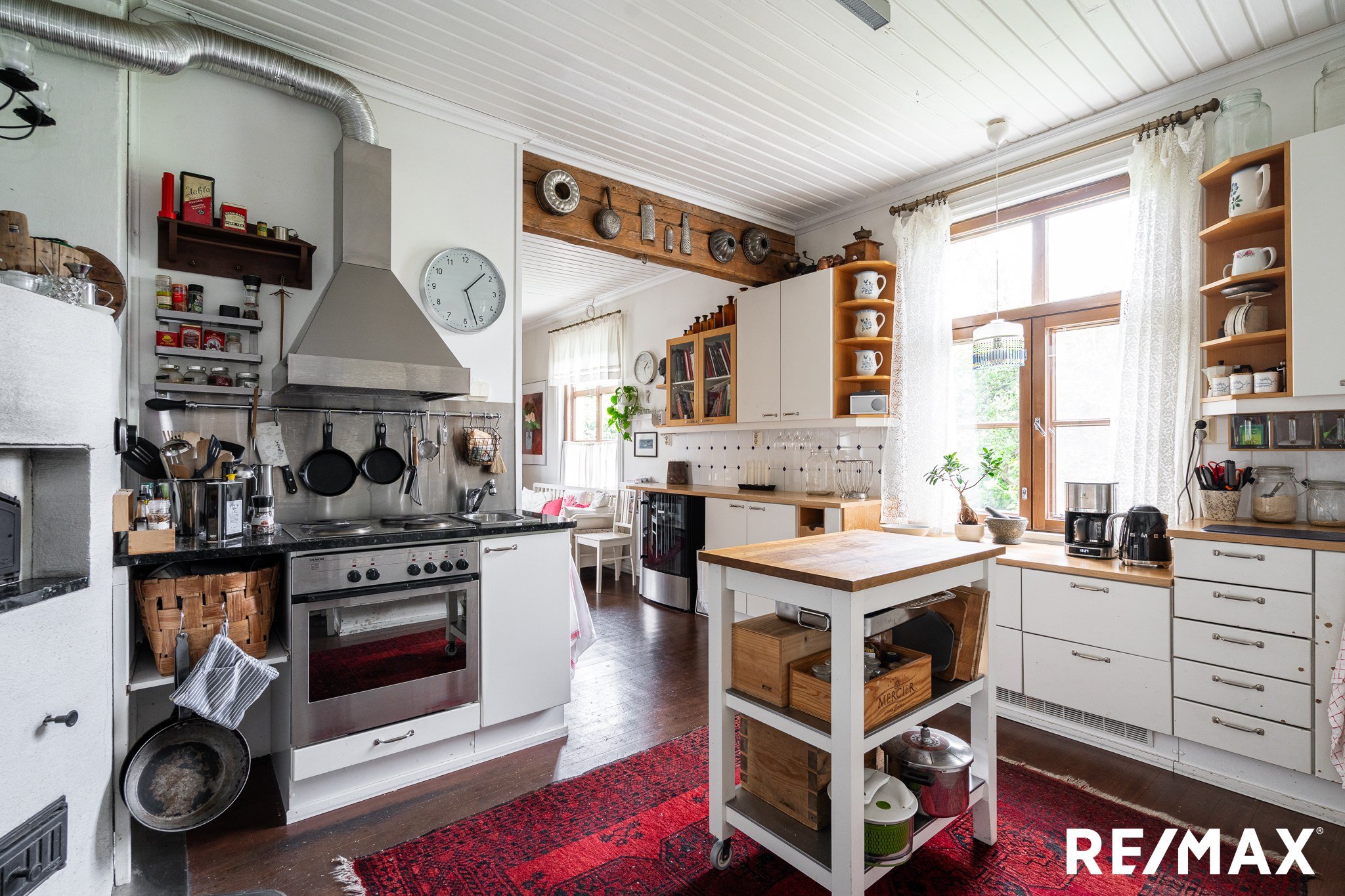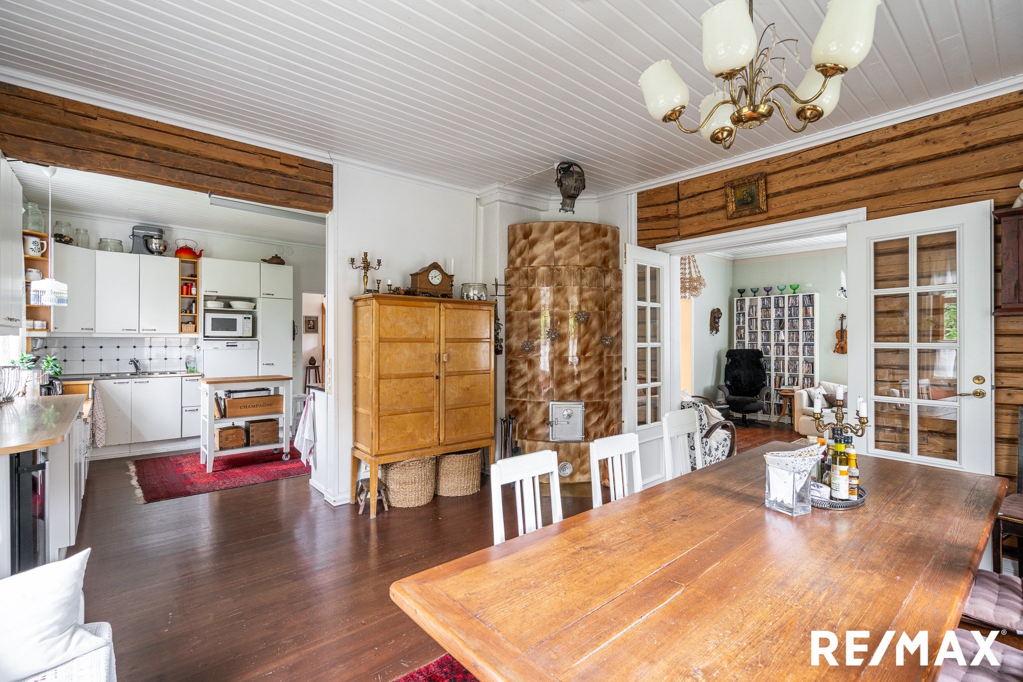 Kolmikerroksinen talo tarjoaa runsaasti tilaa, ja sen korkeat huoneet luovat avaran ja valoisan tunnelman. Keskikerroksen keittiössä on leivinuuni, joka tuo lämpöä ja kodikkuutta. Yläkerran parveke avautuu lounaaseen, tarjoten kauniit näkymät ja iltapäivän auringon. Alakerrassa on sauna, jossa voi rentoutua puukiukaan lämmössä.