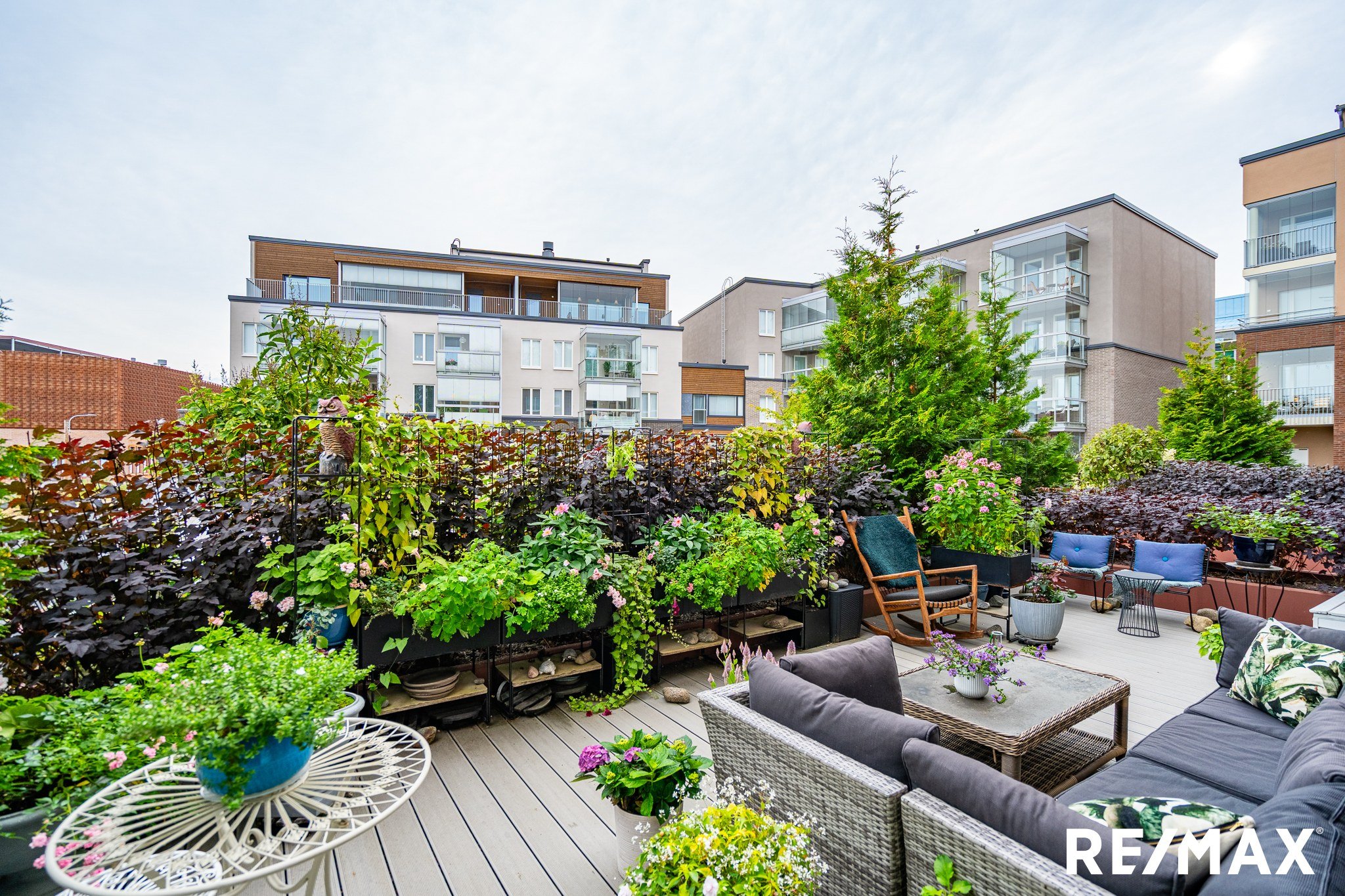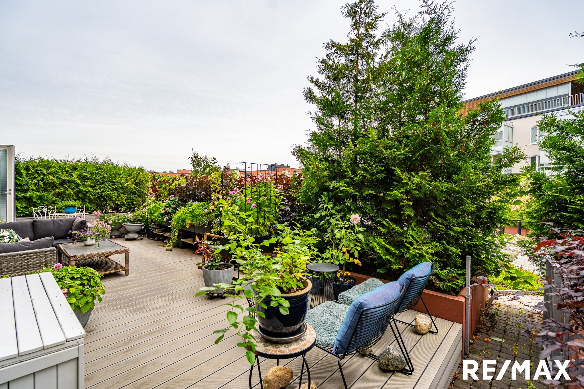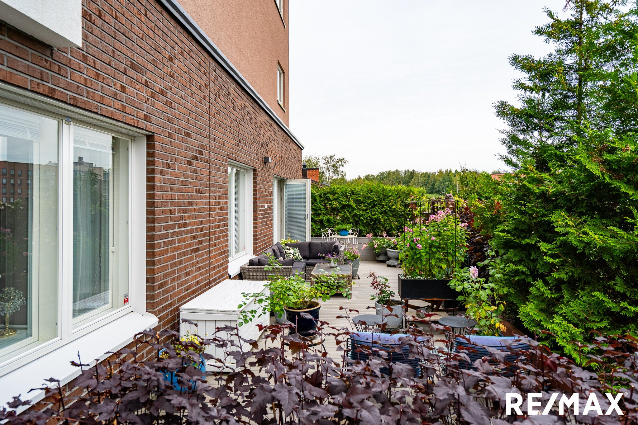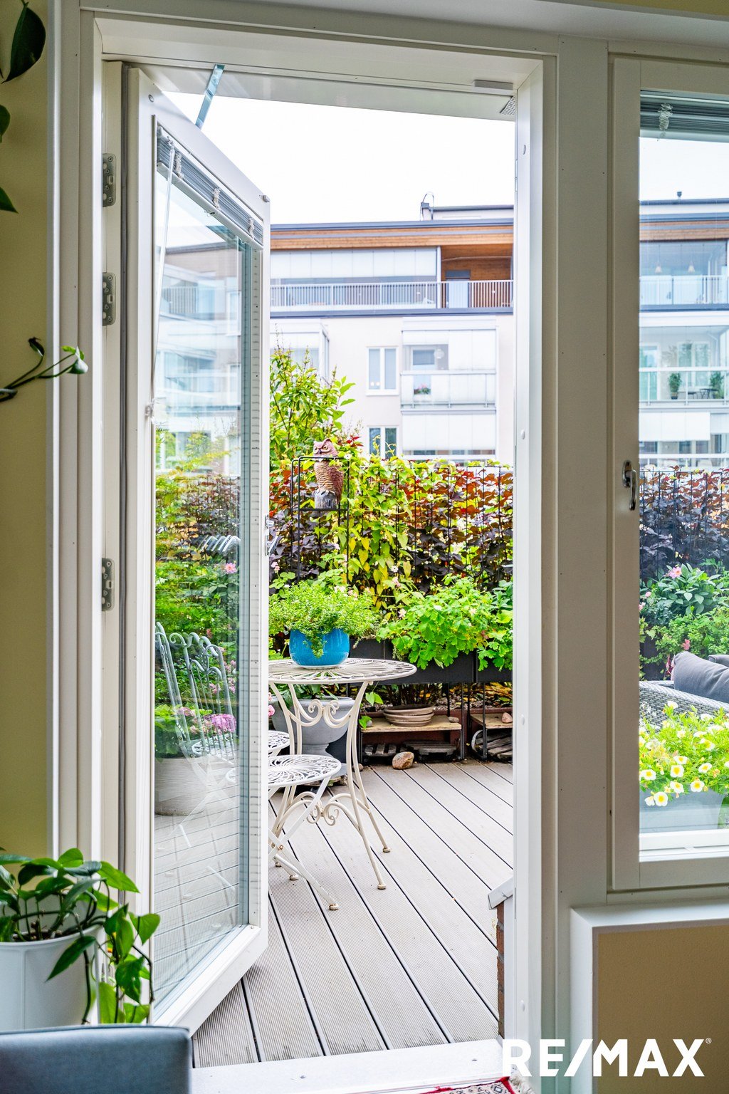 Erityisenä lisänä on suuri, noin 32 m2 avoin, mutta suojaisa terassi, tämä on oma salainen keidas sisäpihan suojassa. Täällä on täydellinen paikka nauttia kesäpäivistä ja rauhallisista illoista ja vielä lämpöisistä syysilloistakin kynttilän valossa.