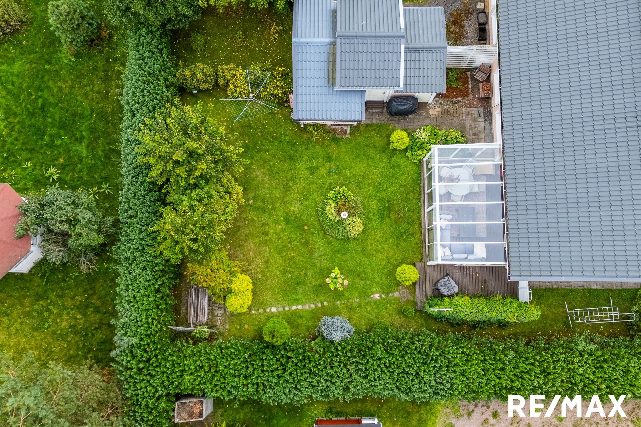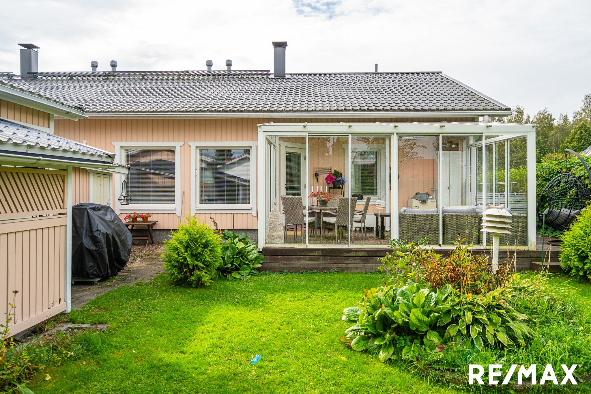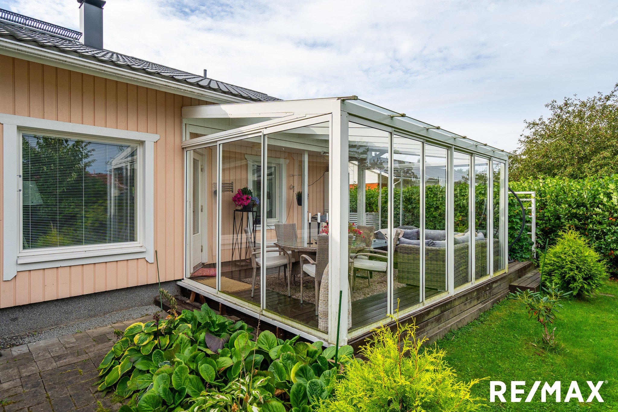 Takapihalla iso lasitettu terassi noin 5m*4m. Aitapensaana Marja-aronia