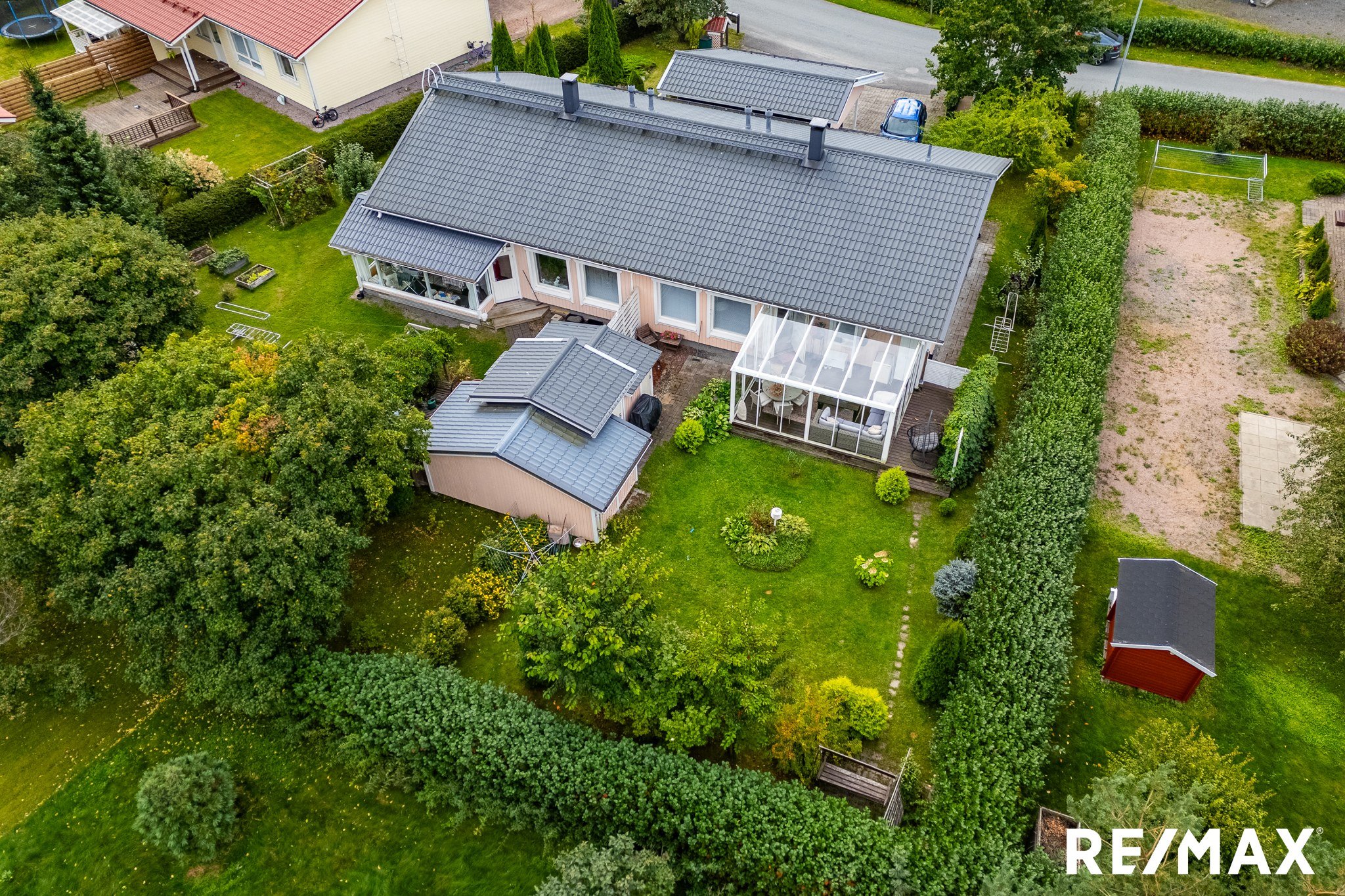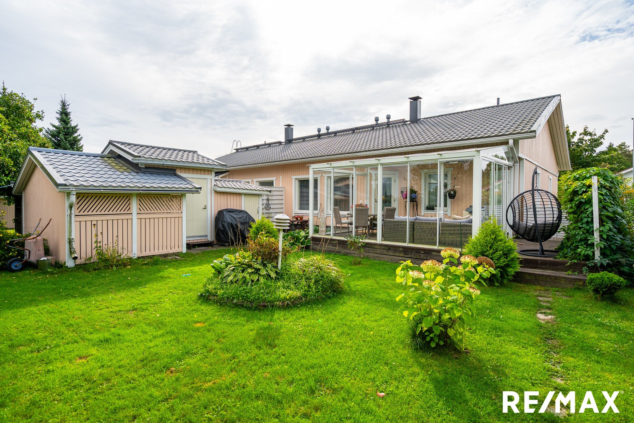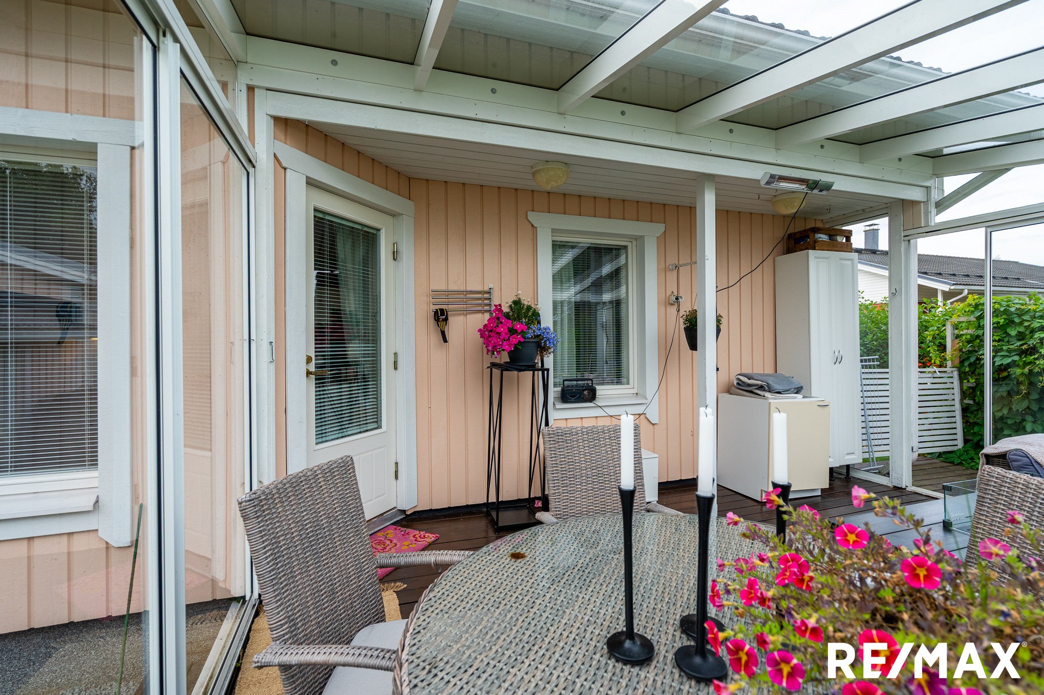 Takapihalla iso lasitettu terassi noin 5m*4m. Aitapensaana Marja-aronia