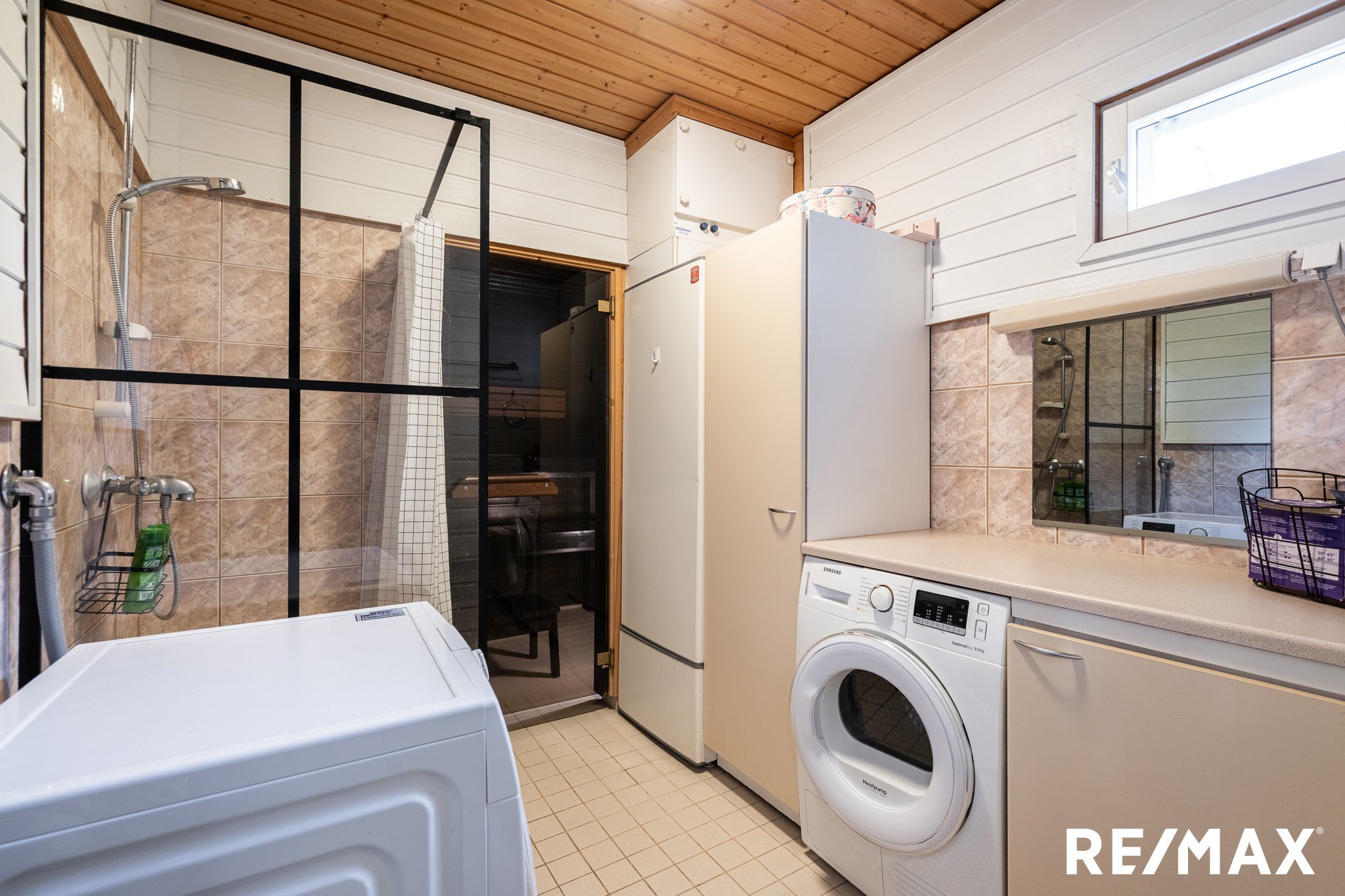 Suihku, suihkuseinä, pesukoneliitäntä, lattialämmitys, peili ja kaappitilaa