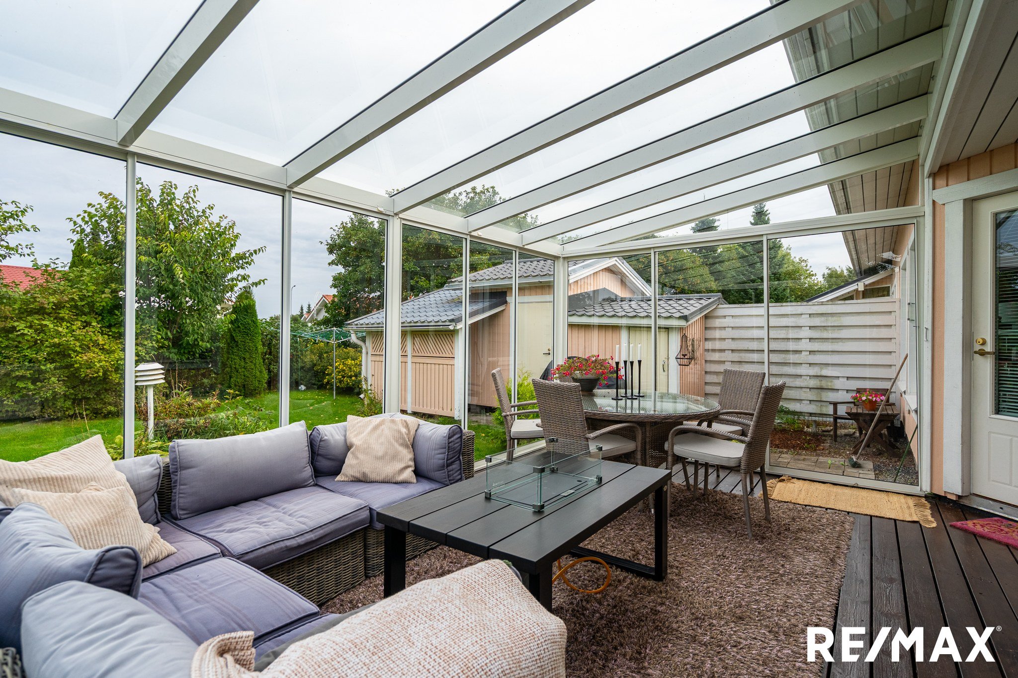 Erityisenä lisänä on suuri lasitettu terassi, joka toimii loistavasti lisäolohuoneena keväästä syksyyn. Terassin lisäksi suojaisa ja aidattu piha kutsuu nauttimaan ulkoilmasta. Pihalta löytyy myös , kriikuna- ja koristekirsikkapuu sekä perennoja, jotka tuovat vehreyttä ja kauneutta ympäristöön. Kivetty etupiha.