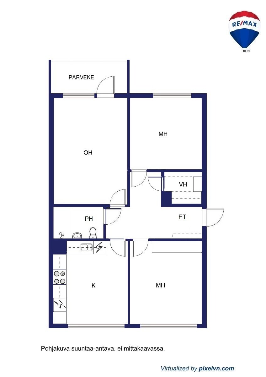 Huoneiston pinta-ala on yhtiöjärjestyksen, isännöitsijäntodistuksen mukaan 64 m2 ja 3h+k. Pinta-alatieto on ohjeellinen, pinta-alan tarkistusmittauksia ei ole tehty.