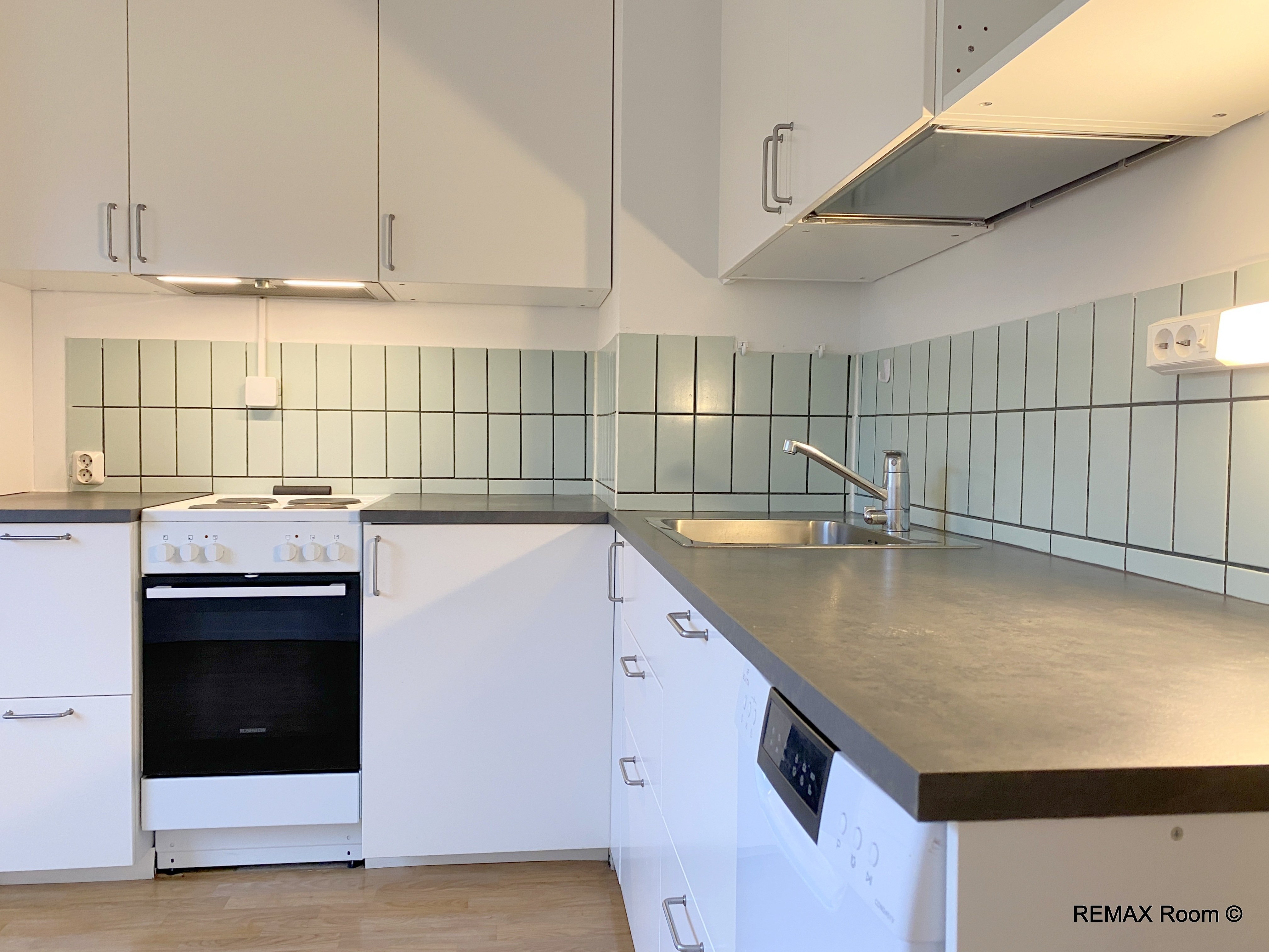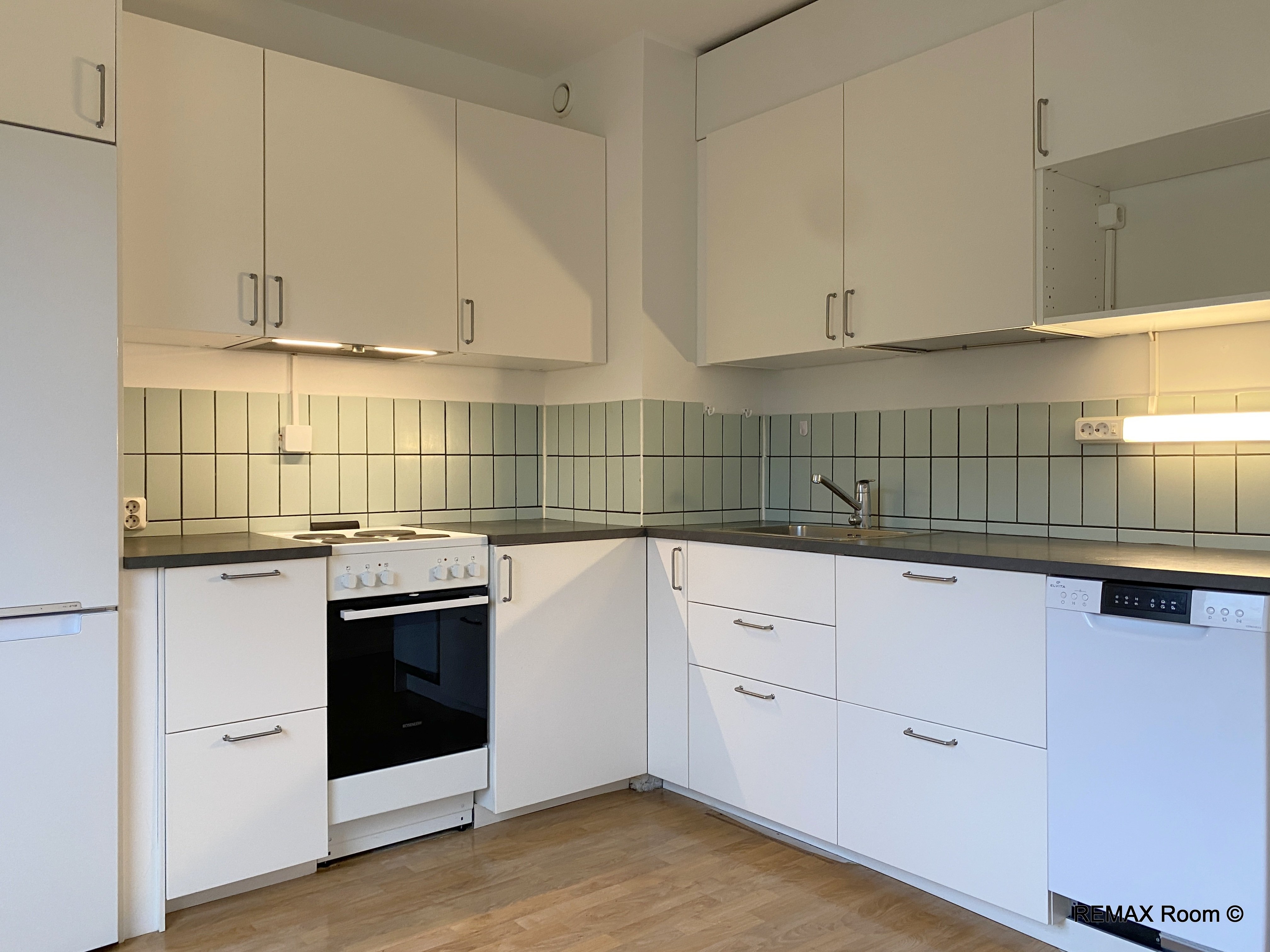 Läpitalon ja siistikuntoinen kolmio. Keittiö kodinkoneineen on juuri valmistunut remontista.